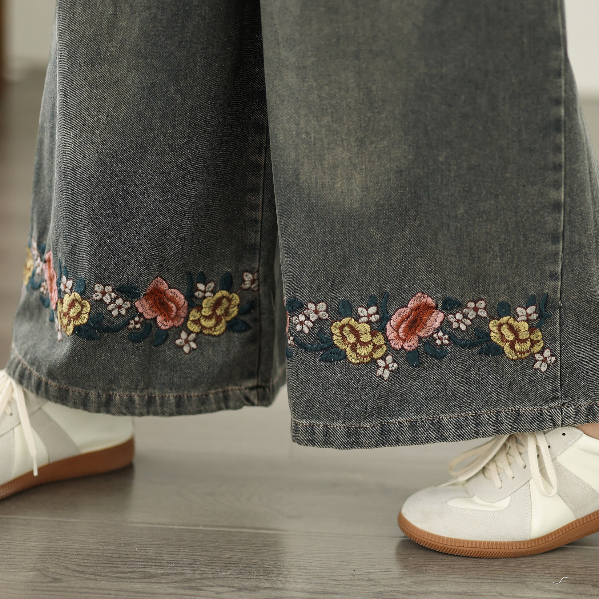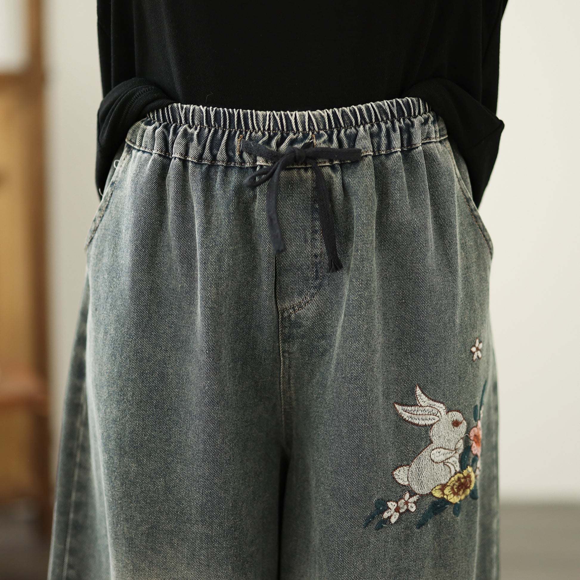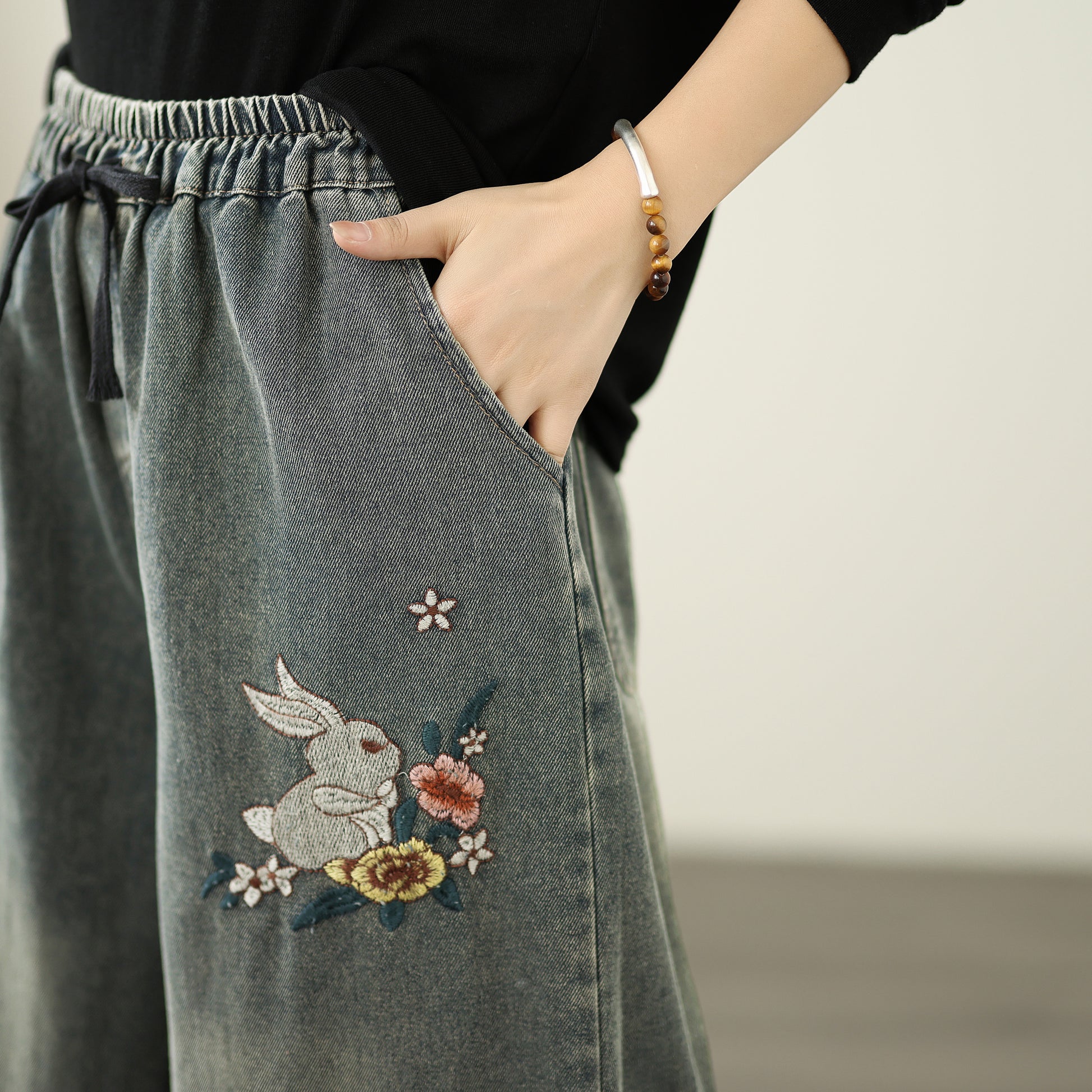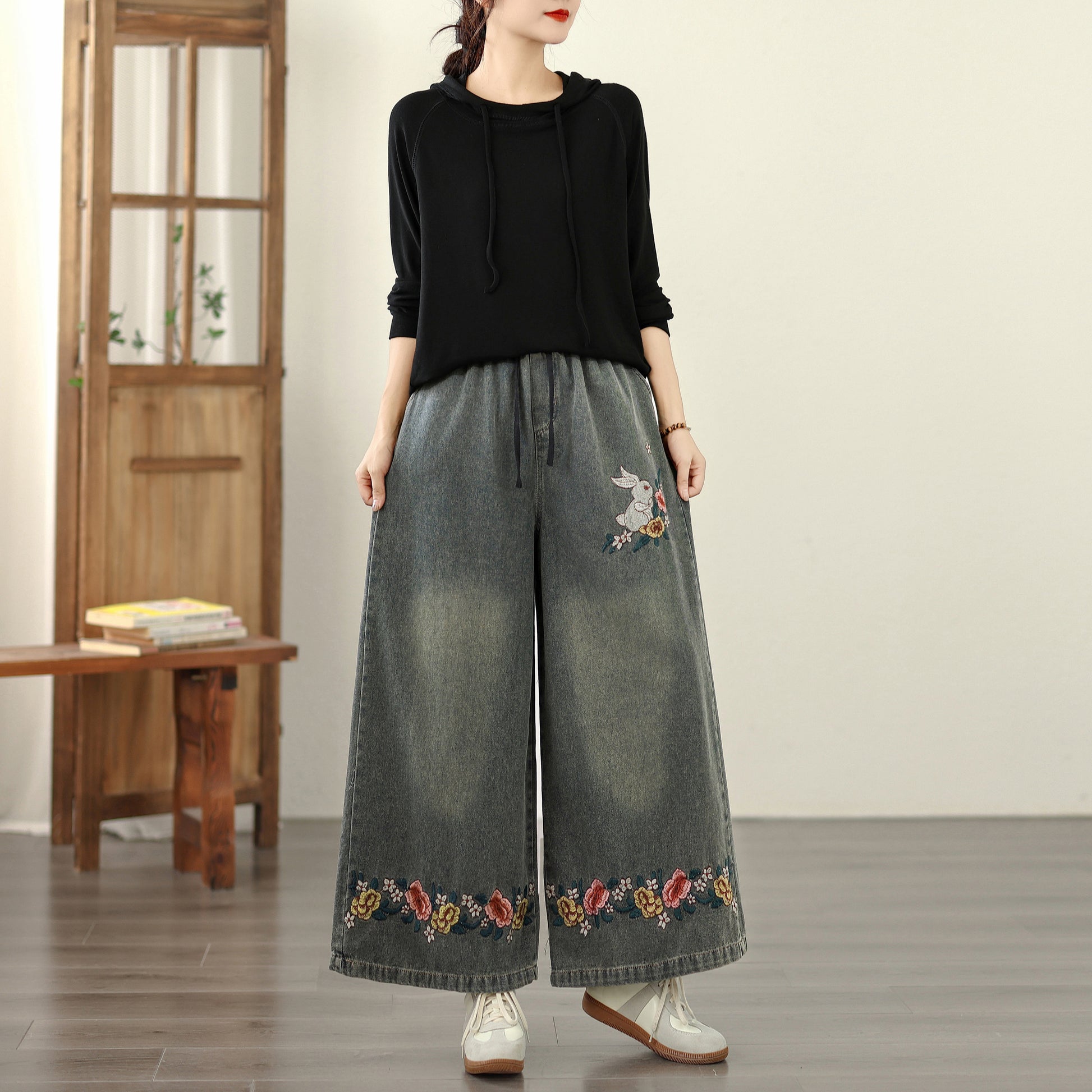 - Features: Fashion baggy jeans,Embroidery pattern,Casual loose,Drawstring elastic waisted,Wide Leg denim, Classic denim, flared jeans, pockets on the front and back. If you love wide-leg baggy jeans, this is definitely the best choice for you.