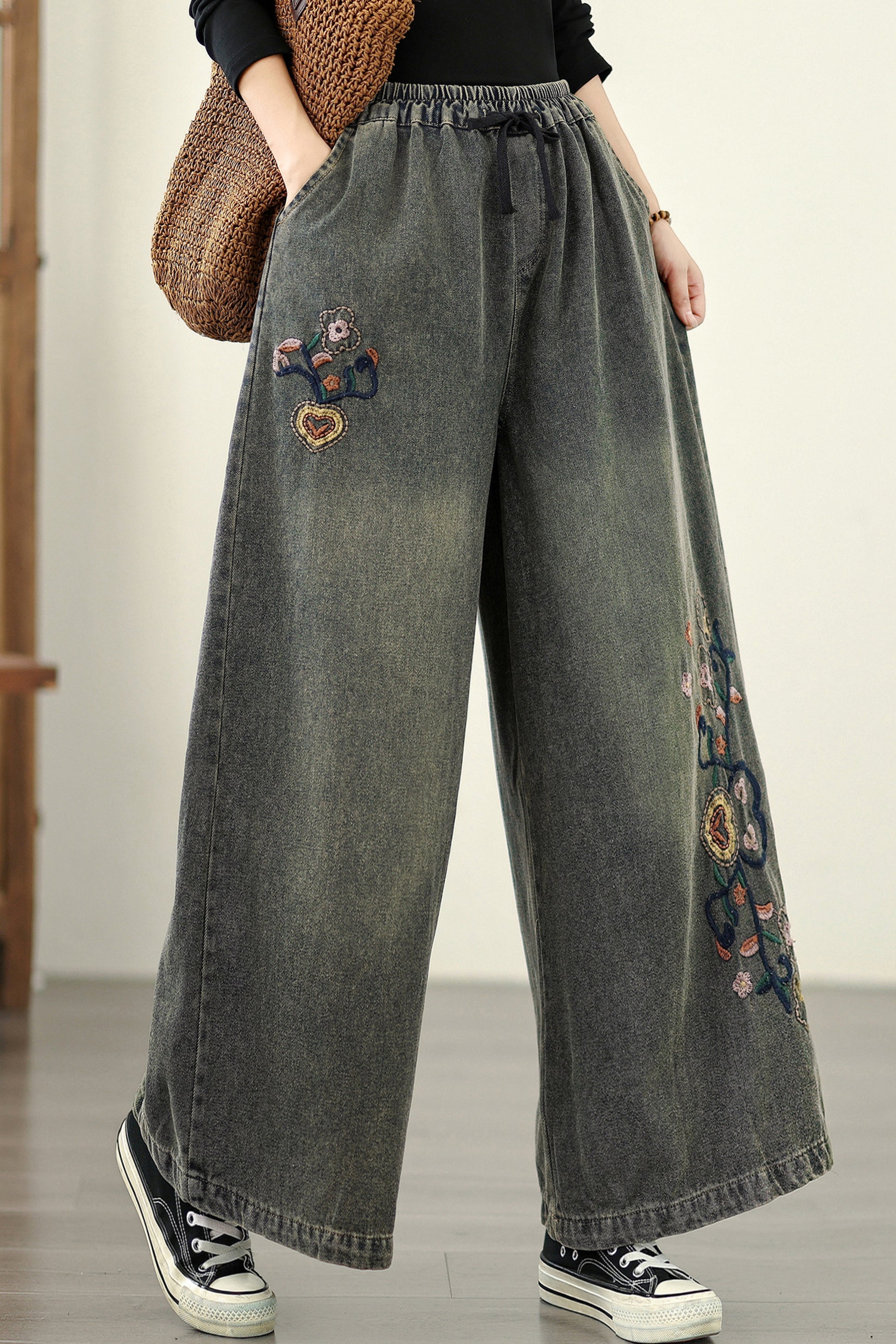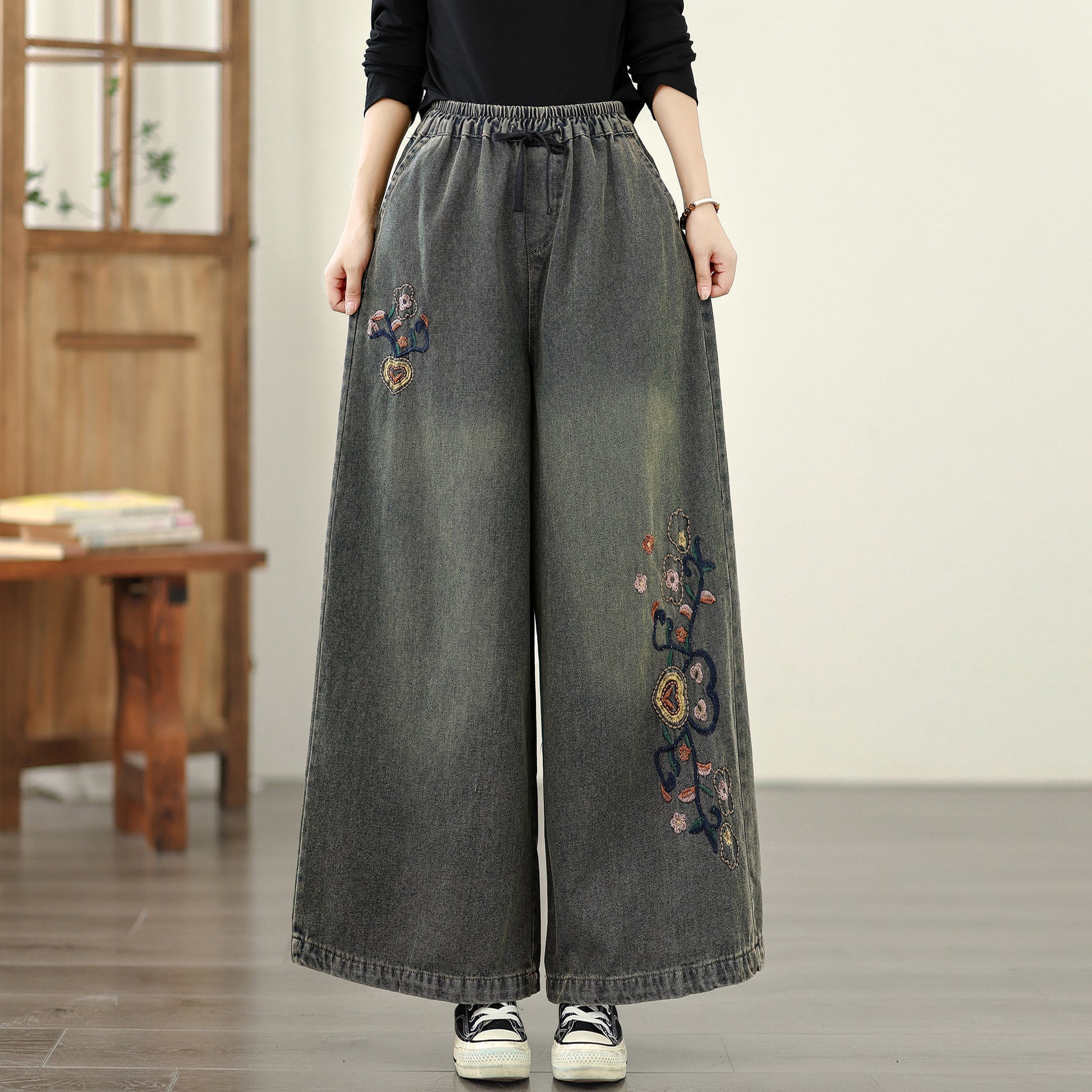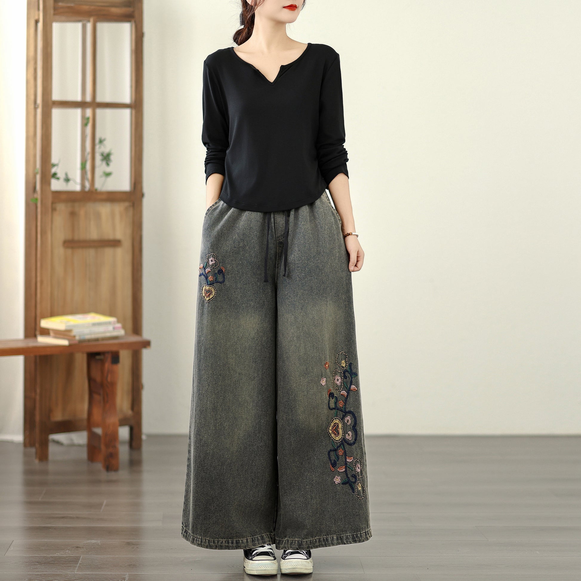 • Features: Fashion baggy jeans,Embroidery pattern,Casual loose,Drawstring elastic waisted,Wide Leg denim, Classic denim, flared jeans, pockets on the front and back. If you love wide-leg baggy jeans, this is definitely the best choice for you.