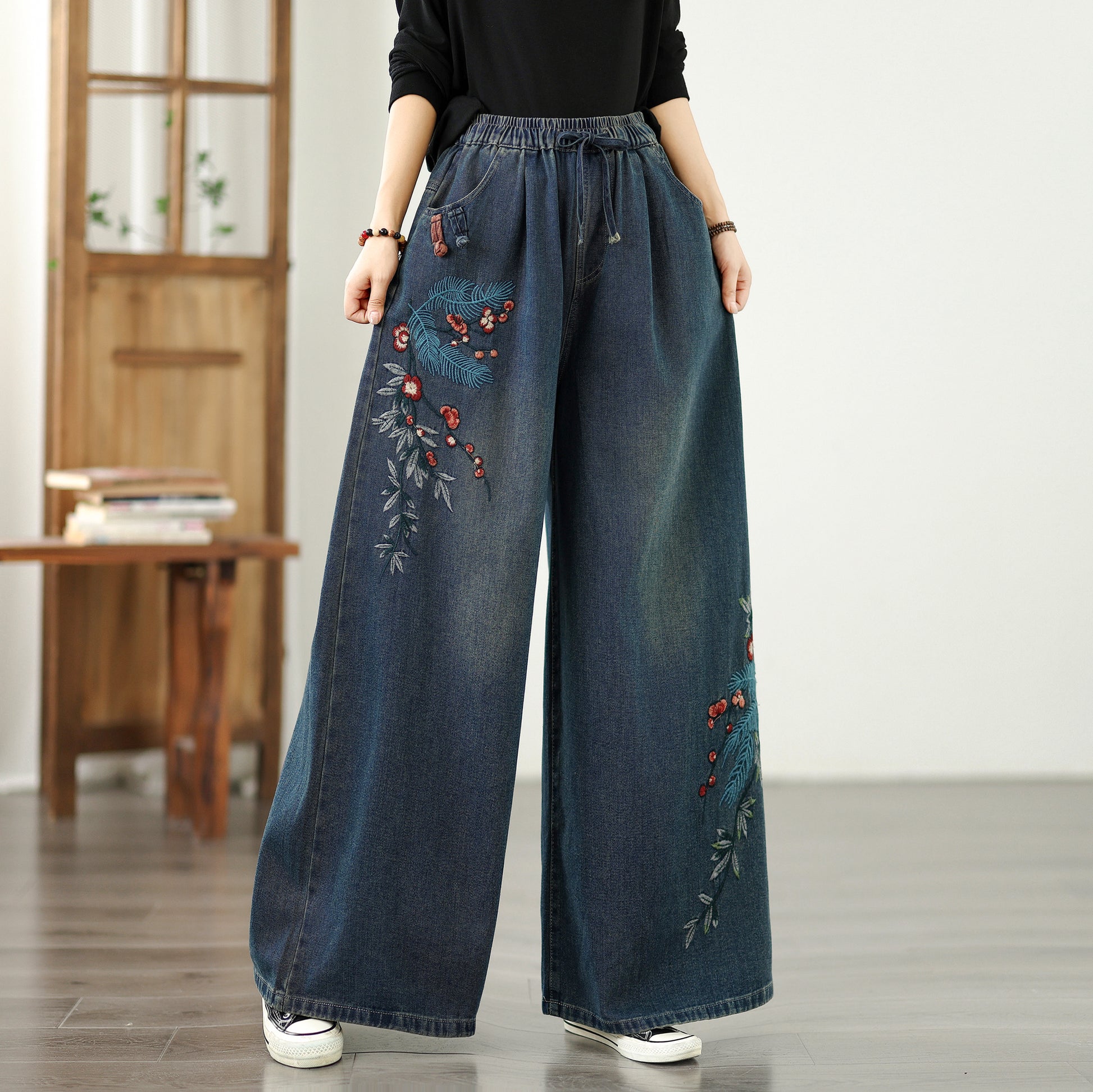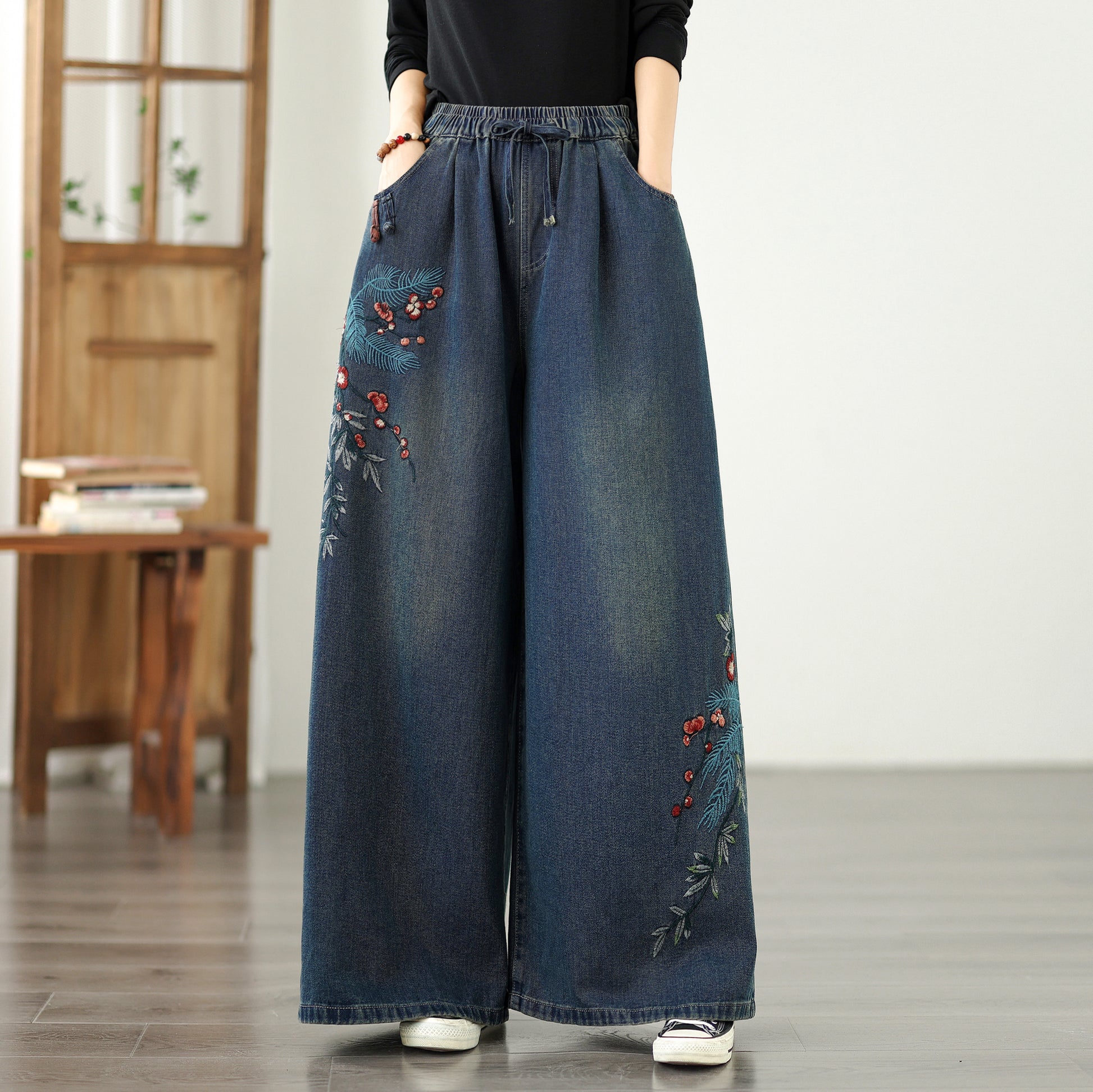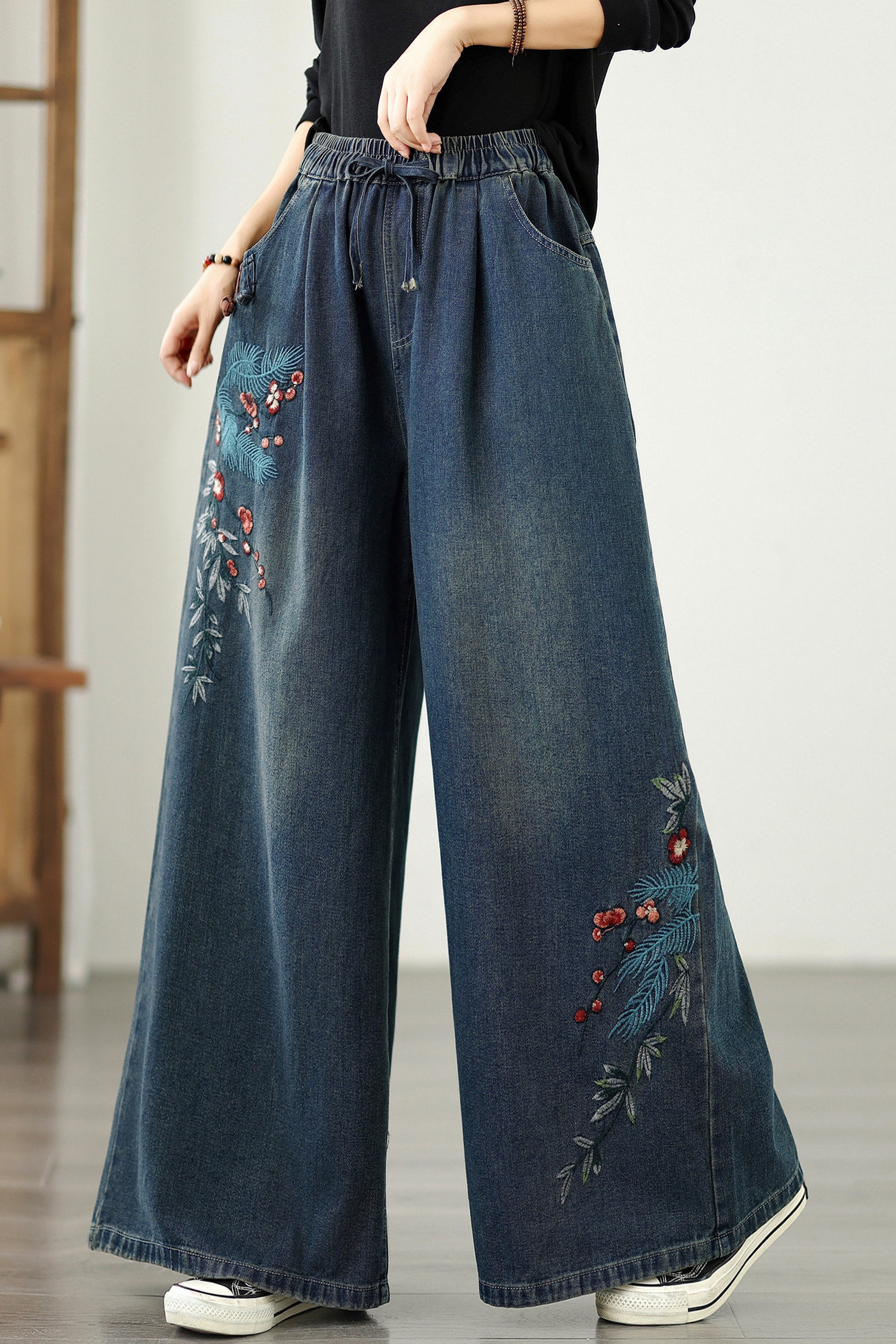 - Features: Fashion baggy jeans,Embroidery pattern,Casual loose,Drawstring elastic waisted,Wide Leg denim, Classic denim, flared jeans, pockets on the front and back. If you love wide-leg baggy jeans, this is definitely the best choice for you.