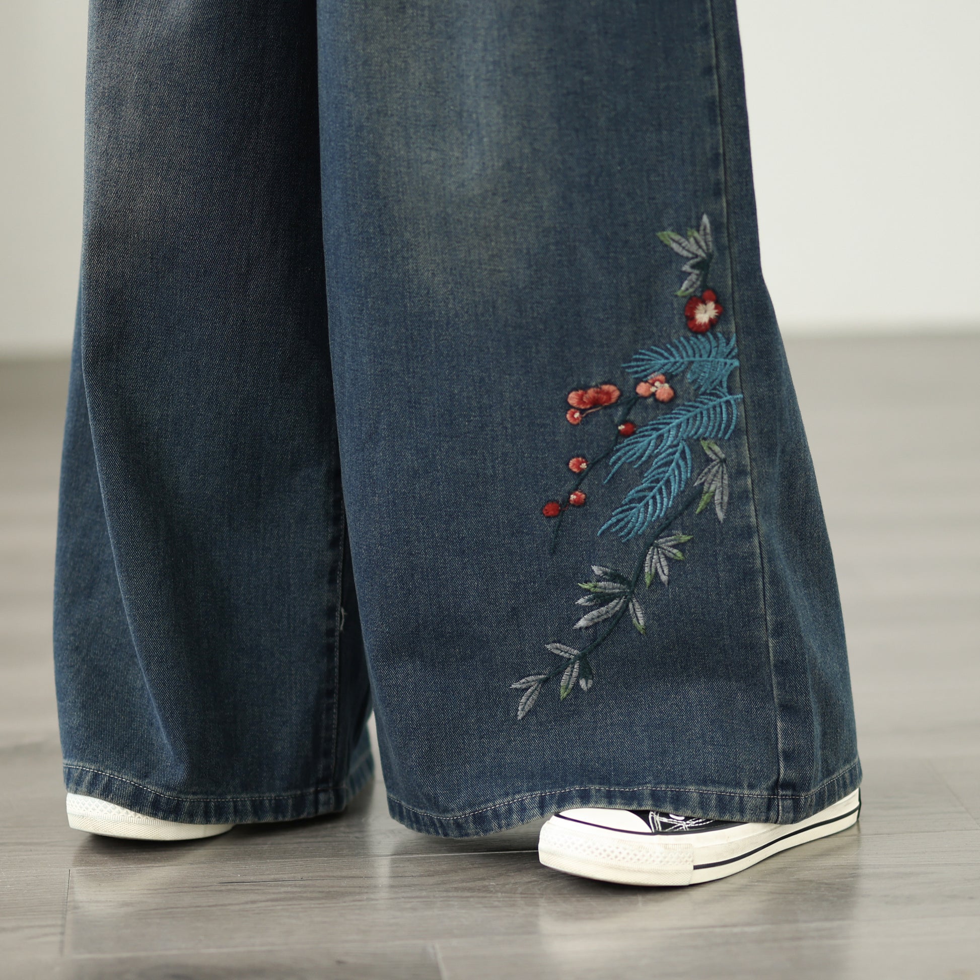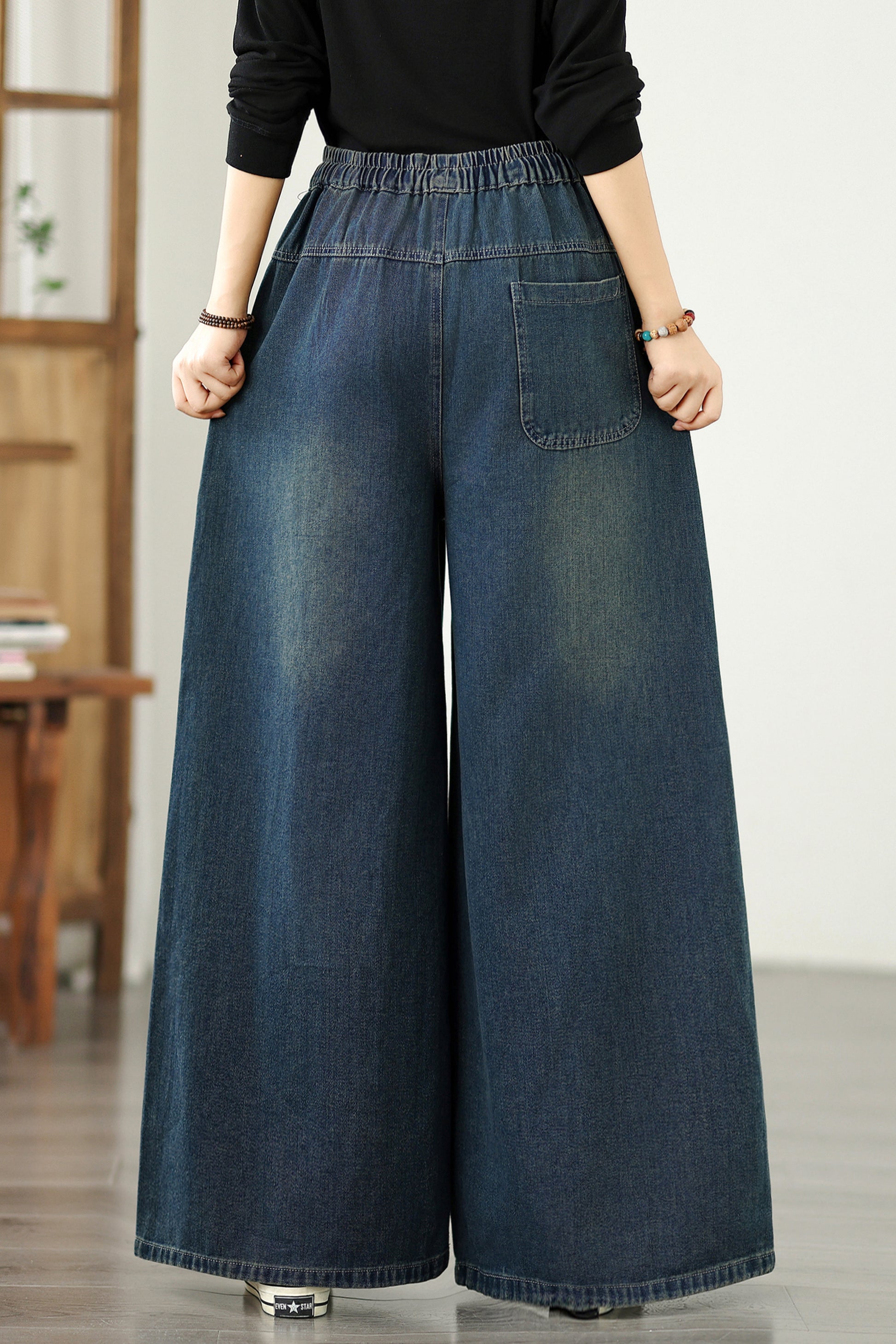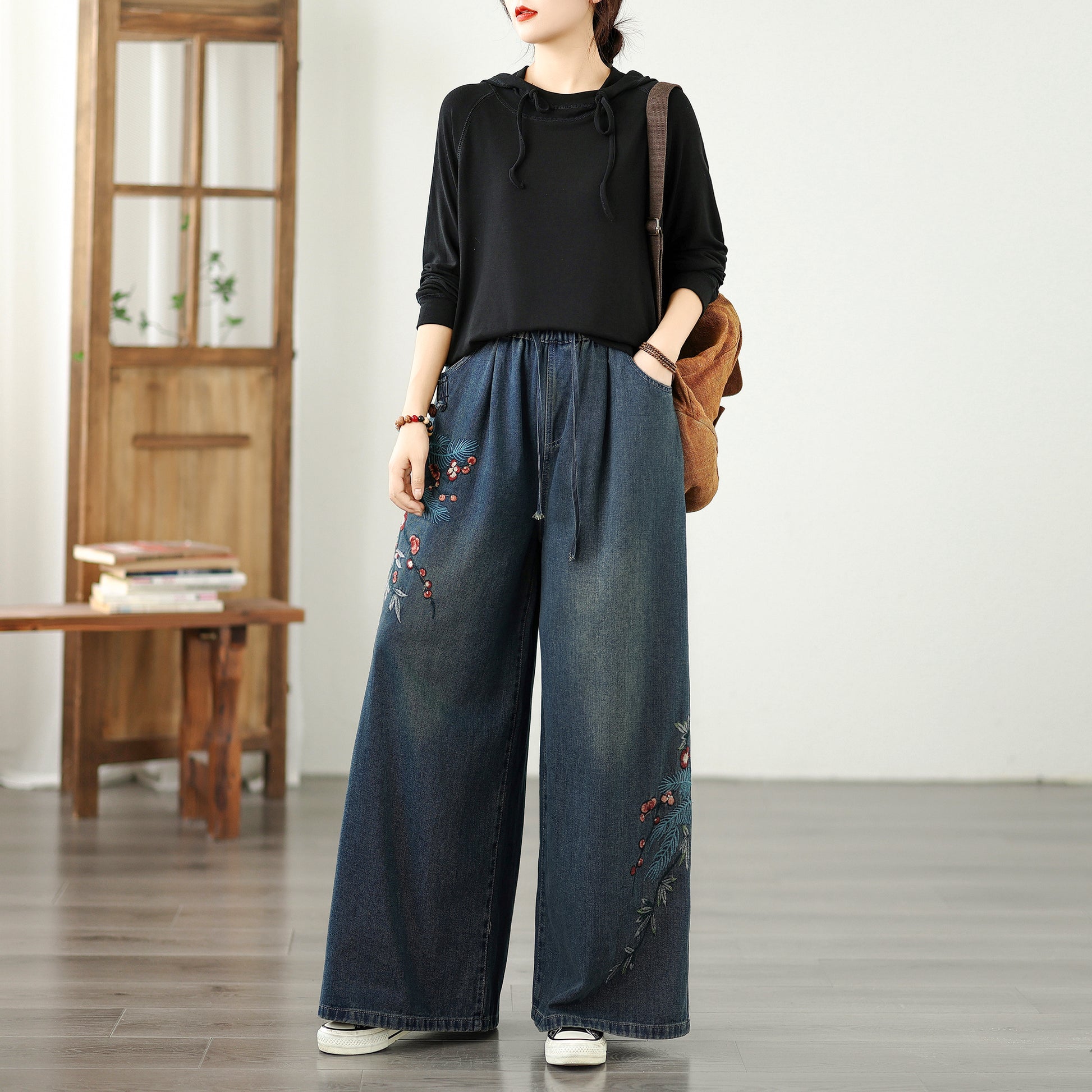 - Features: Fashion baggy jeans,Embroidery pattern,Casual loose,Drawstring elastic waisted,Wide Leg denim, Classic denim, flared jeans, pockets on the front and back. If you love wide-leg baggy jeans, this is definitely the best choice for you.