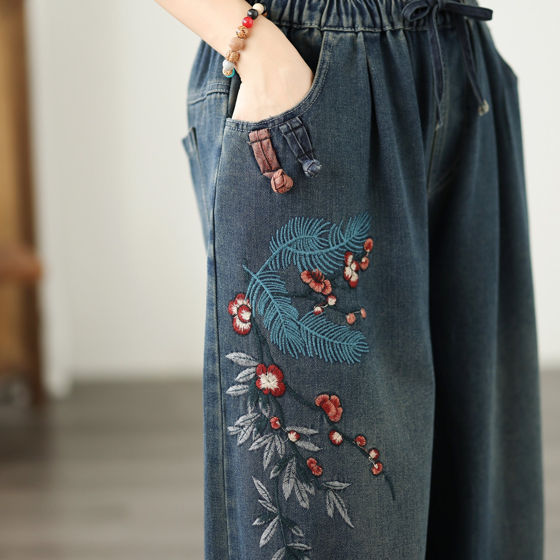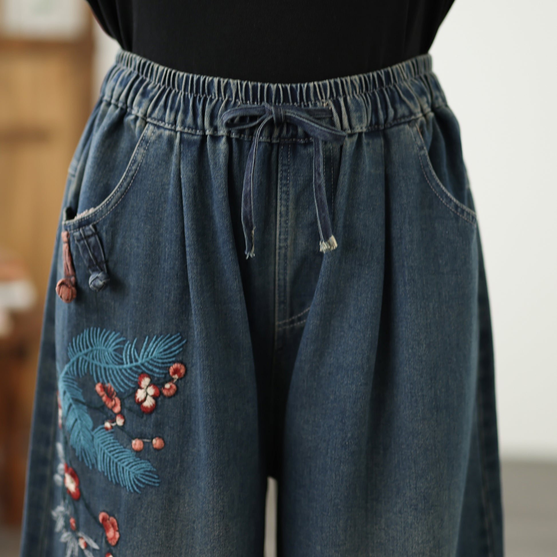 Women's Baggy Jeans Embroidery Drawstring Waist Wide Leg