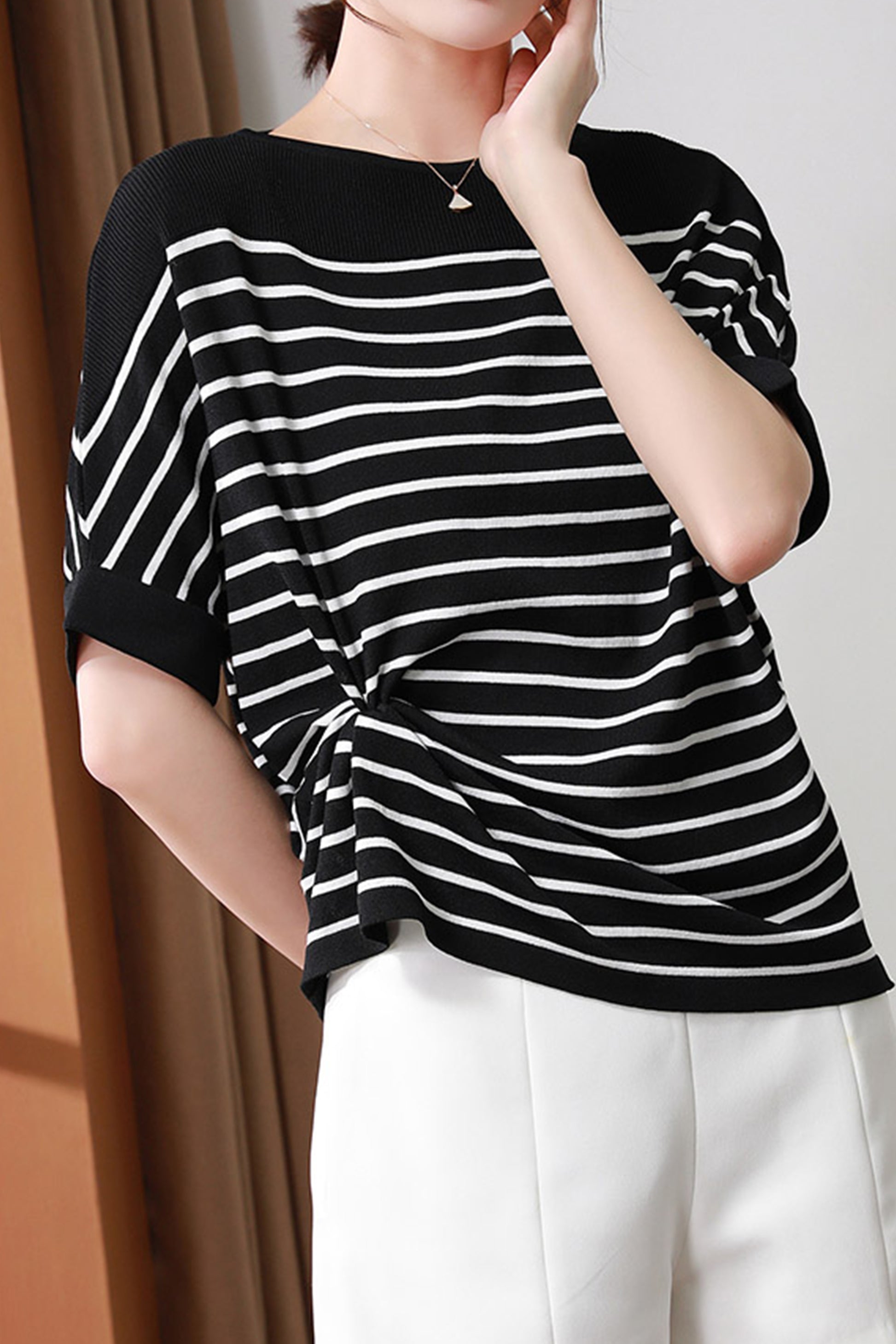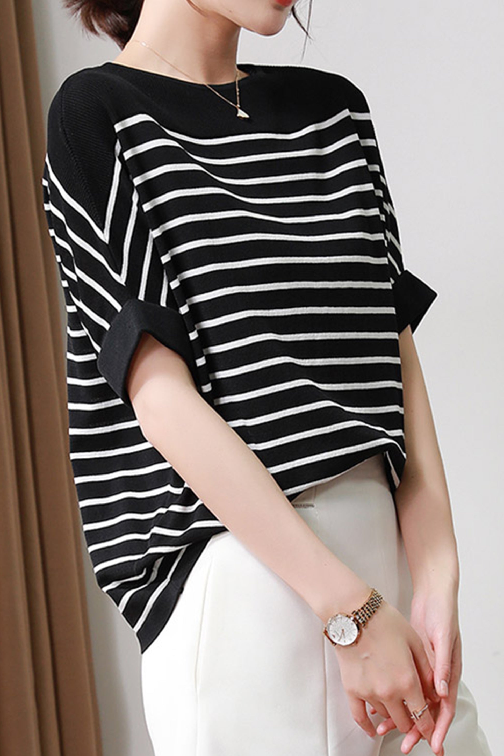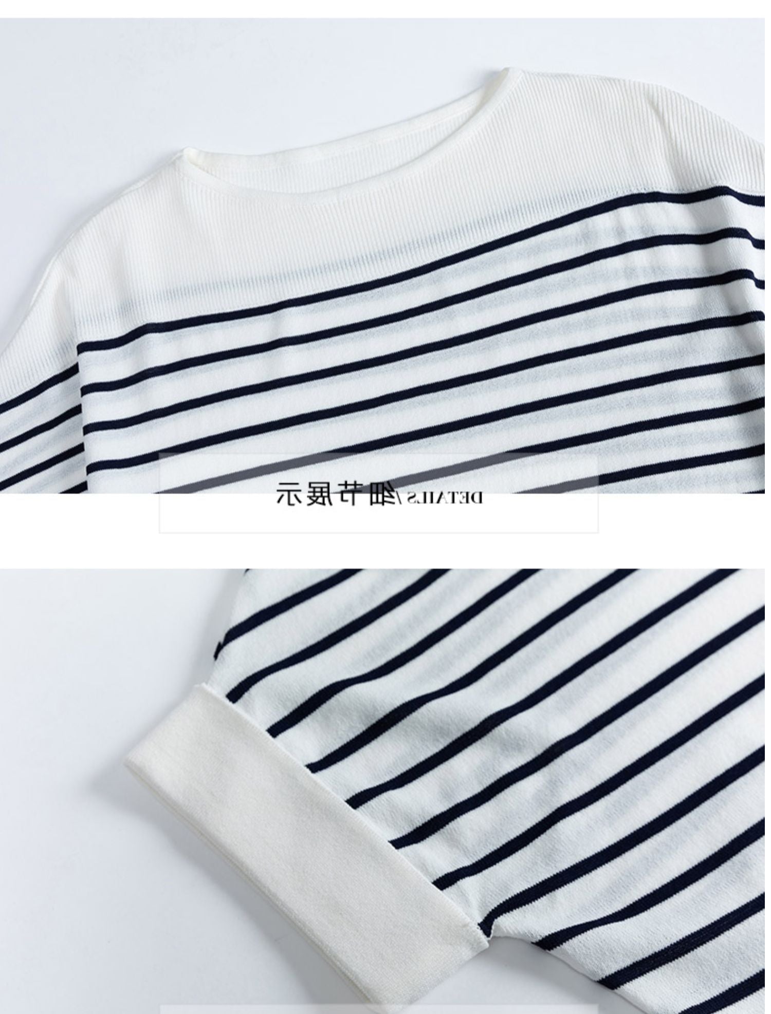 - Features: Boat collar, short-sleeved knitted sweater, loose, striped, bat sleeve, pullover base shirt