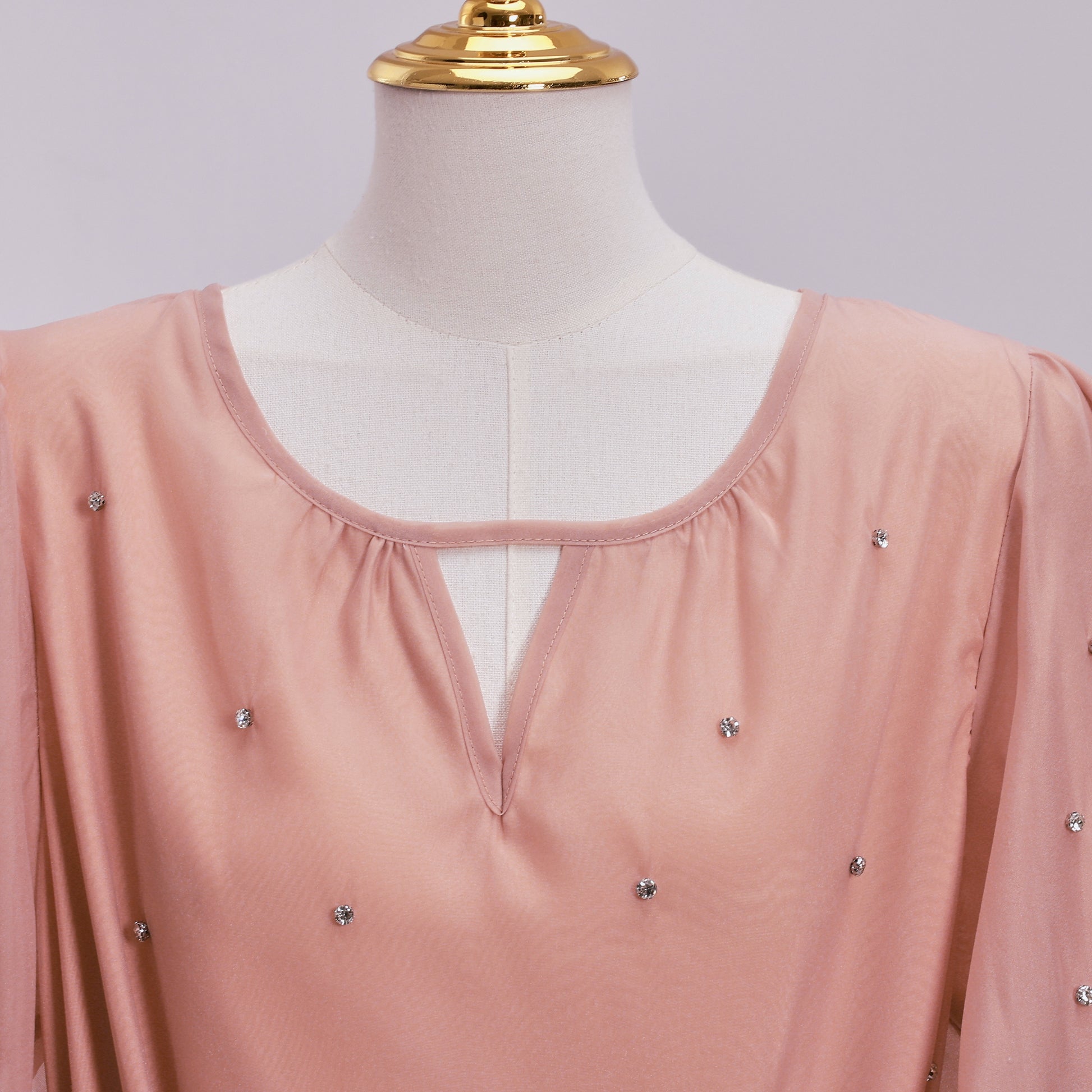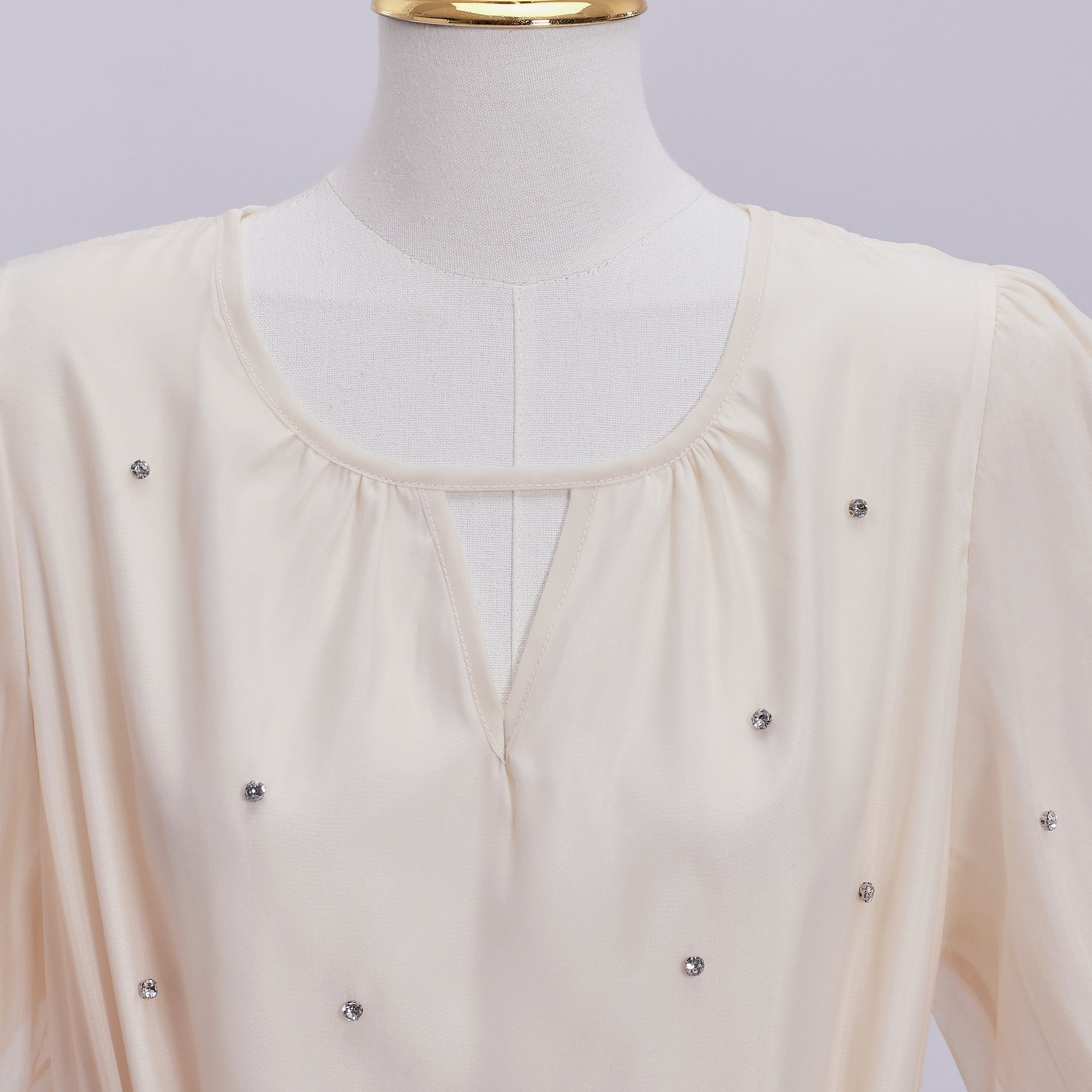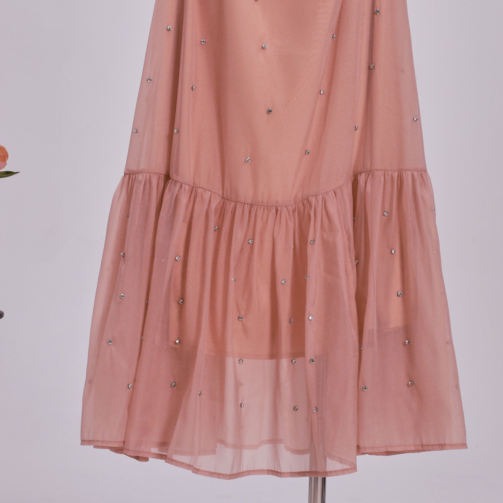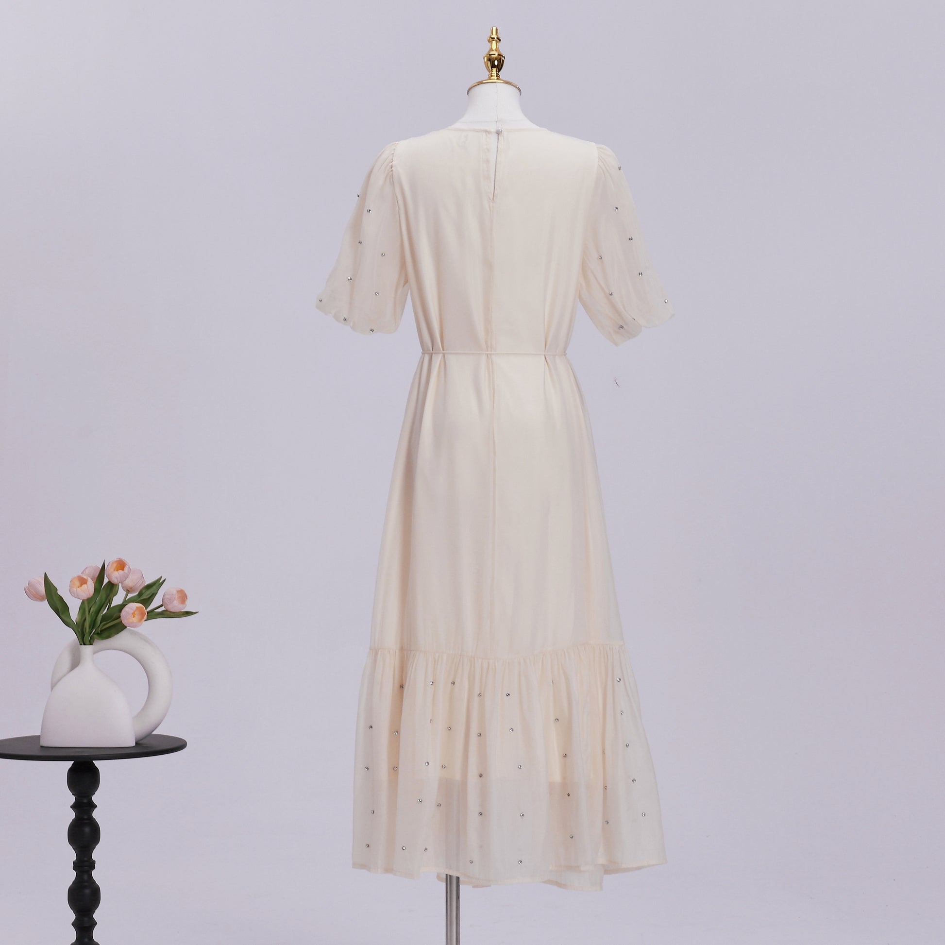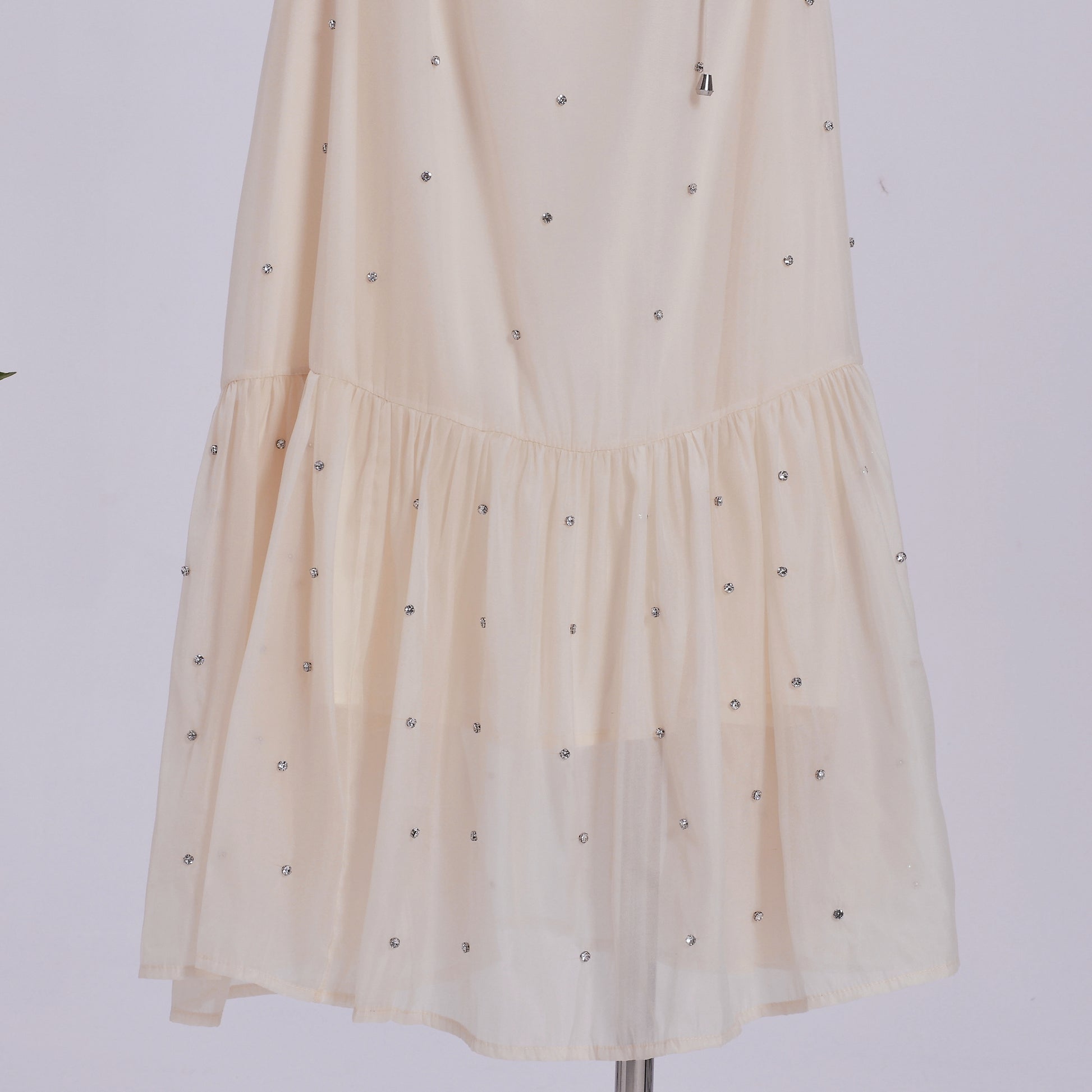 - Design: The entire body is scattered with hand-stitched miniature beads, which sparkle in the sunlight like tiny diamonds. The ruffled hem undulates like waves as you walk, exuding a natural sense of elegance. The fit is loose and comfortable to wear freely.