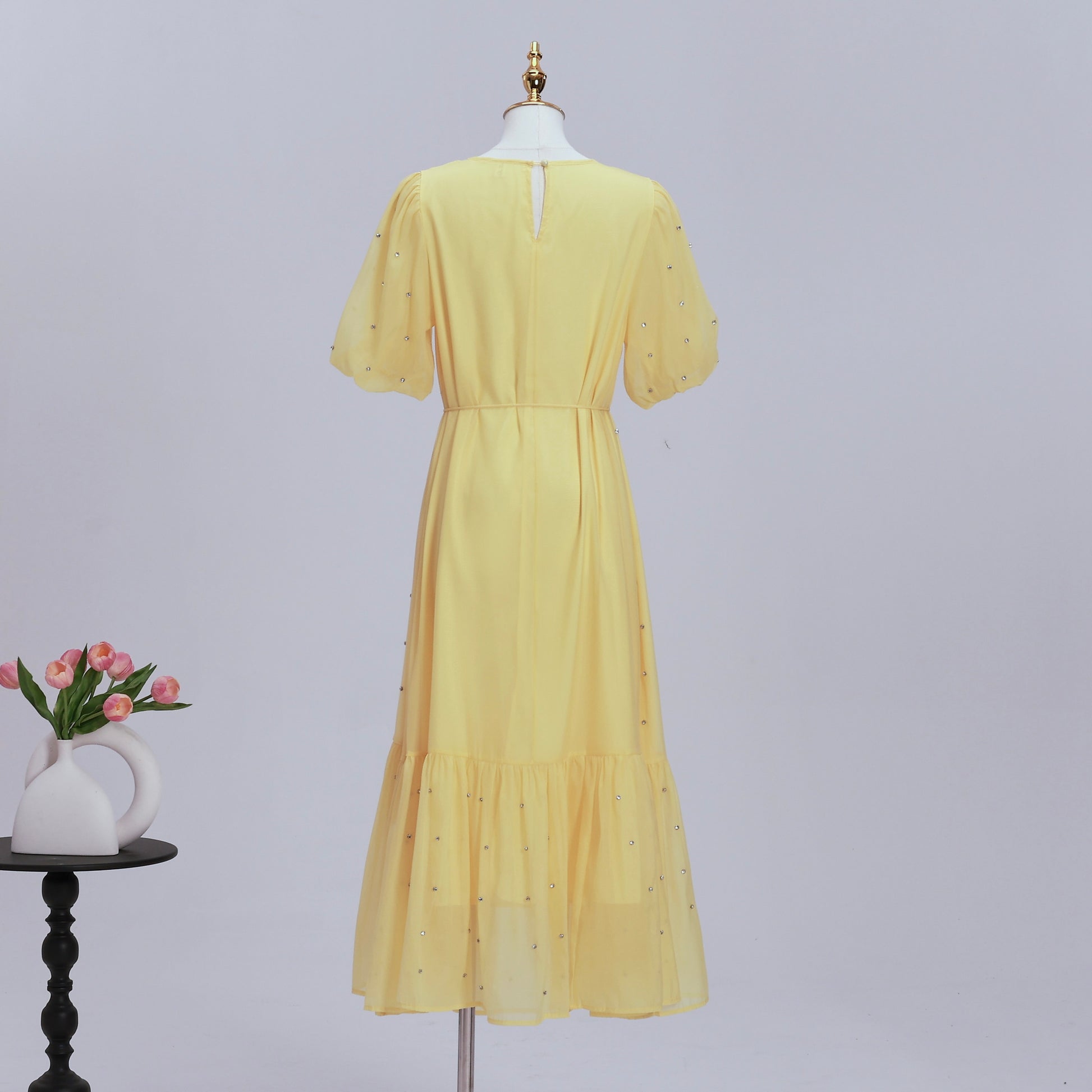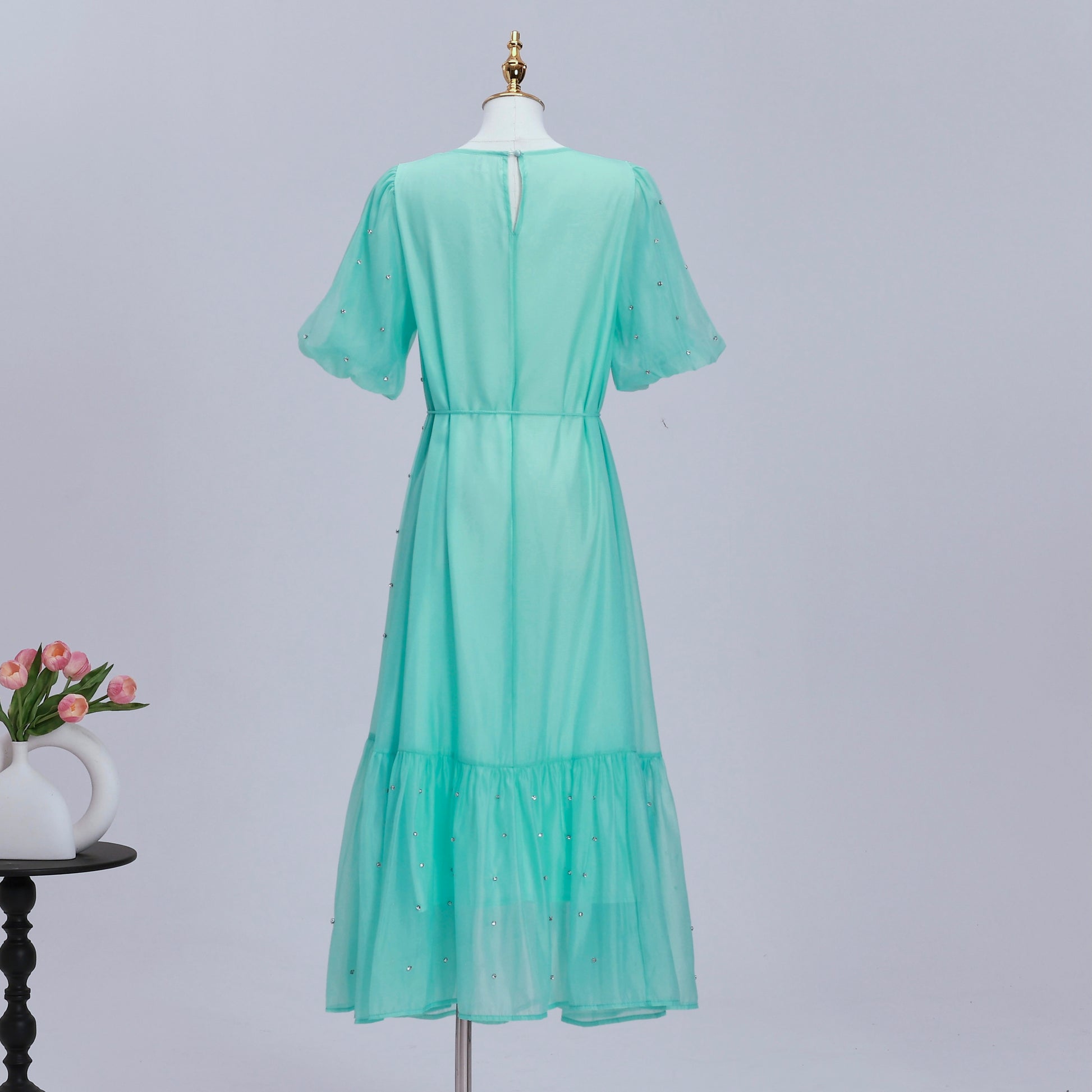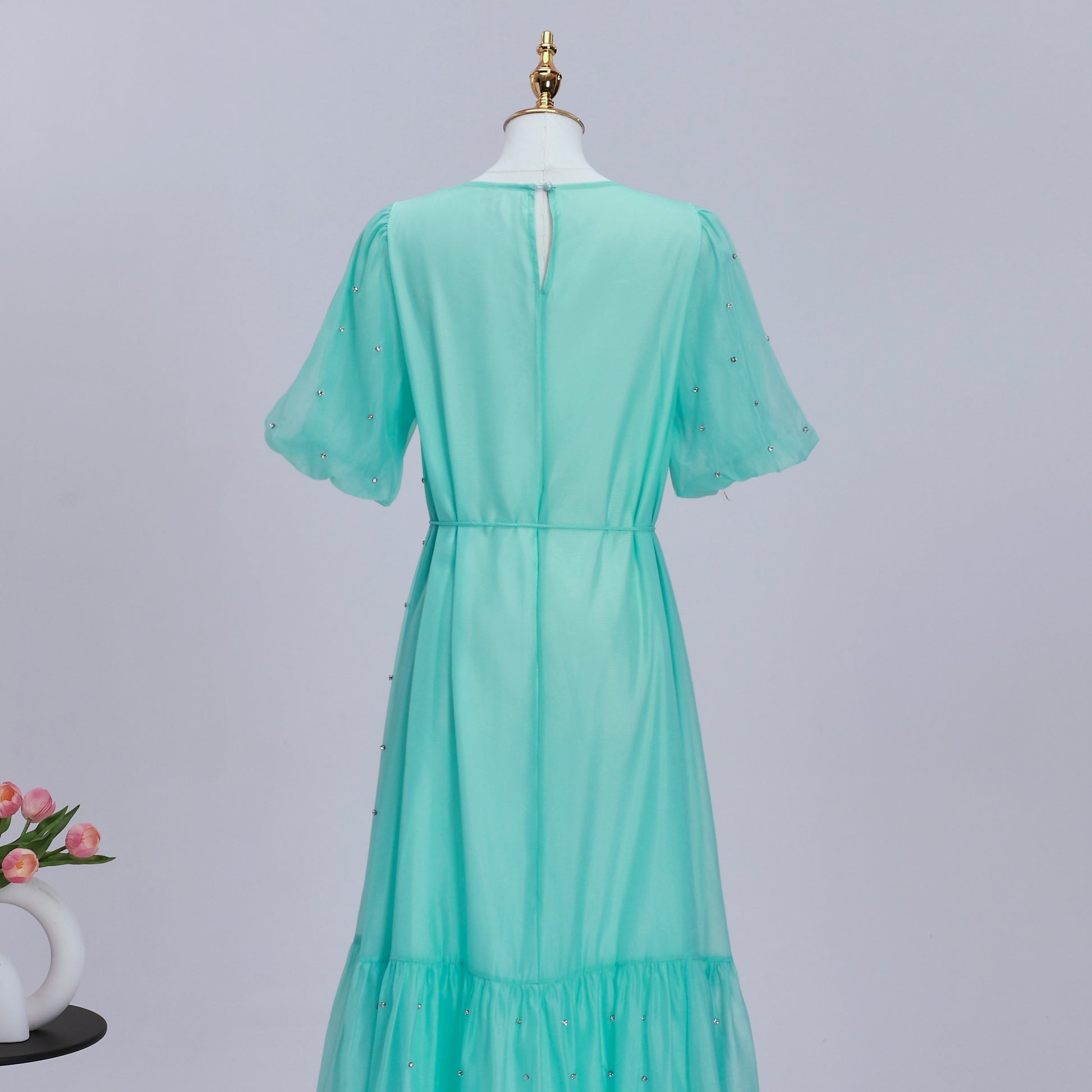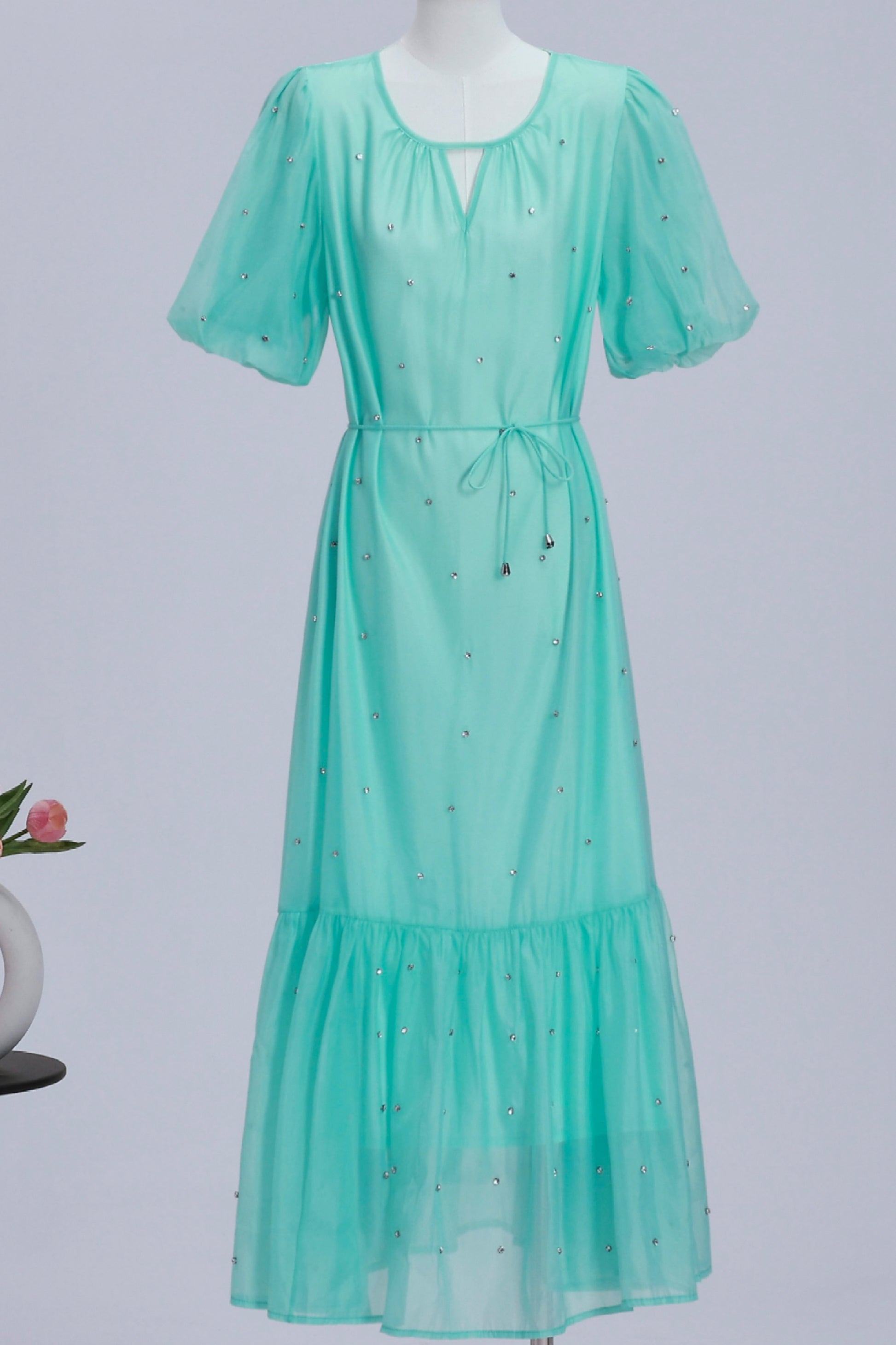- Features: Beaded, cut out round neck, puffed sleeves, ruffled hem, loose, belt, summer casual dress.
