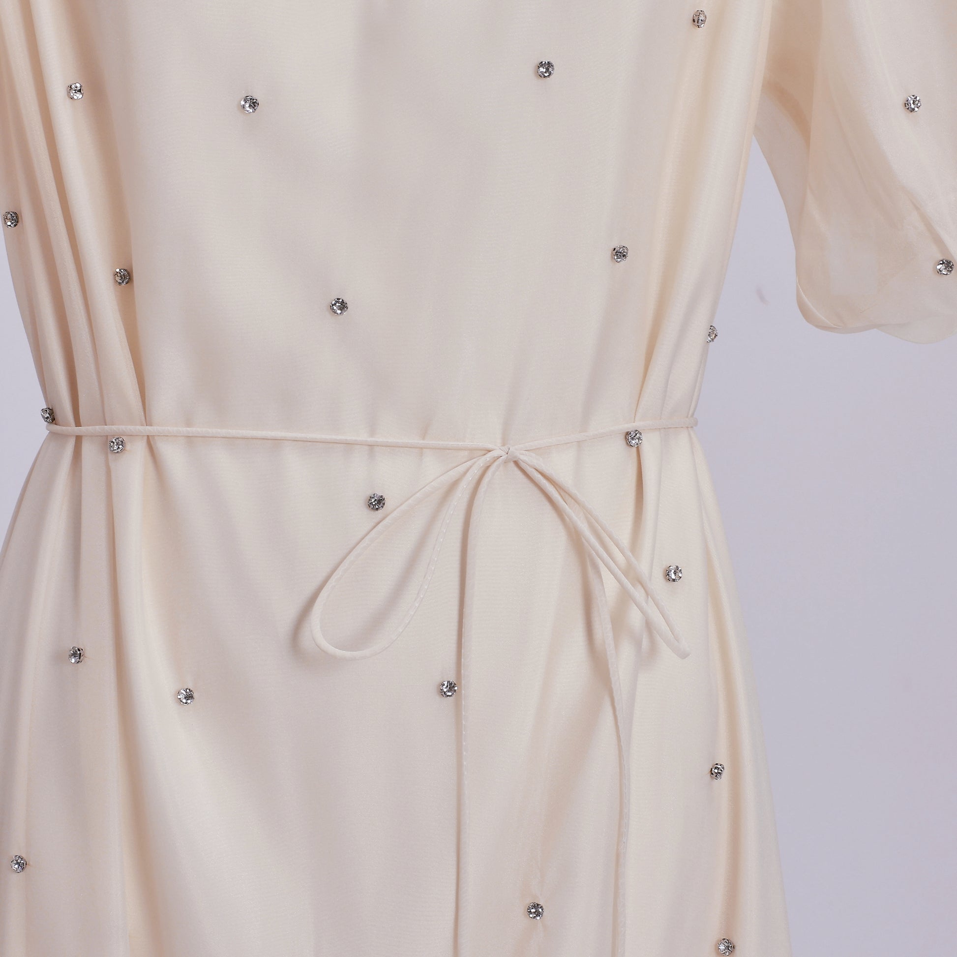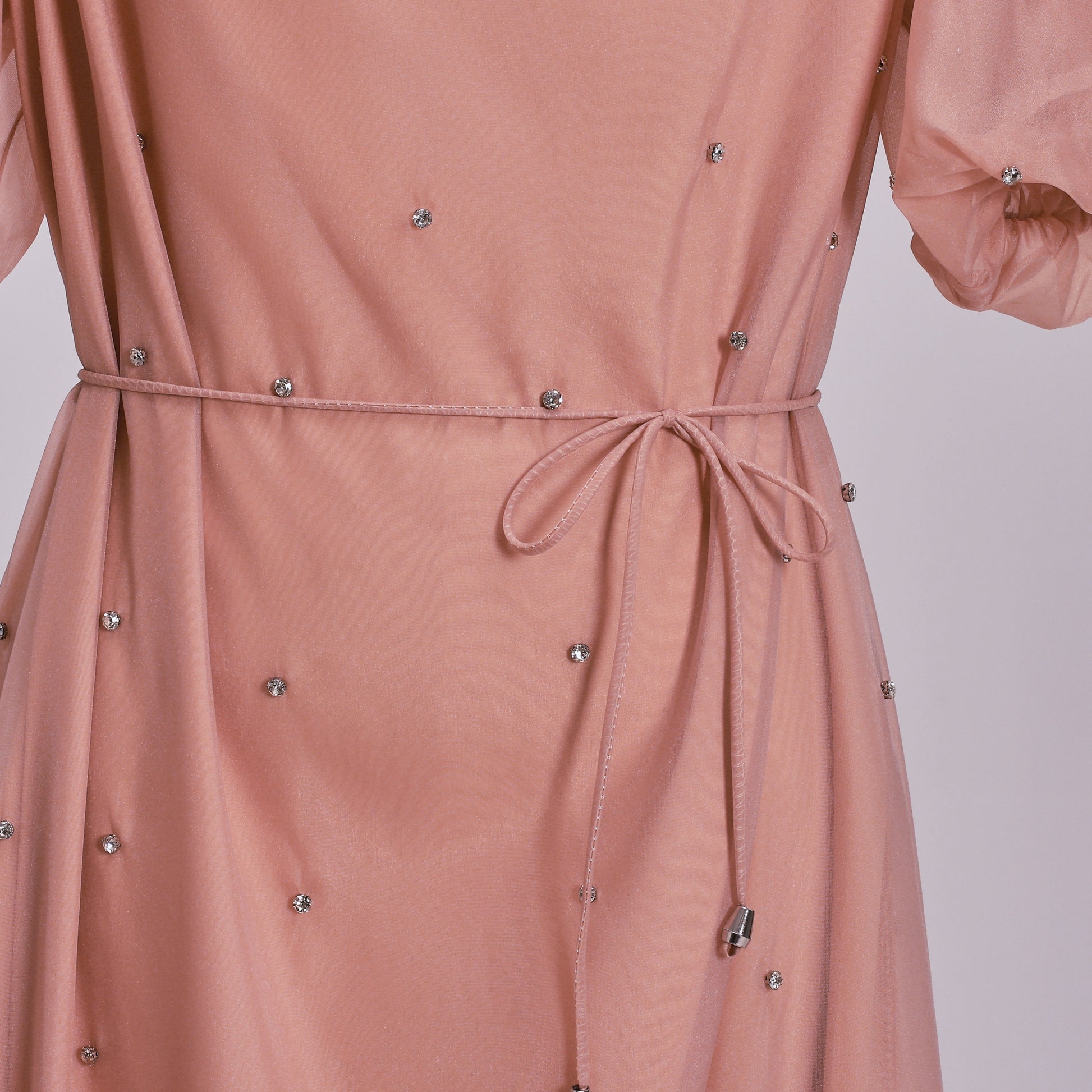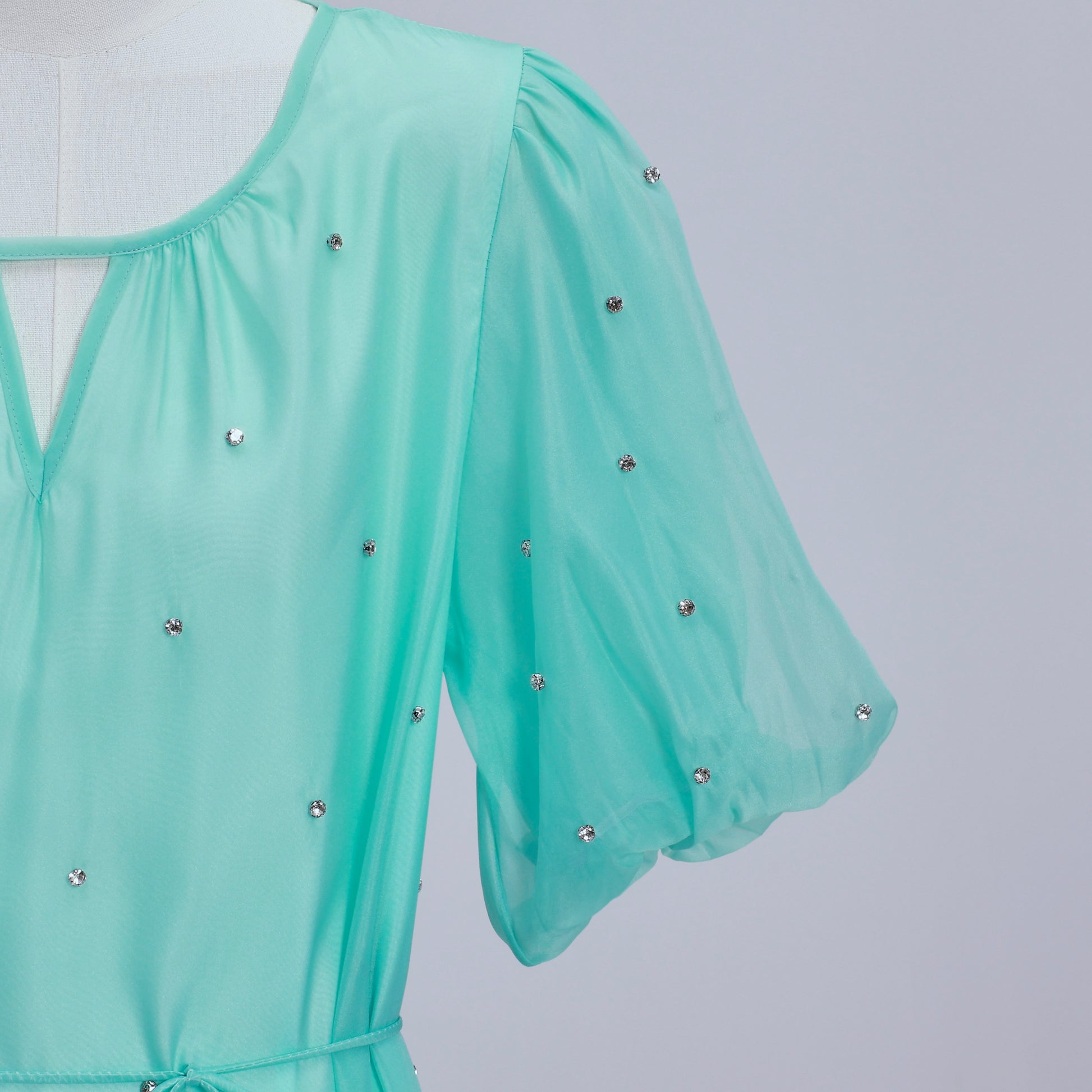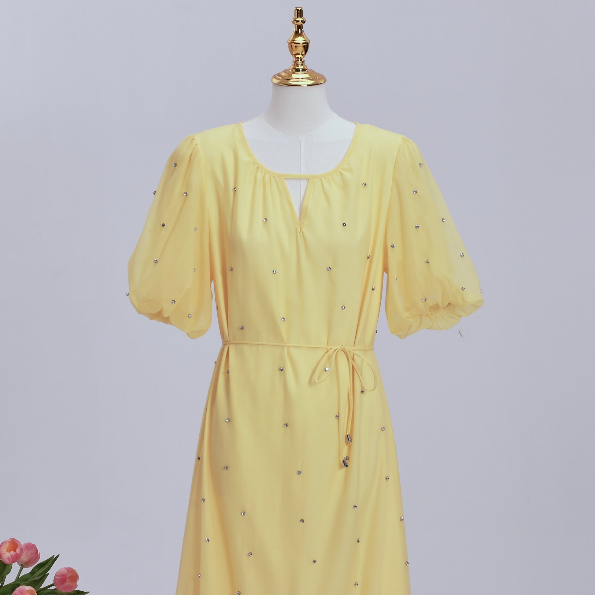 - Features: Beaded, cut out round neck, puffed sleeves, ruffled hem, loose, belt, summer casual dress.