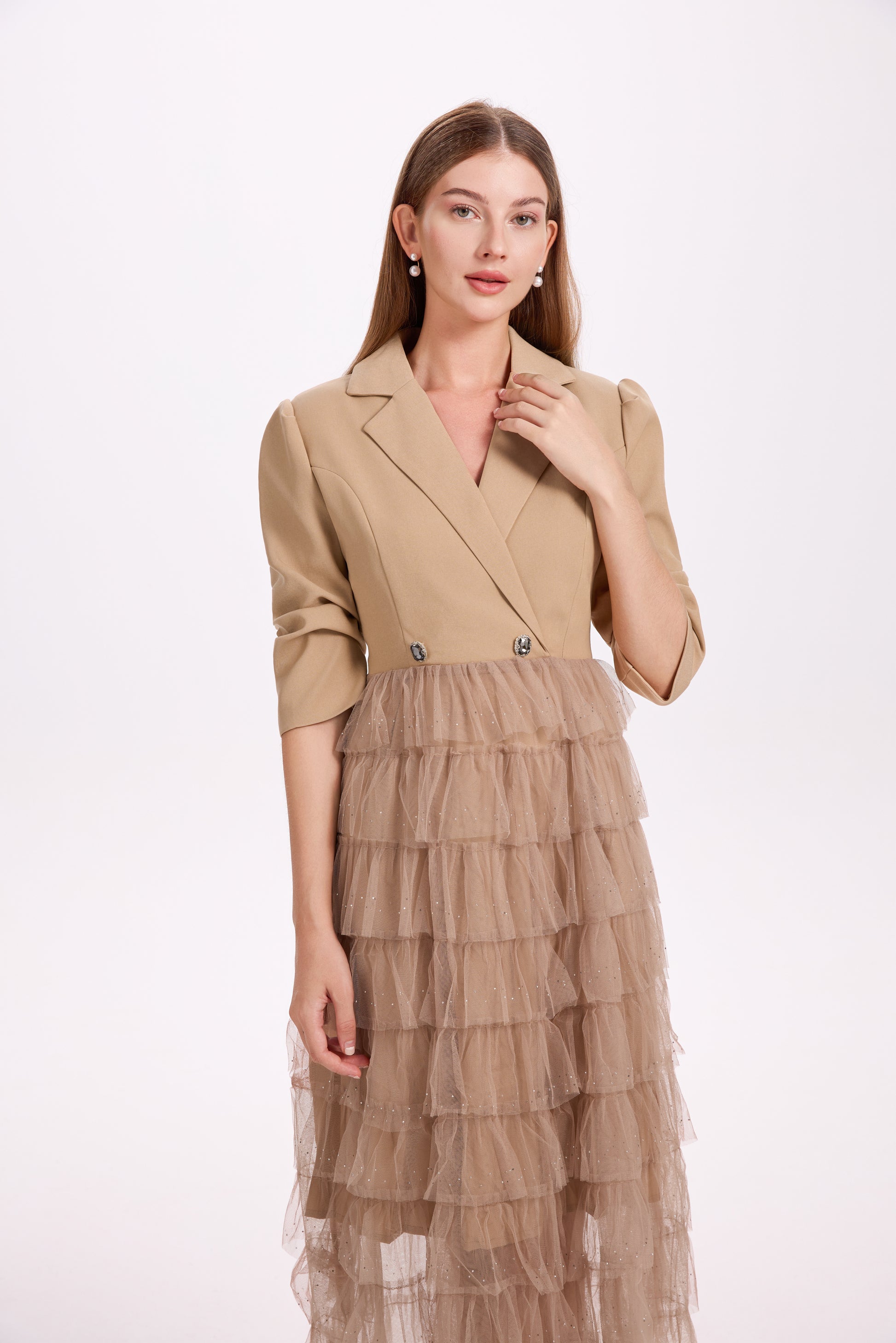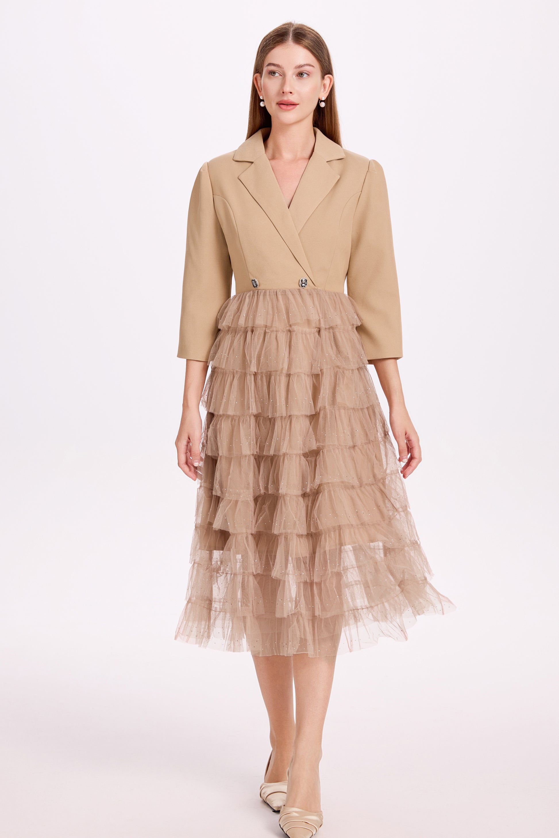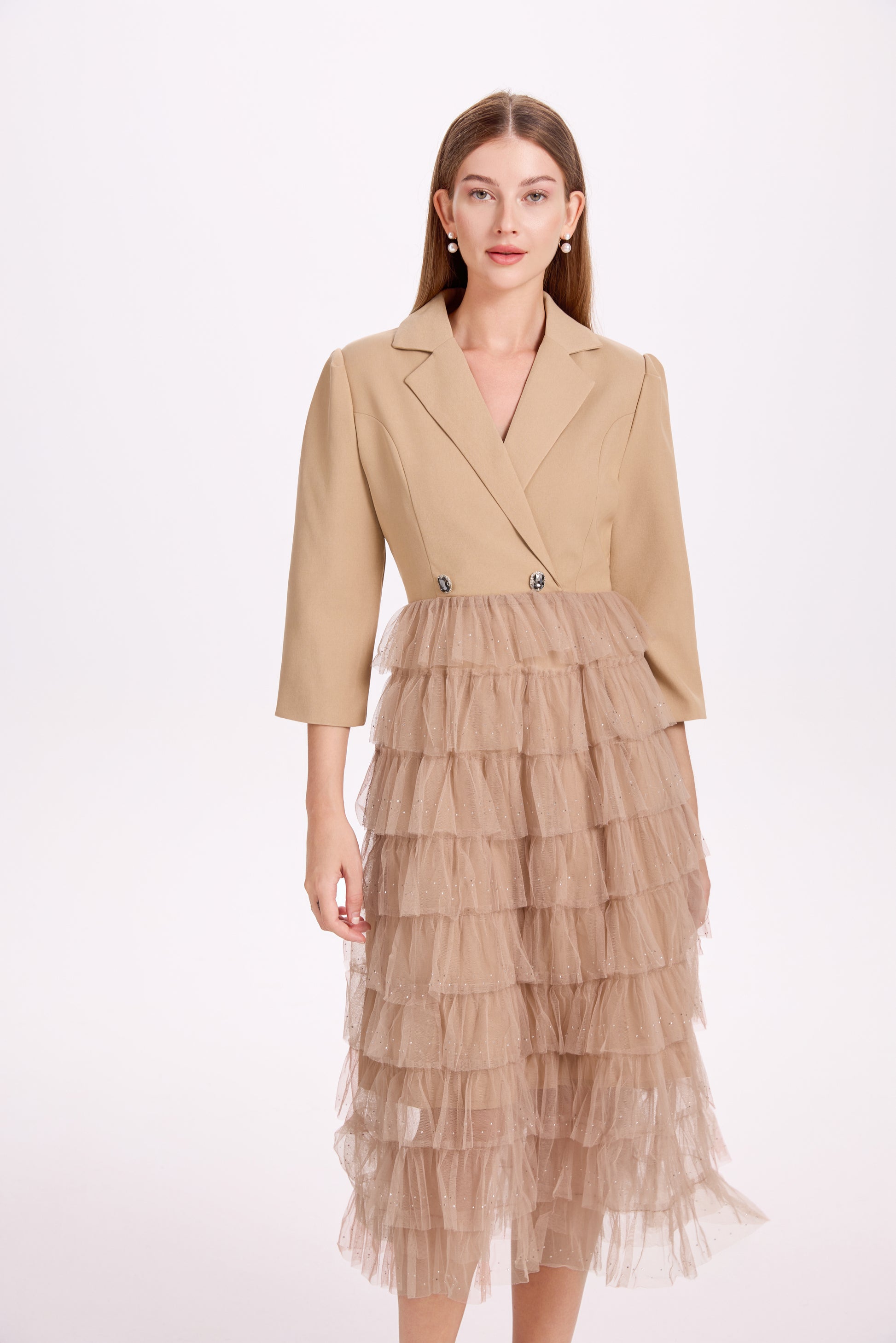 - Feature: blazer Dresses,notched lapel V-neck, 3/4 sleeves, patchwork tulle dress, layered hem, suit dress, fake two-piece ruffled tiered layered mesh dress.