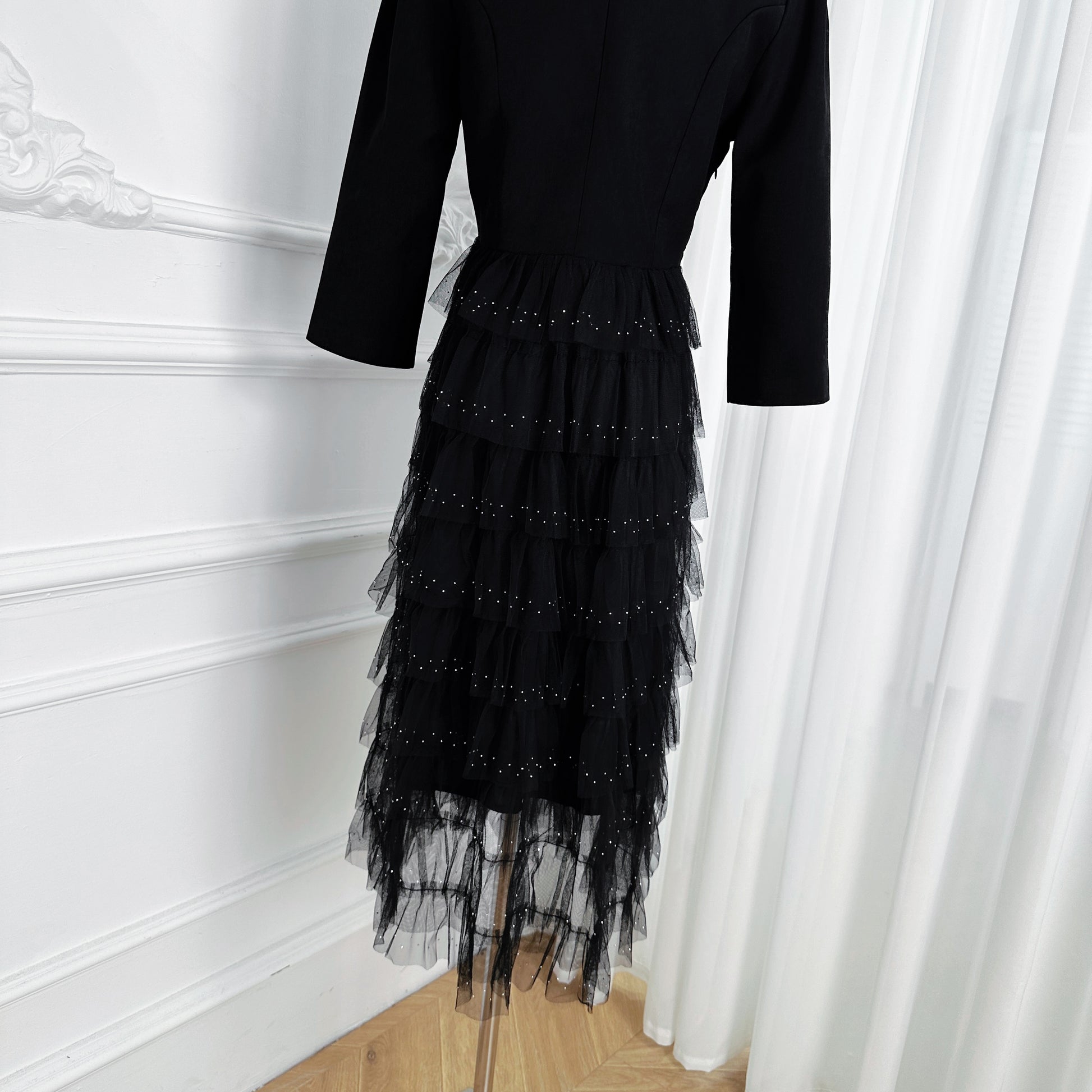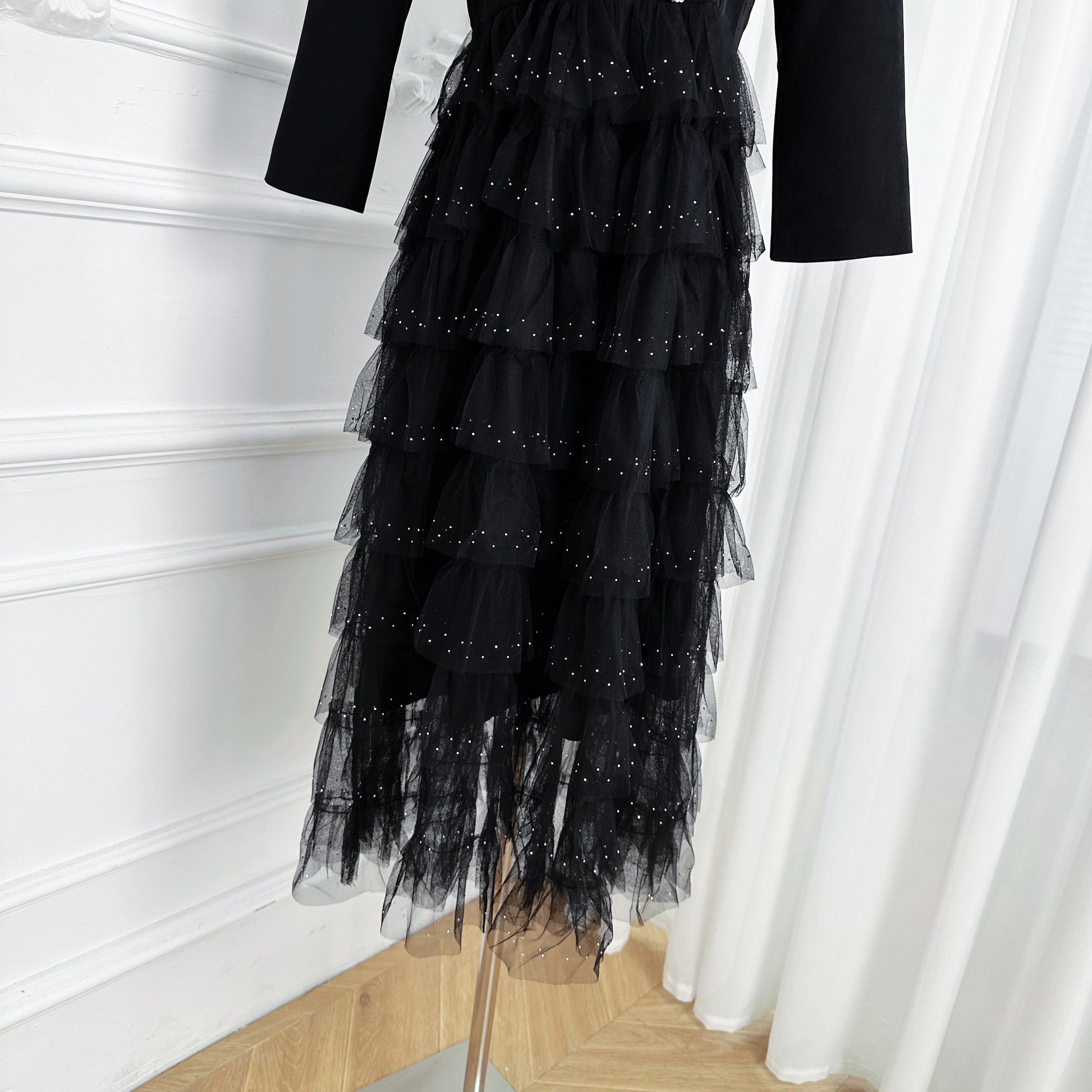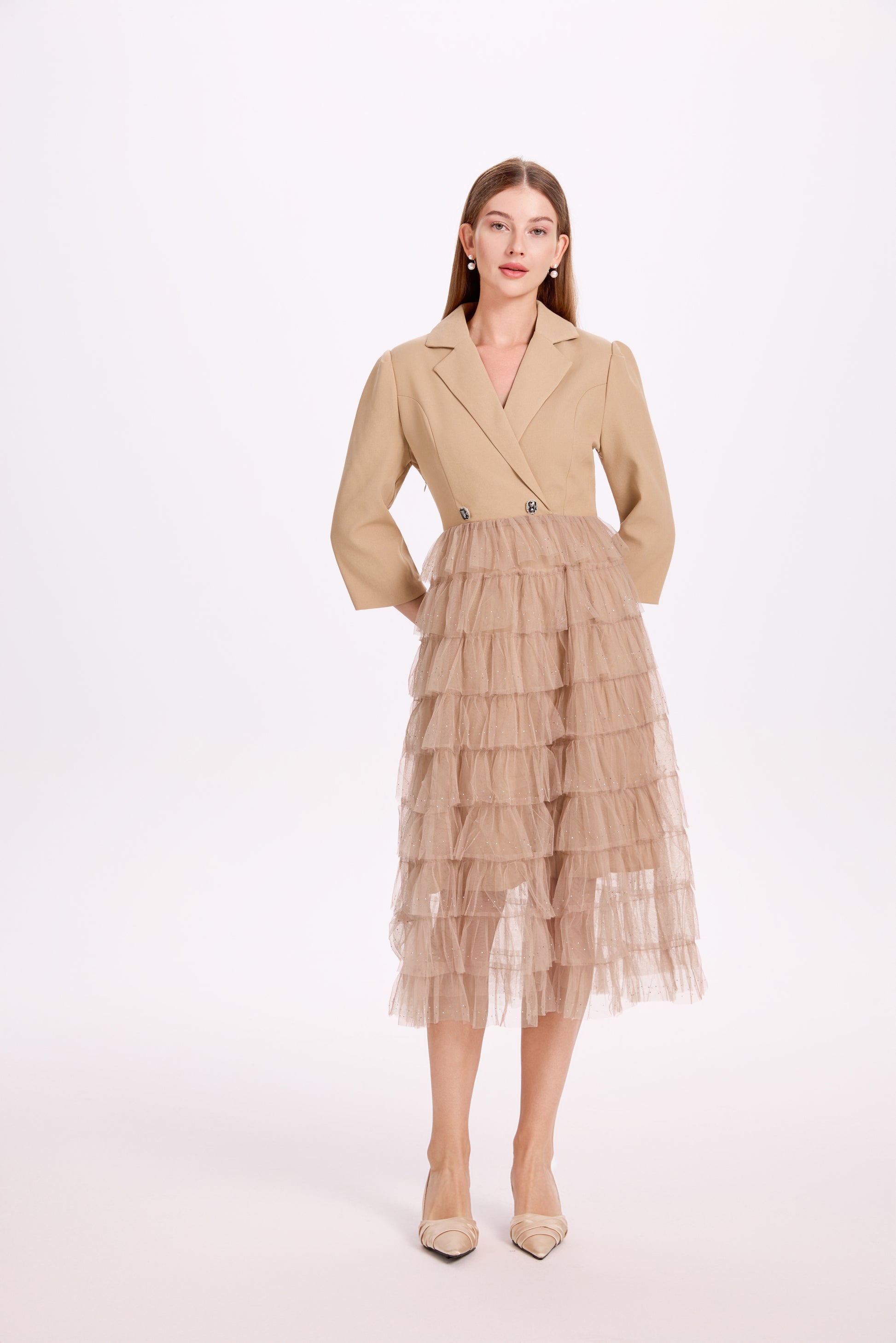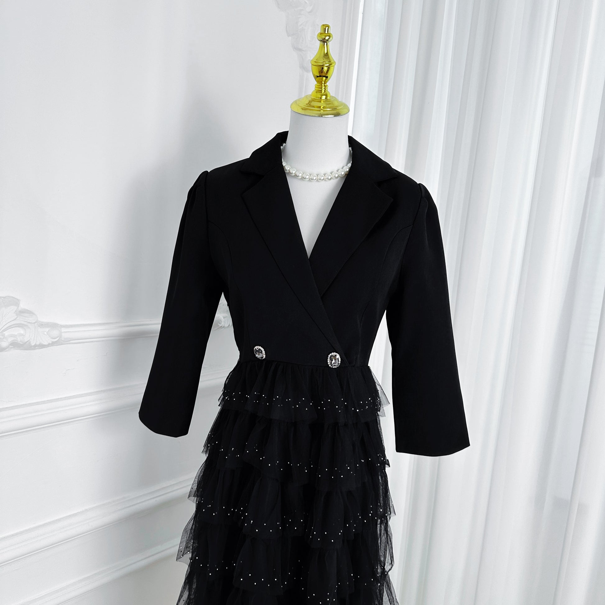 - Feature: blazer Dresses,notched lapel V-neck, 3/4 sleeves, patchwork tulle dress, layered hem, suit dress, fake two-piece ruffled tiered layered mesh dress.