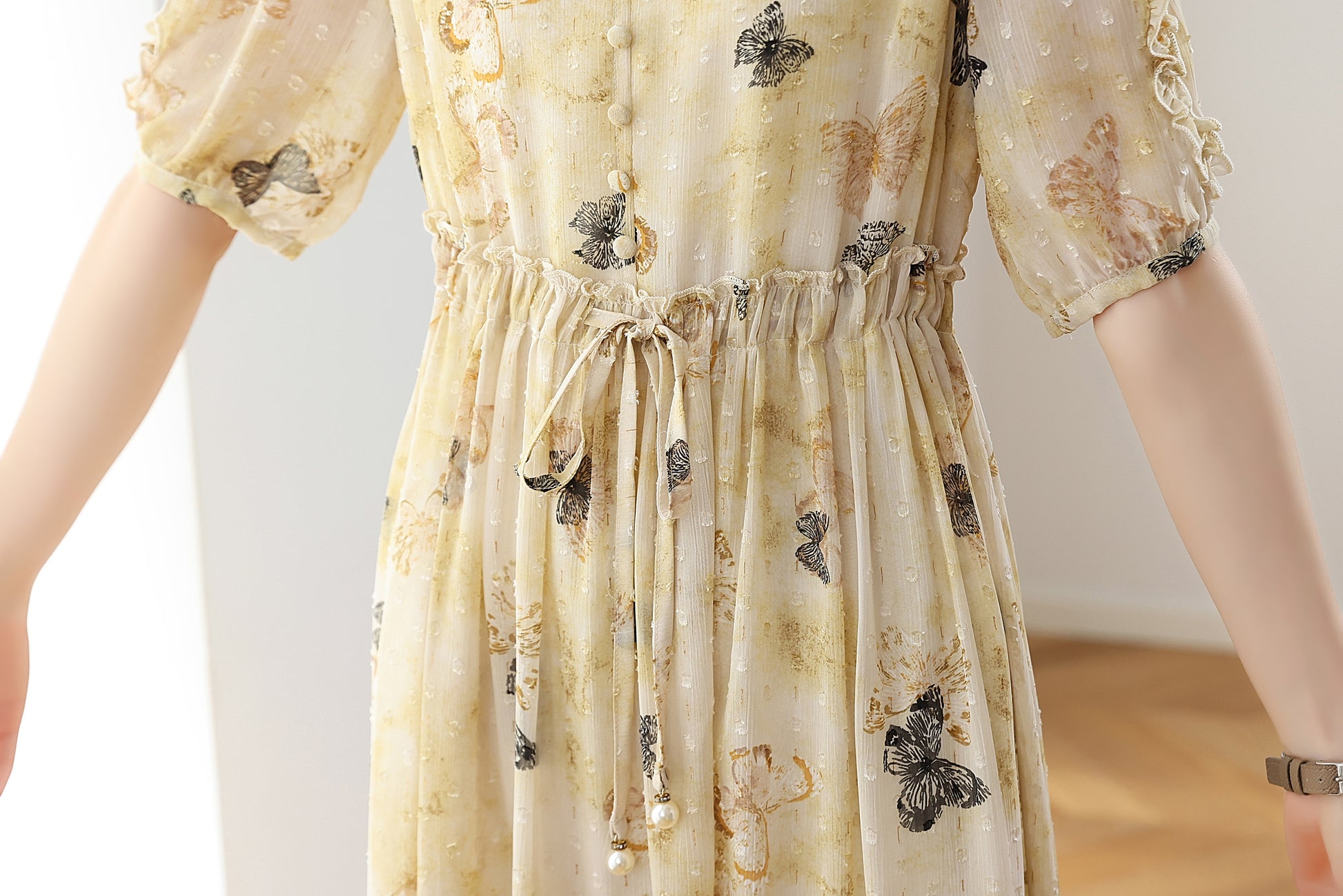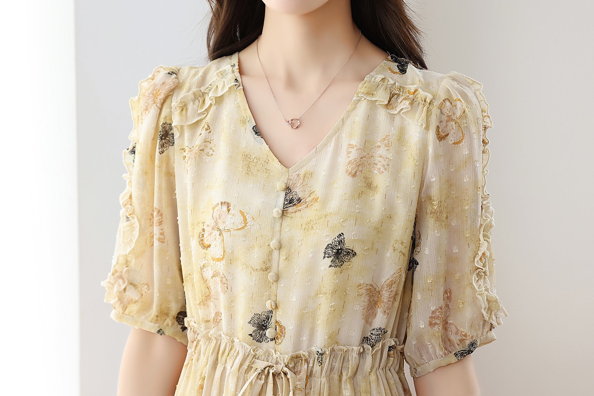 - Features: V-neck design, short sleeve,drawstring waist, floral print, lining, midi length. The dress is made of light and breathable chiffon fabric, which is comfortable, soft and breathable, suitable for spring and summer.