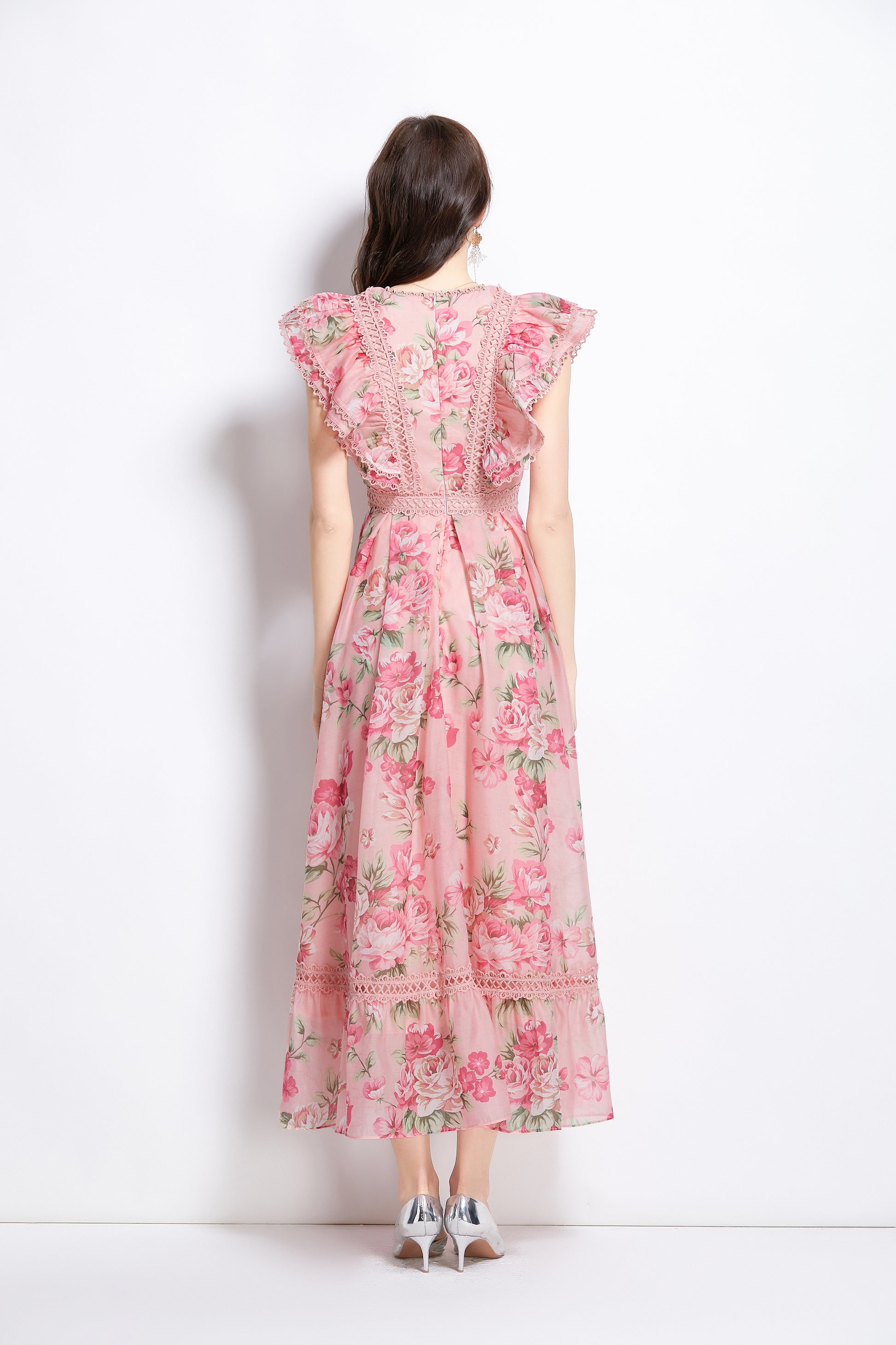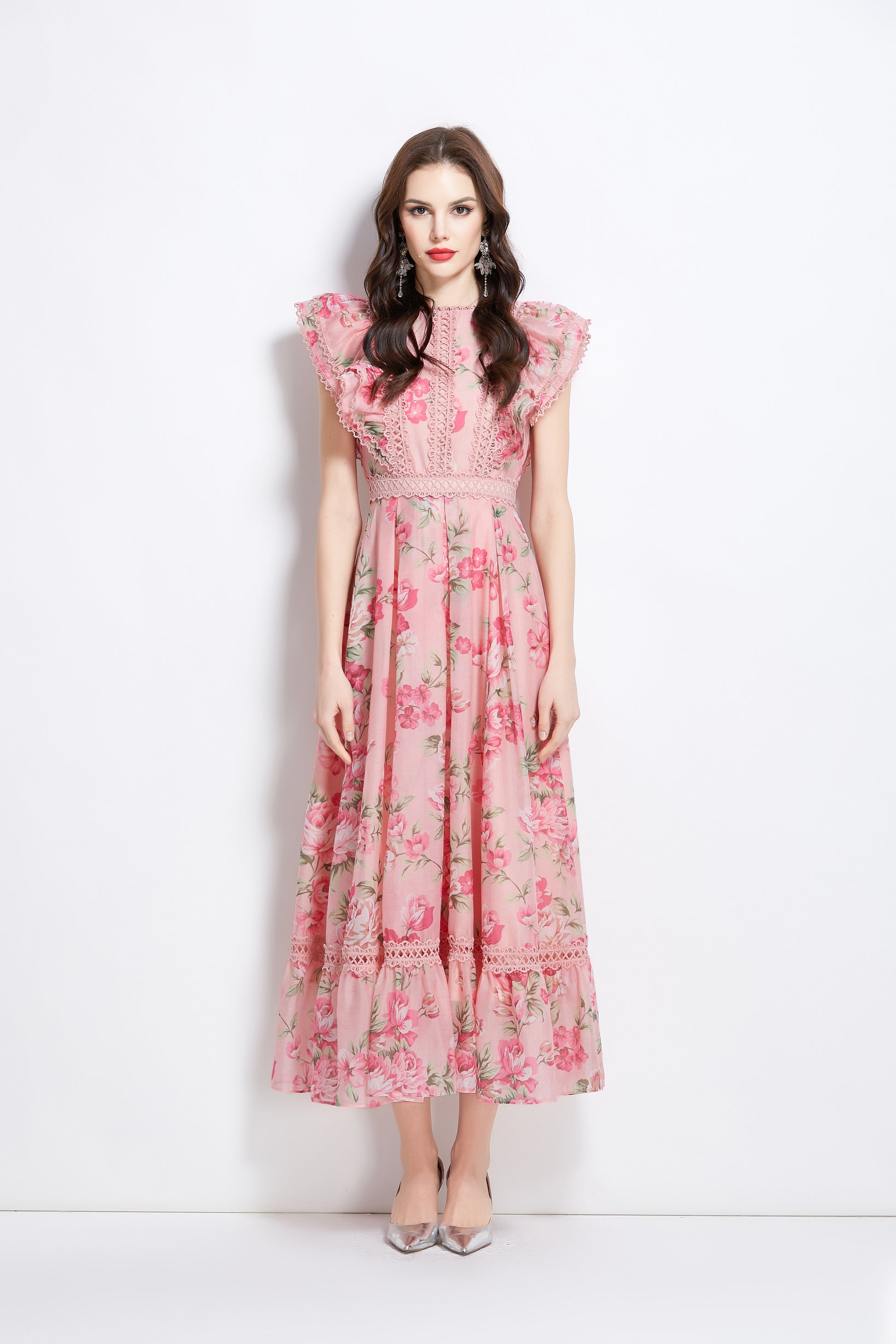 - Description:This floral chiffon dress features lightweight fabric and a sophisticated design. The sleeveless design and ruffled details not only show feminine softness, but also provide excellent comfort and fashion sense. The combination of lace stitching and print makes this dress the perfect choice for spring and summer.