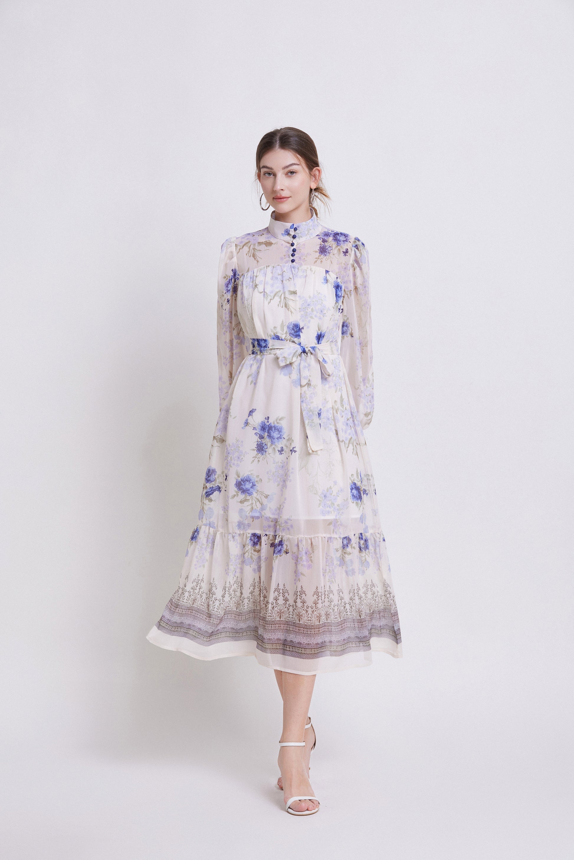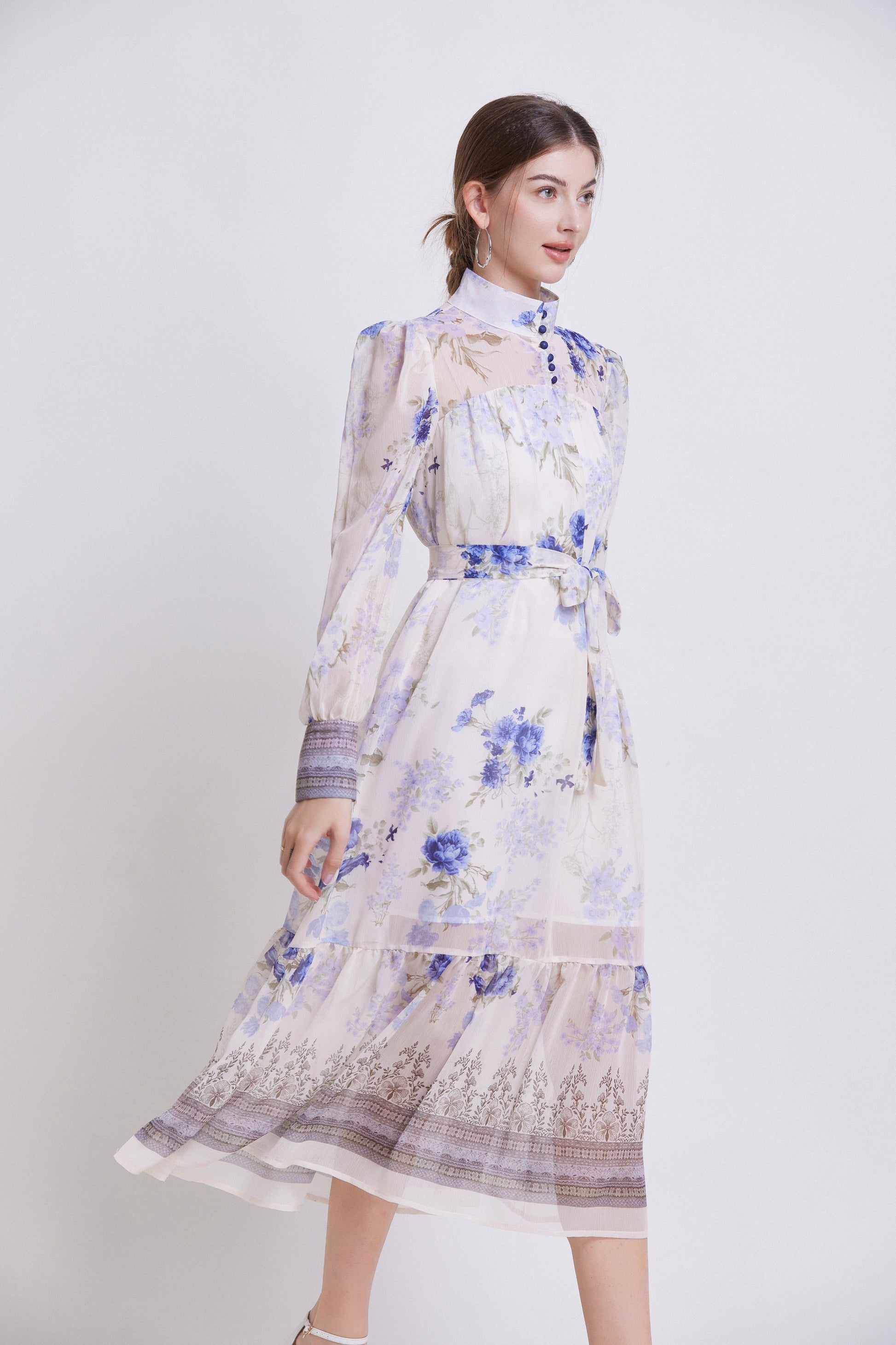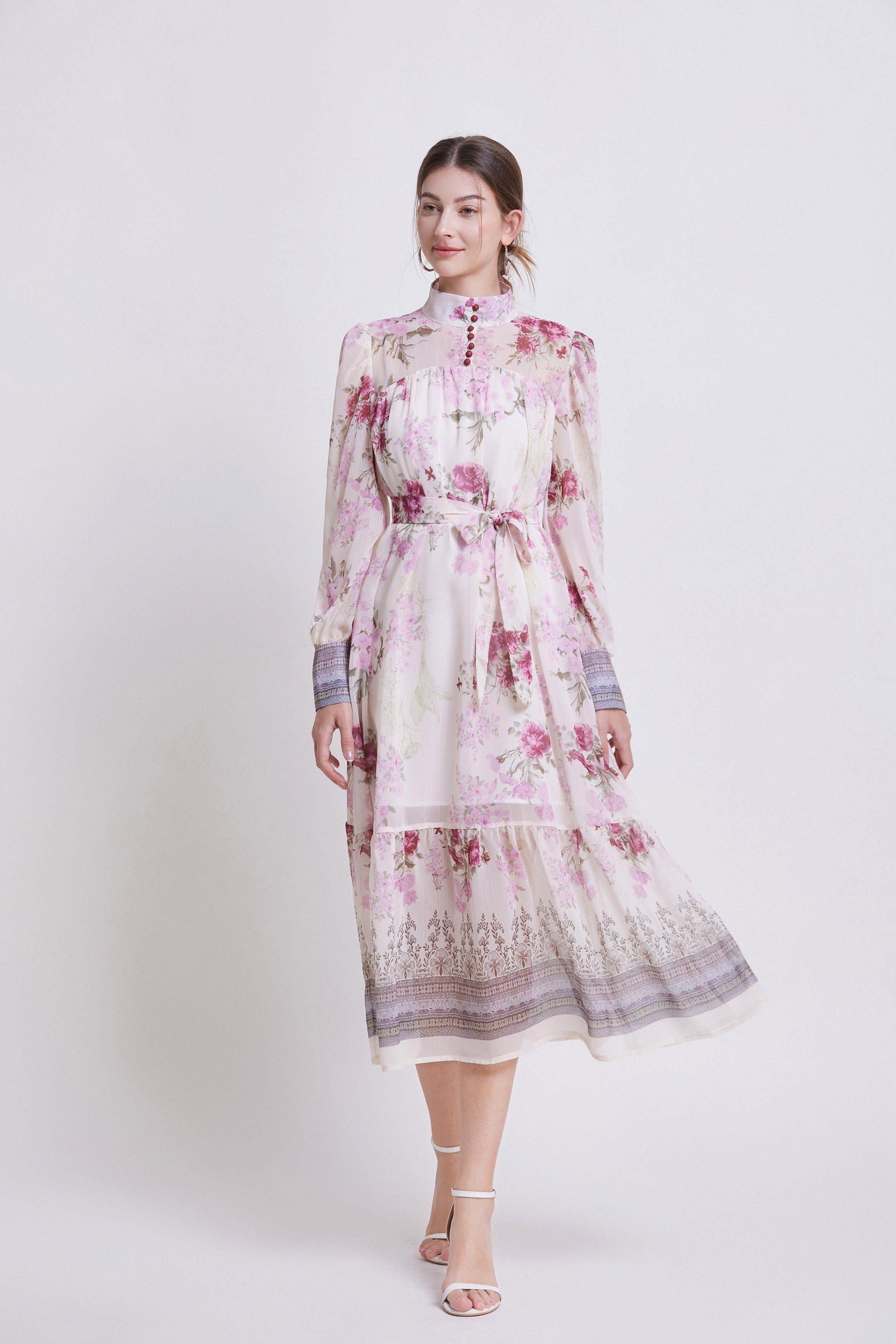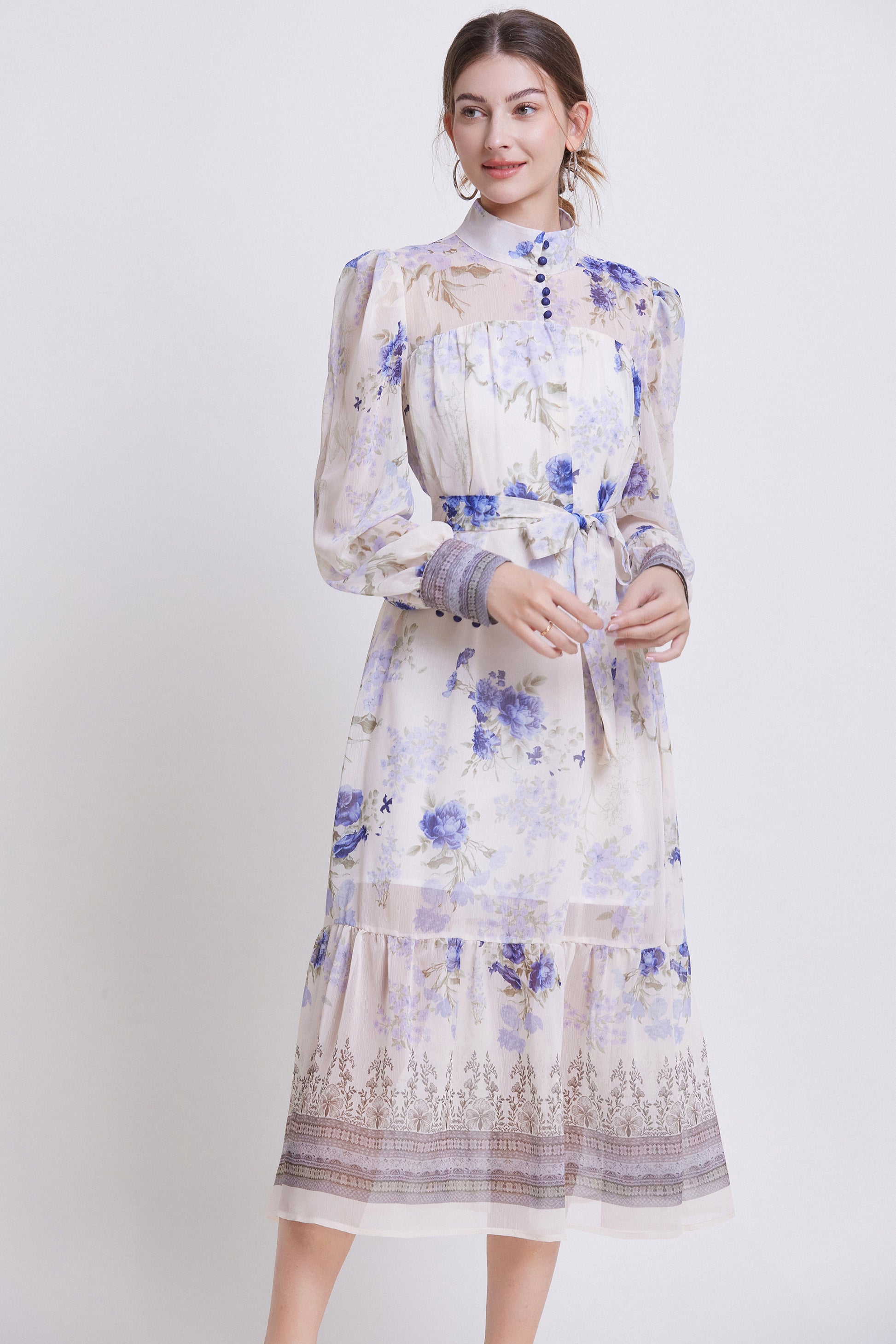 - Features: Chiffon fabric, printed pattern, Lantern sleeve design, high collar, chest button closed, long sleeve style, Chiffon fabric, patchwork hem, waist strap, mid-length dress