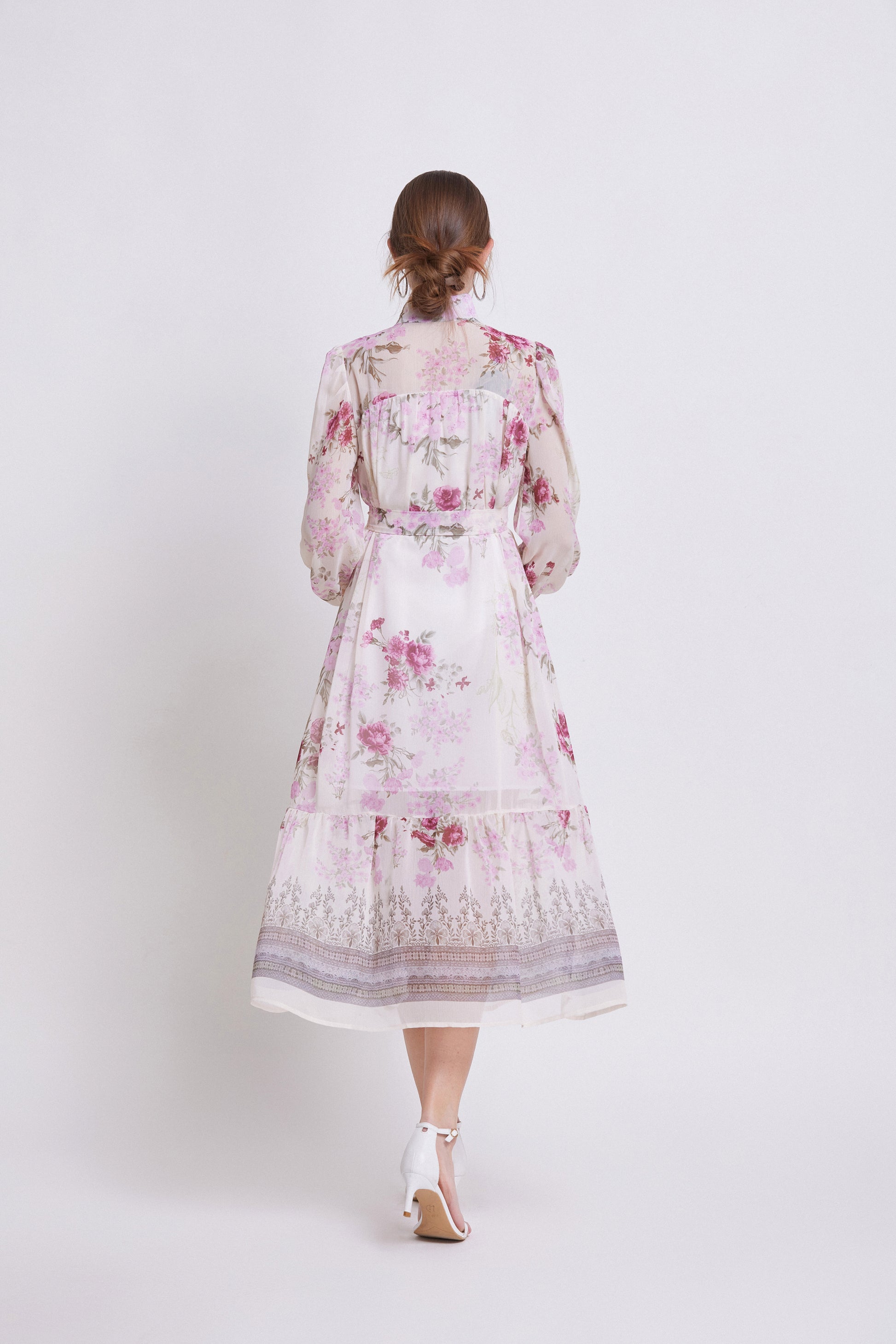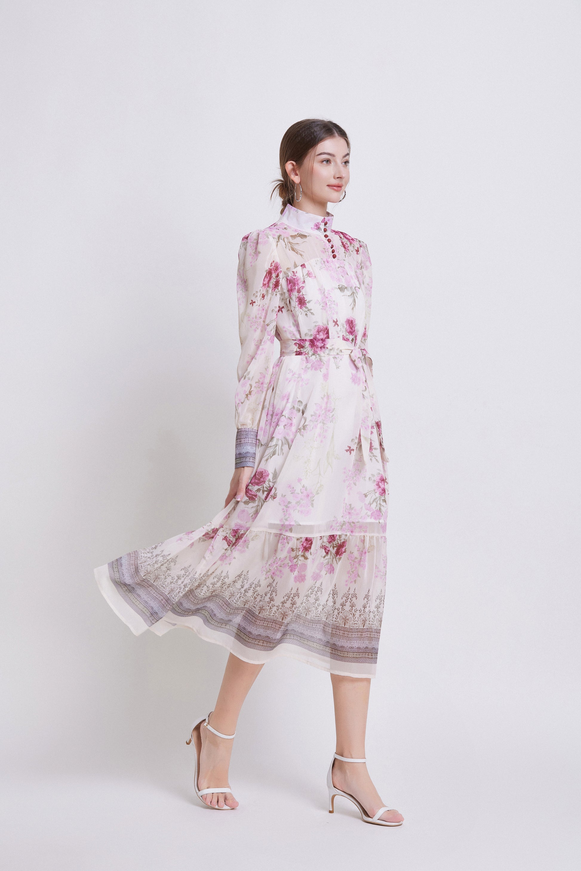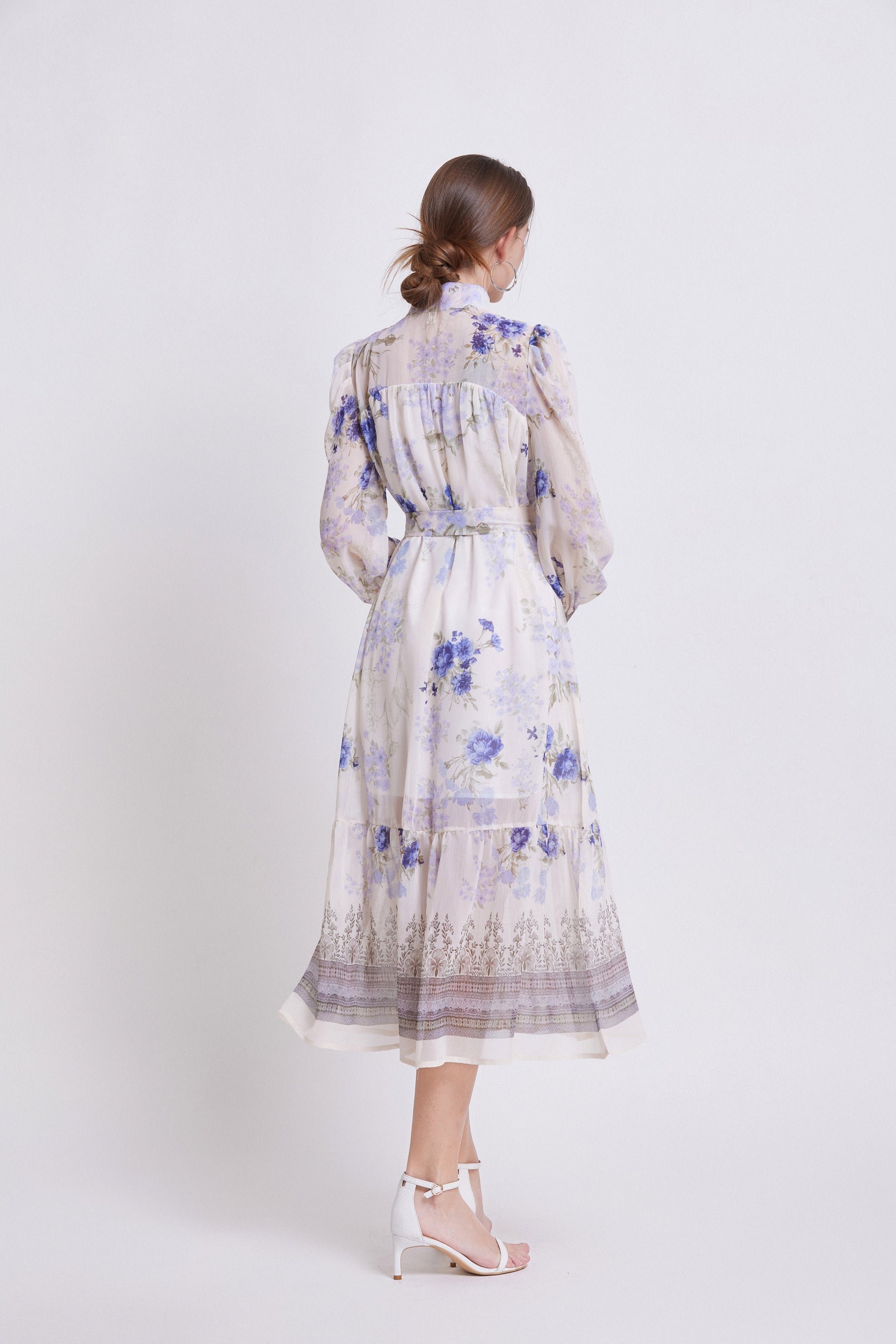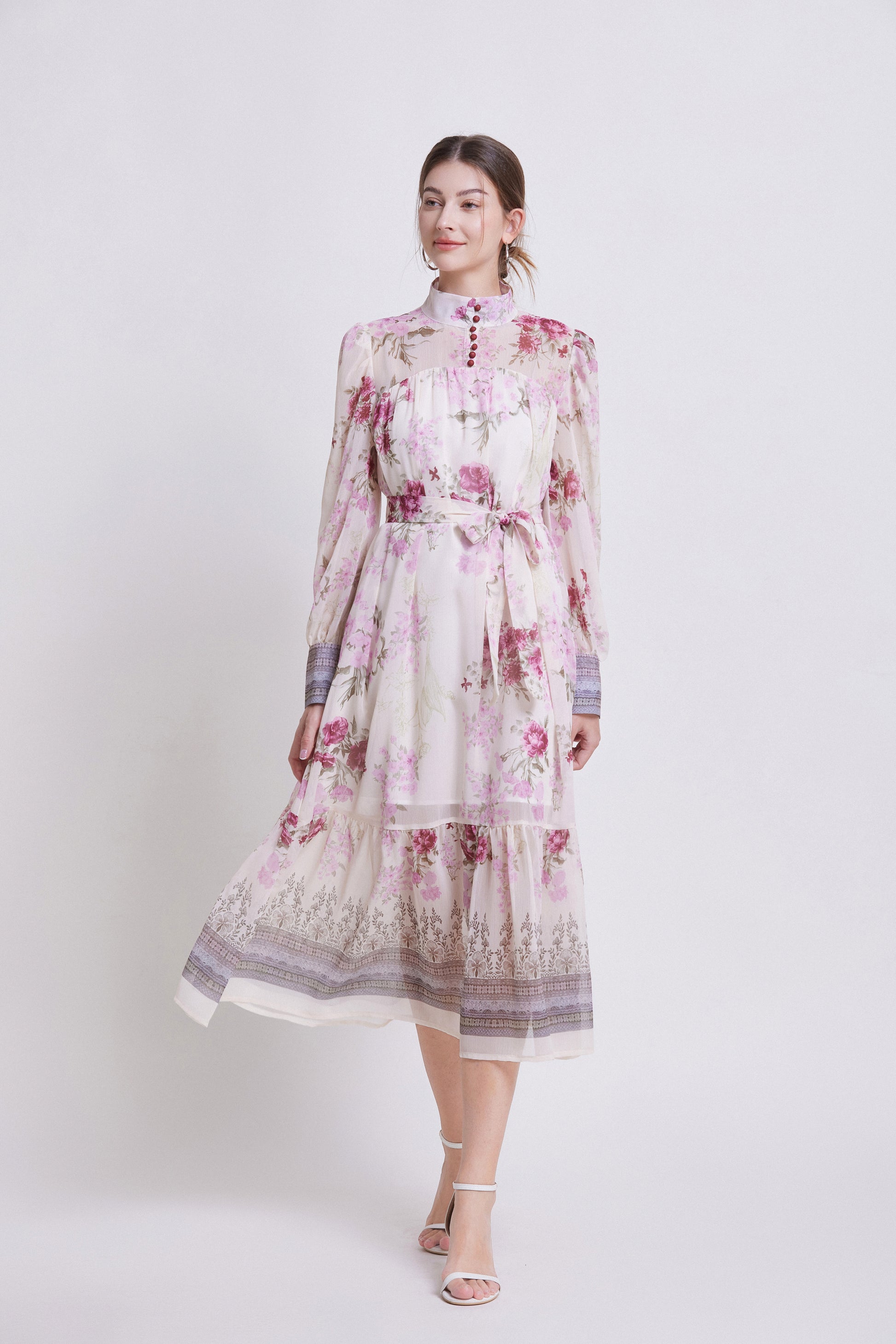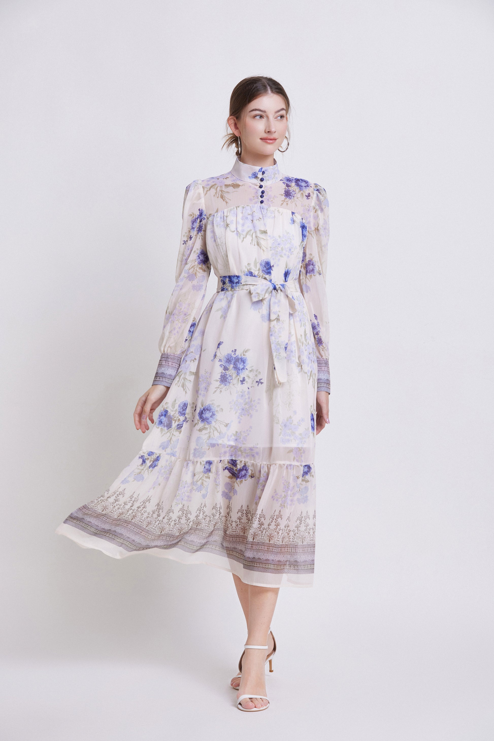 - Features: Chiffon fabric, printed pattern, Lantern sleeve design, high collar, chest button closed, long sleeve style, Chiffon fabric, patchwork hem, waist strap, mid-length dress
