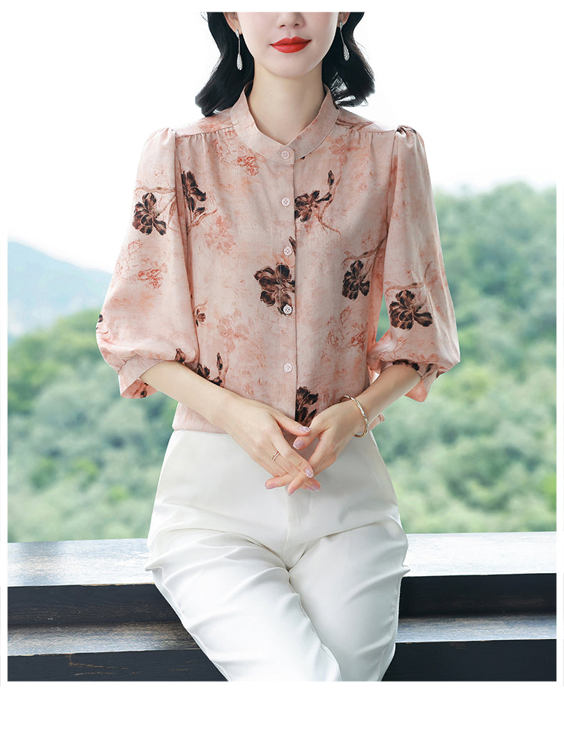 - Feature: Vintage Silk satin fabric, hight Neck, Jacquard fabric decoration , Casual Blouse, Flower Print, Regular Fit,short Sleeves,Disc buckle,slanted opening. It is a chic fashion summer Chinese style shirt top.