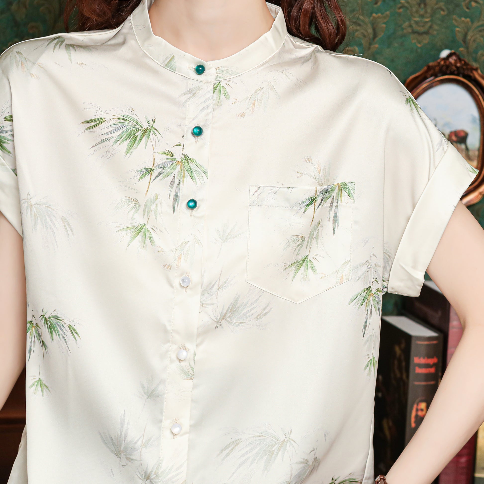- Feature: Vintage Silk satin fabric, Elegant Embroidery design, hight Neck, Jacquard fabric decoration , Casual Blouse, Flower Print, Regular Fit,short Sleeves,button down. It is a chic fashion summer Chinese style shirt top.