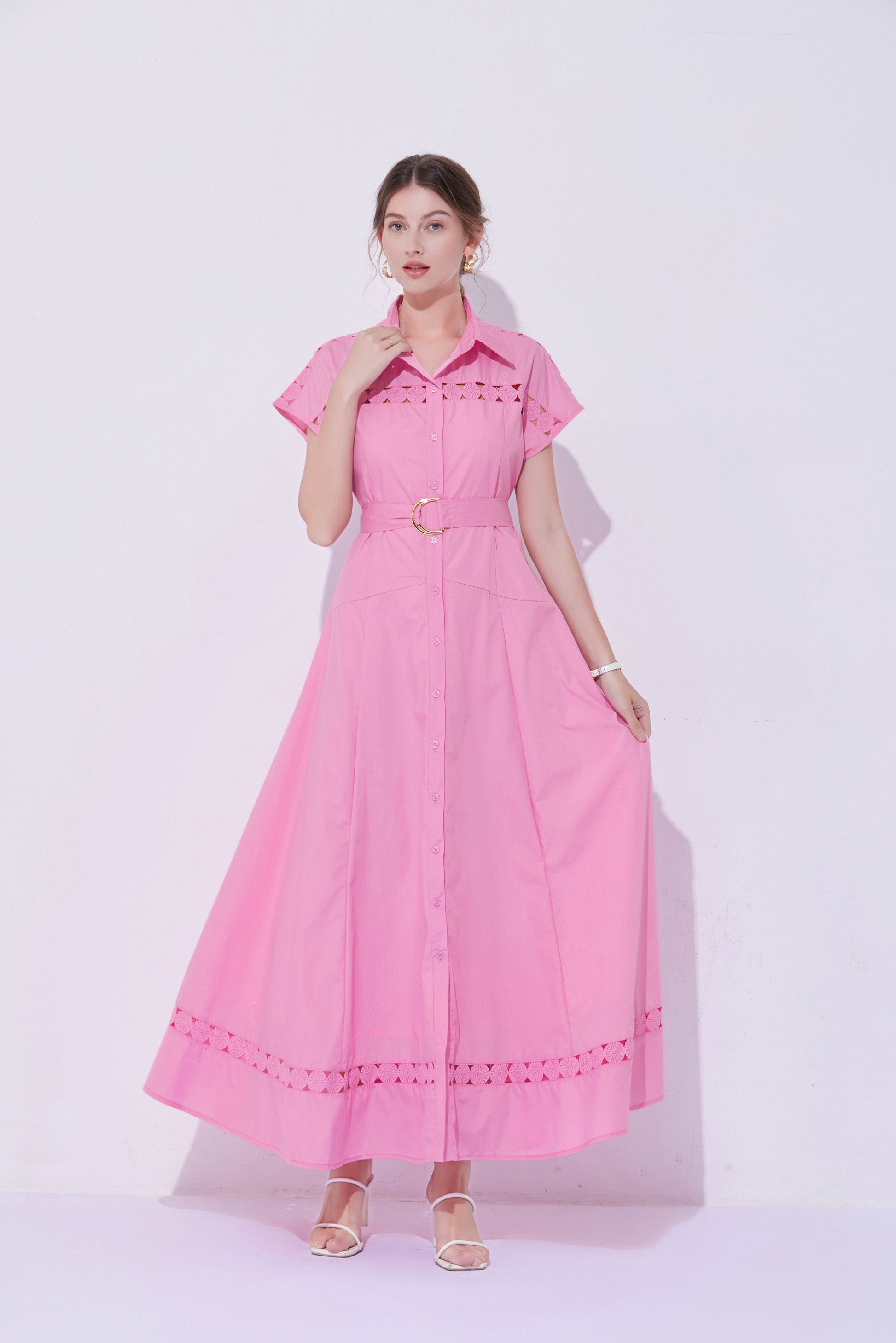 - Features: Shirt collar, summer, cap sleeve, front button, belt, hollowed-out. The fabric looks light, thin and breathable, and is very suitable for summer wearing