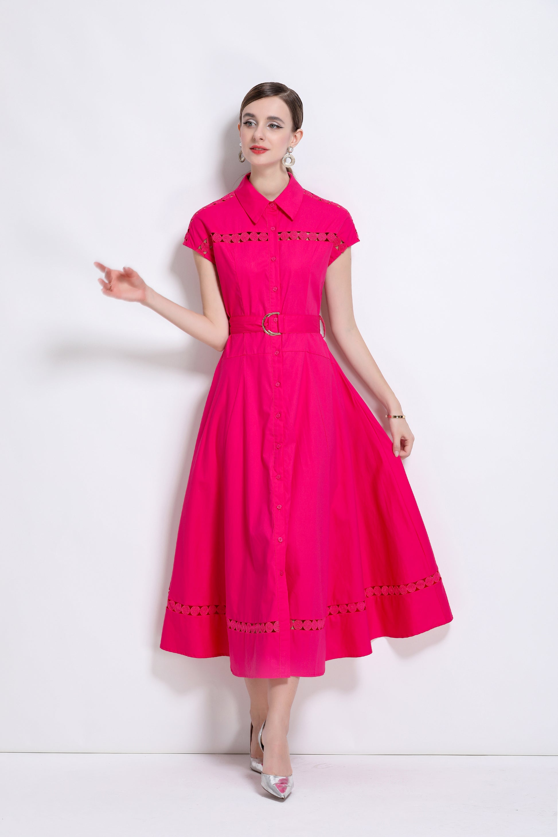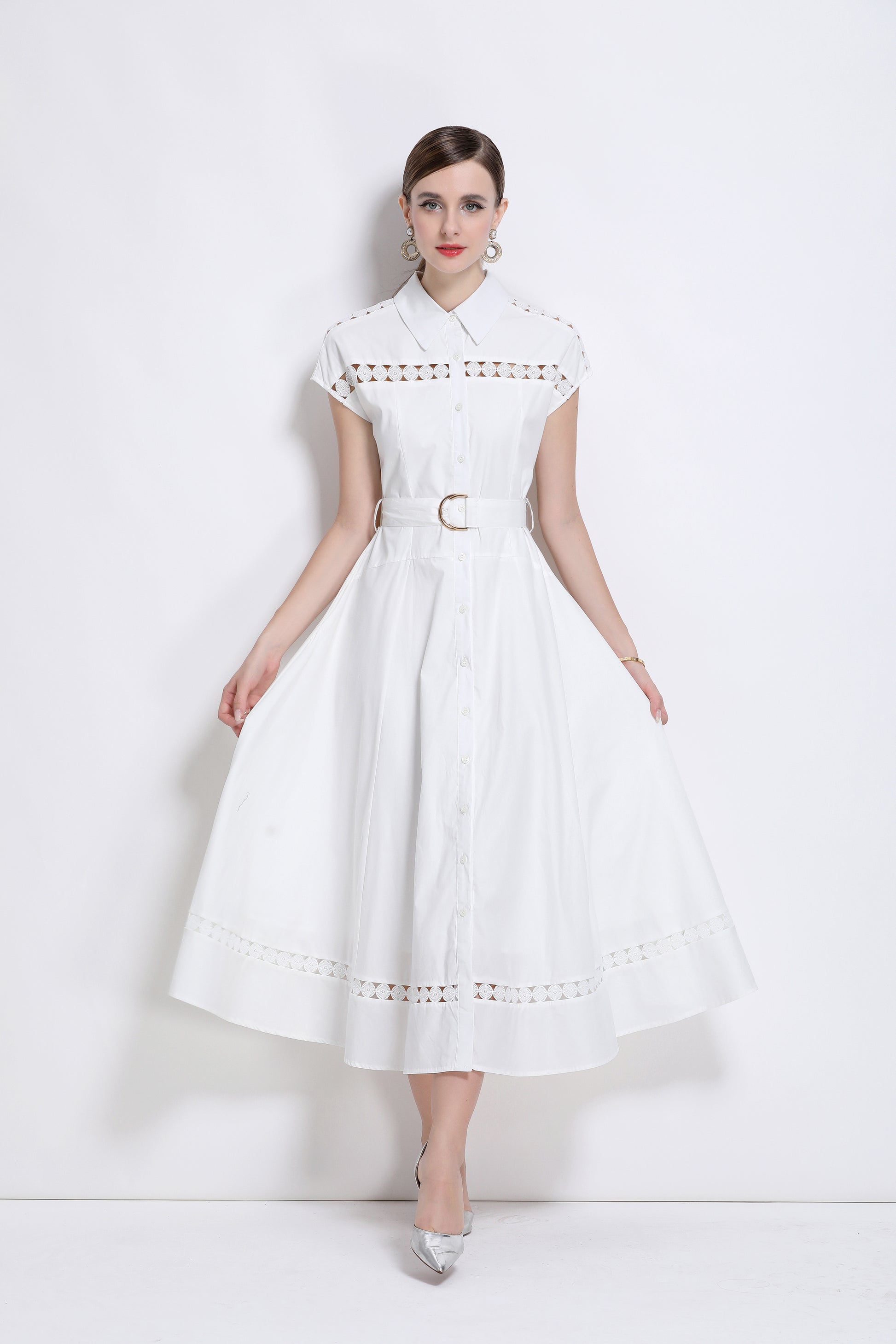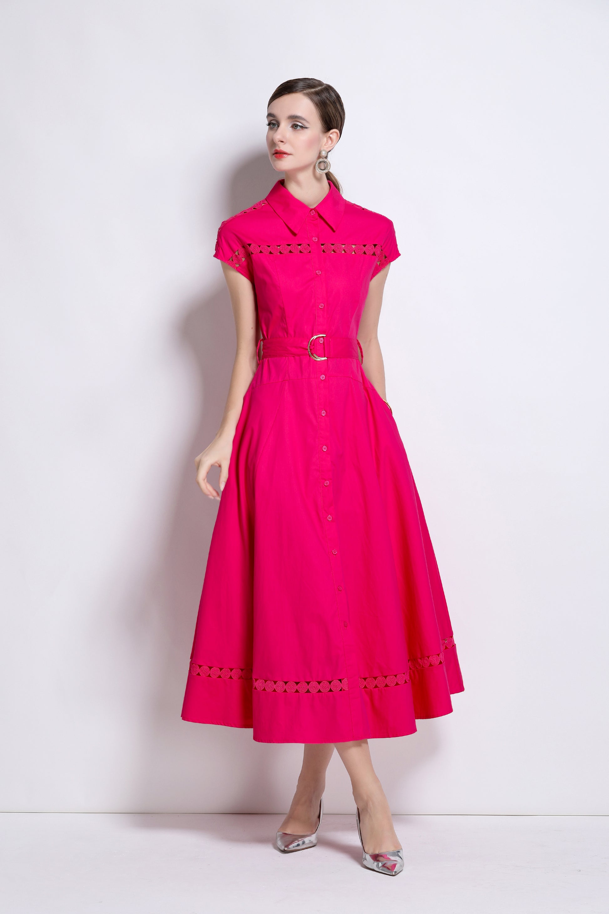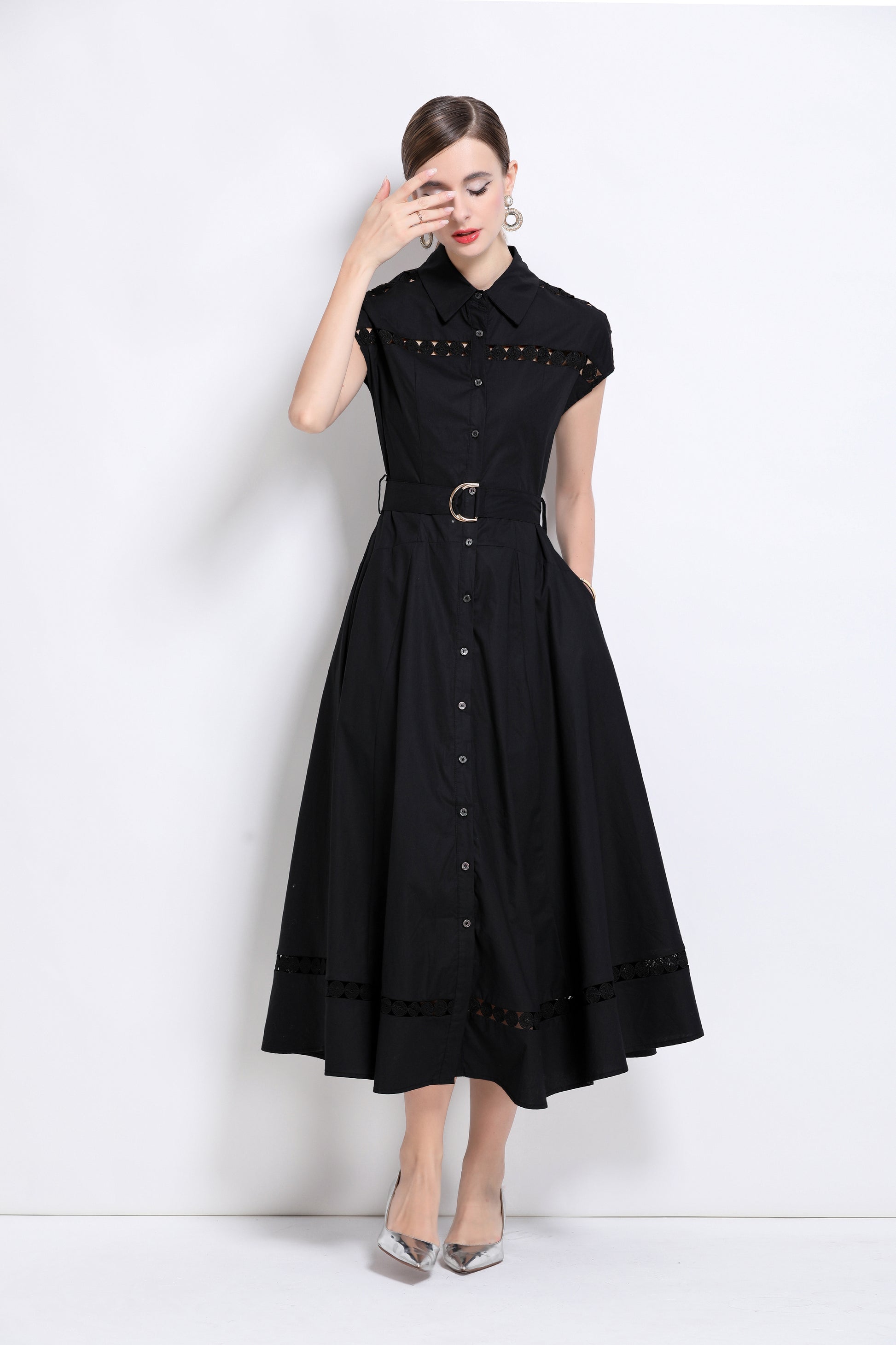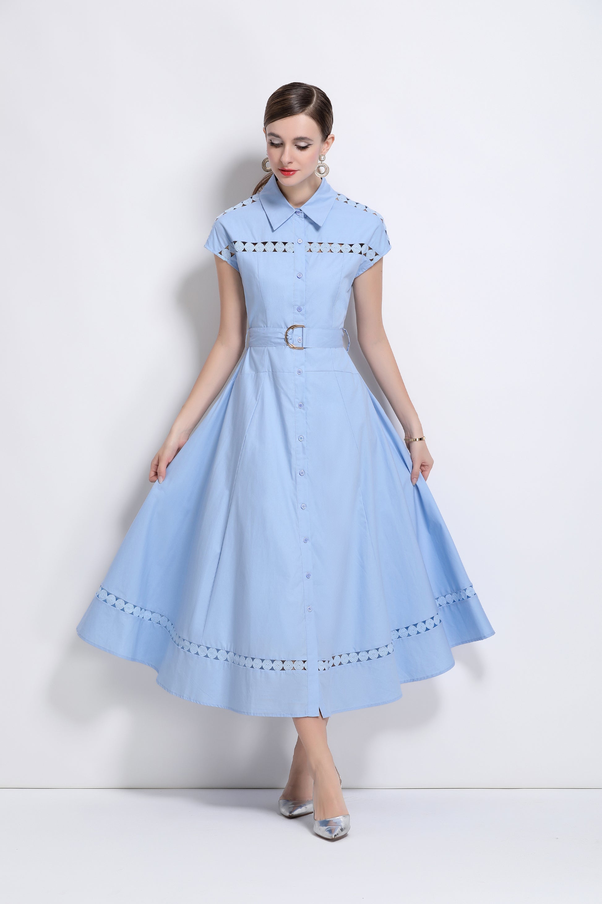 - Features: Shirt collar, summer, cap sleeve, front button, belt, hollowed-out. The fabric looks light, thin and breathable, and is very suitable for summer wearing