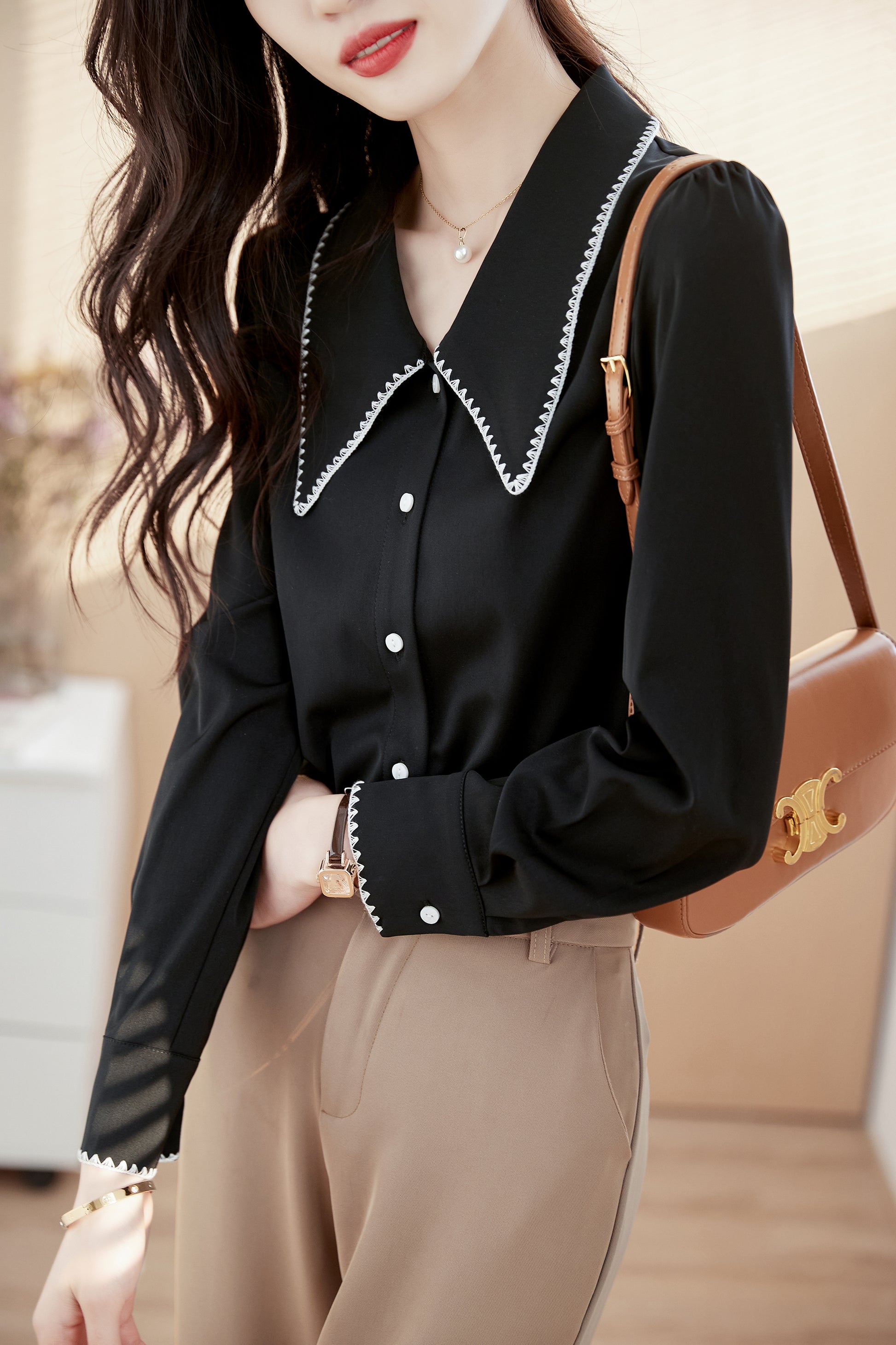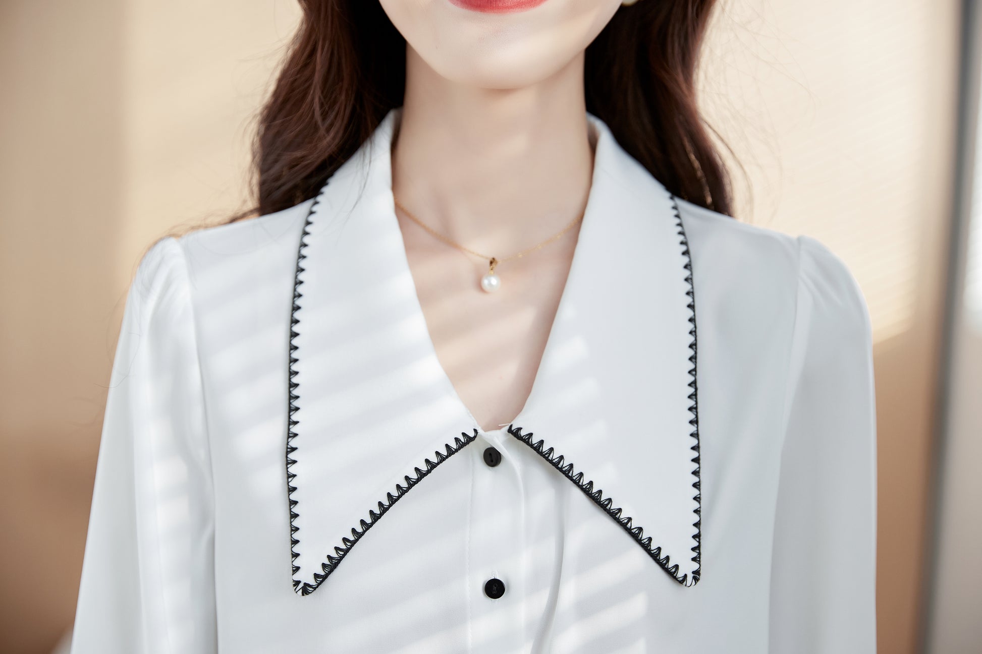 Women's Contrast Collar V Neck Lantern Sleeve Blouse