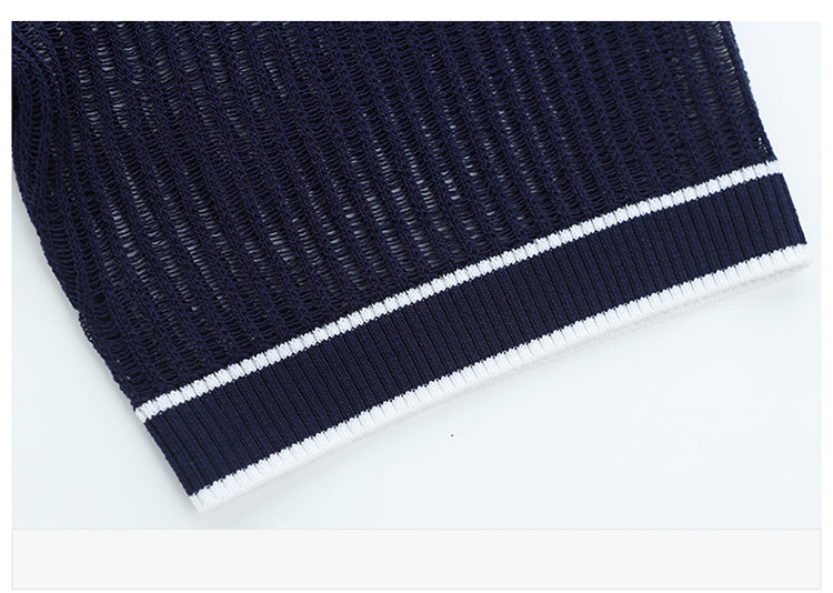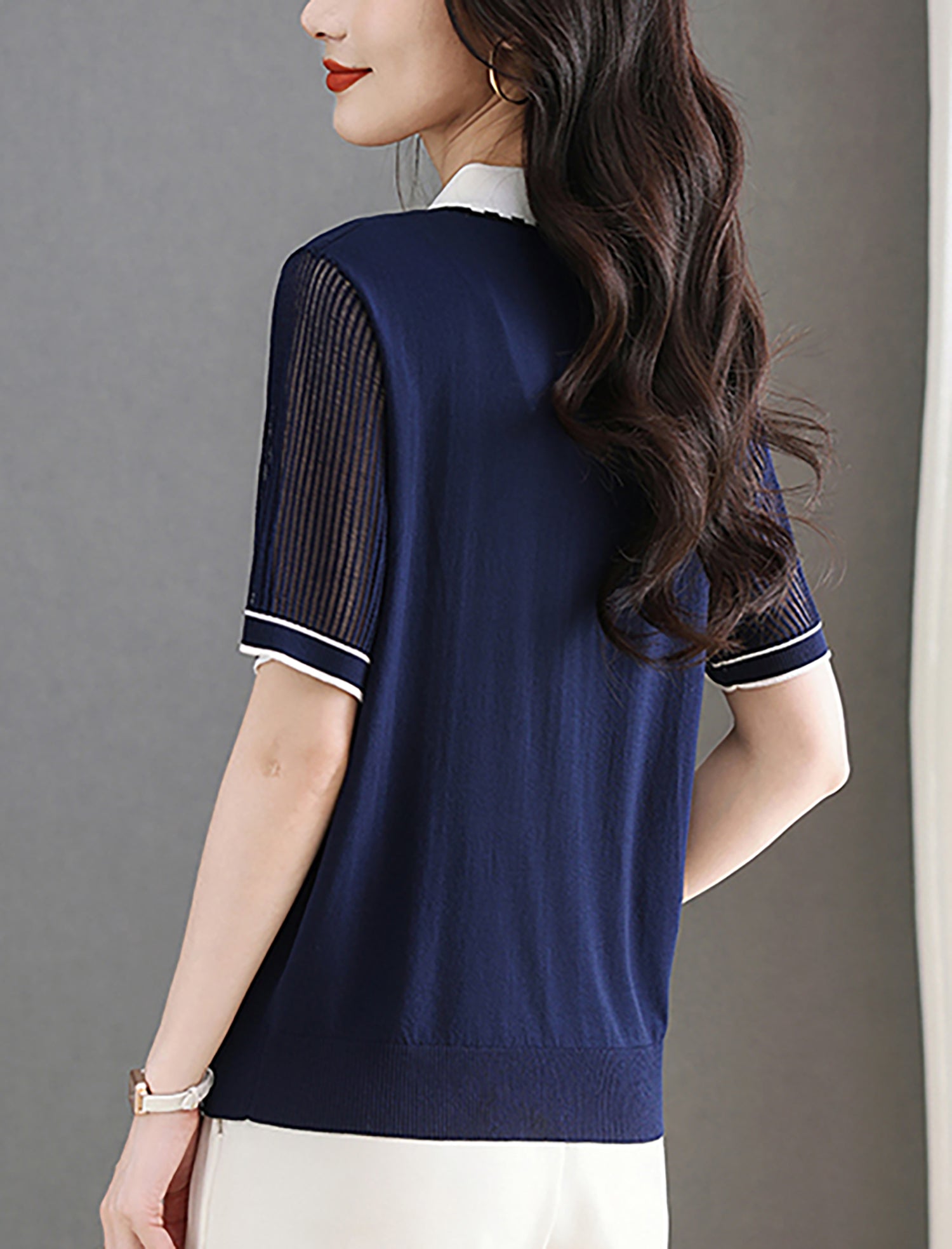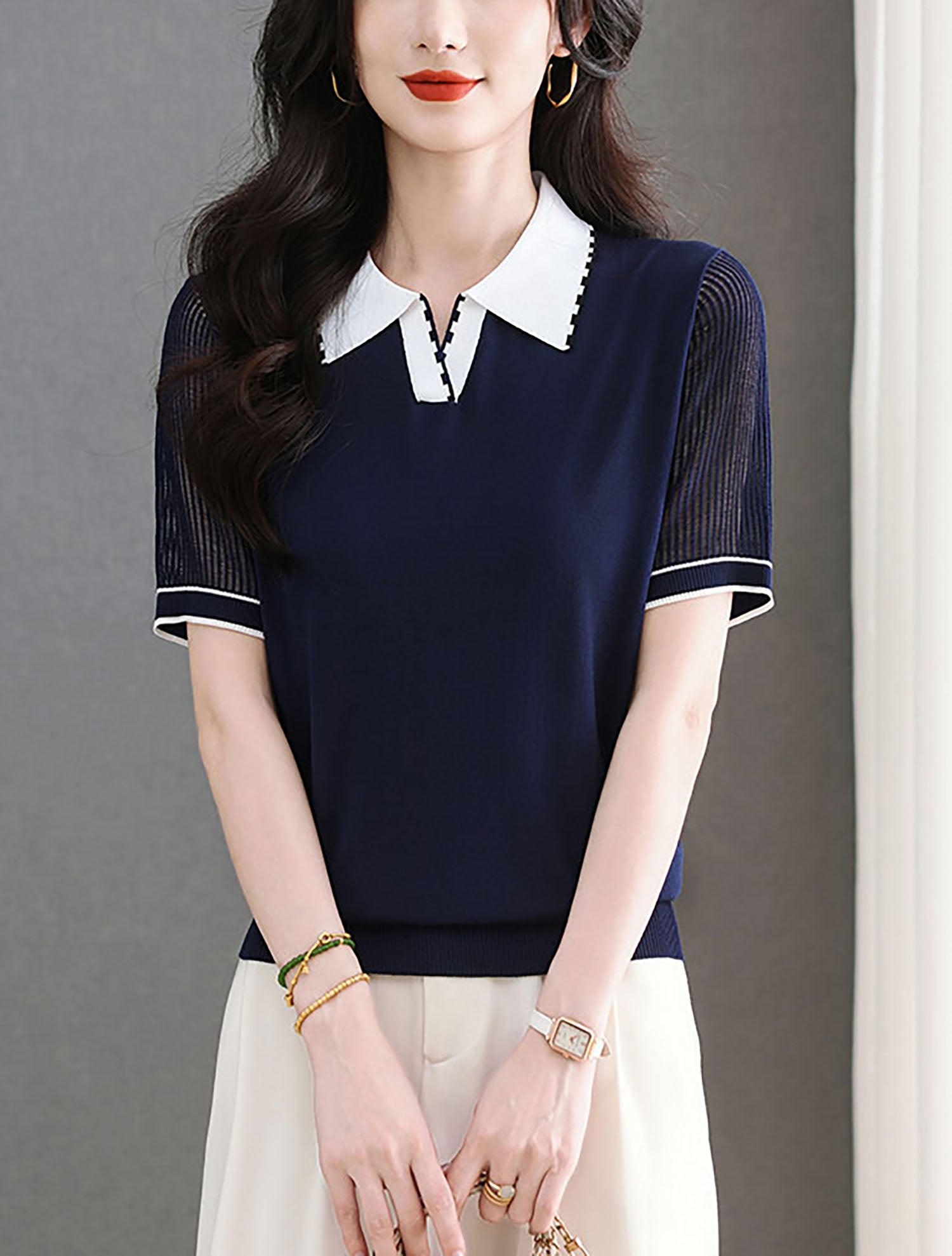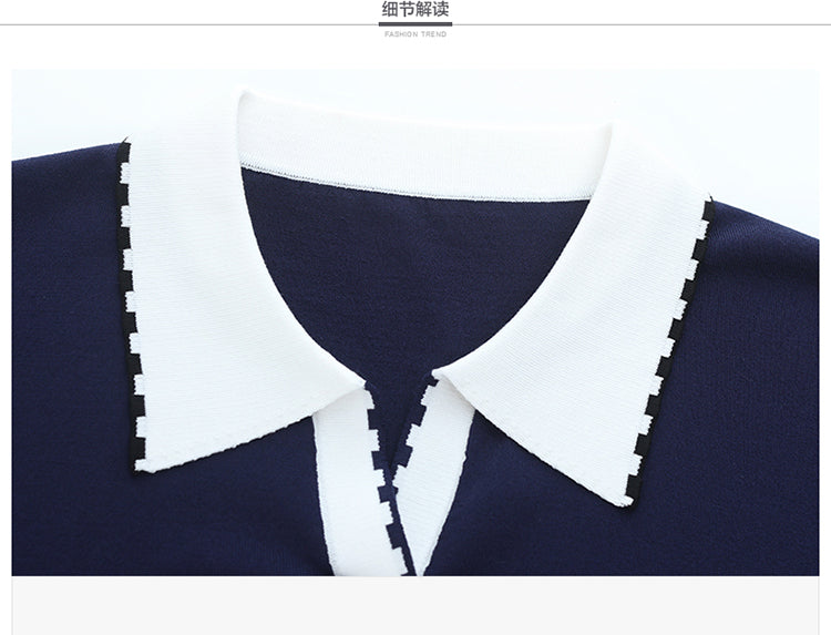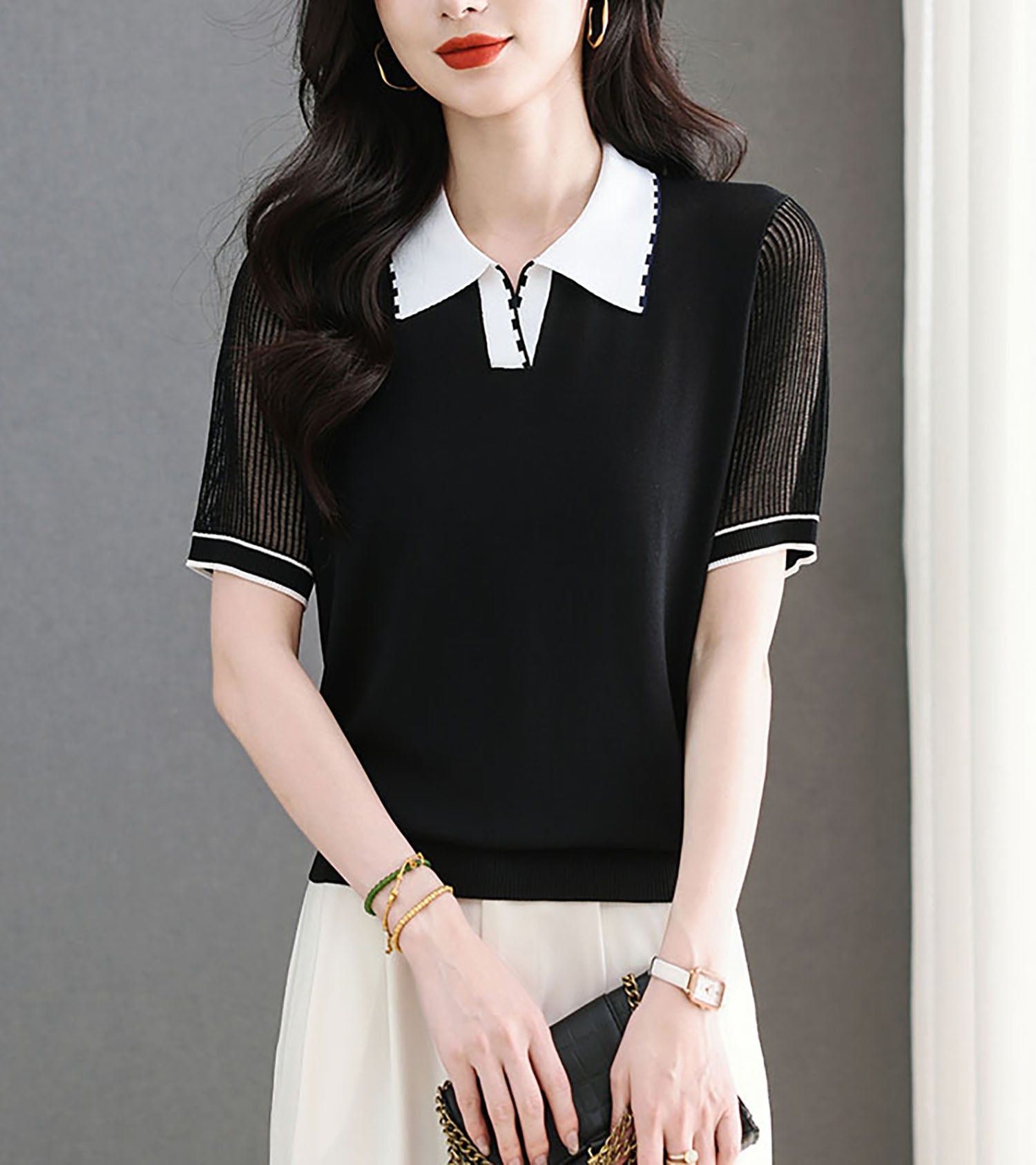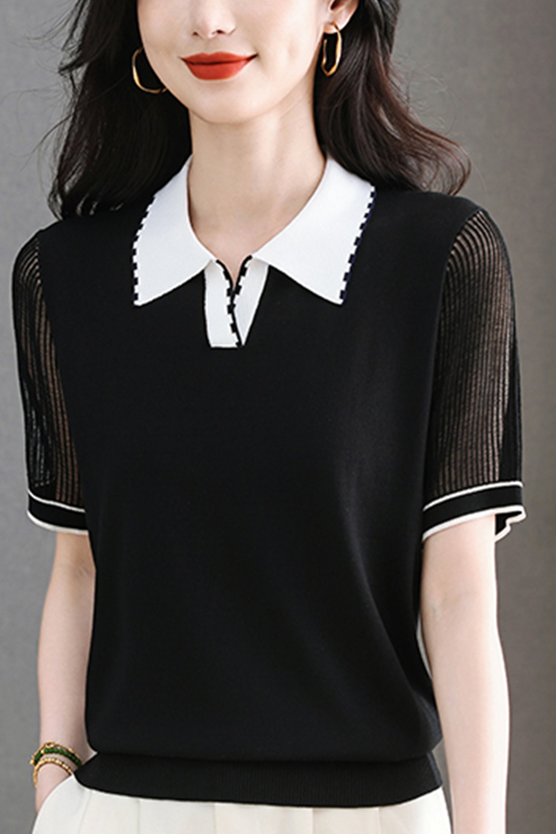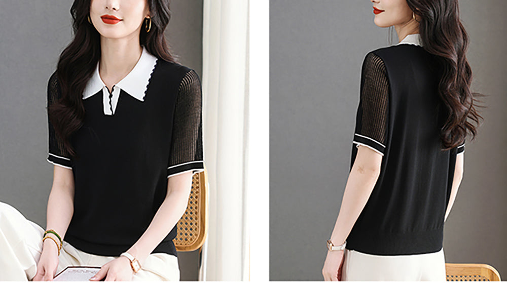 - Design: Contrasting color polo collar, patchwork sleeves, short sleeves, thin knitted top, summer polo shirt.