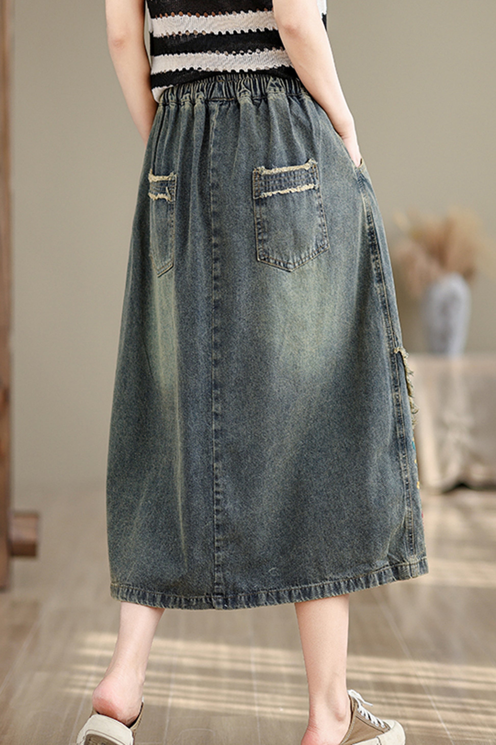 - Features: Embroidery, pockets, denim skirt, elastic waistband, a line skirt, elastic waistband with drawstring,high waisted,functional front and back pockets,It has no lined, midi length balance modesty and trendiness.