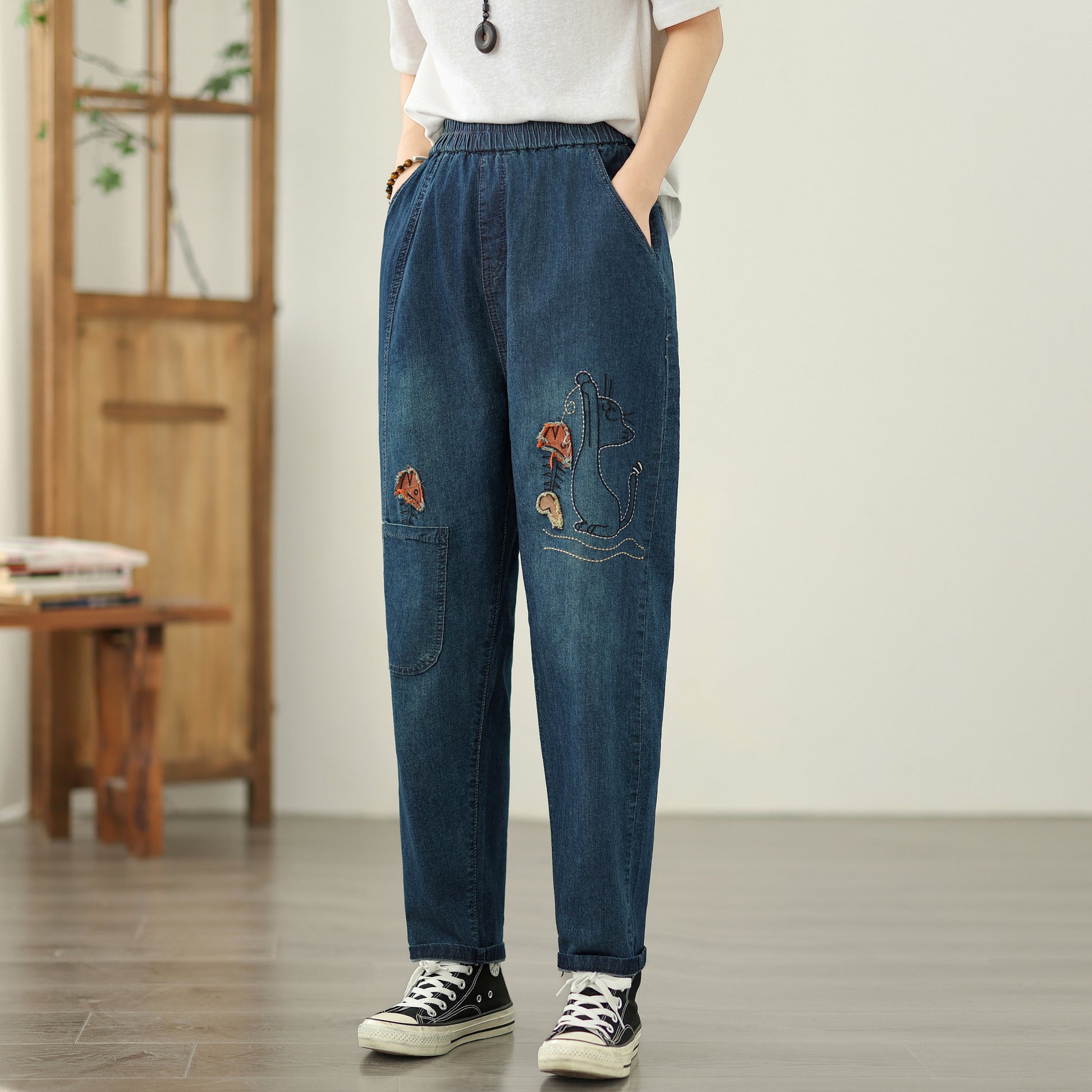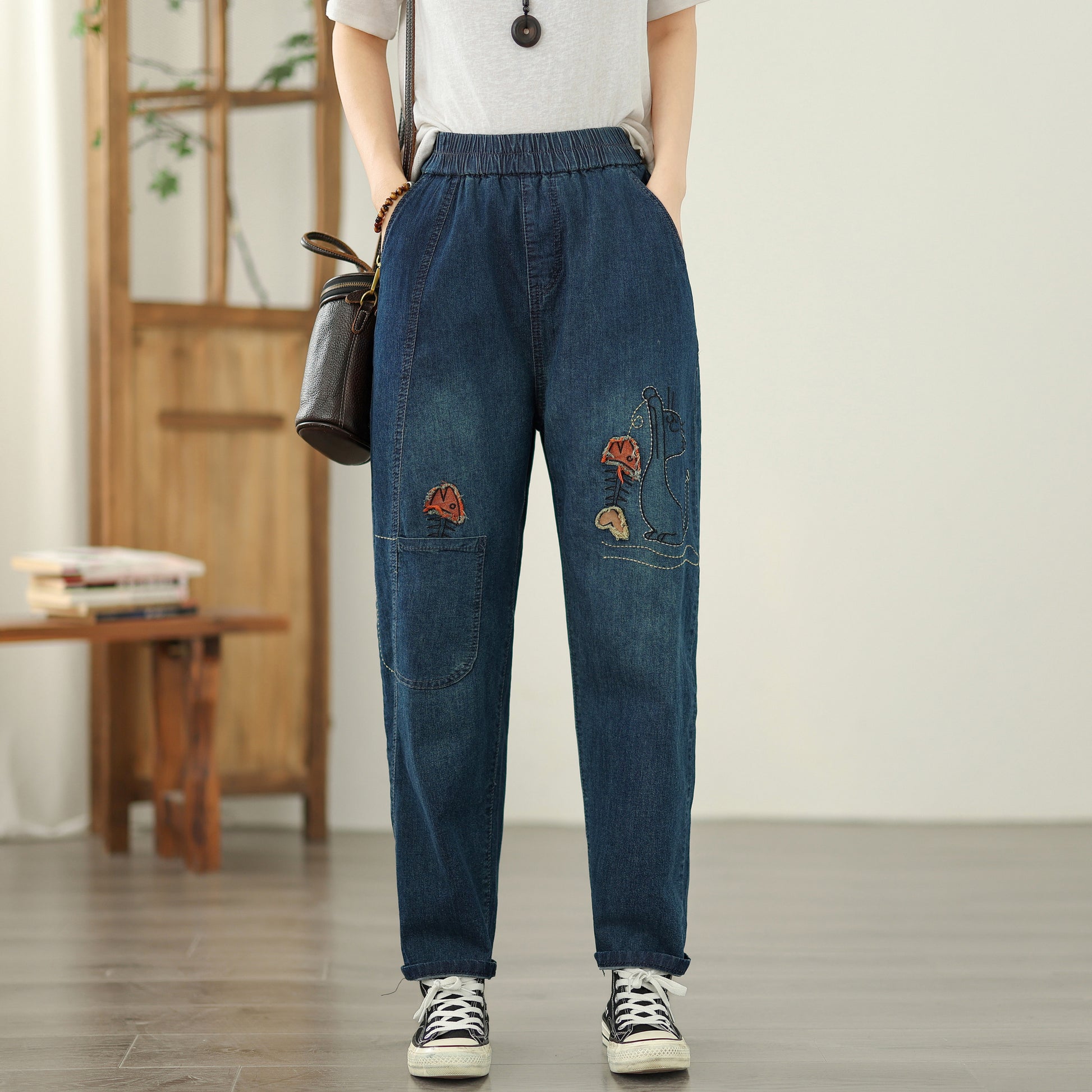 Women's Elastic Waist Embroidery Denim Jeans Pants