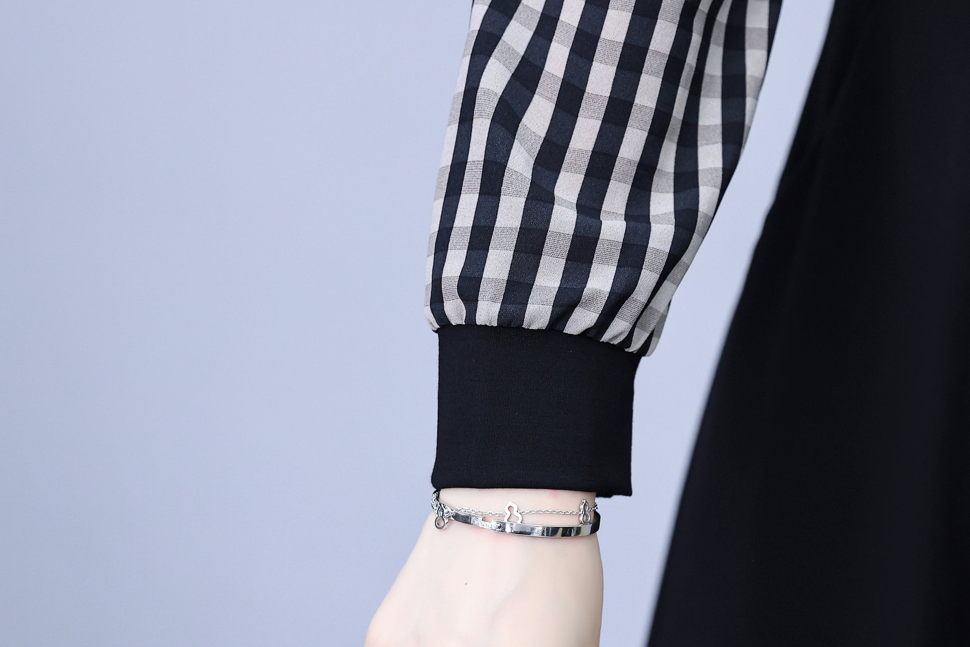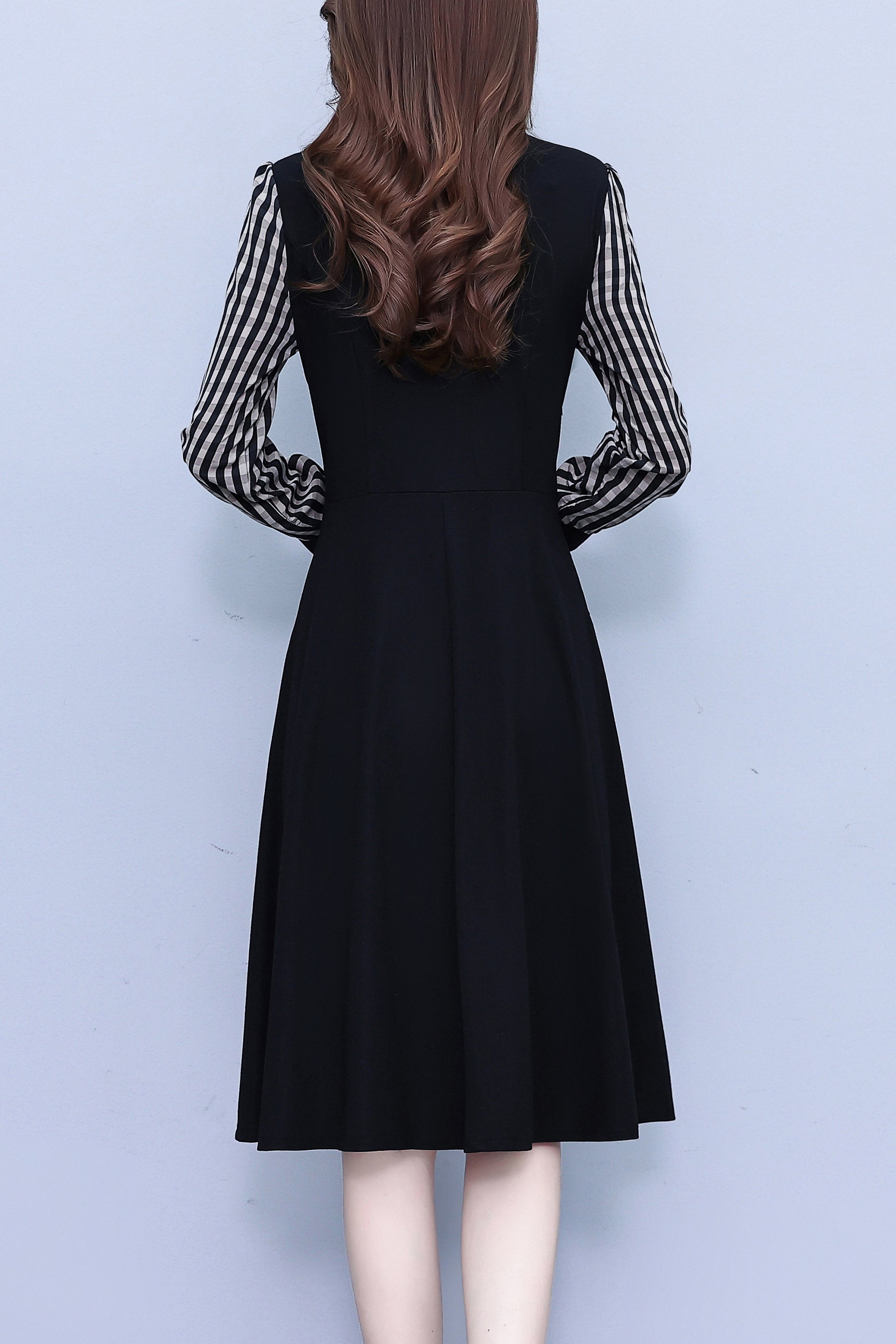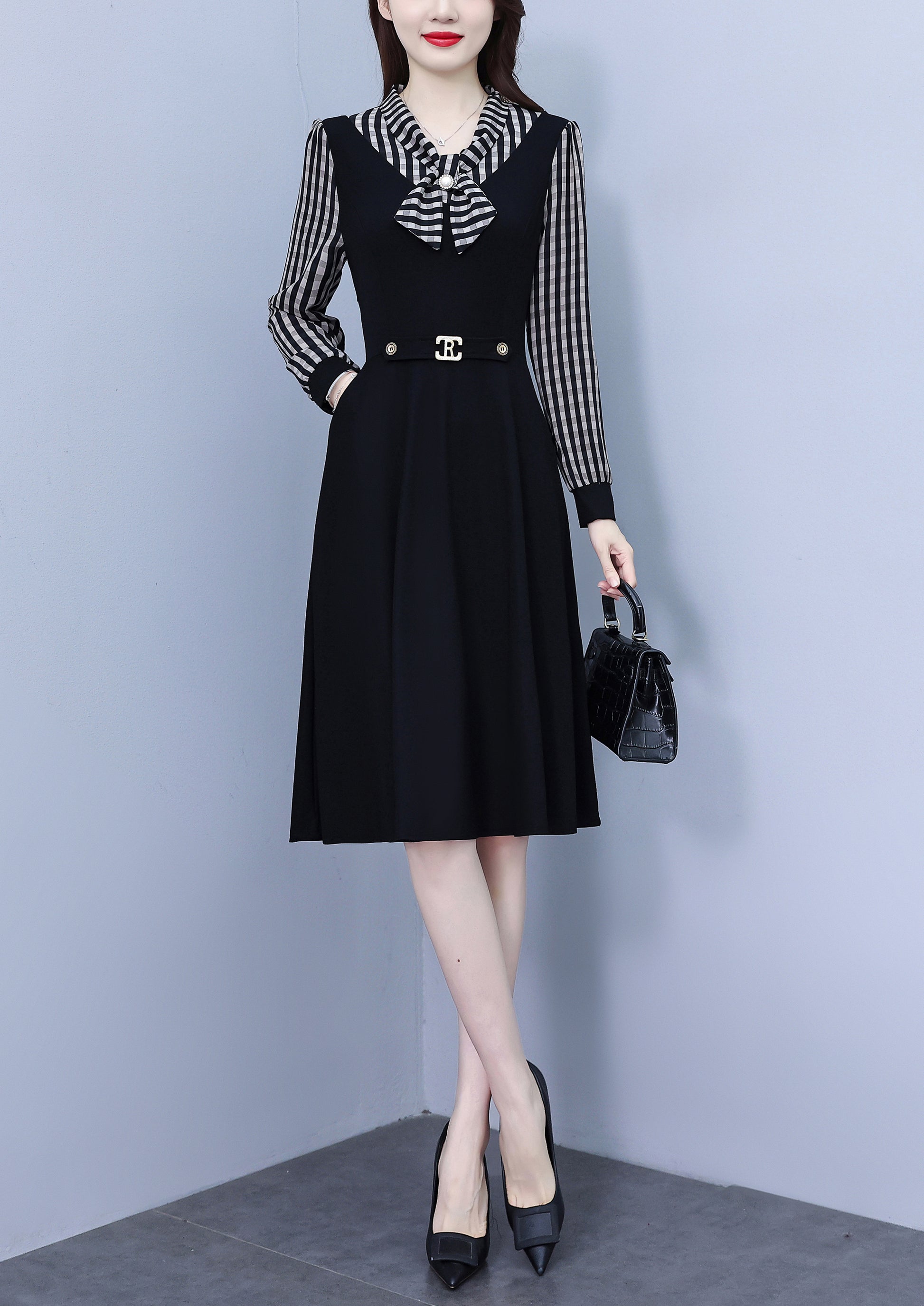 - Features:Black dress,Patchwork design,V-neck,long sleeve,A-line,Two Pocket,Side Zip,Elegant,Stretch fabric,Midi Length.