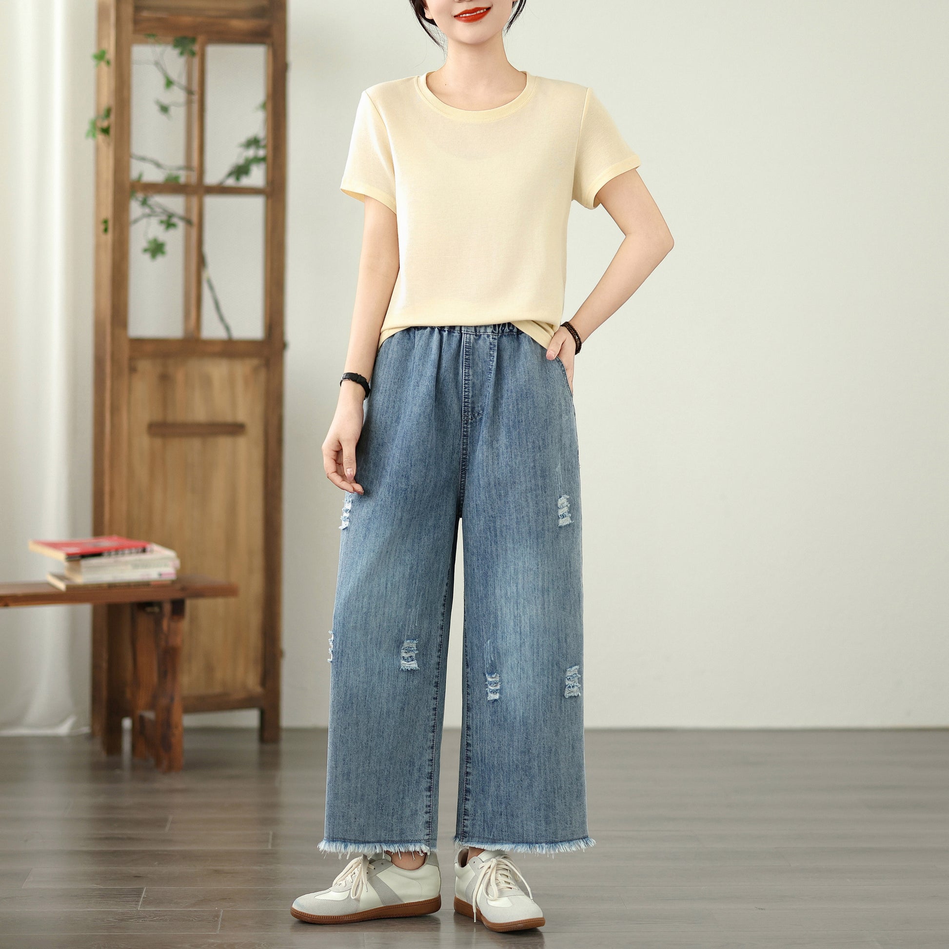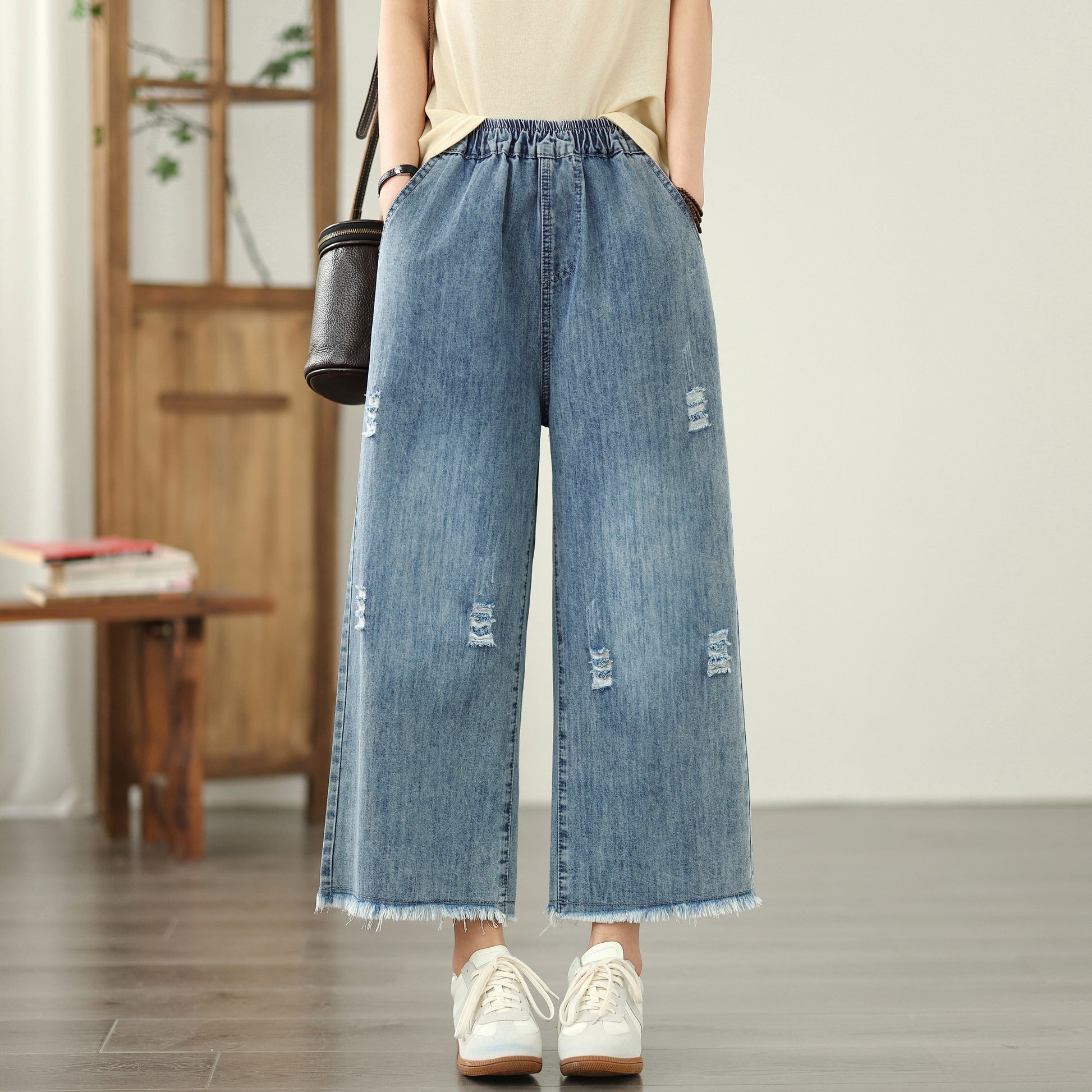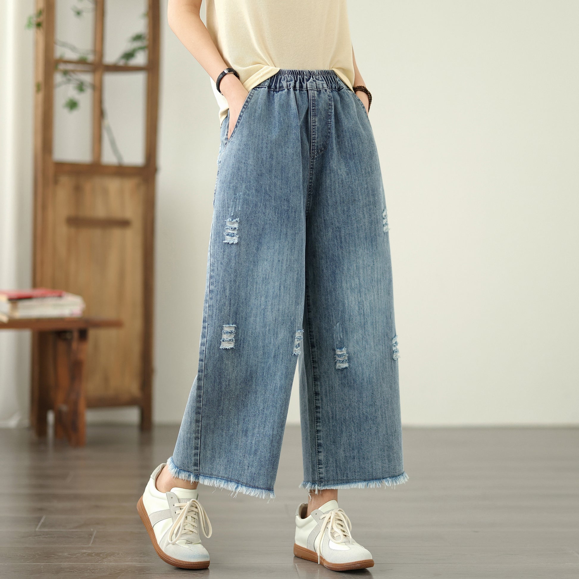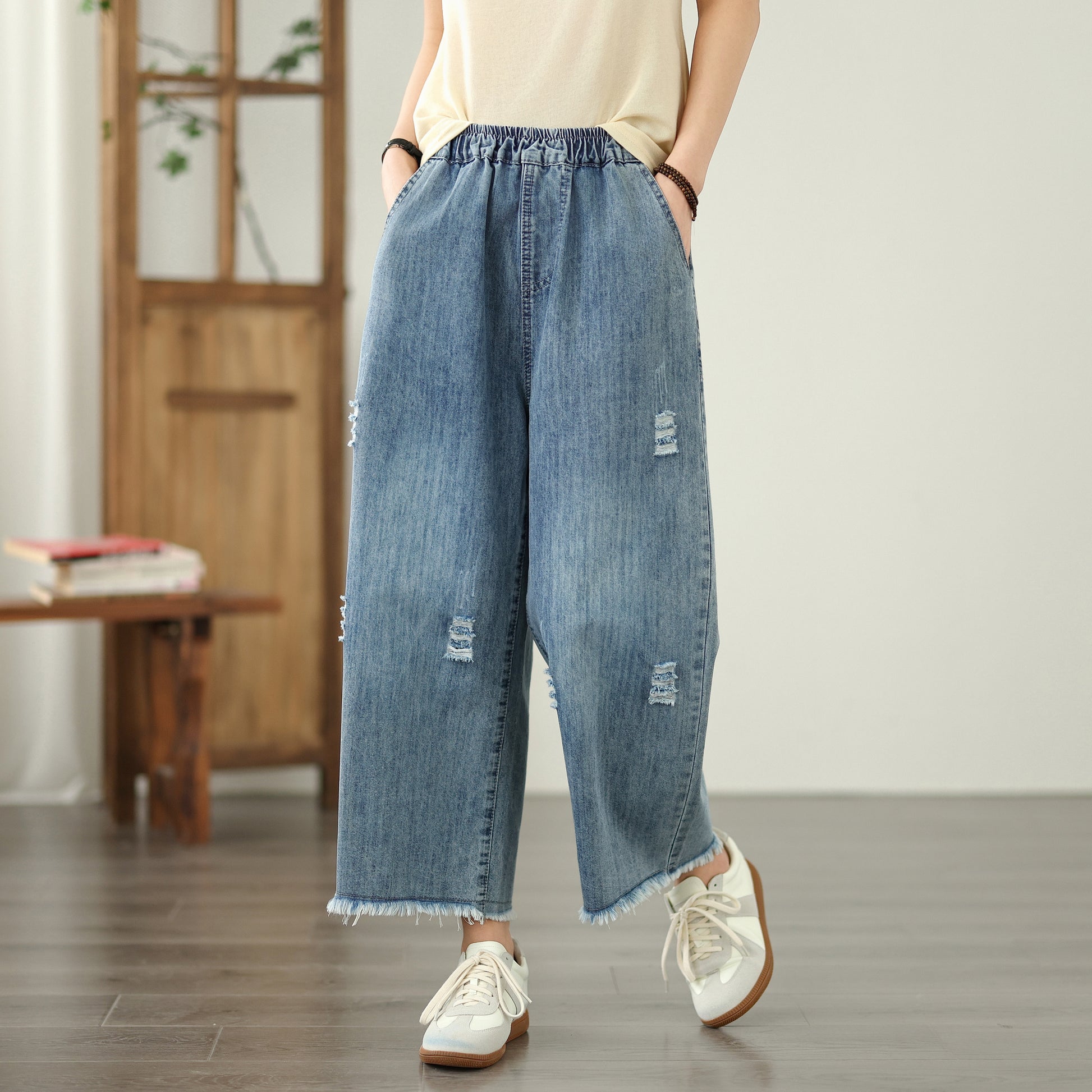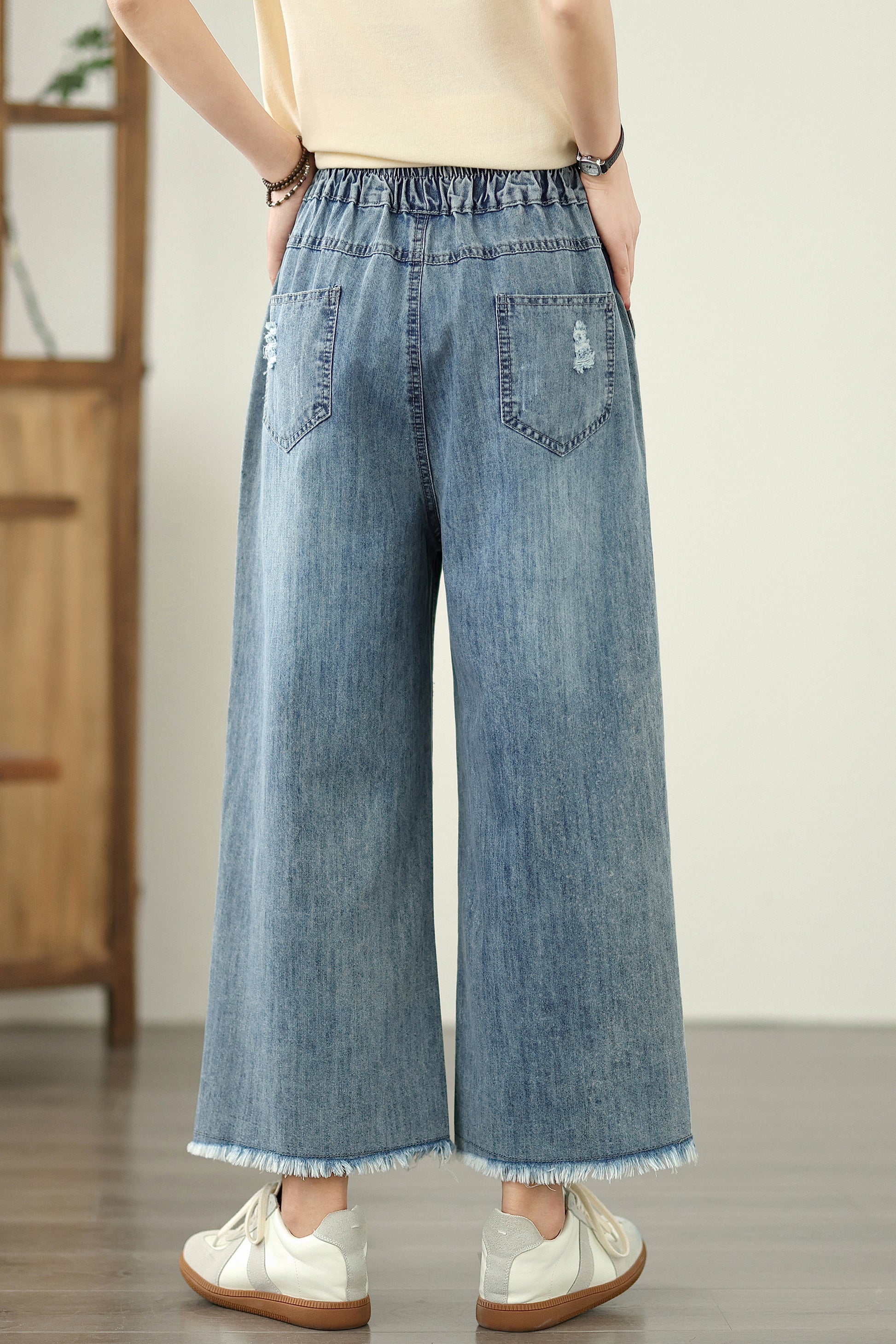 • Features: Fashion jeans,Cute Embroidery pattern,Fringed bottoms,Ninth pants,Casual loose,Elastic waisted, denim, Wide Leg, Classic denim, Double pockets. If you love wide-leg baggy jeans, this is definitely the best choice for you.