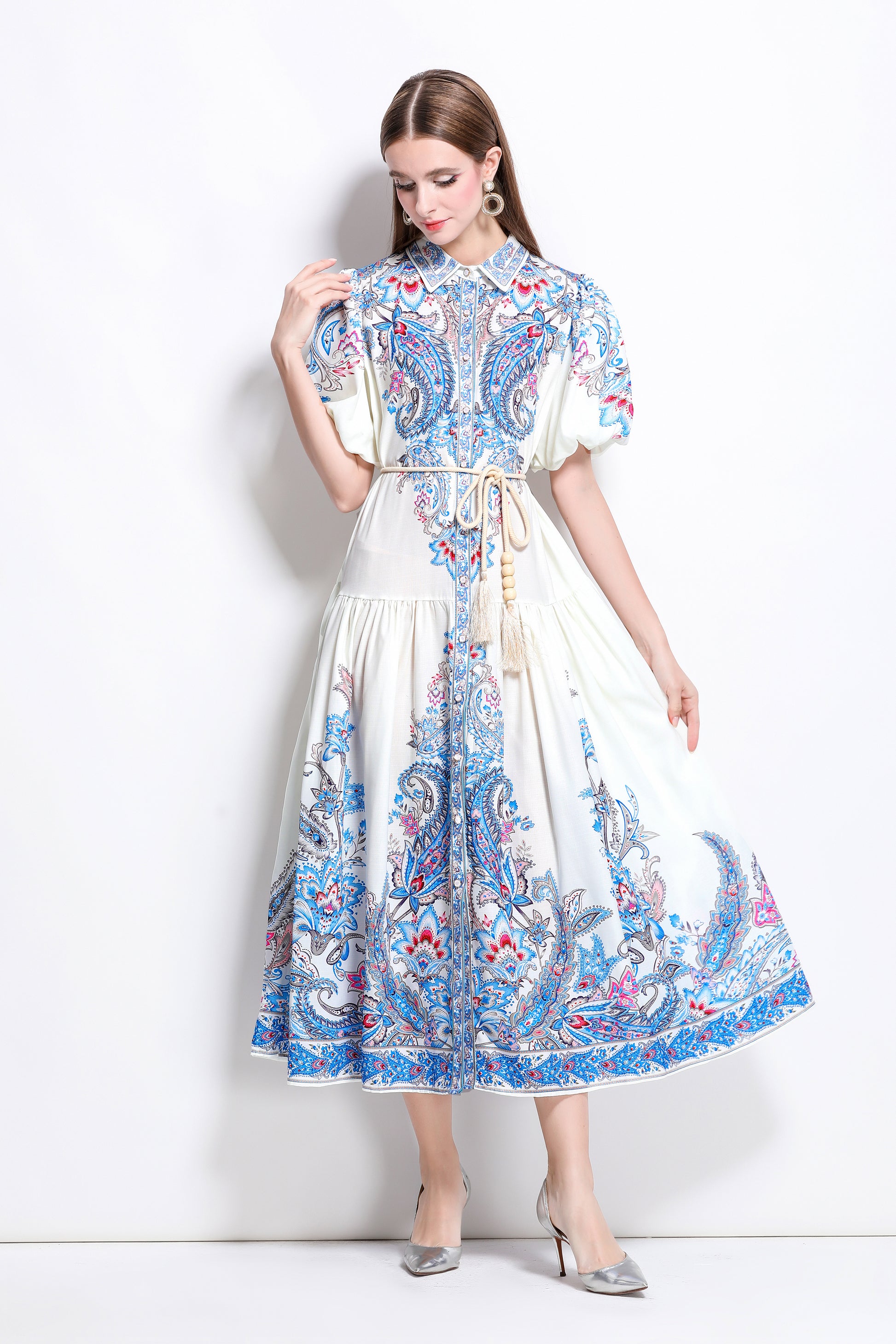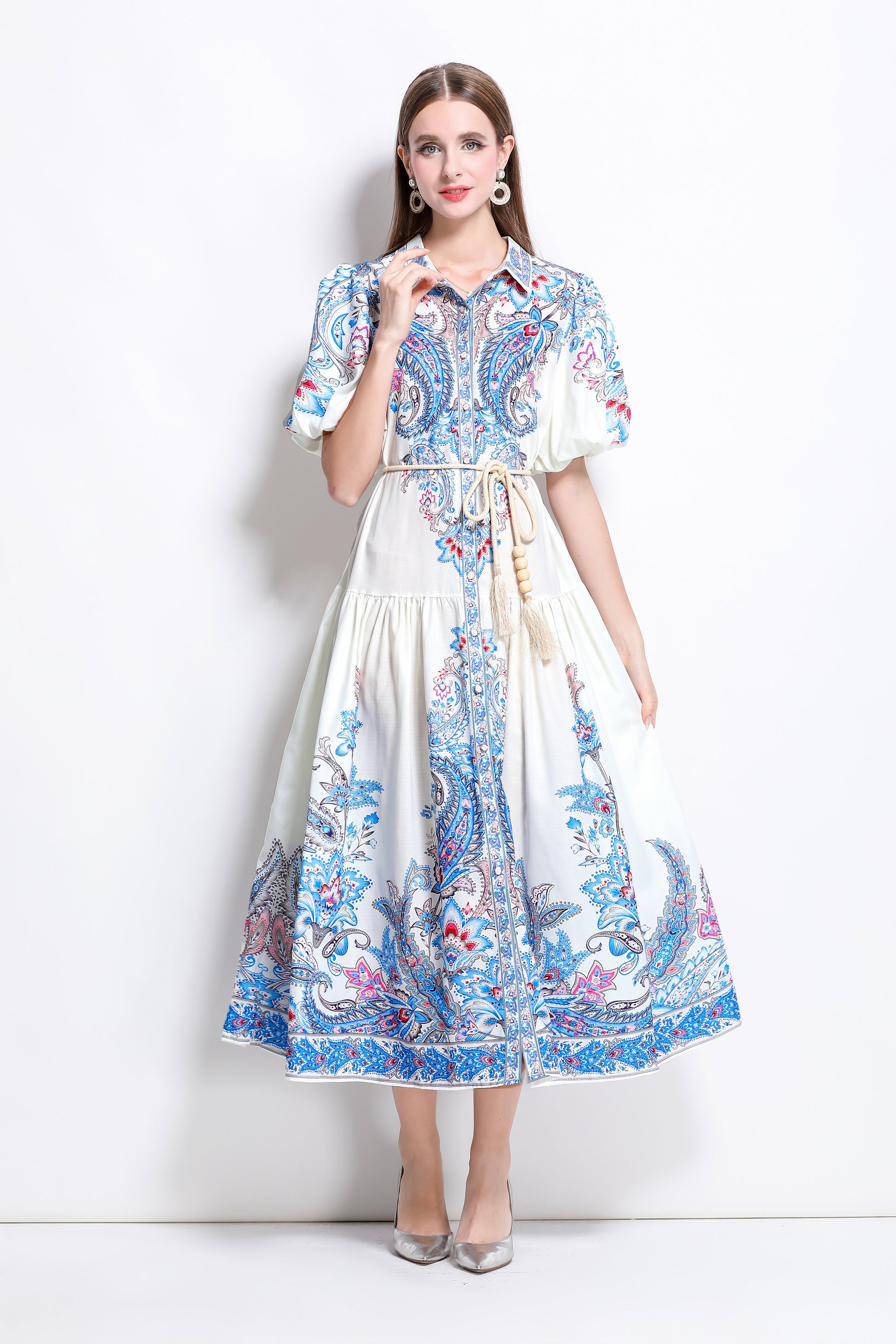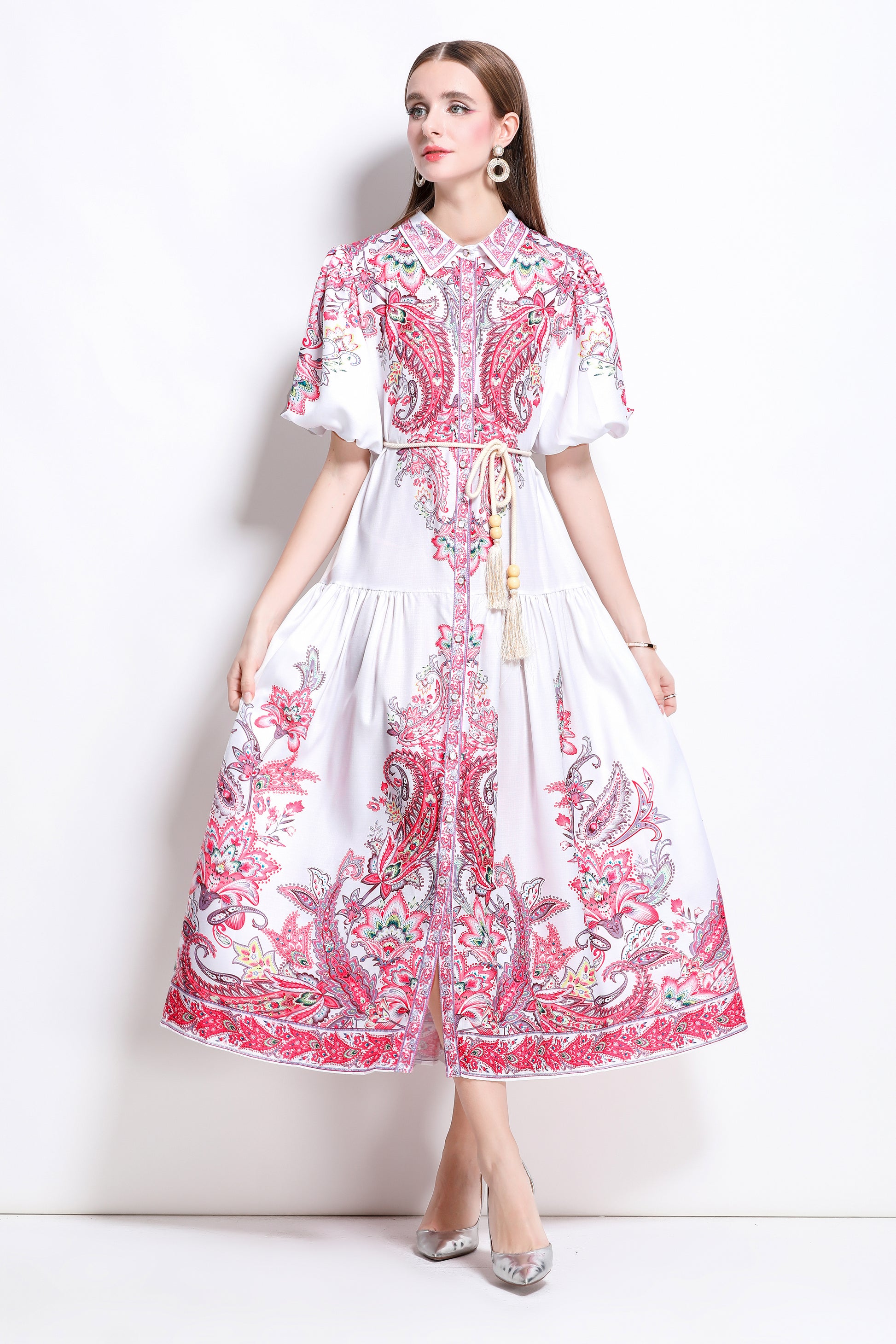 - Features:Collared neckline,short puff sleeve,Low-rise design,Maxi length,A-line,Fit and flare design,All over floral print,Button front fastening,pleat dress,belt dress.