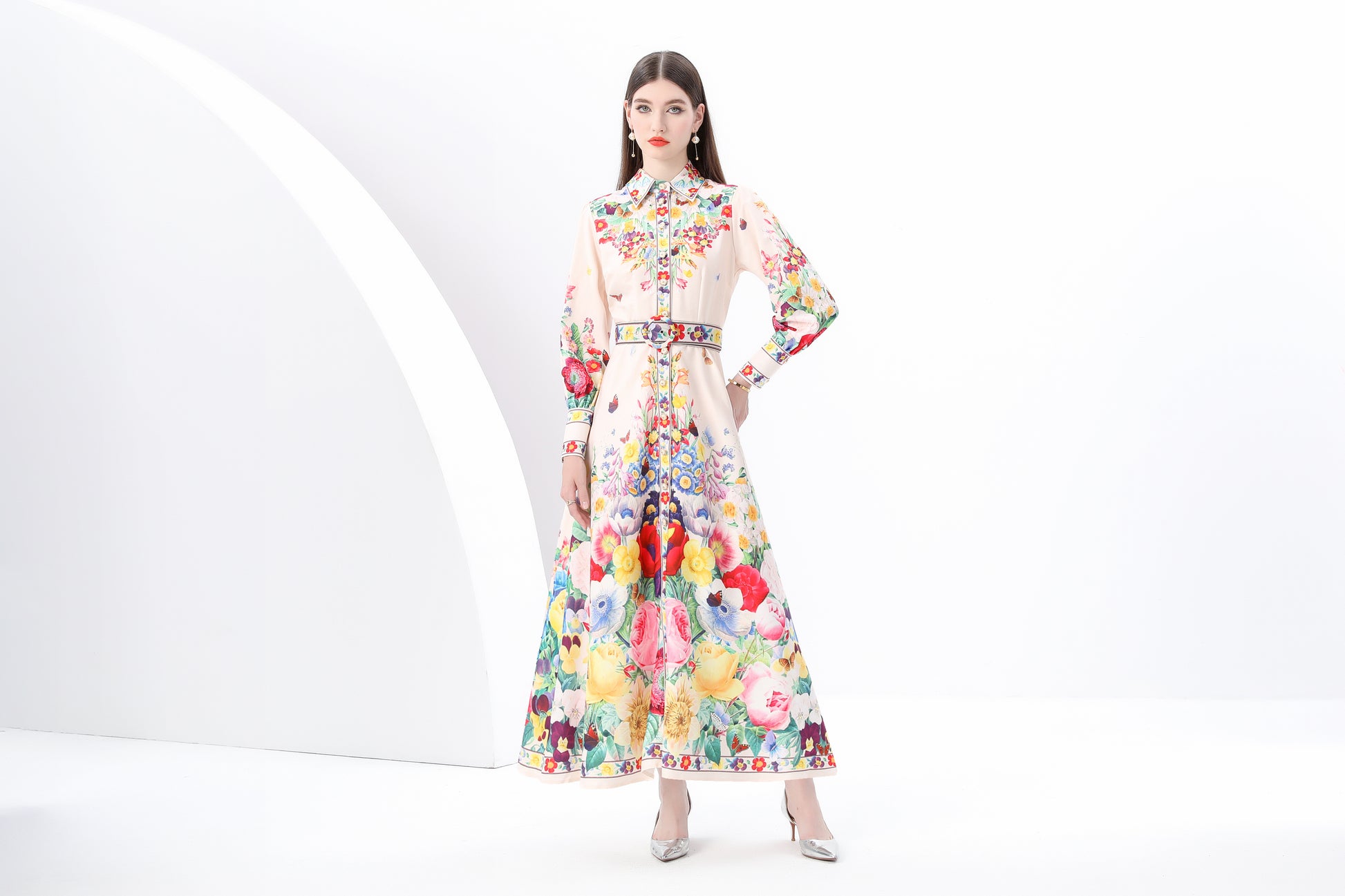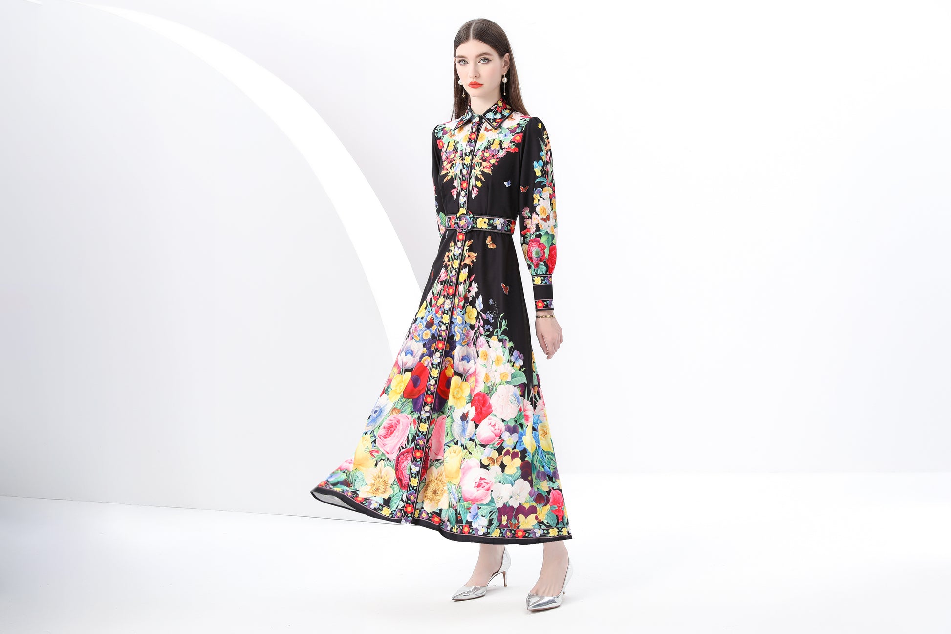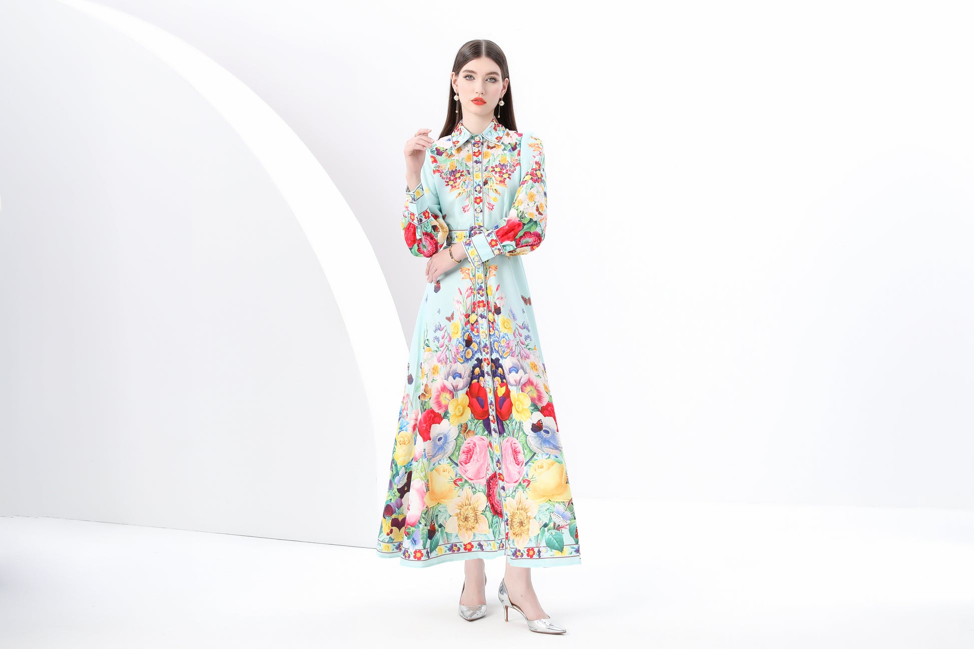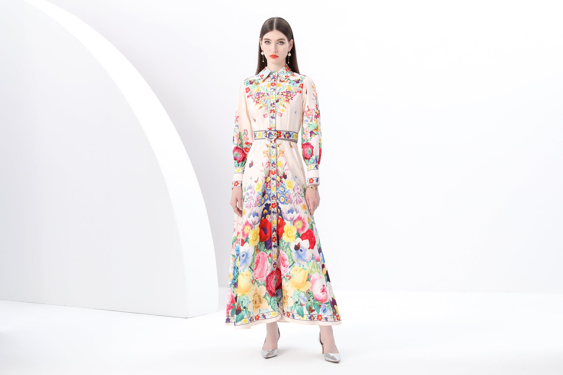 - Features:Collared neckline,With belt,Long Sleeve,Maxi length,Floral print,A-line,Button front fastening. It's long and flowy,high leg slit to still feel breezy and sexy.
