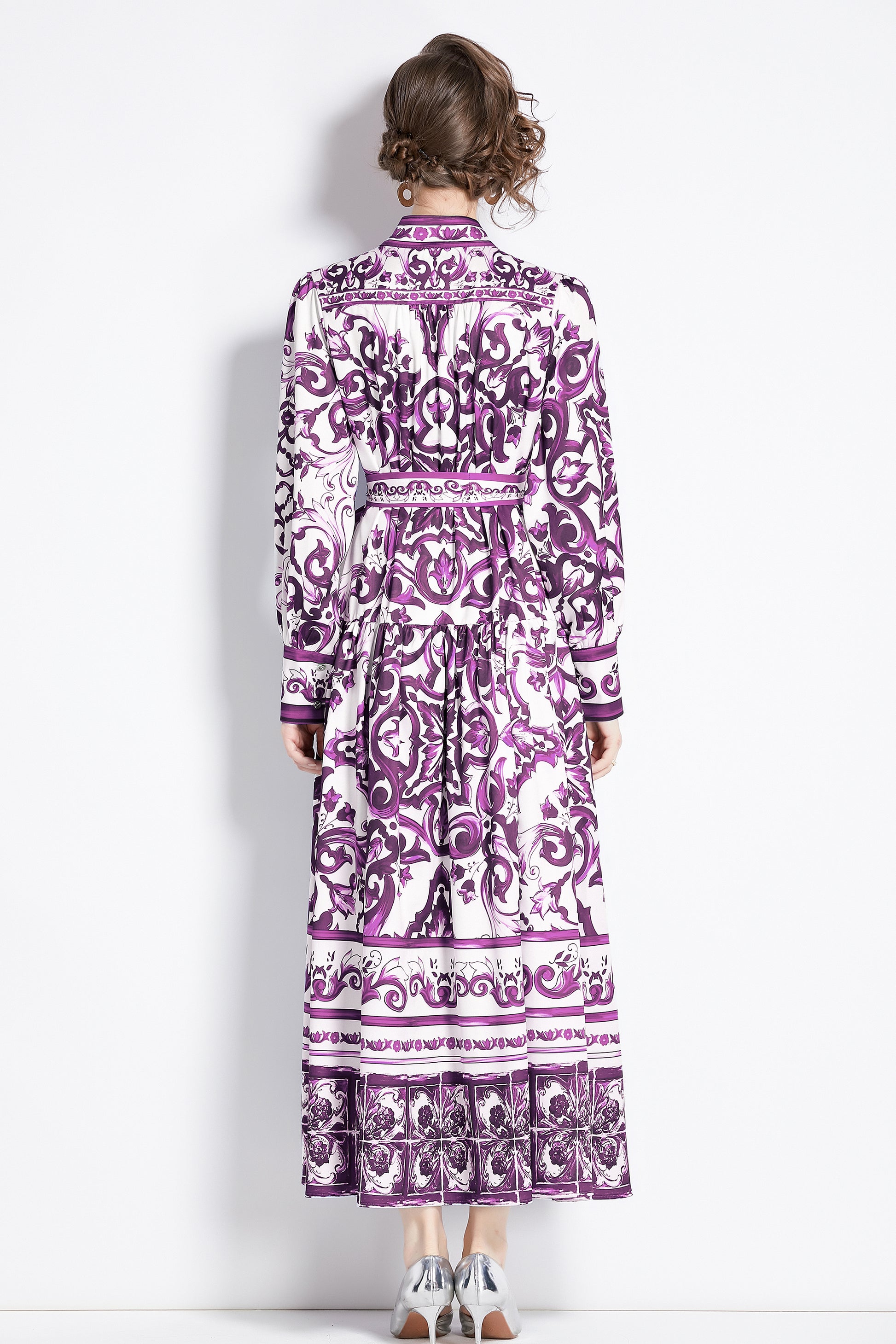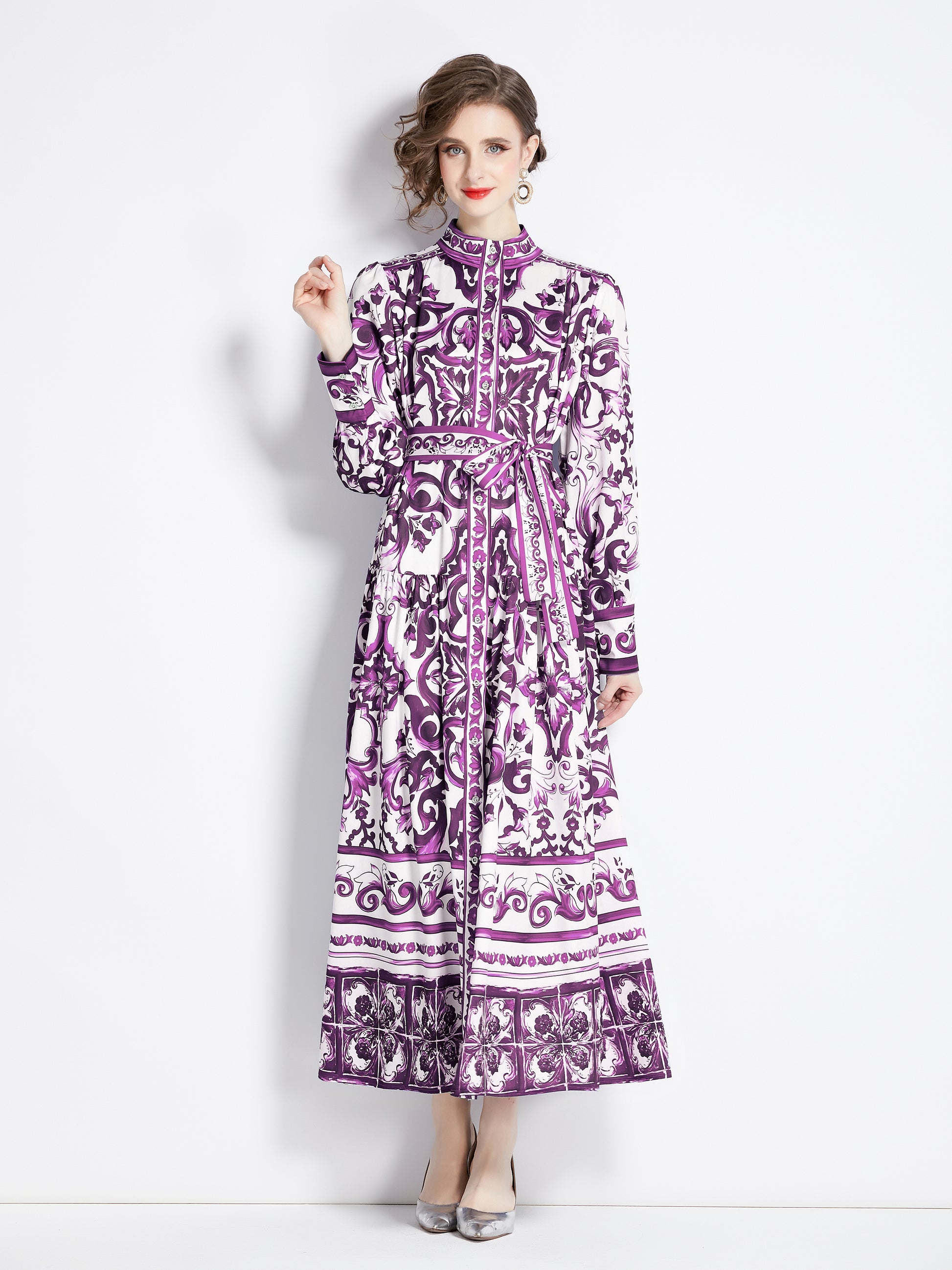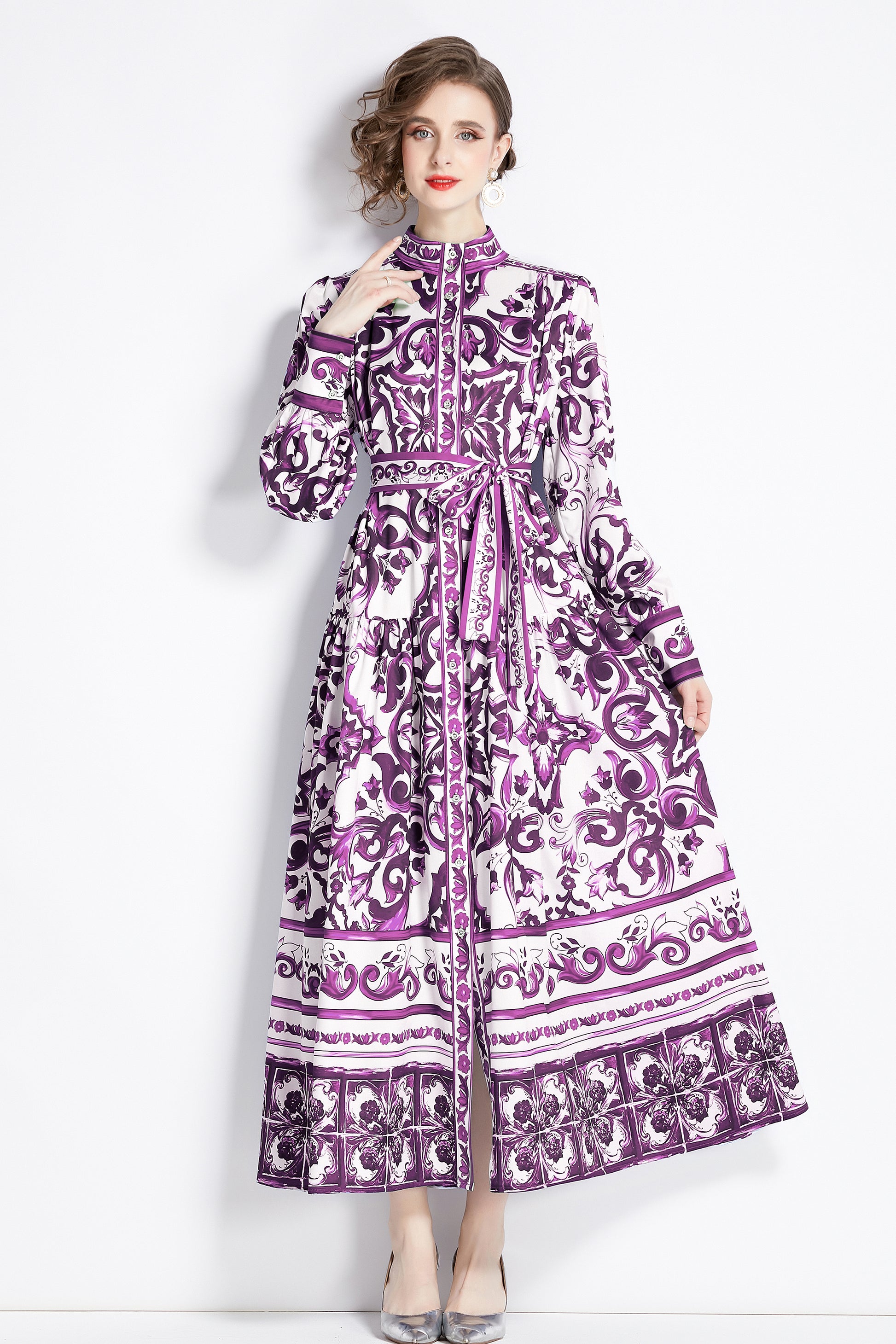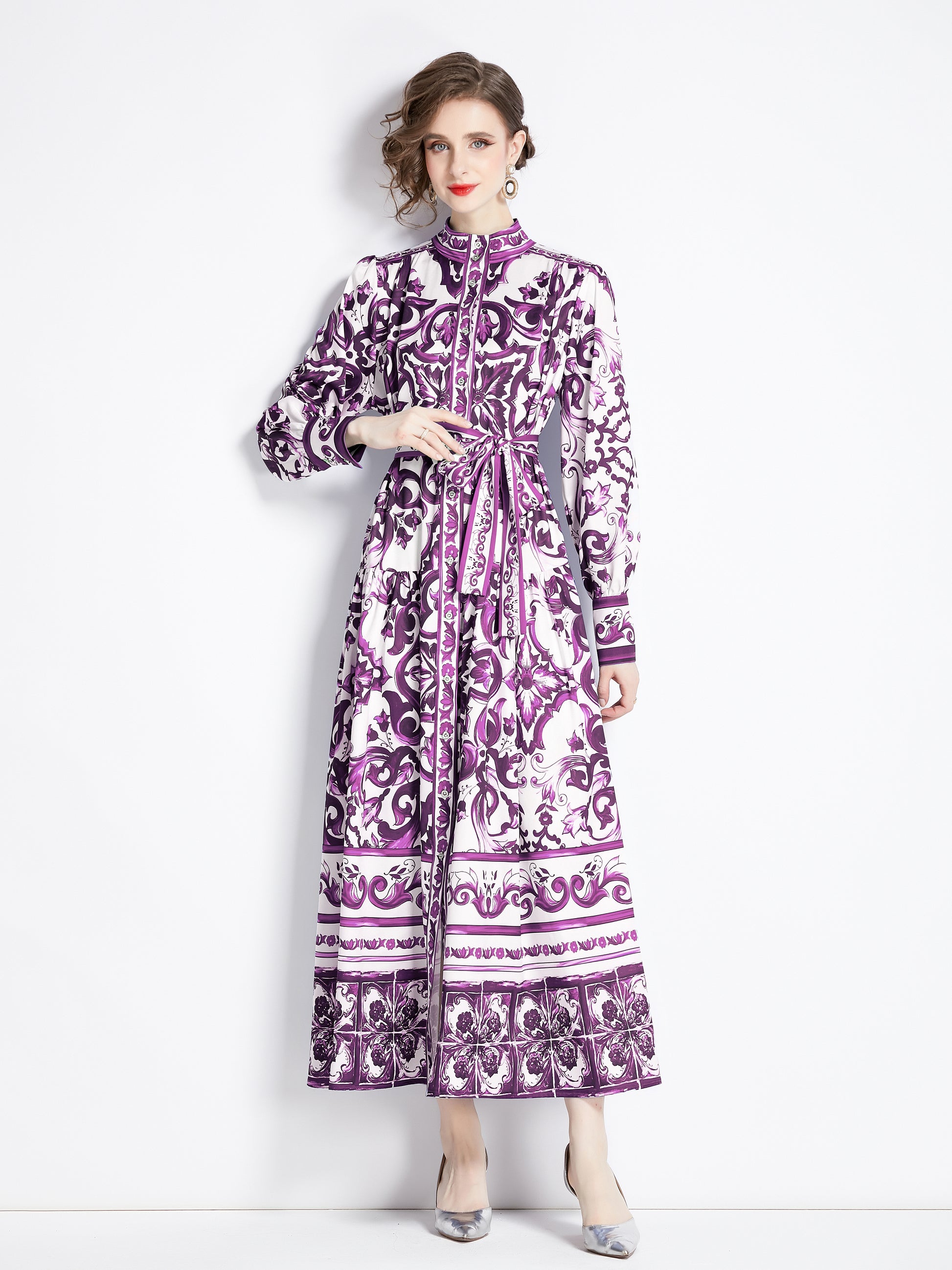 • 【UNIQUE DESIGN】Long Lantern sleeve, Fashion printing design,button front, Round-neck, with a belt accessory,maxi length.