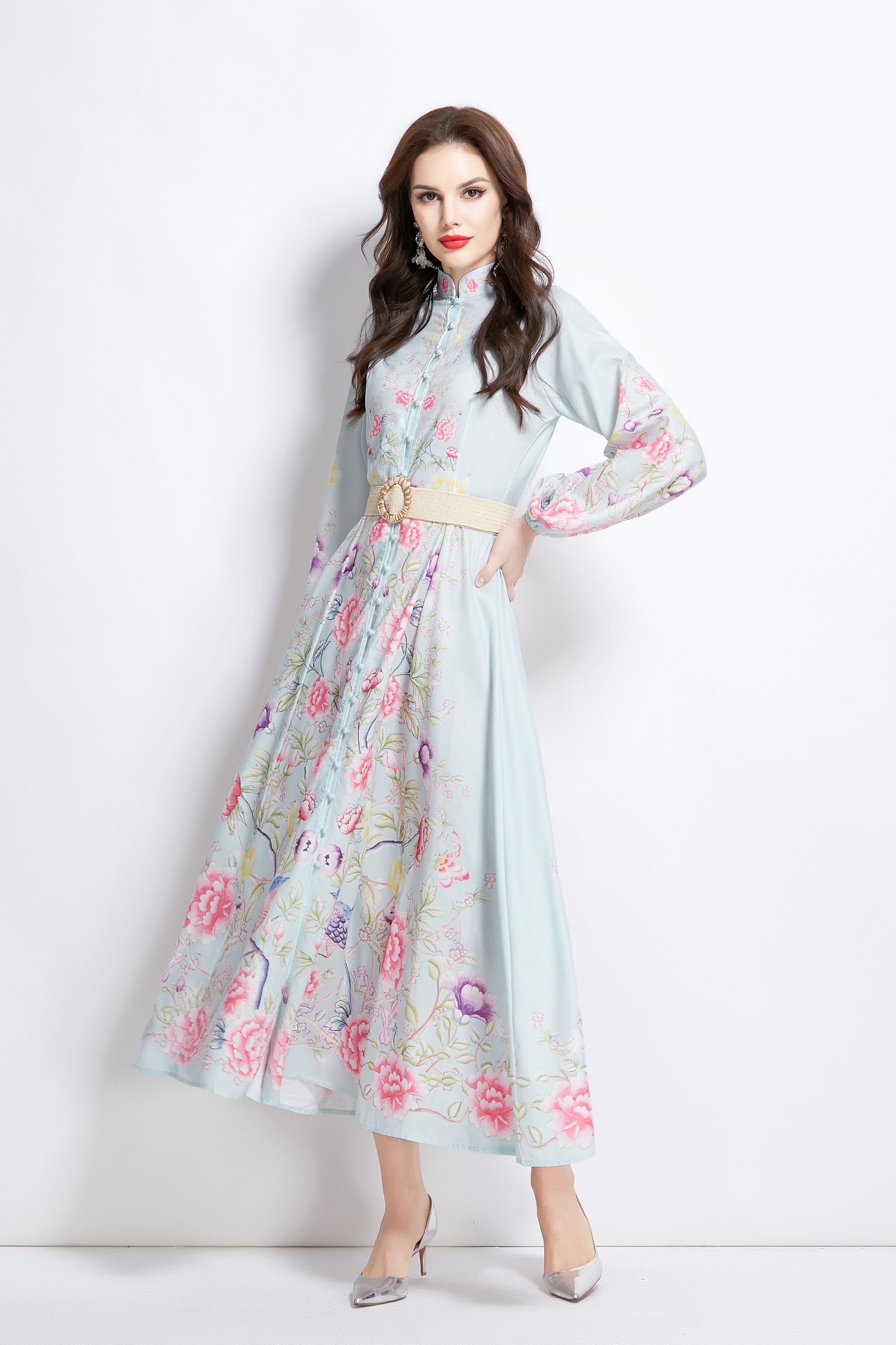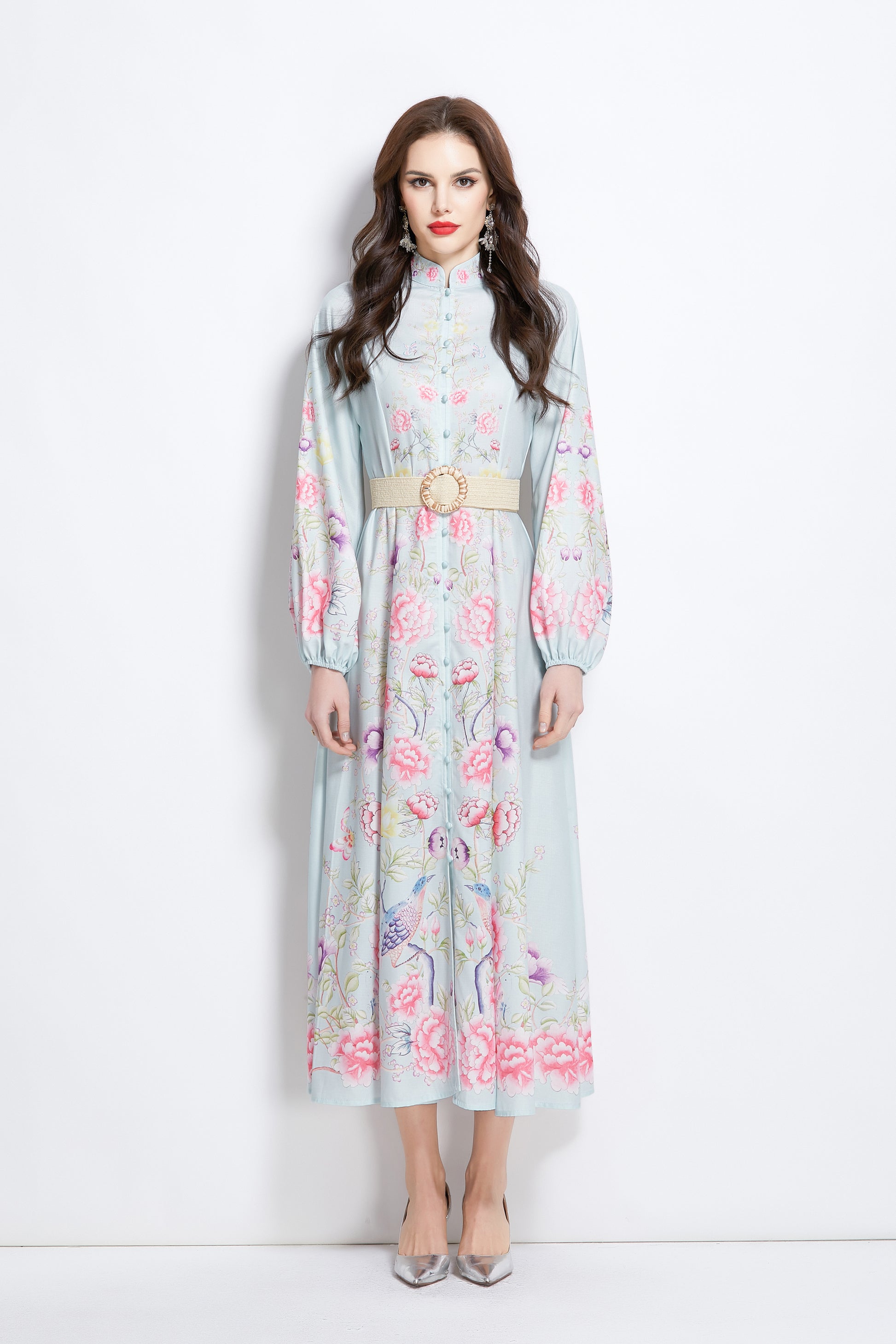 - Features:Mandolin collar, lantern long sleeve, fine floral print, front button, split design, belt, long dress style.