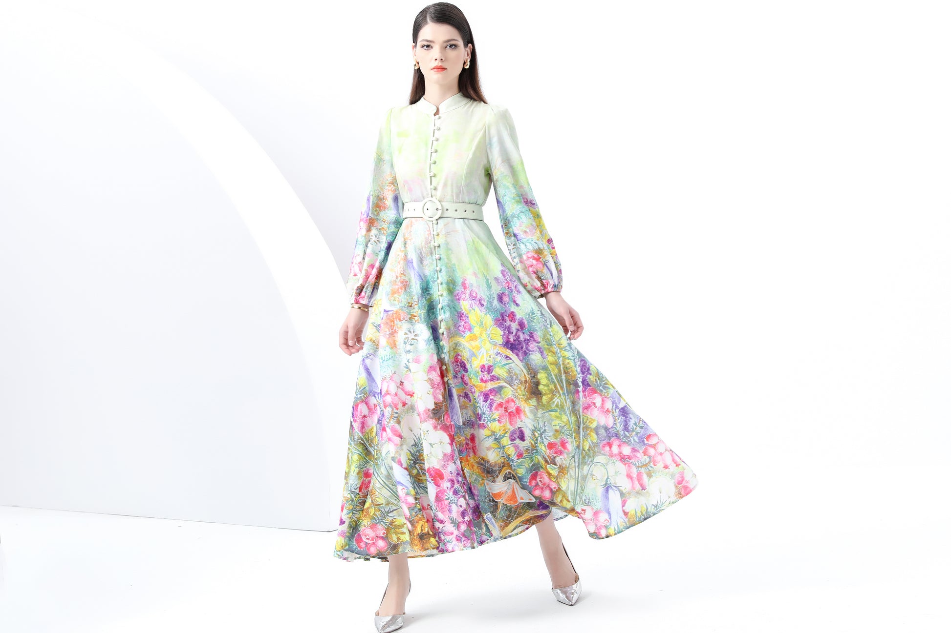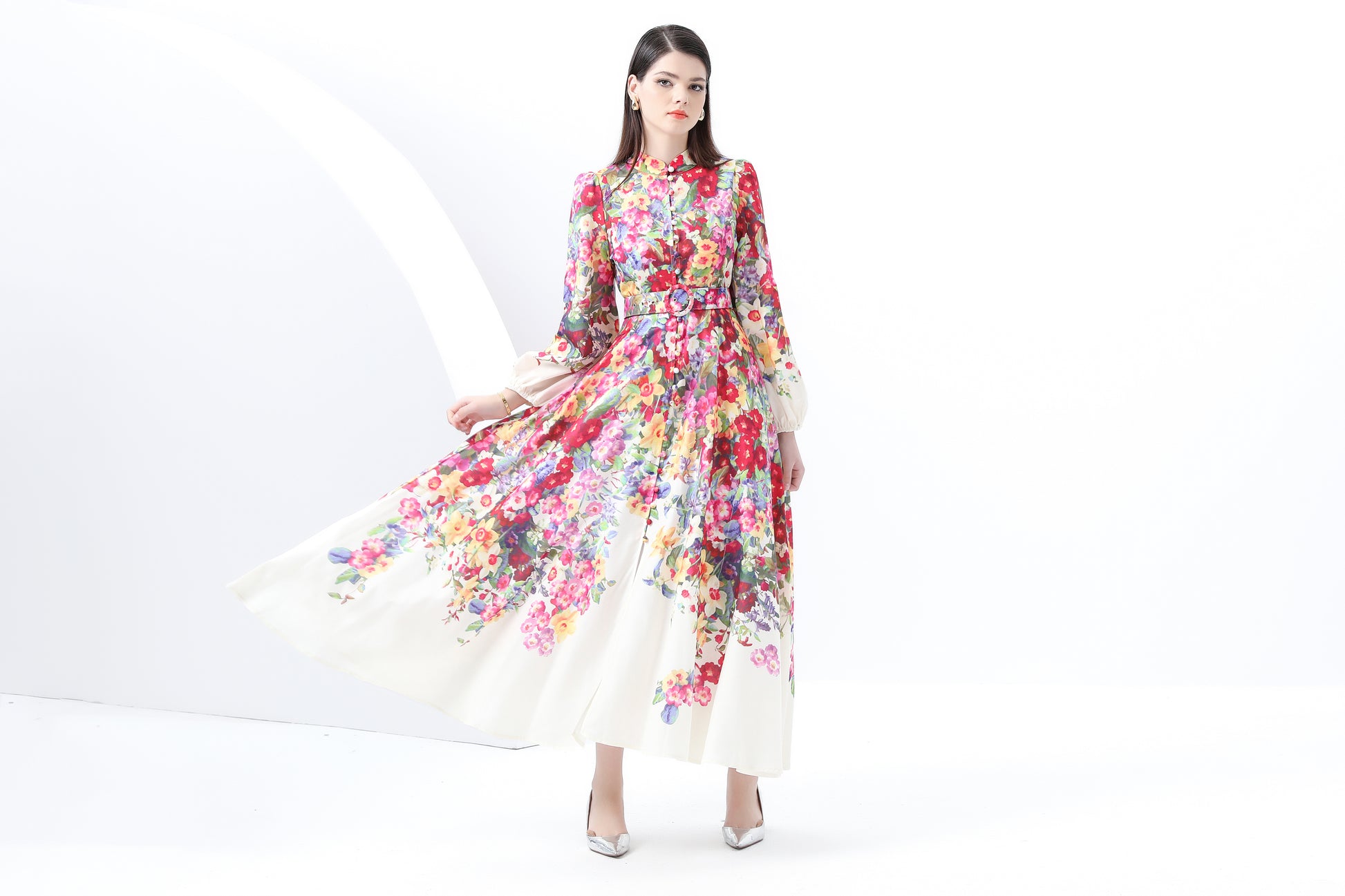 - Features:Mandolin collar, lantern long sleeve, fine floral print, front button, split design, belt, long dress style.