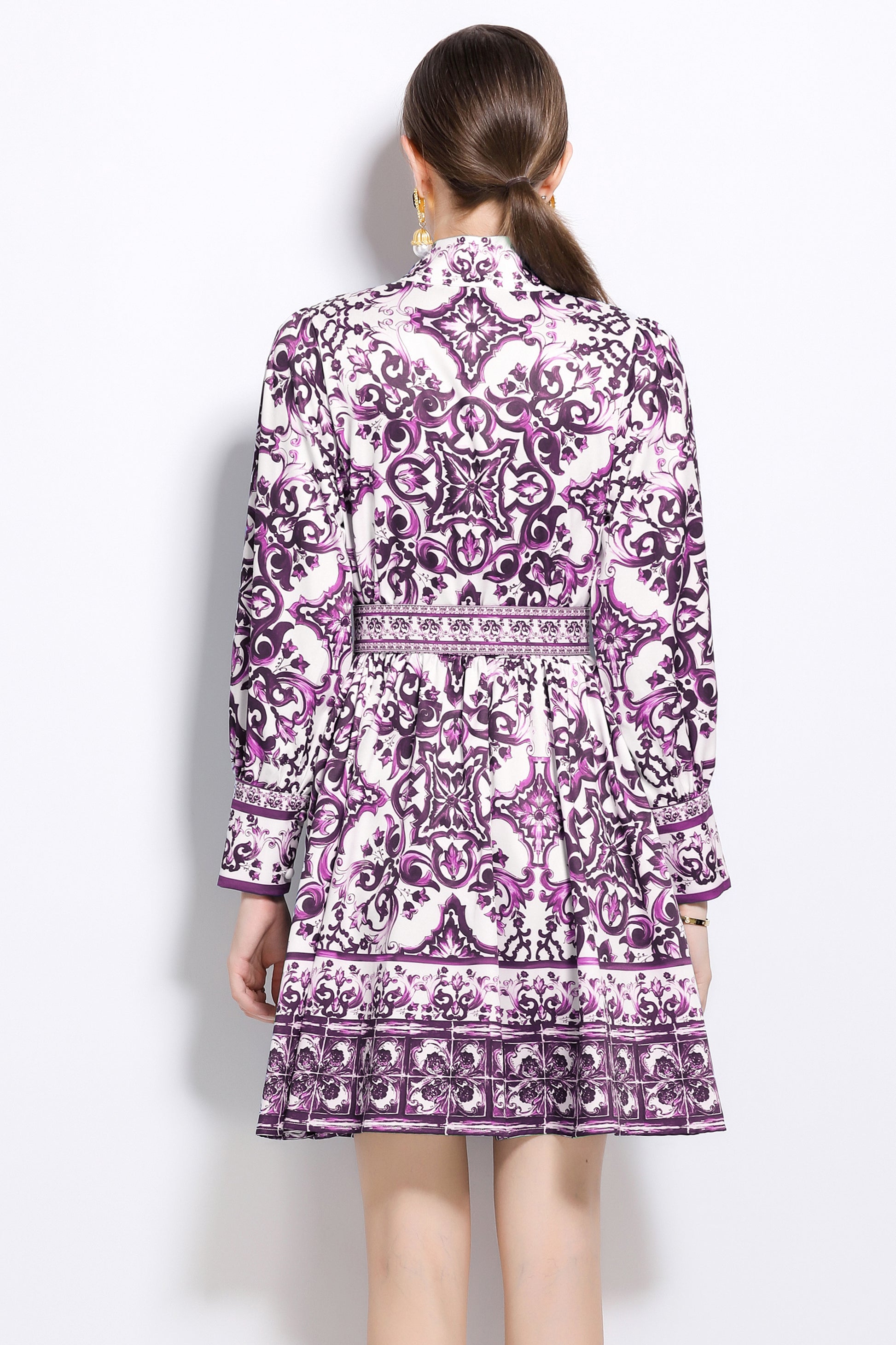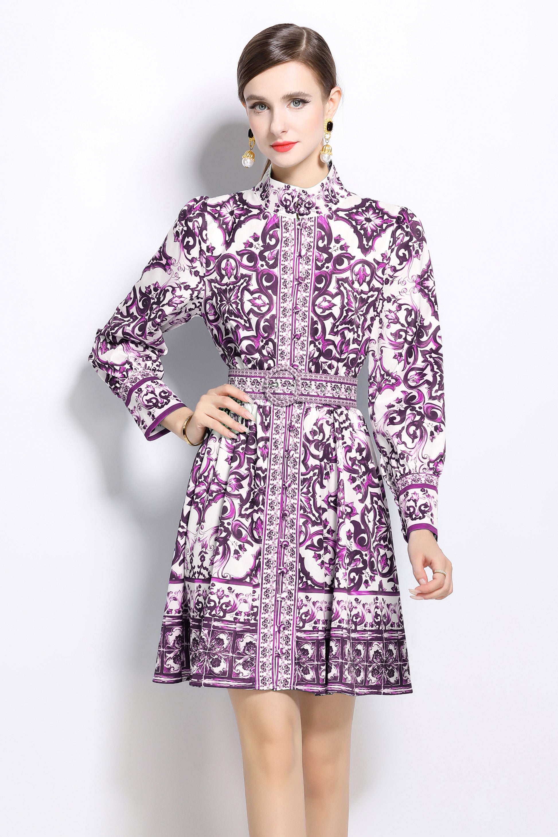 • 【UNIQUE DESIGN】Long Sleeve,Button up,Fashion Floral printing design,high neck, mini length, with Belt