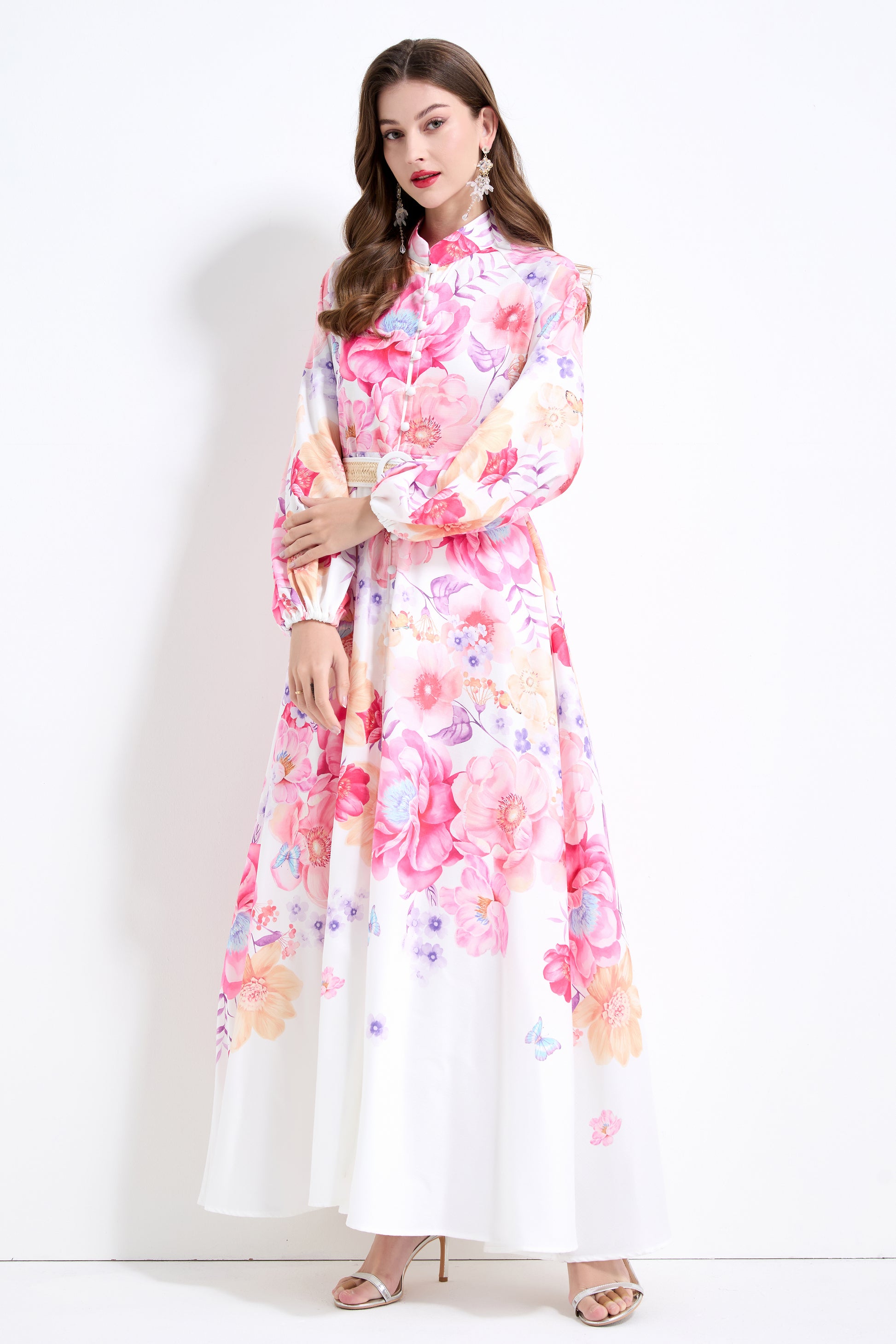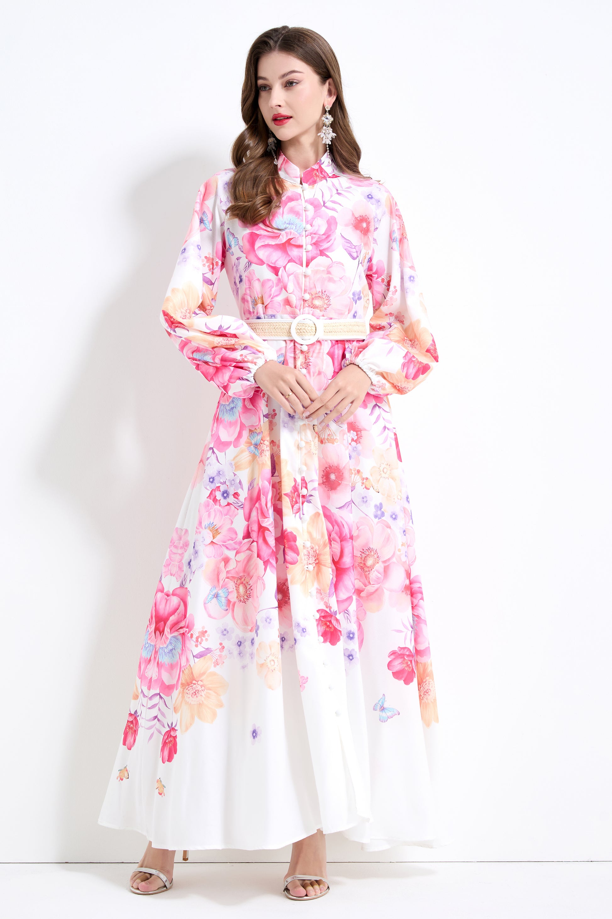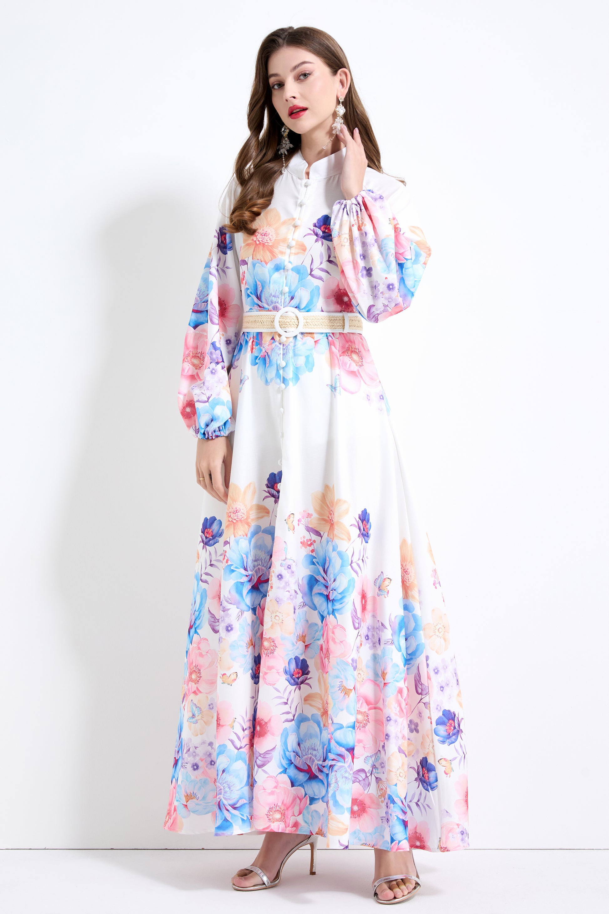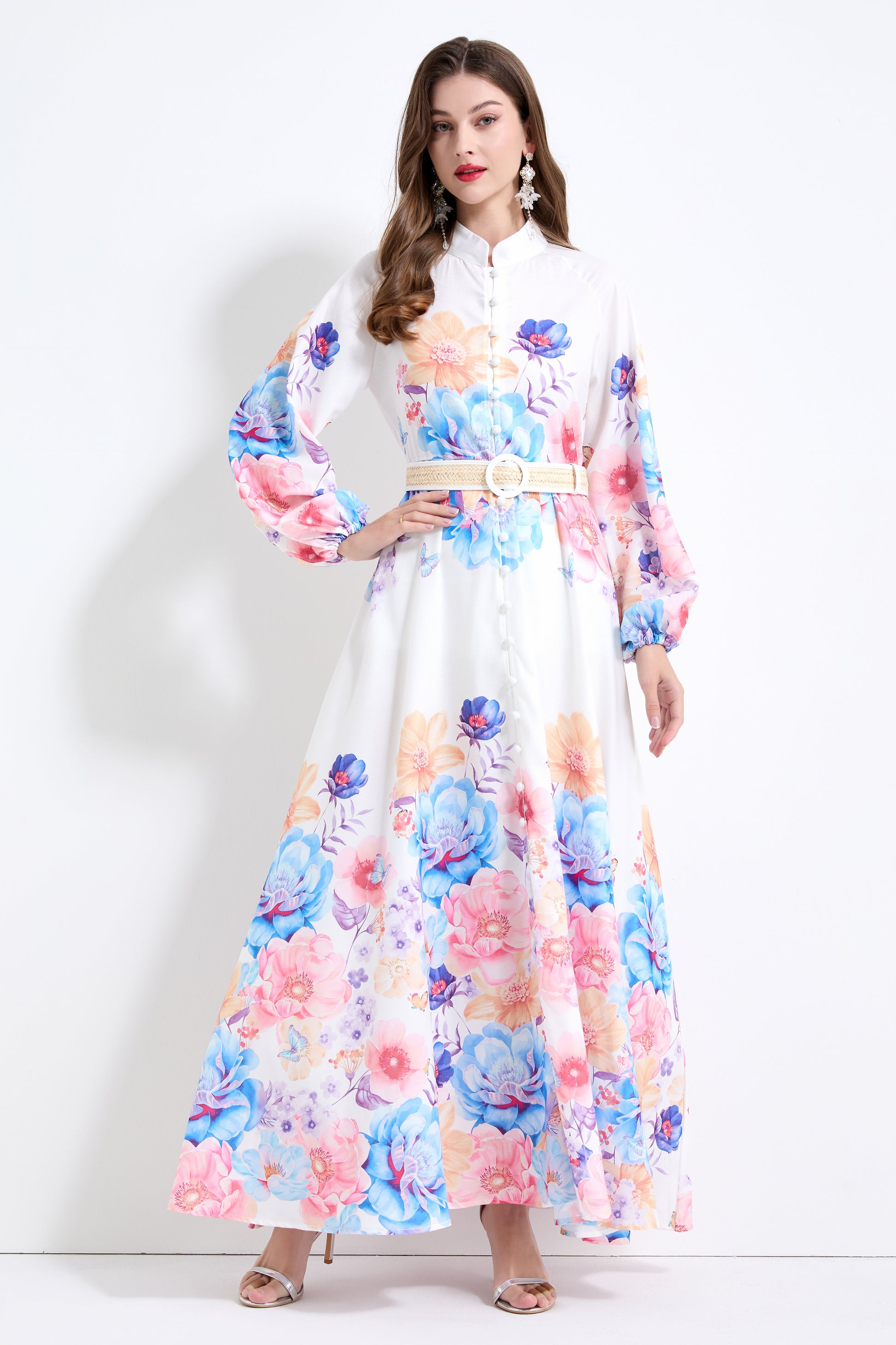 - Feature: Polyester,soft and comfortable,Stand Collar,Split,button up dress,floral print,flowy A line dress,high waist with belt,long puff sleeve,maxi dress