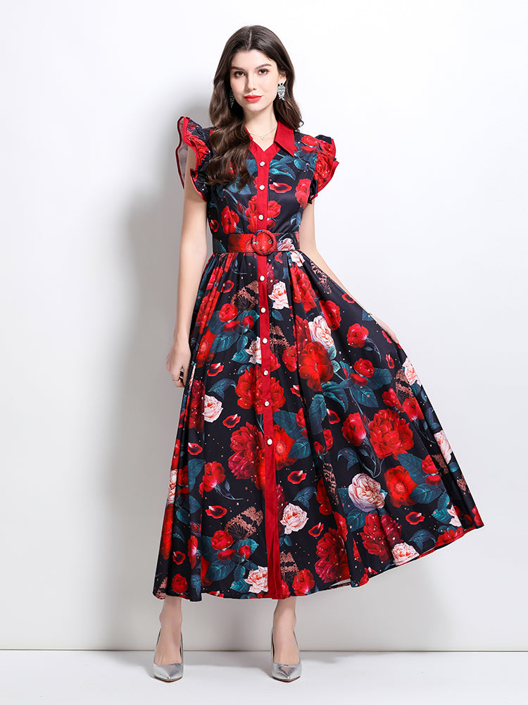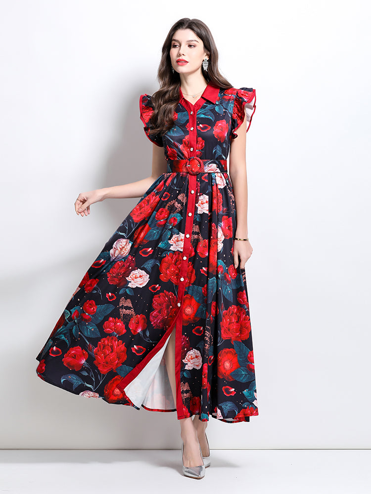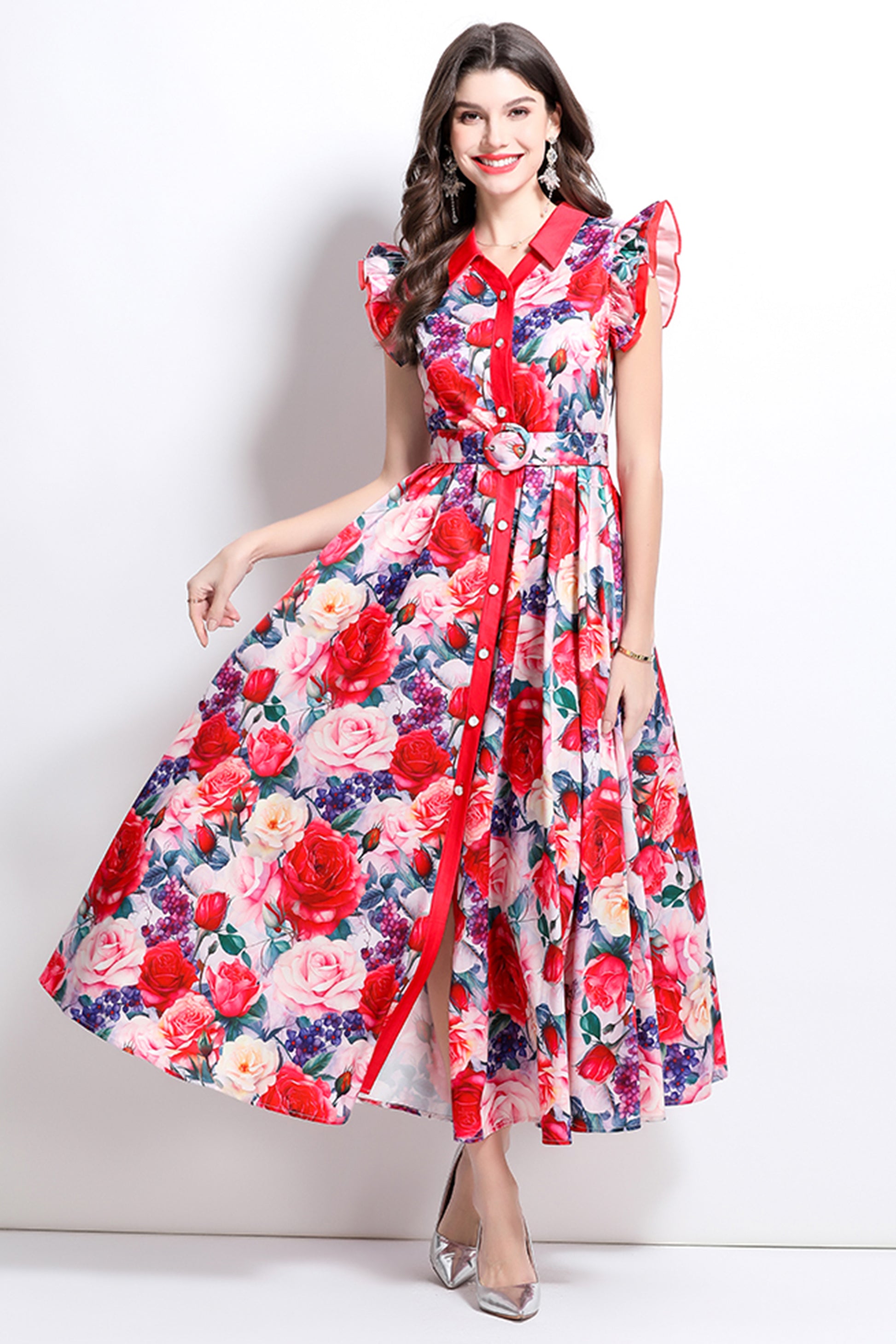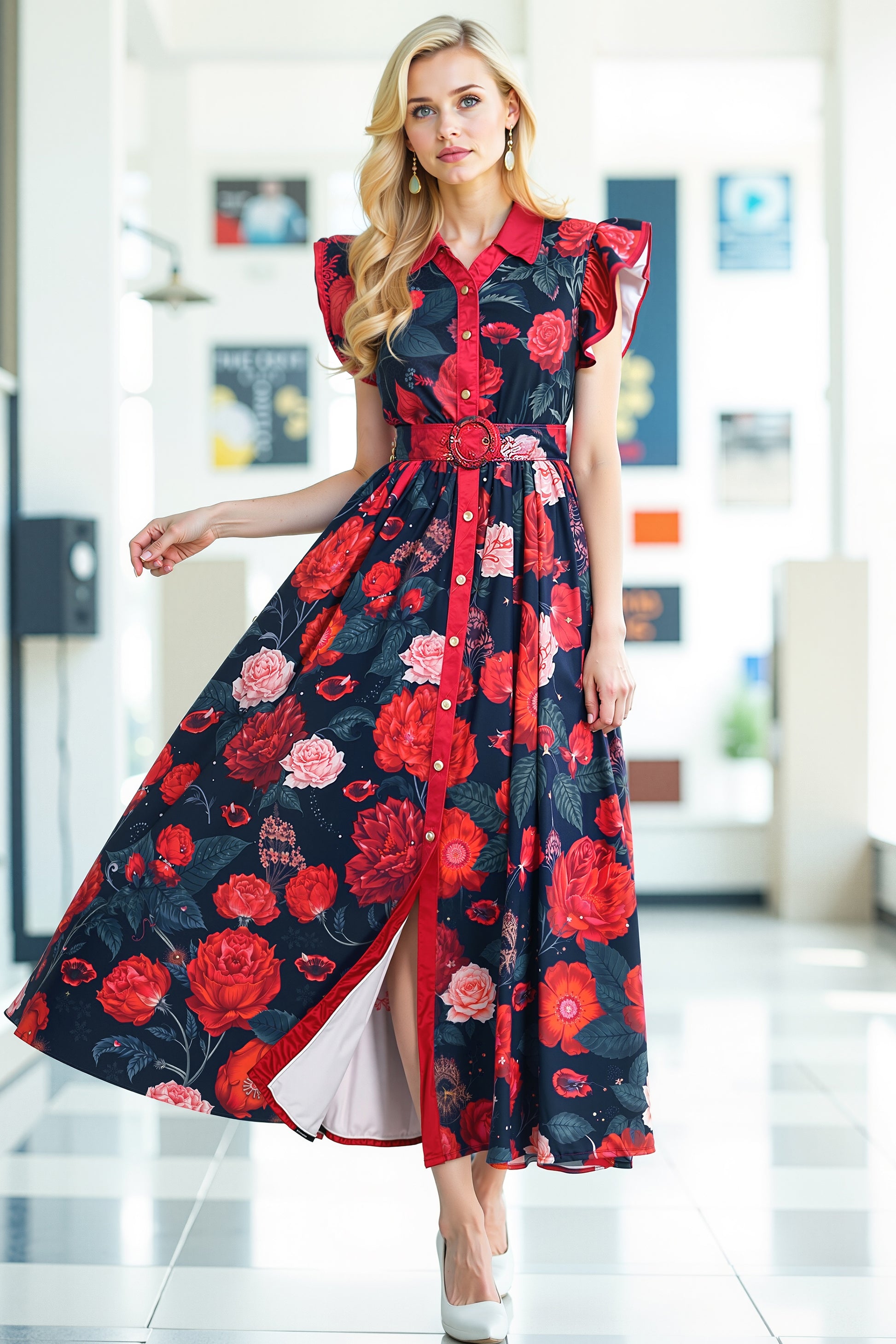 - Features: All over print, floral pattern, classical v neck, buttons,sleeveless, a belt front, high waist,maxi length, A line flowy dress.