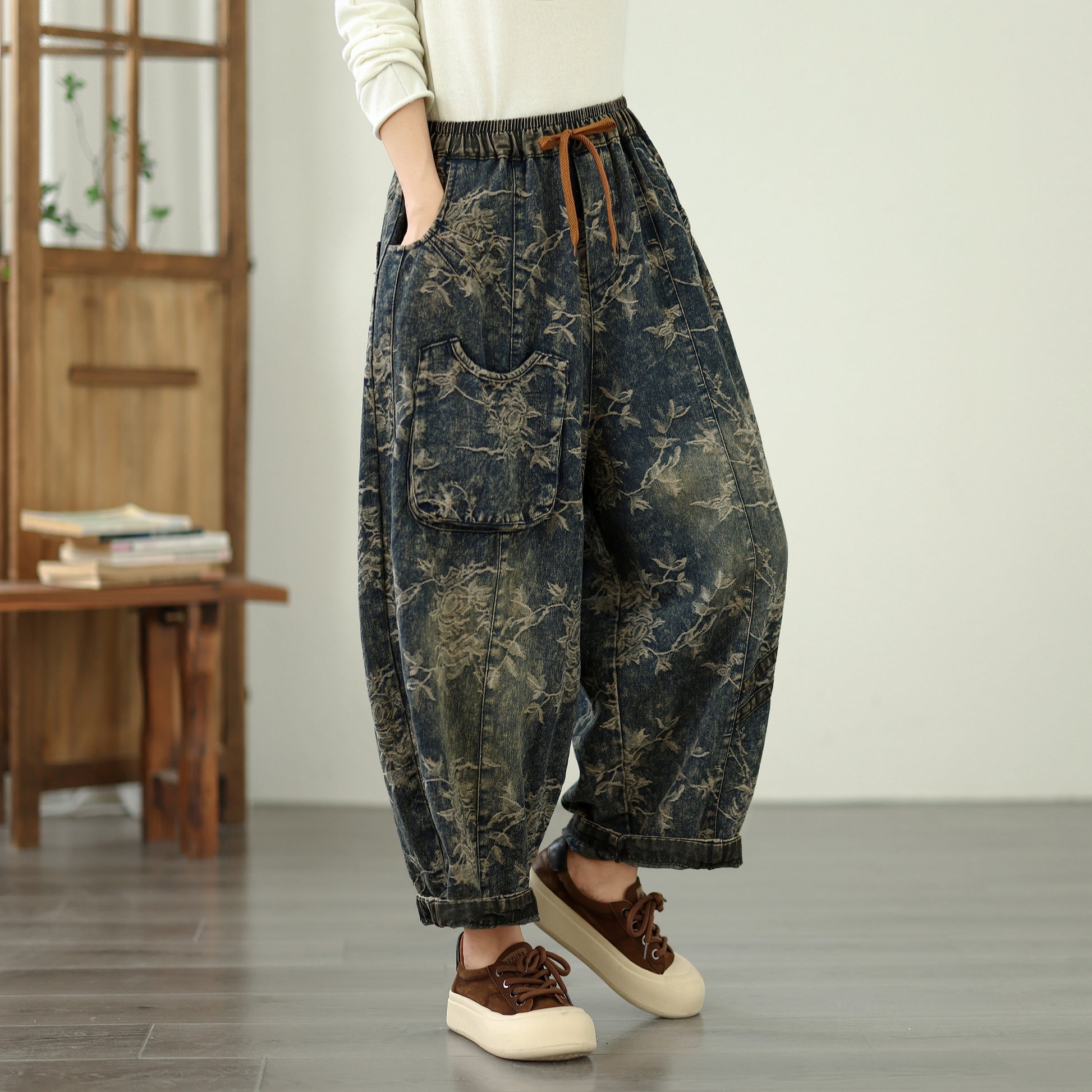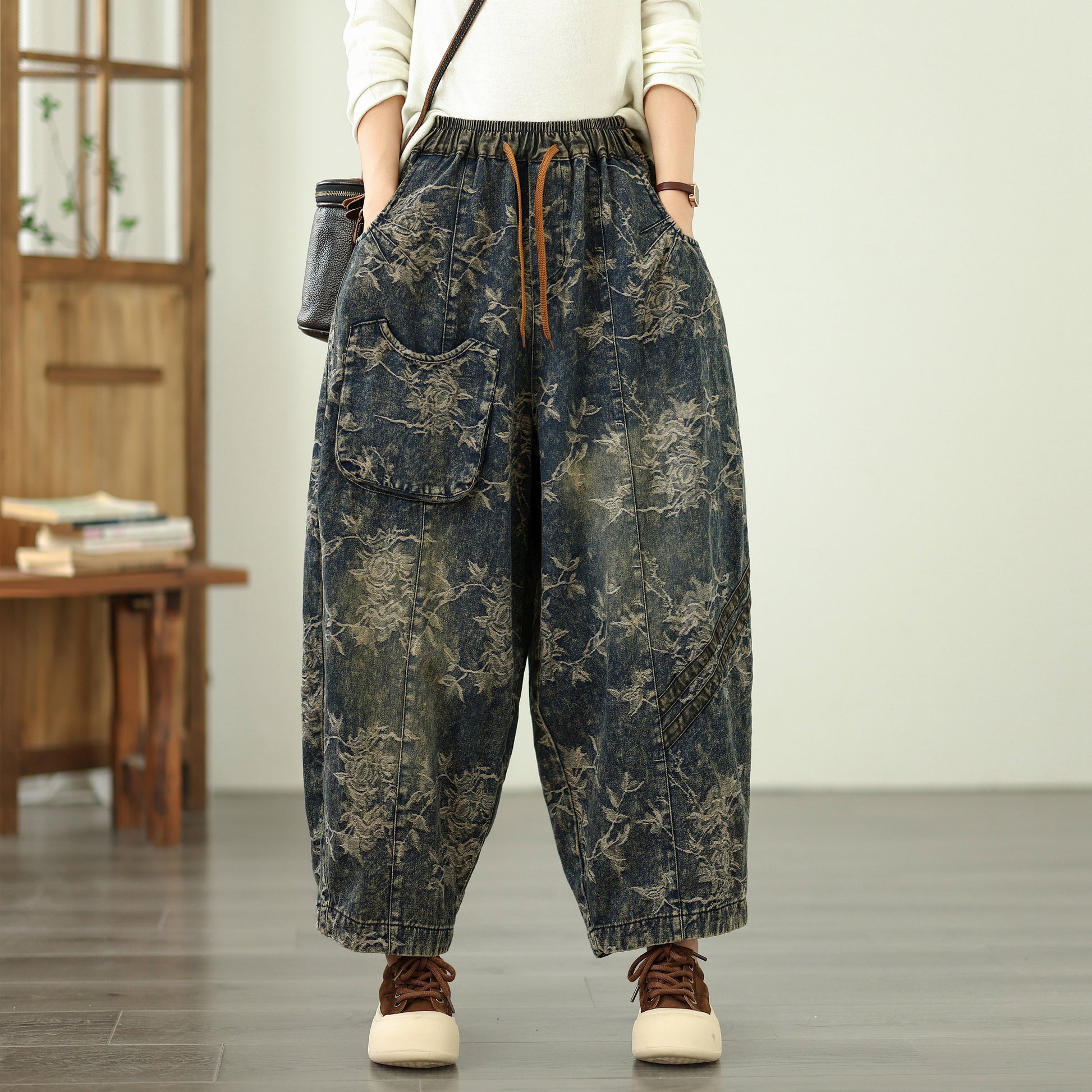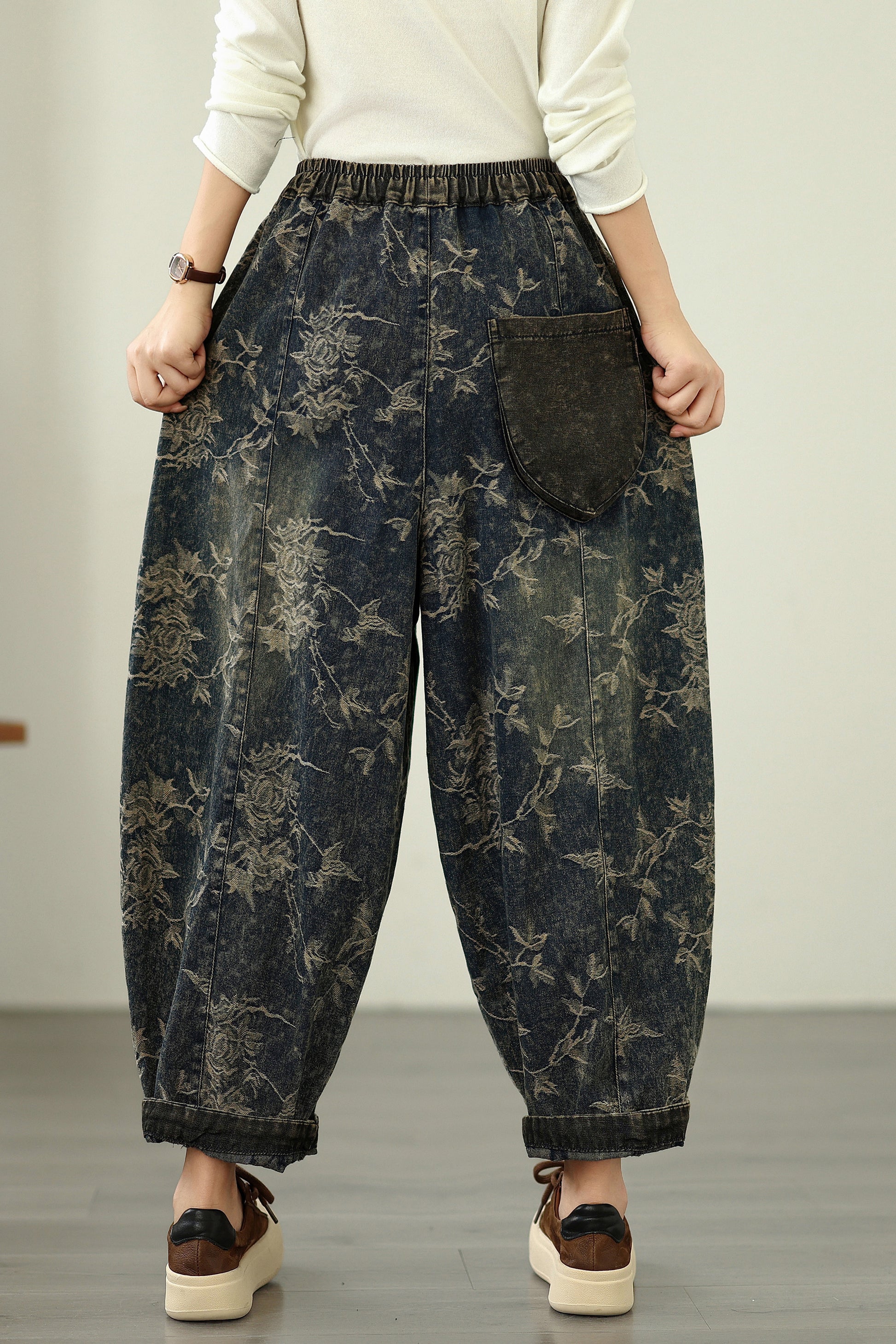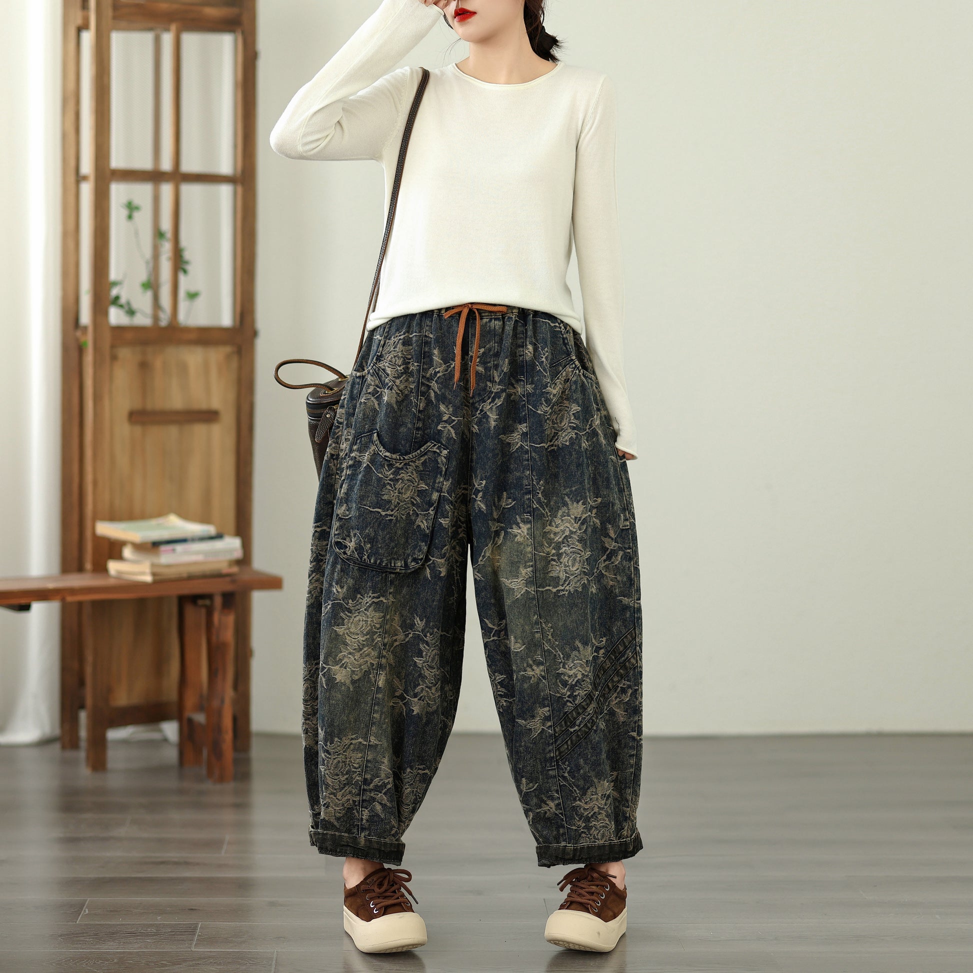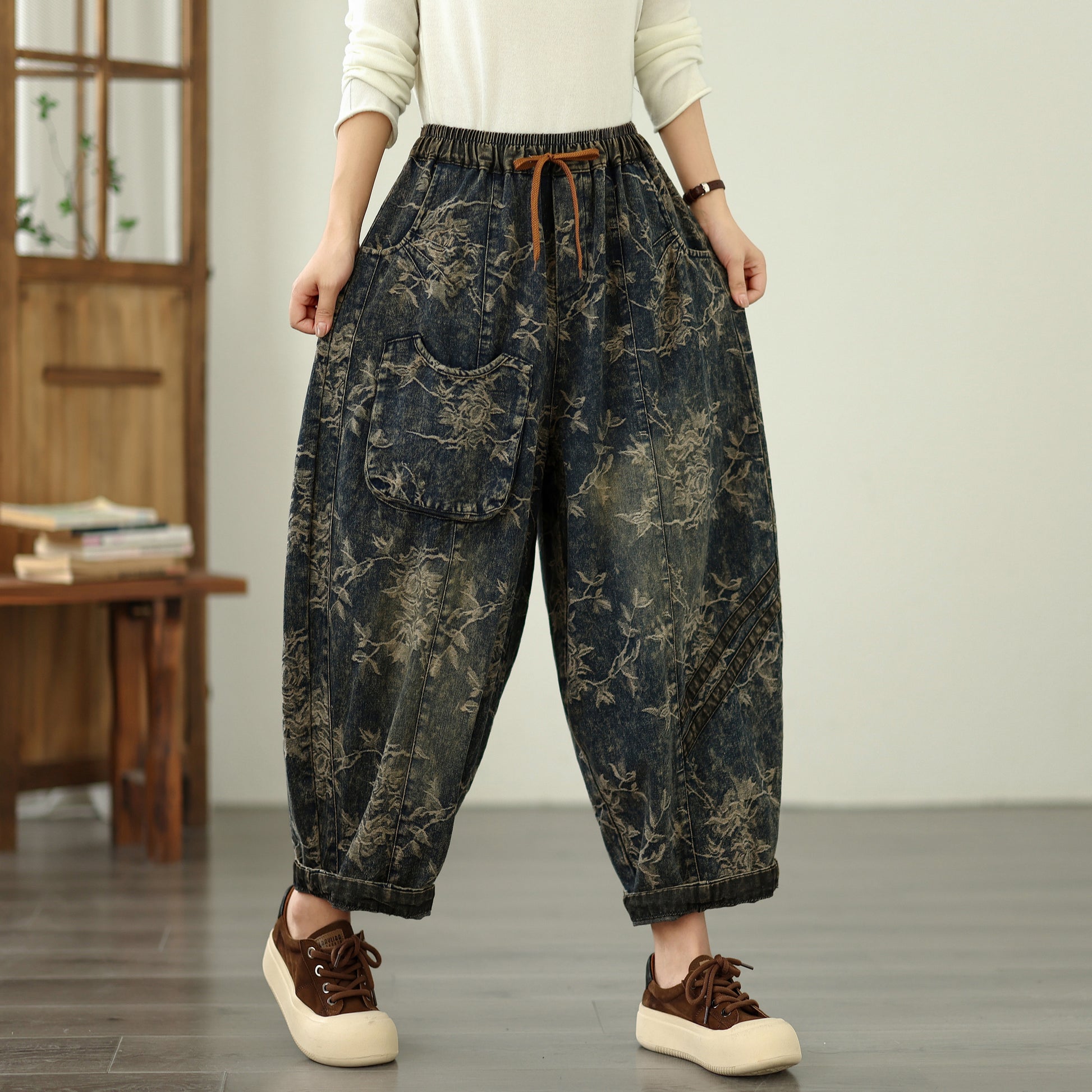 • Features: Retro printed jeans, high-waisted jeans, casual loose jeans, Harem pants, drawstring stretch waist, large pocket design, 9-inch pants.