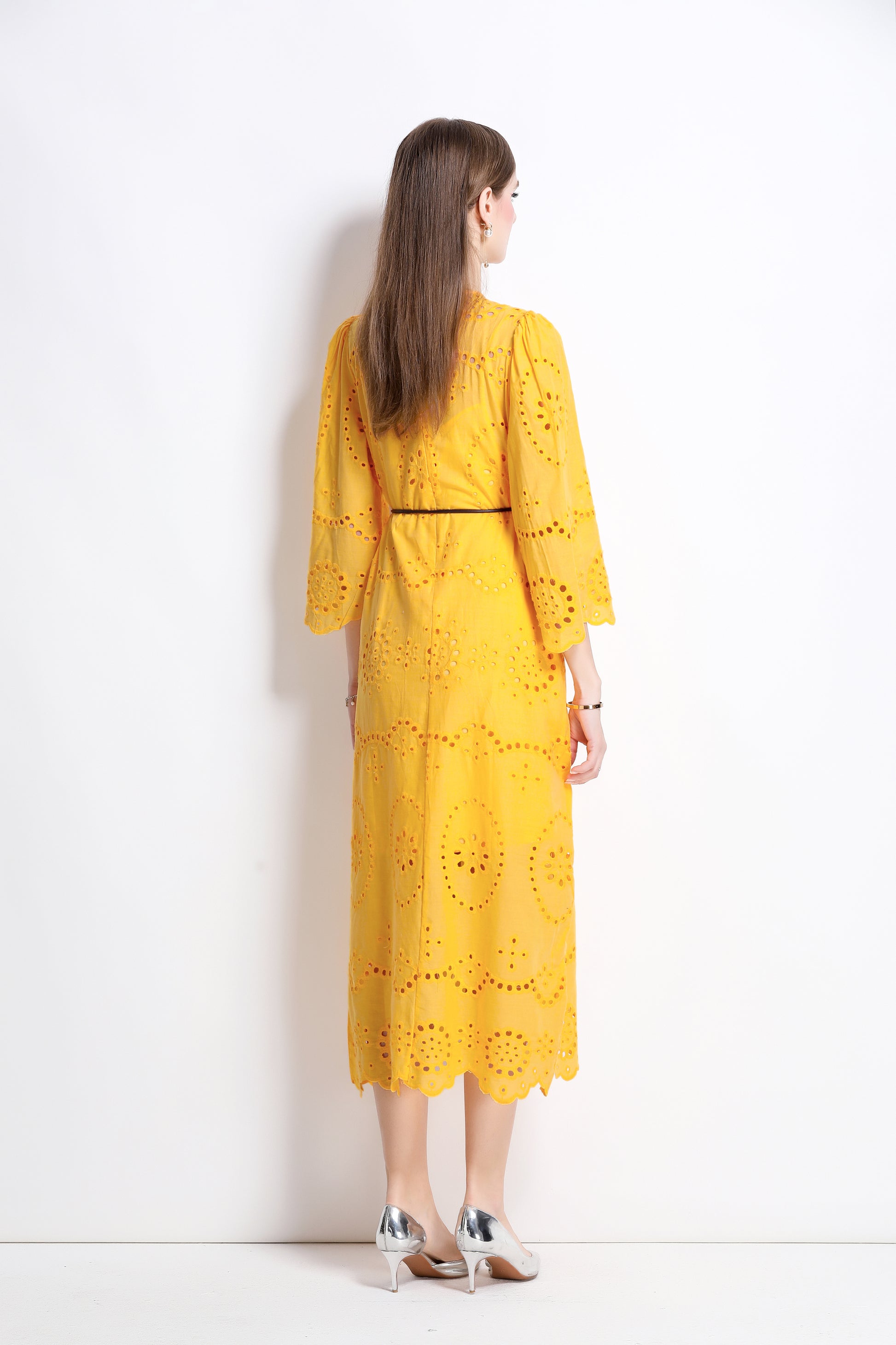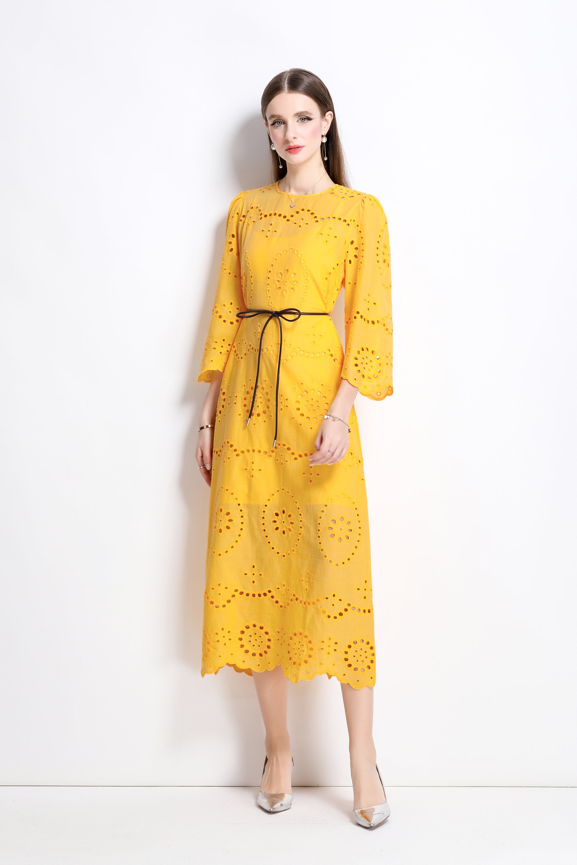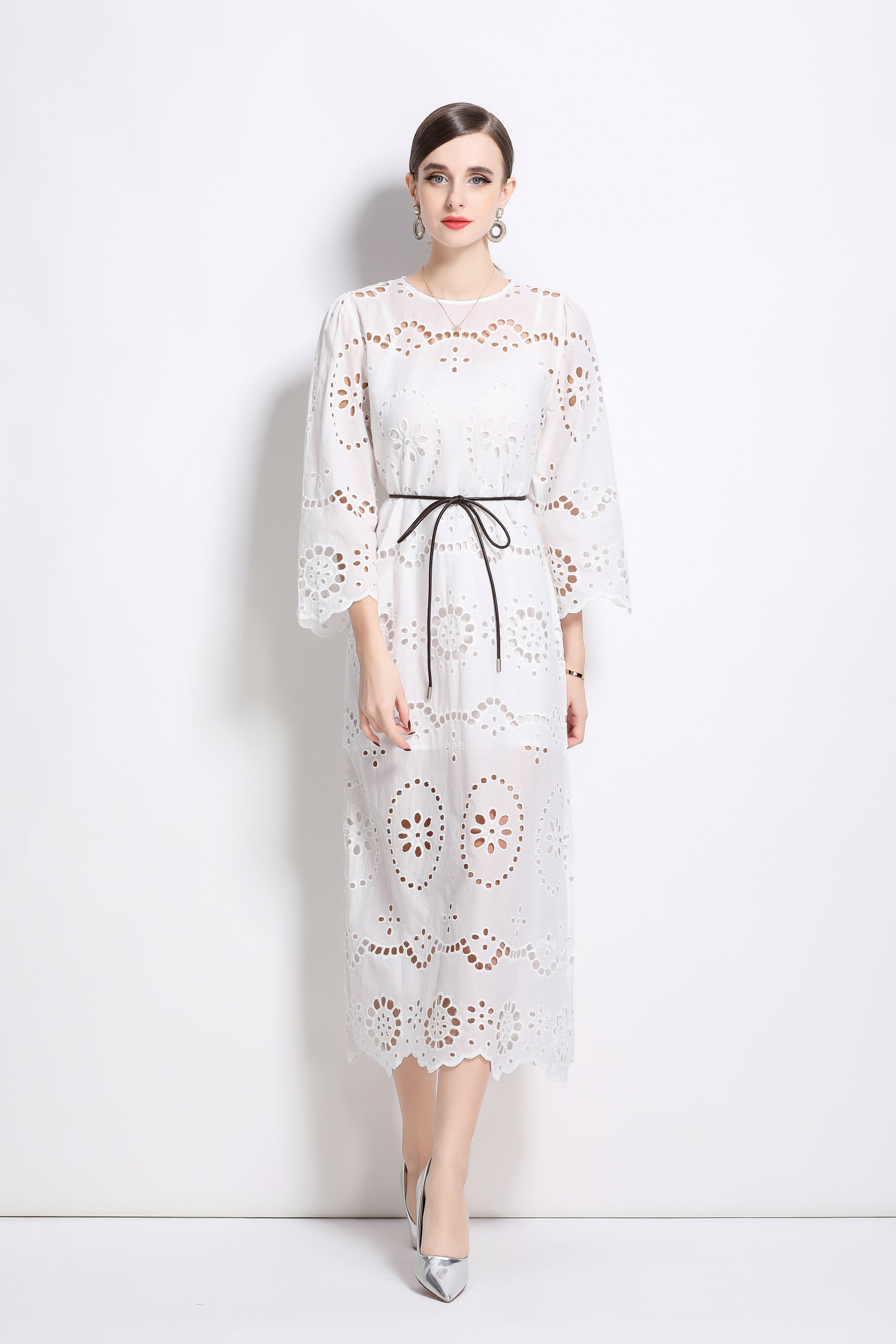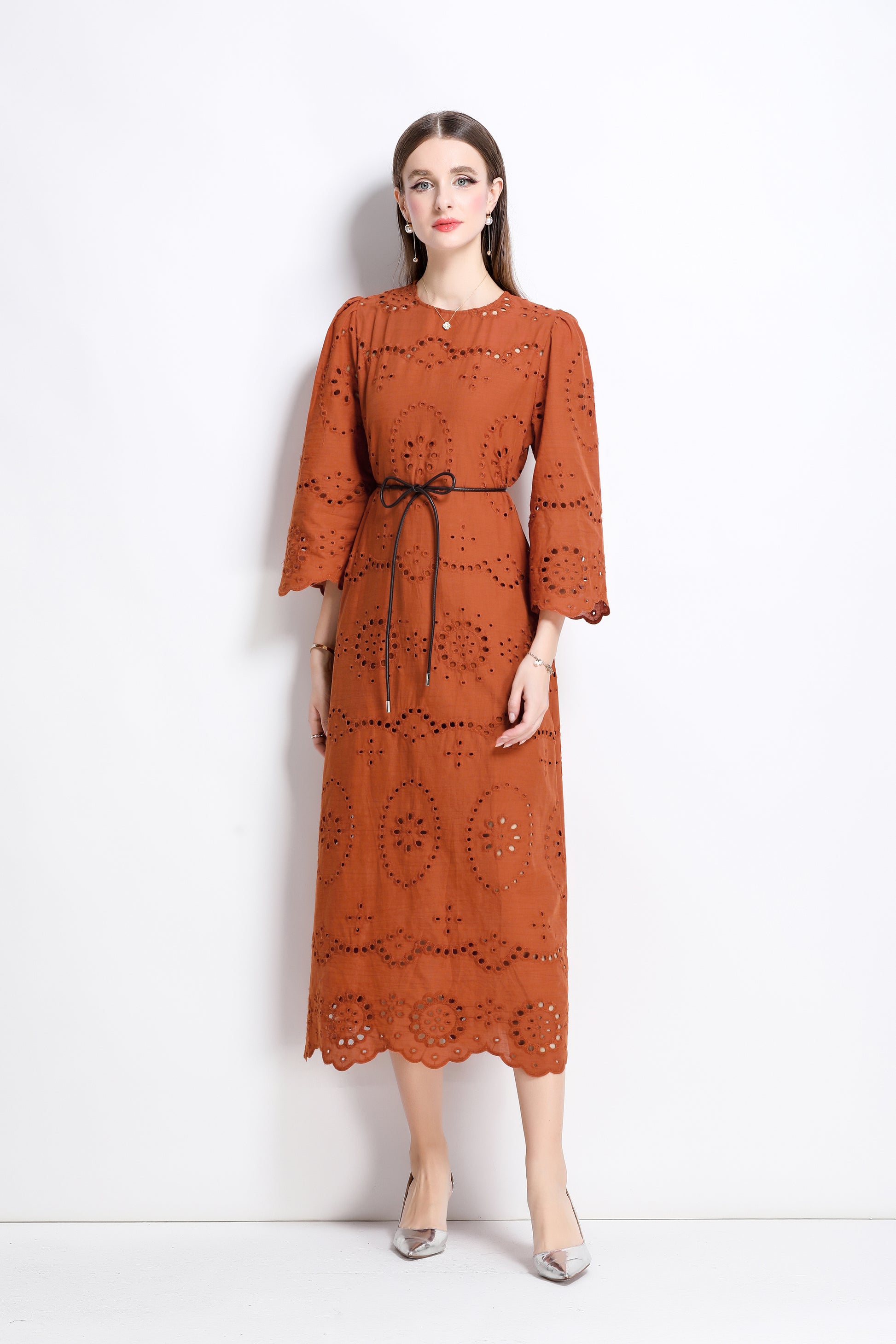 - Features: round neck, cutout pattern, hollow out,3/4 flared sleeves, waist tie, back zipper, inner strap, Midi length.