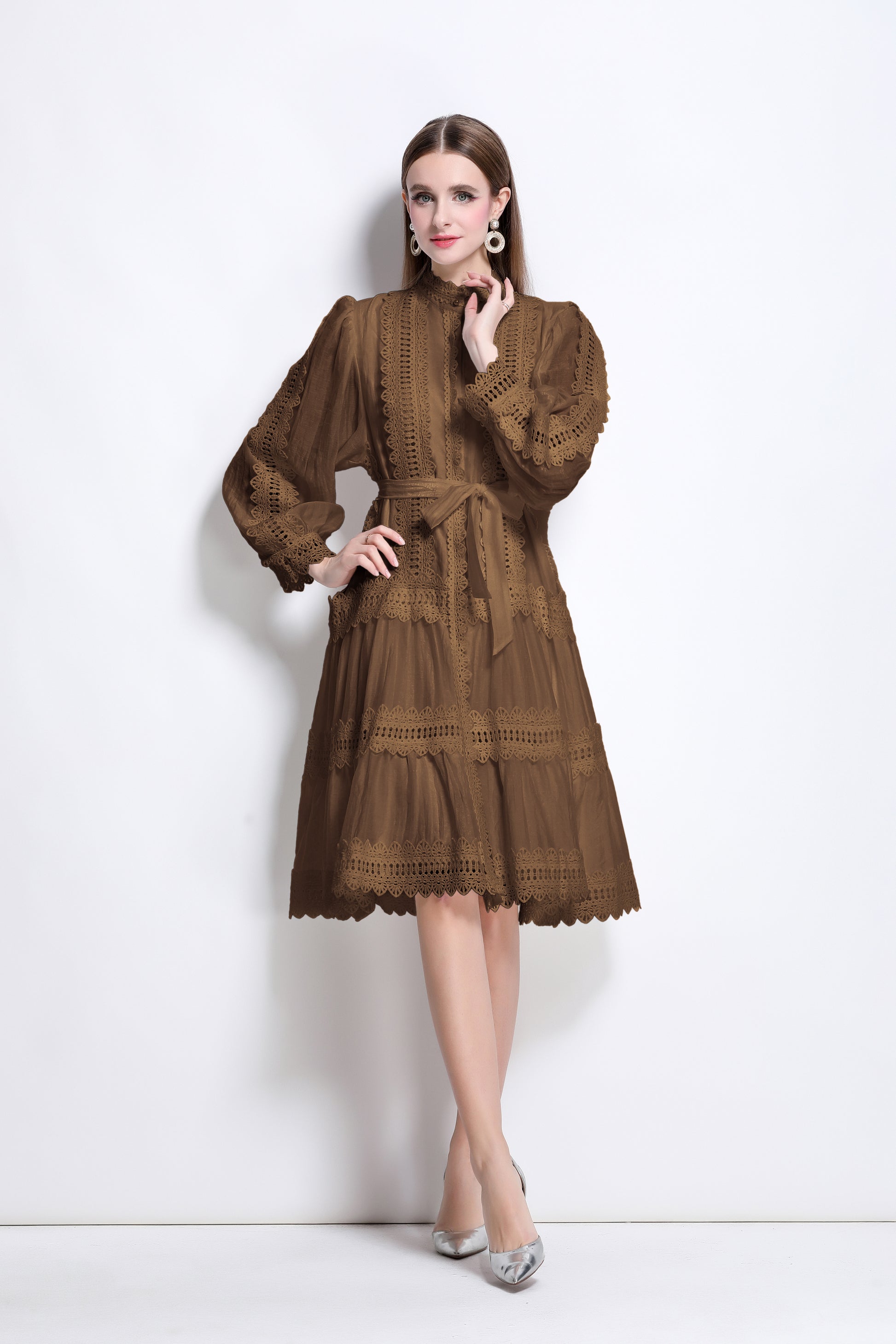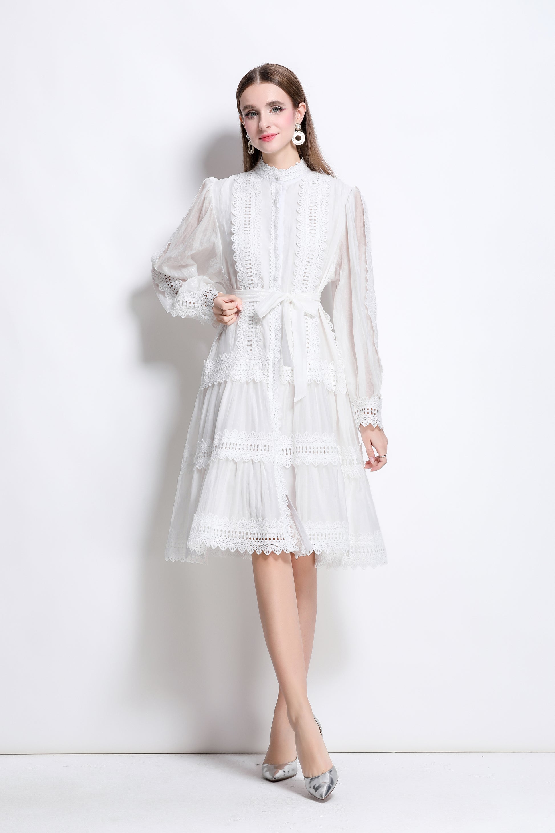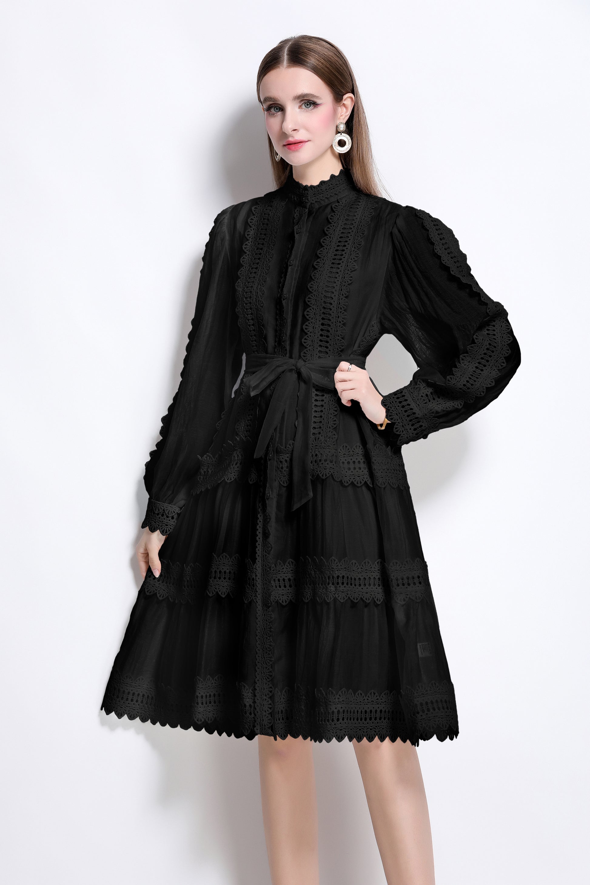 Features: Lace patchwork, hollowed-out design, tie waist, front button, high neck, lantern sleeves, midi dress.