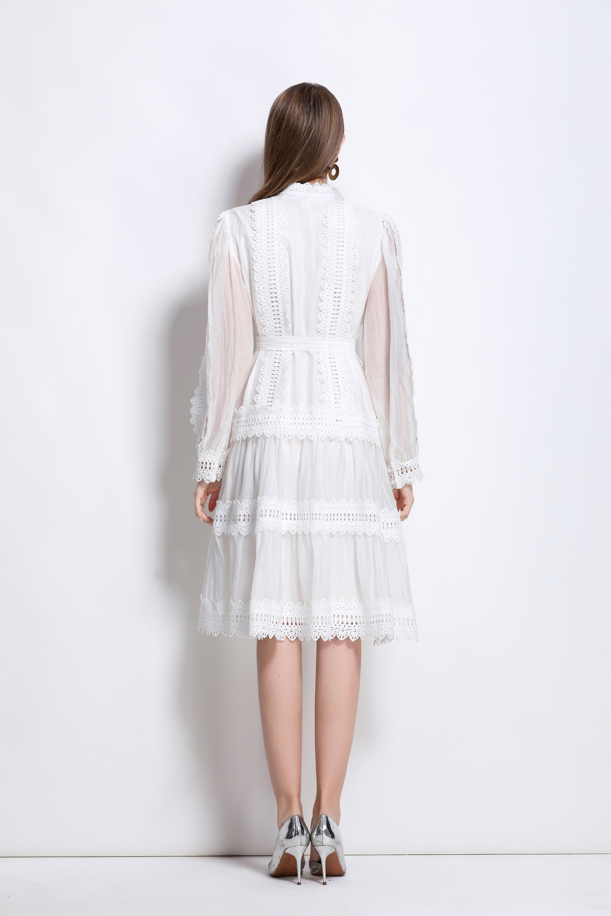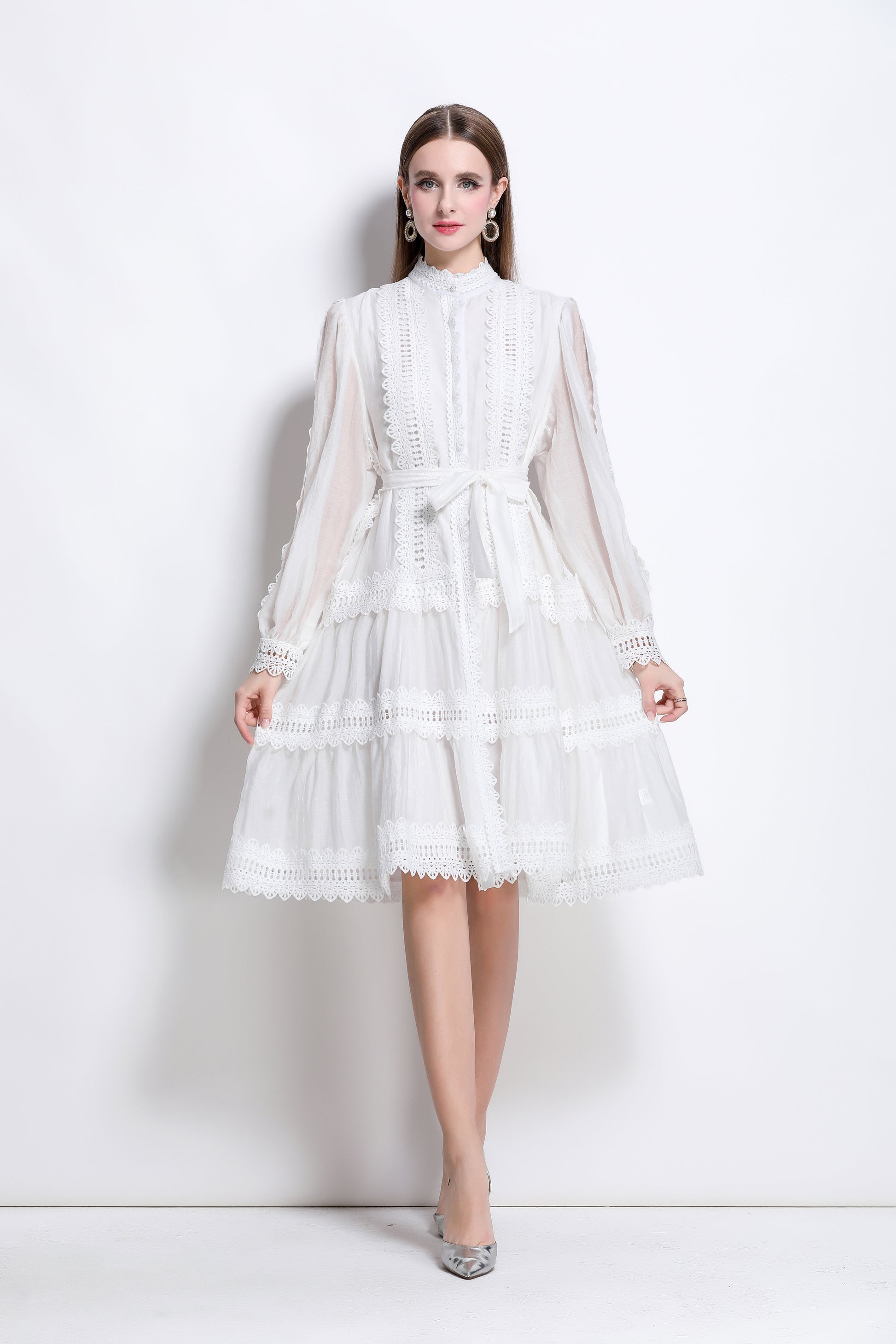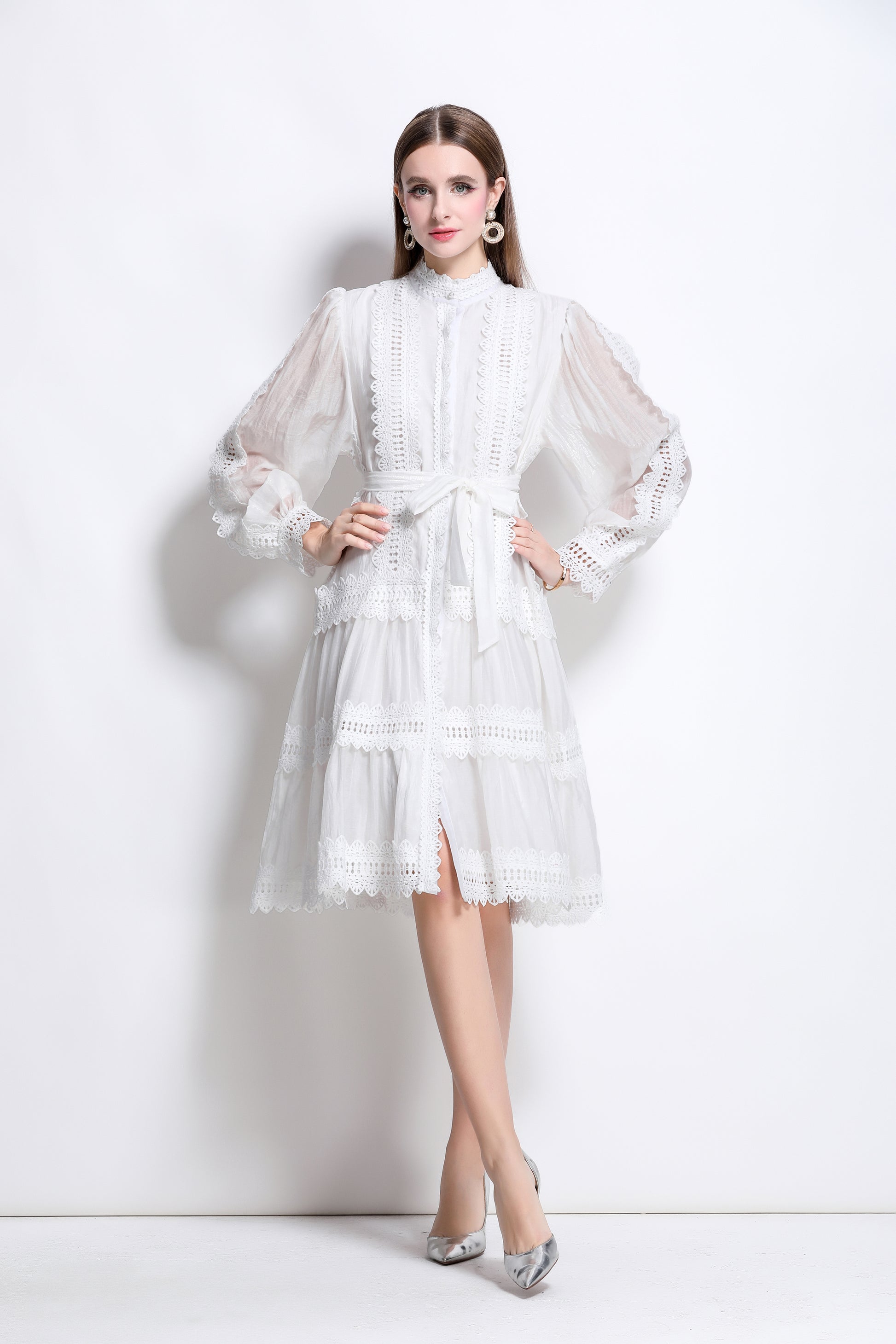 Features: Lace patchwork, hollowed-out design, tie waist, front button, high neck, lantern sleeves, midi dress.