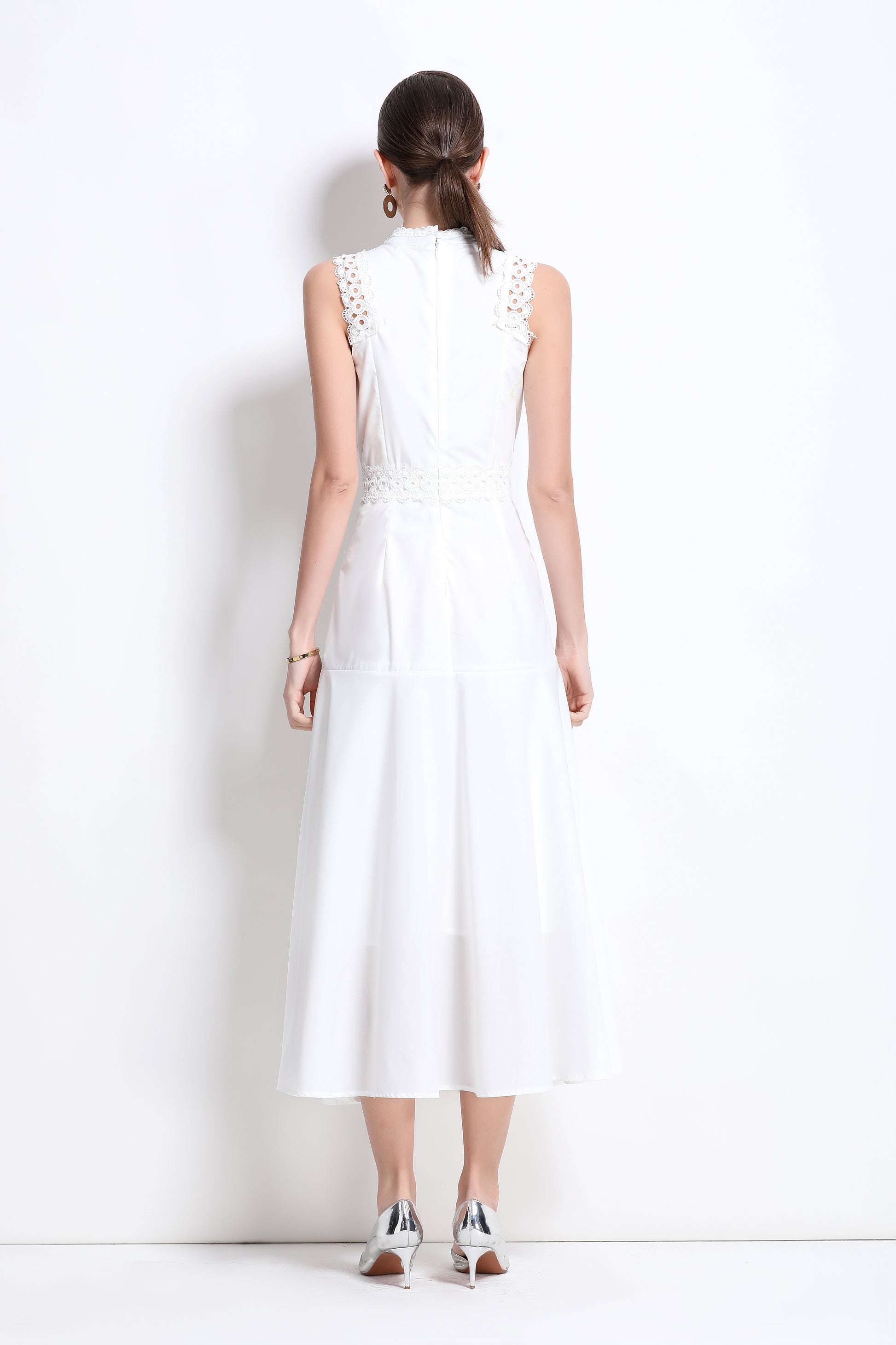 - Features: High neck, cutout, lace trim, sleeveless, cinched waist, back zipper, pleated hem, wedding guest dress, elegant summer dress.