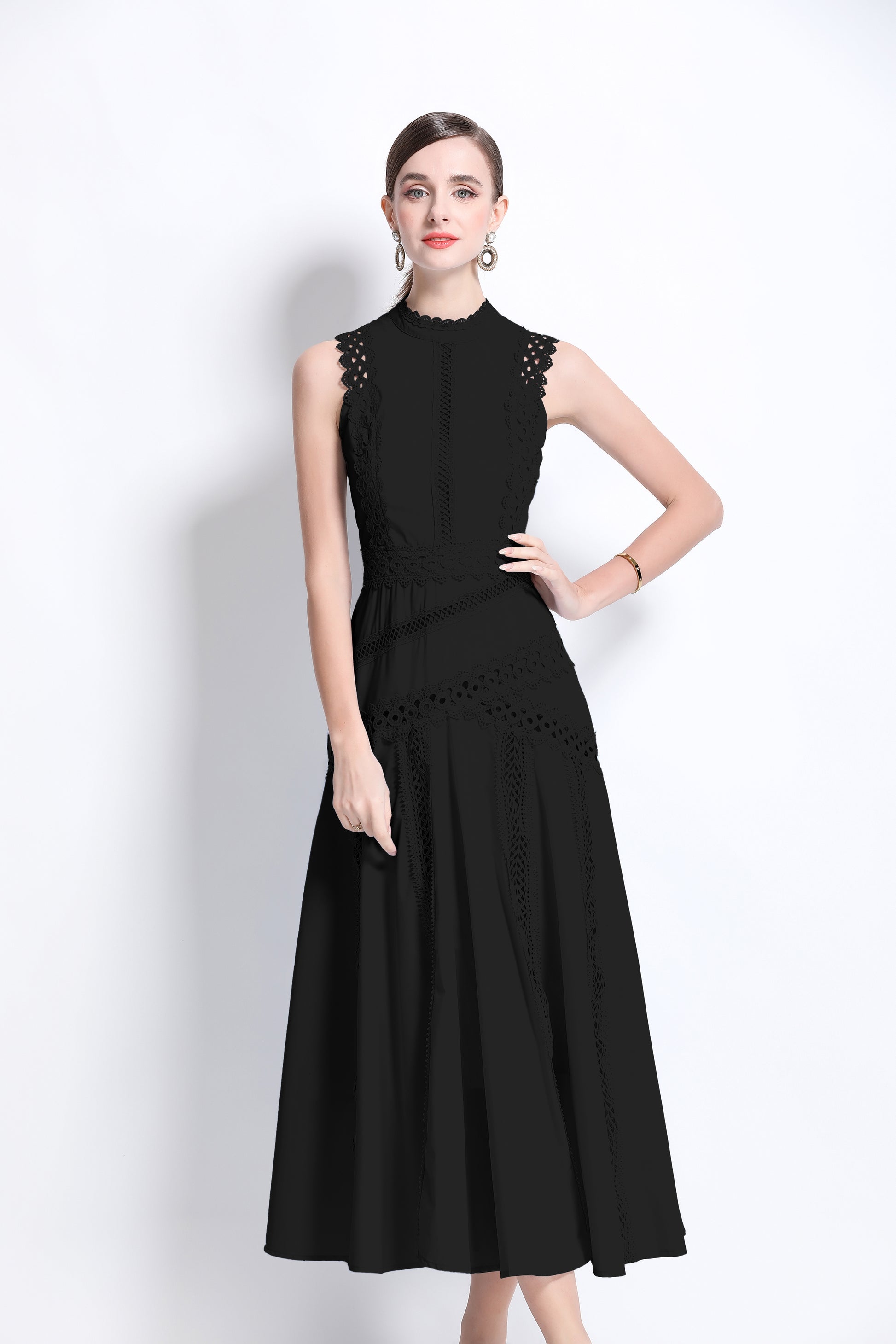 Women's Hollow Lace Mock Neck Sleeveless Maxi Dress