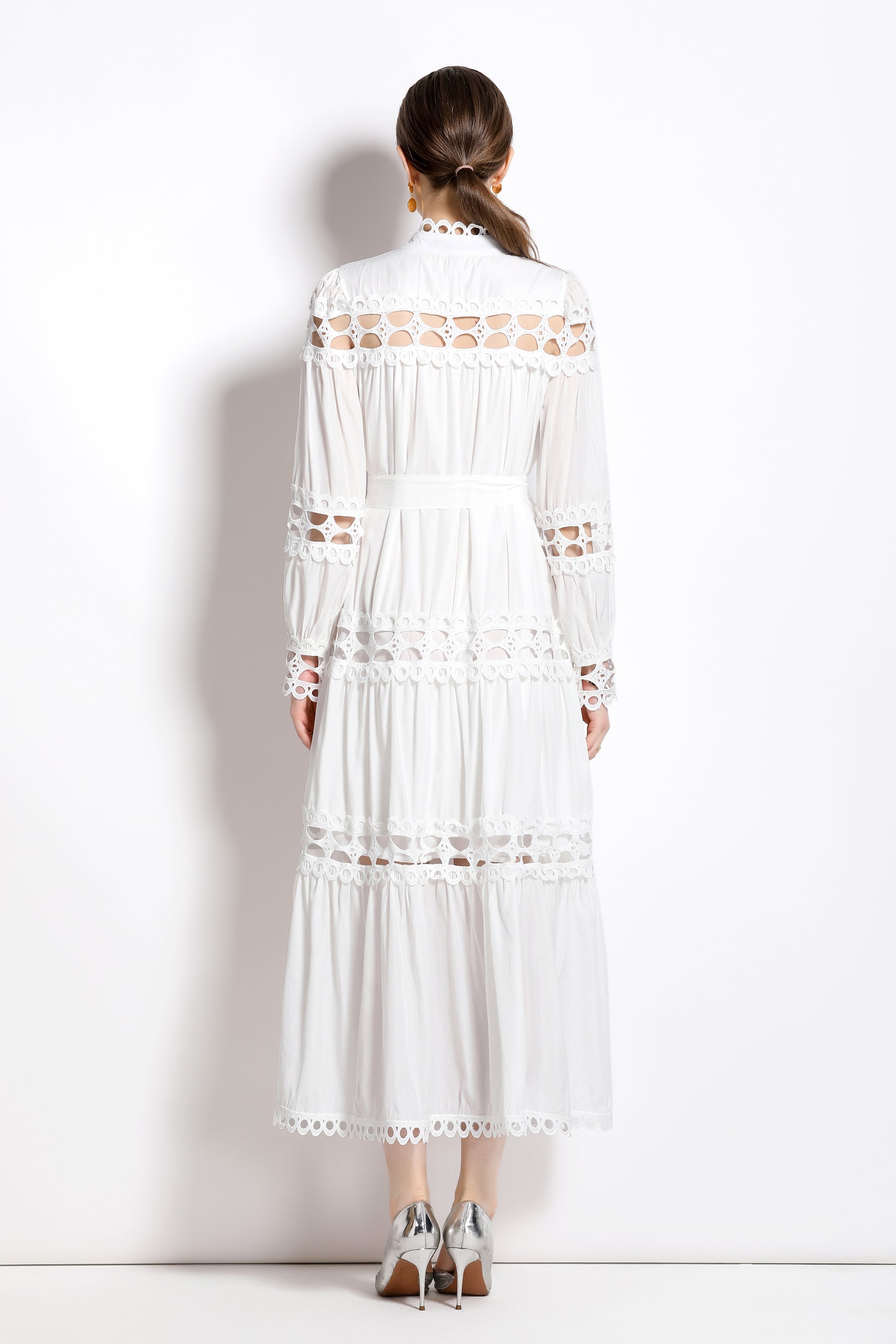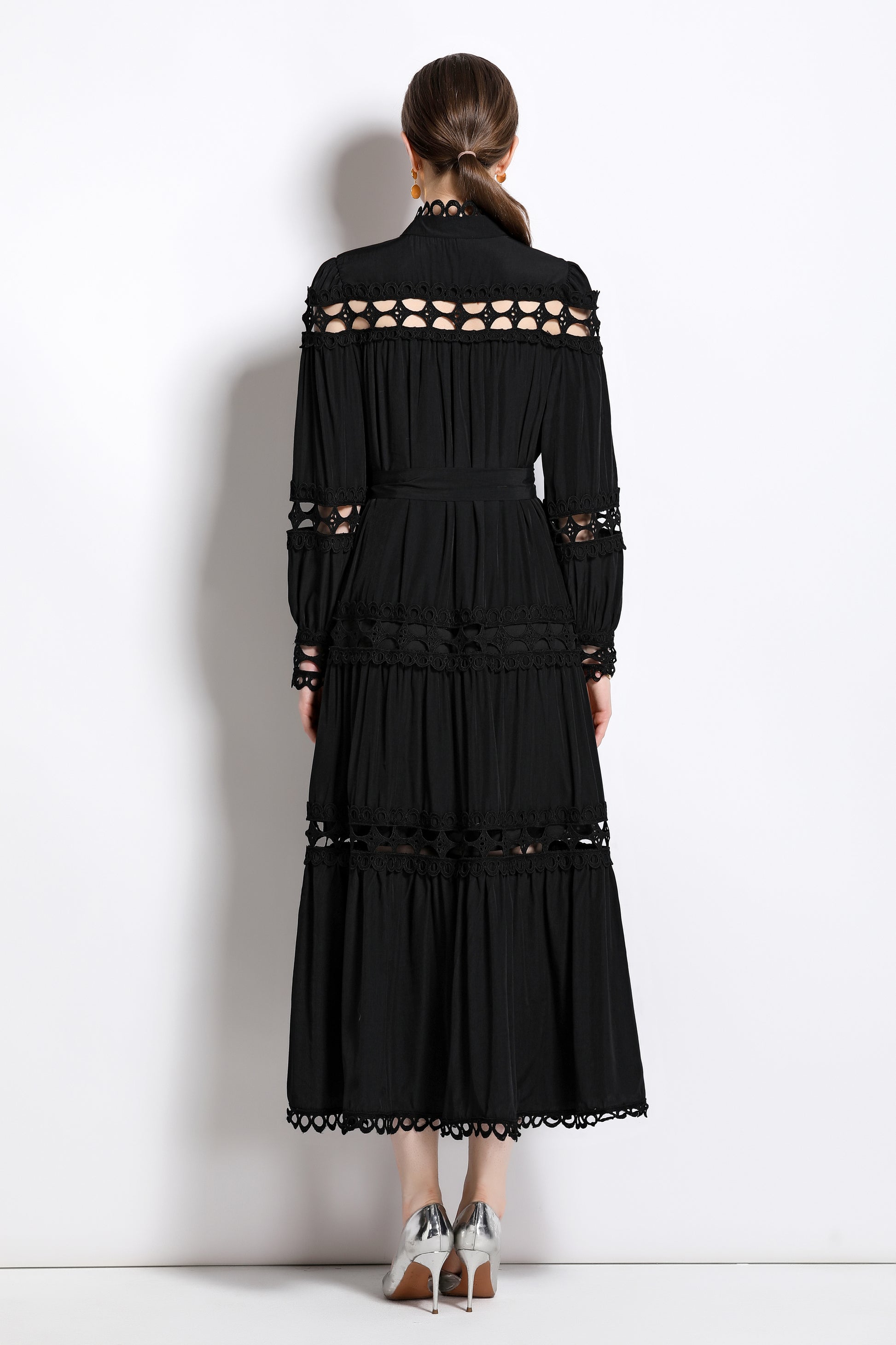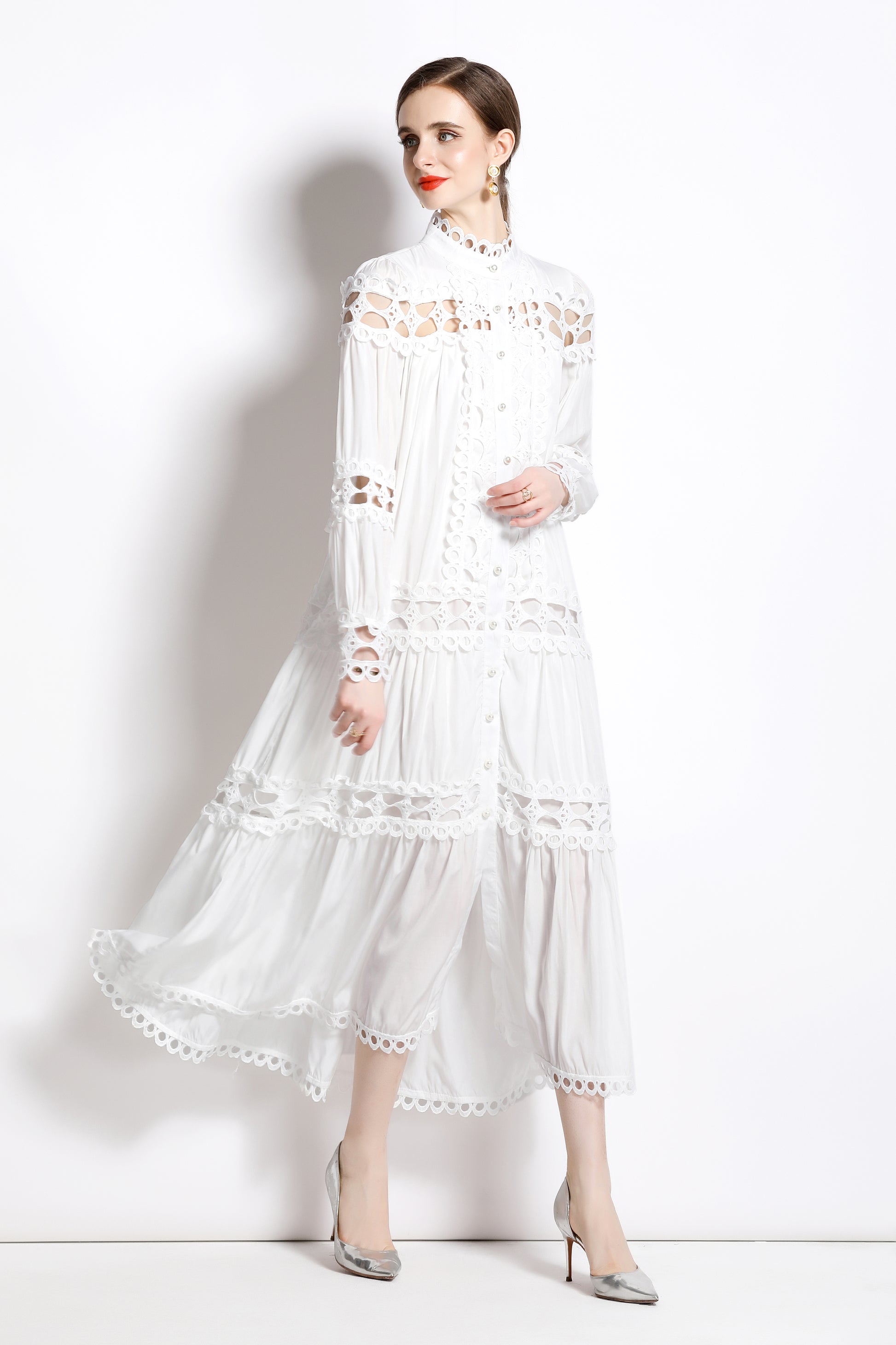 - Features: Hollowed-out design, front buttons, front split, lace patchwork, puffed sleeves, waist strap,soft,breathable,maxi dress.