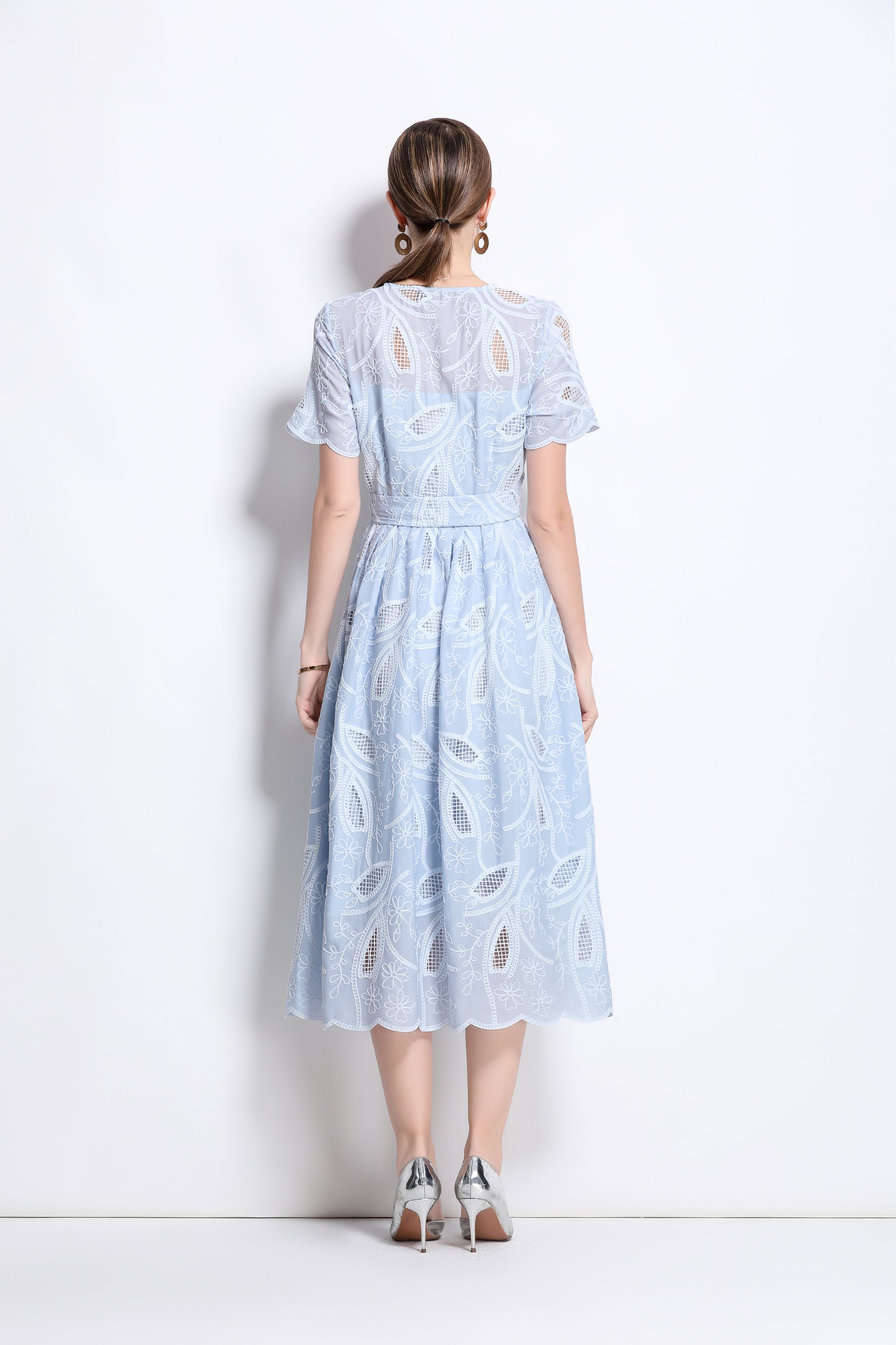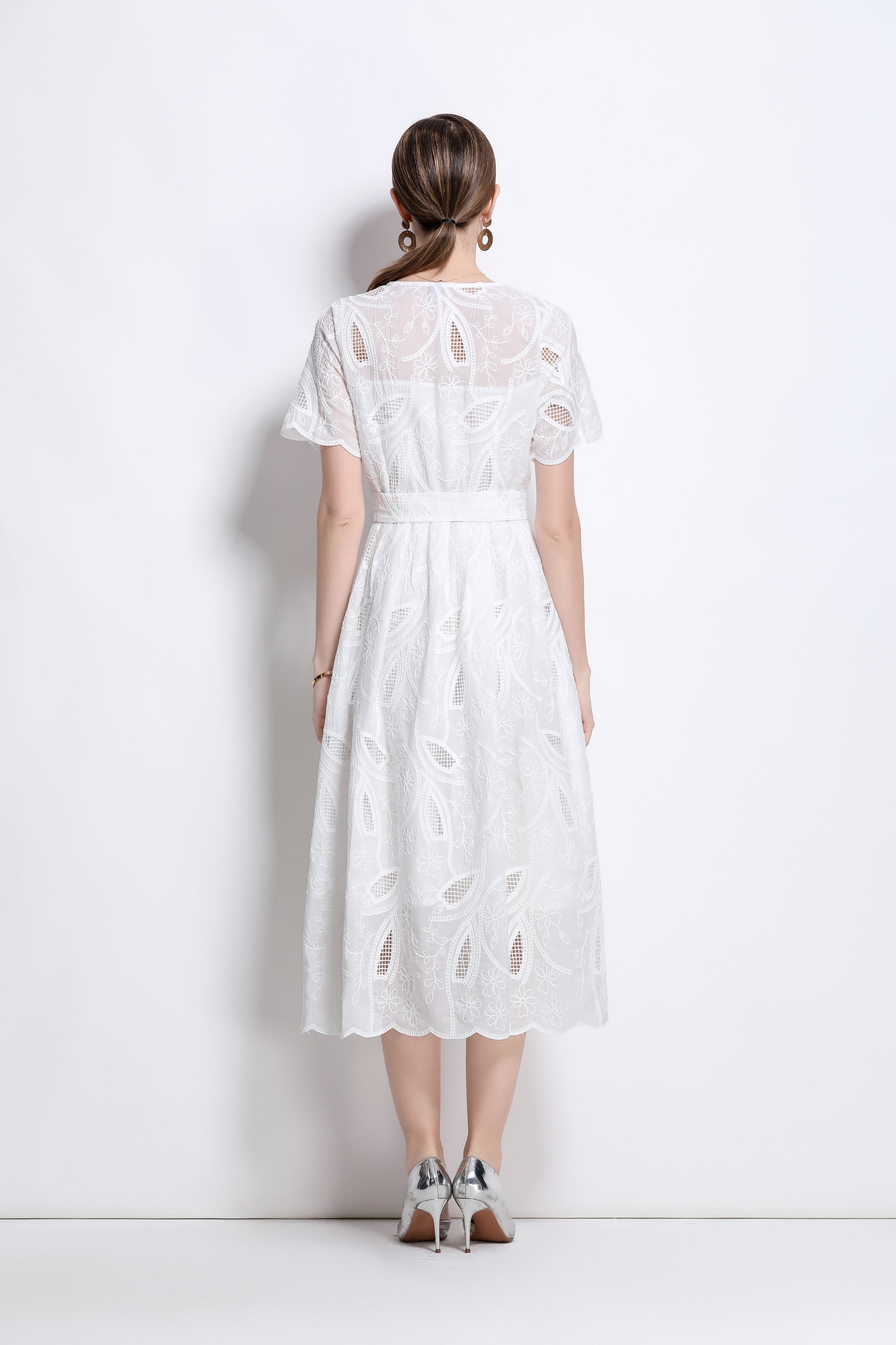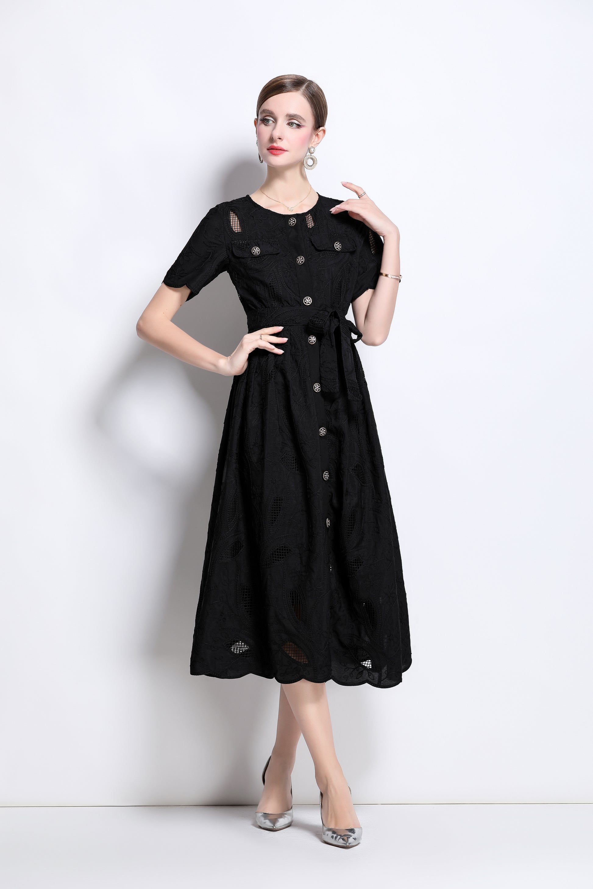 - Features:Hollow out,Roune neck, Short sleeves,Belt,button up,Embroidered,Floral Lace fabric,A-line,Fit and flare design Midi dress