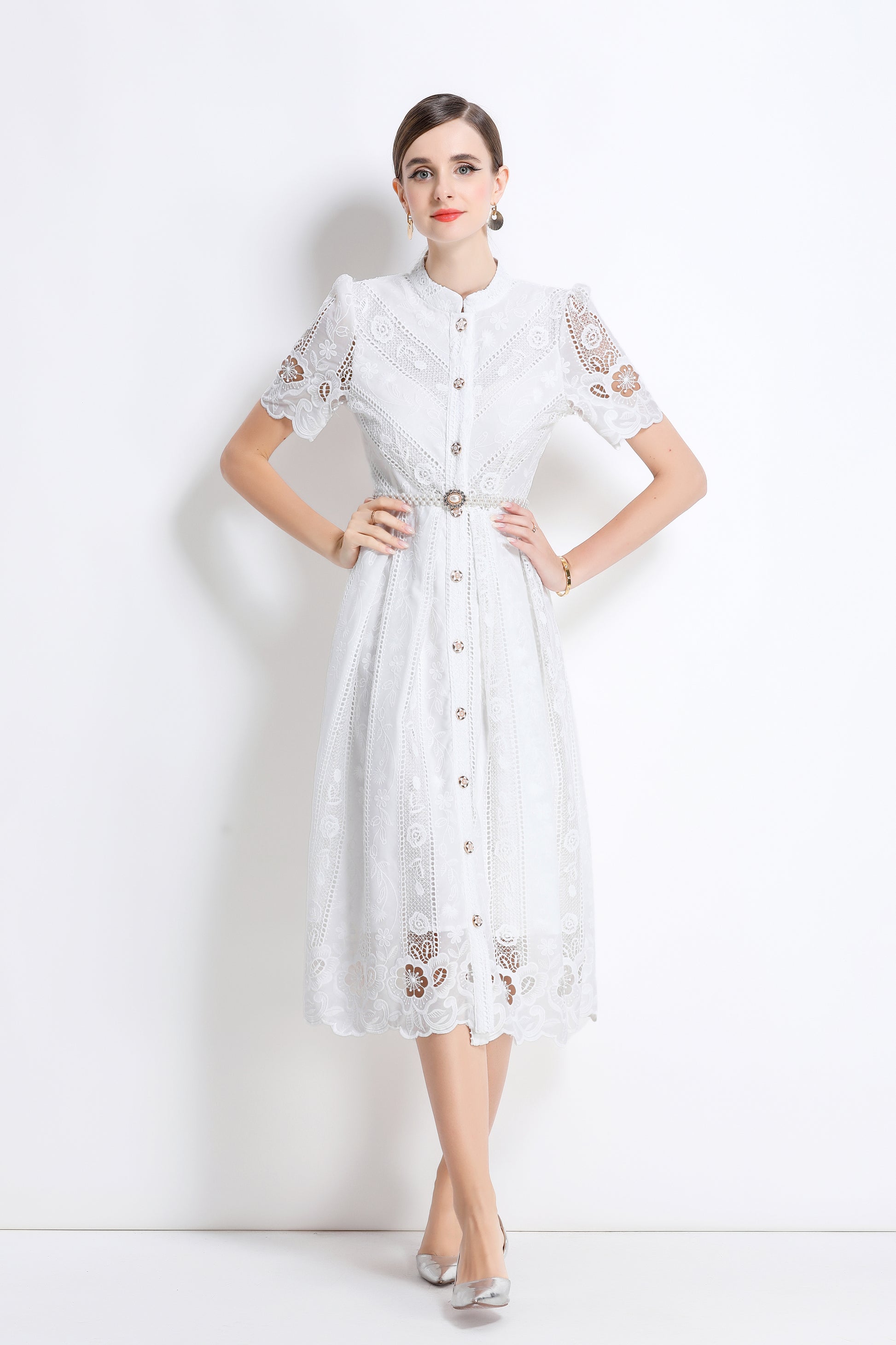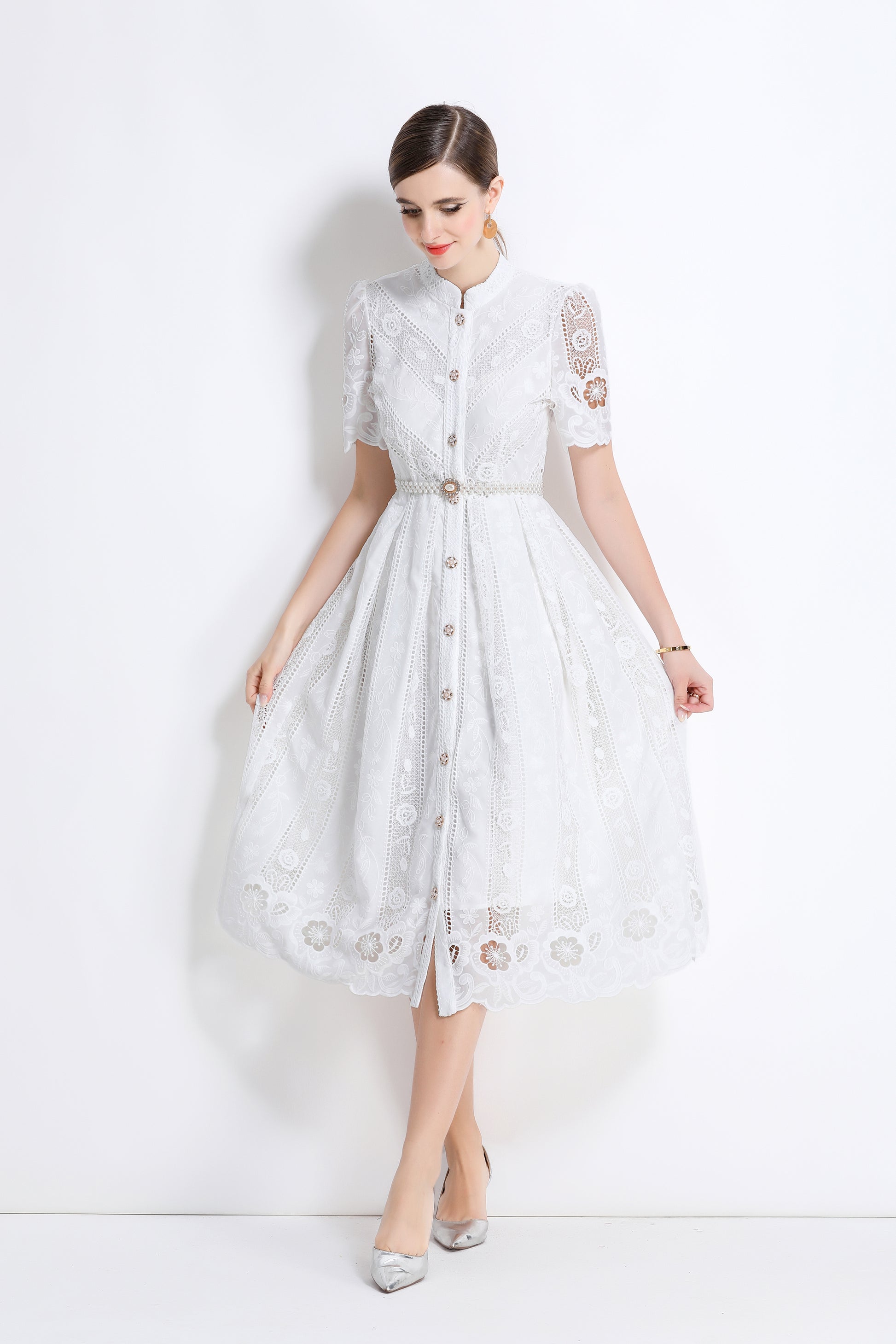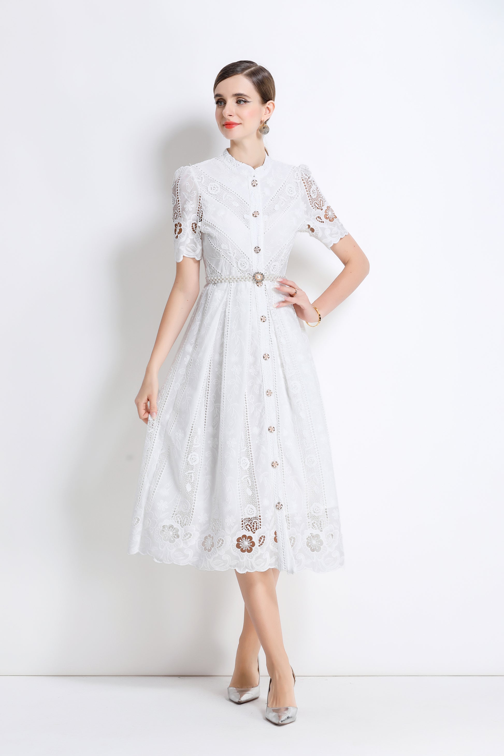 - Features: Short sleeves, Hollow Out, lace, stand-up collar, front buttons, pearl belt, summer hollow-out dress.