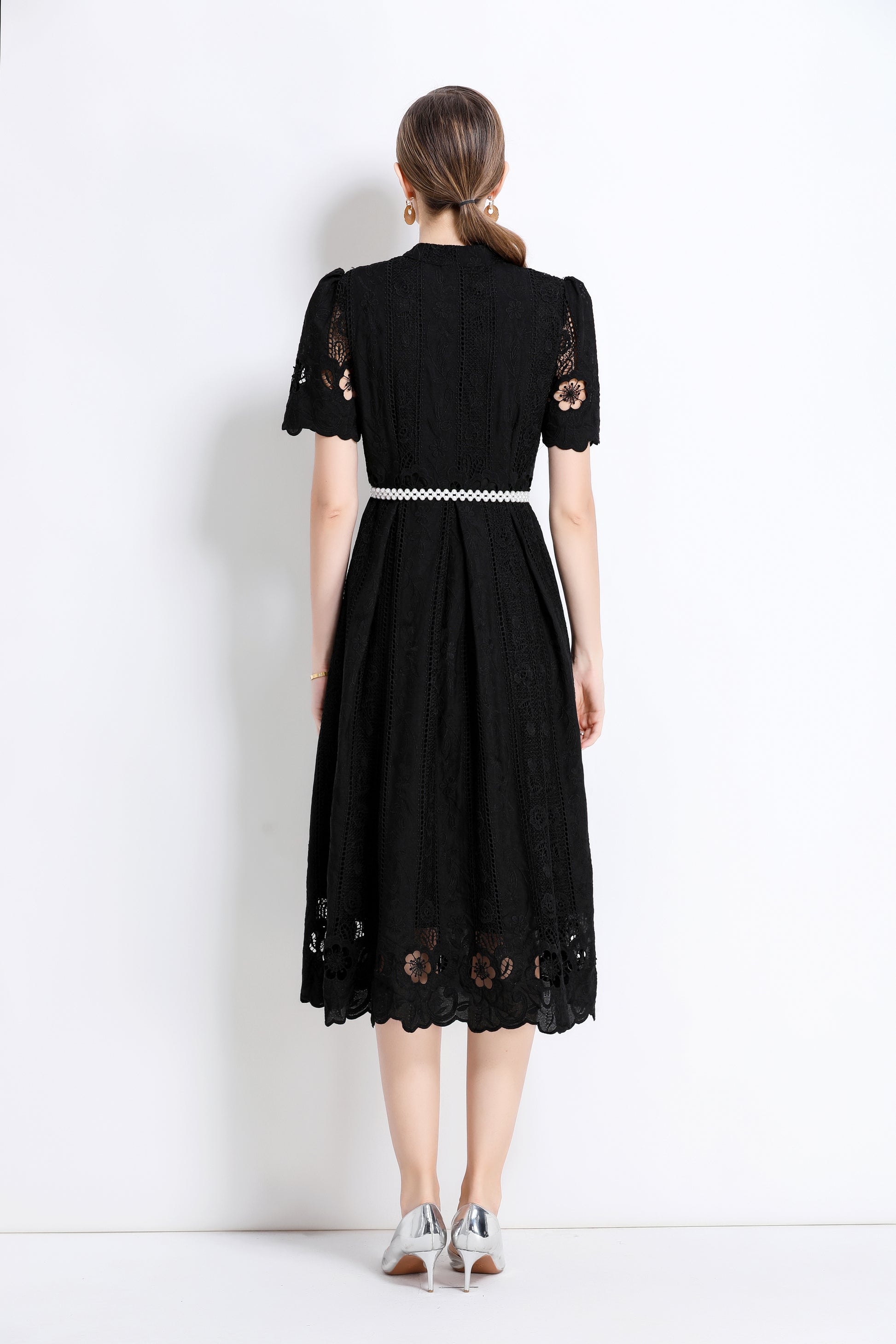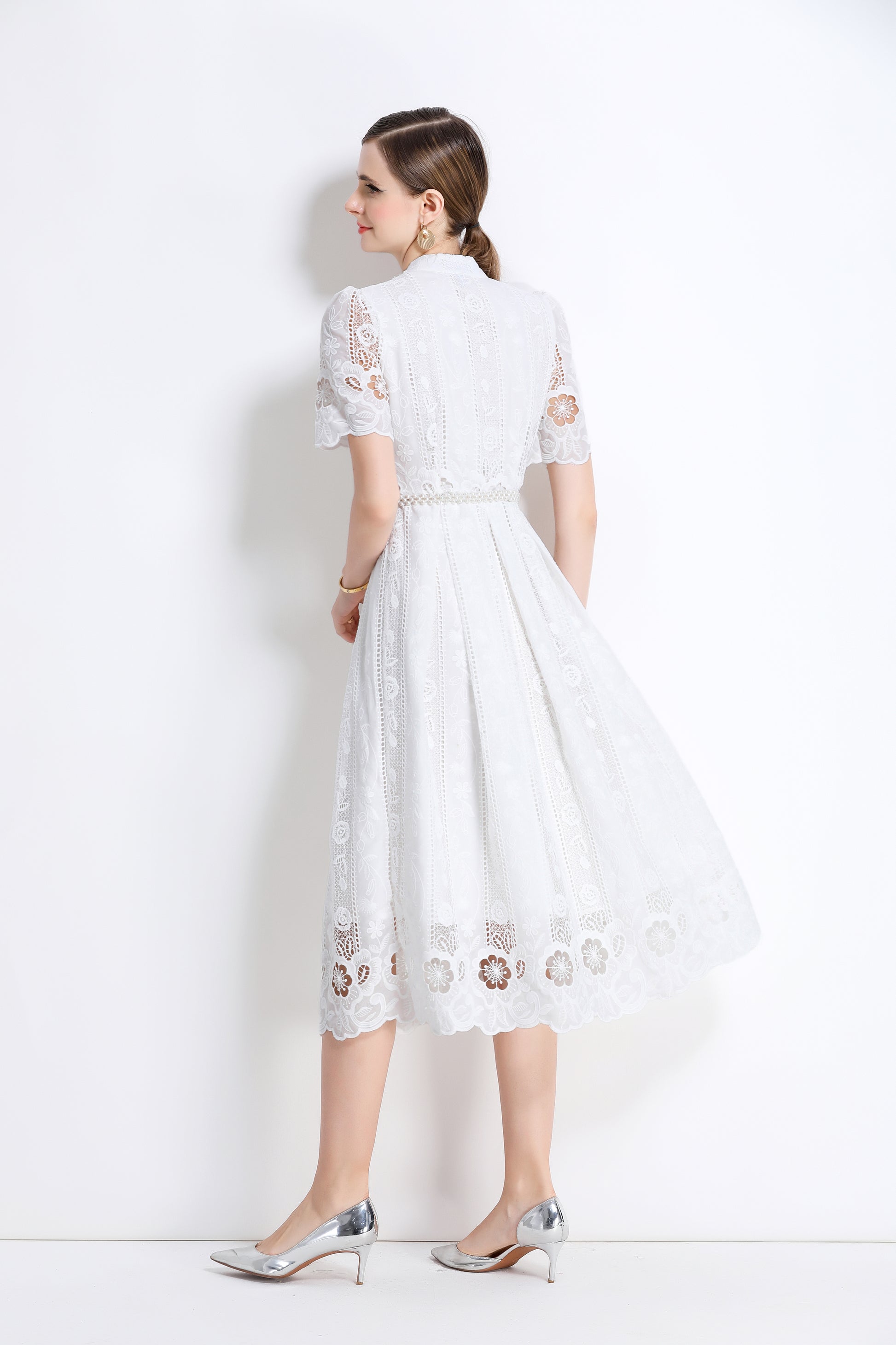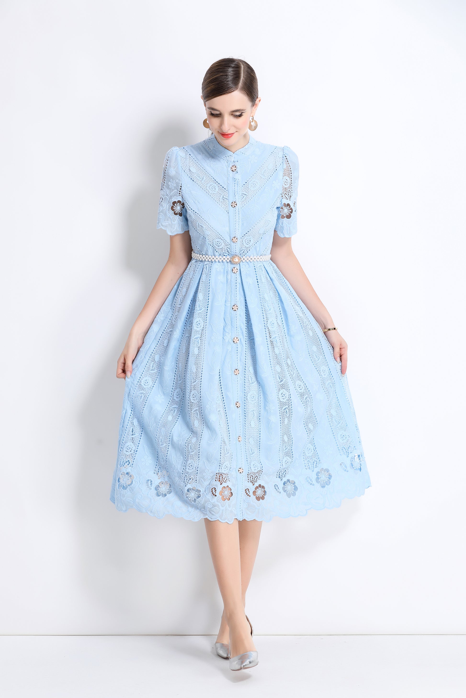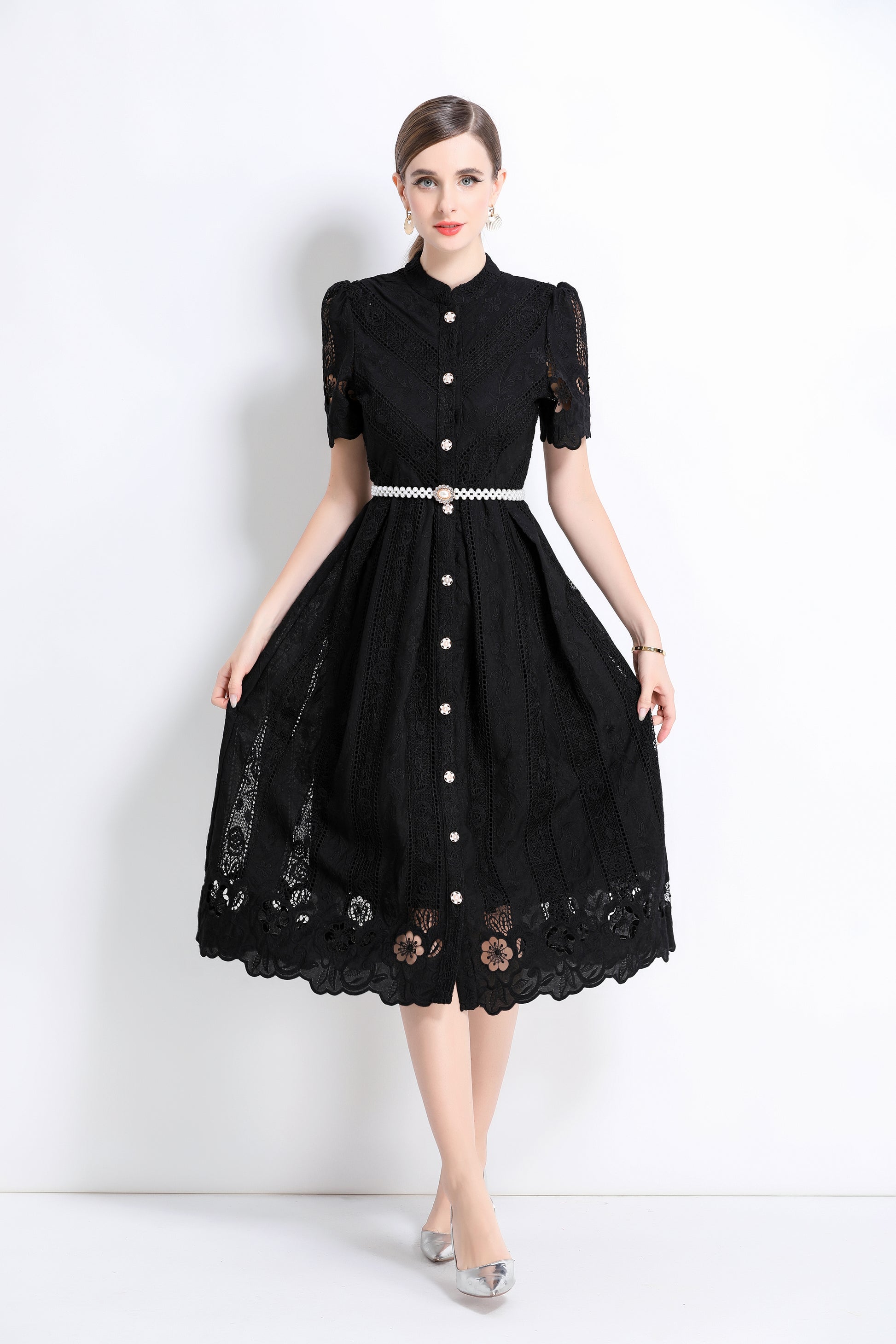 - Features: Short sleeves, Hollow Out, lace, stand-up collar, front buttons, pearl belt, summer hollow-out dress.