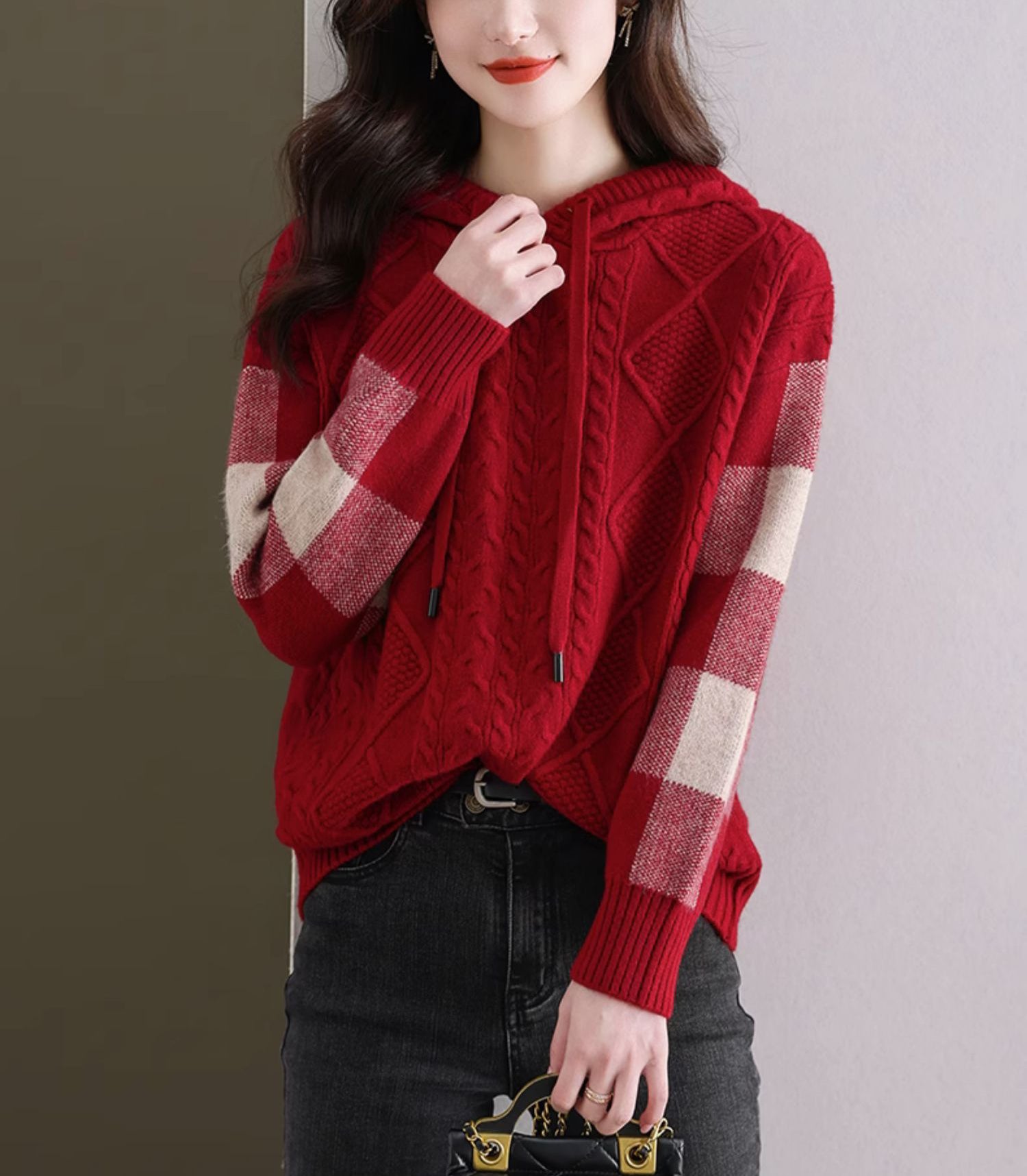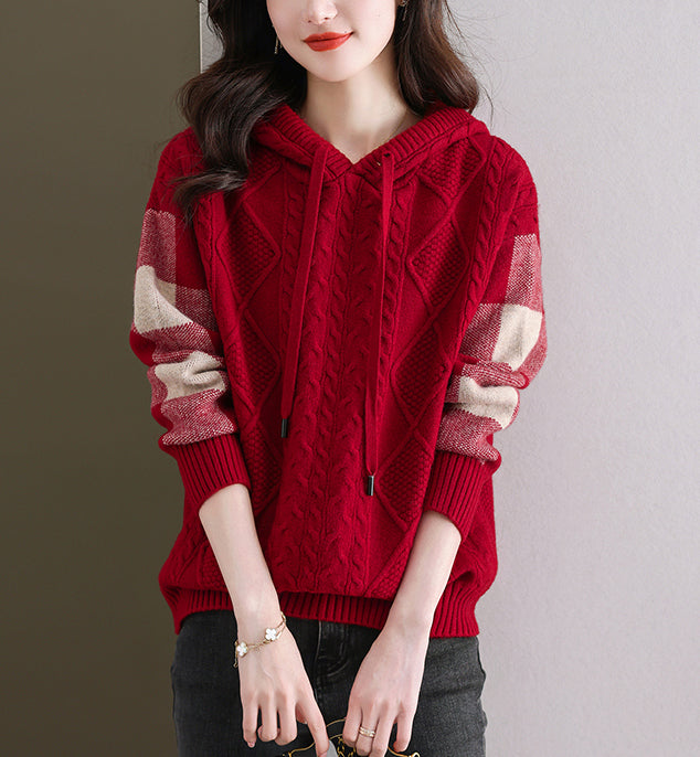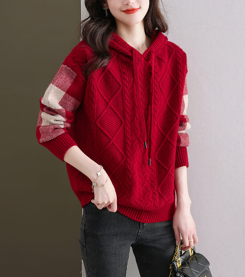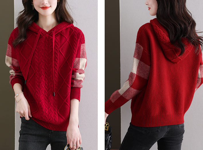 - Features: Knitted threaded top, patchwork checkered woolen hoodie, pullover V-neck hoodie, autumn and winter hoodie, casual knitted sweater.