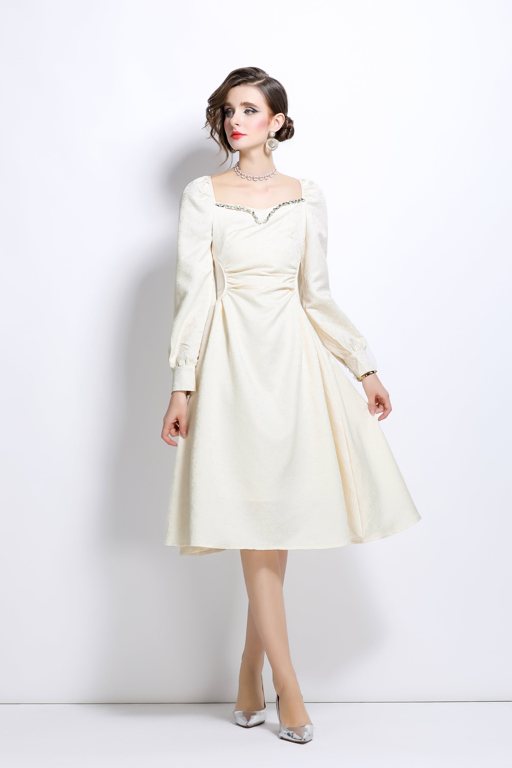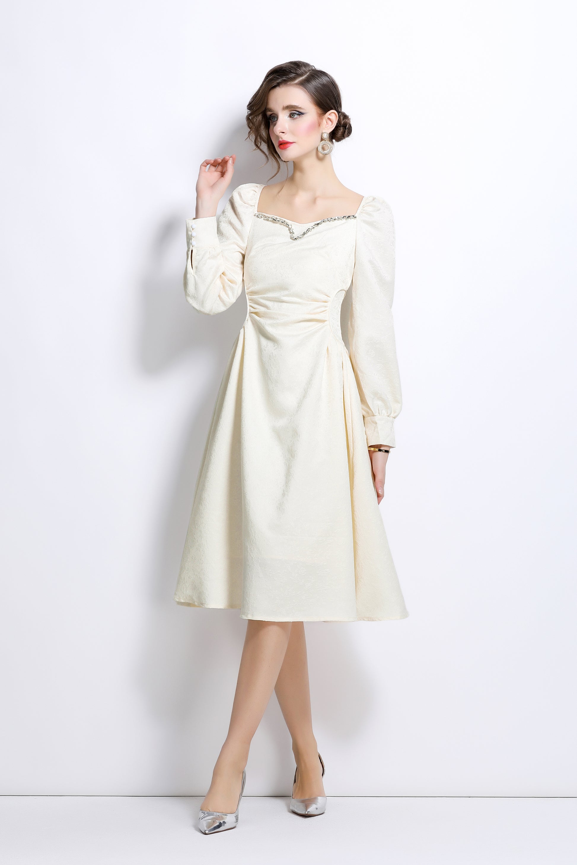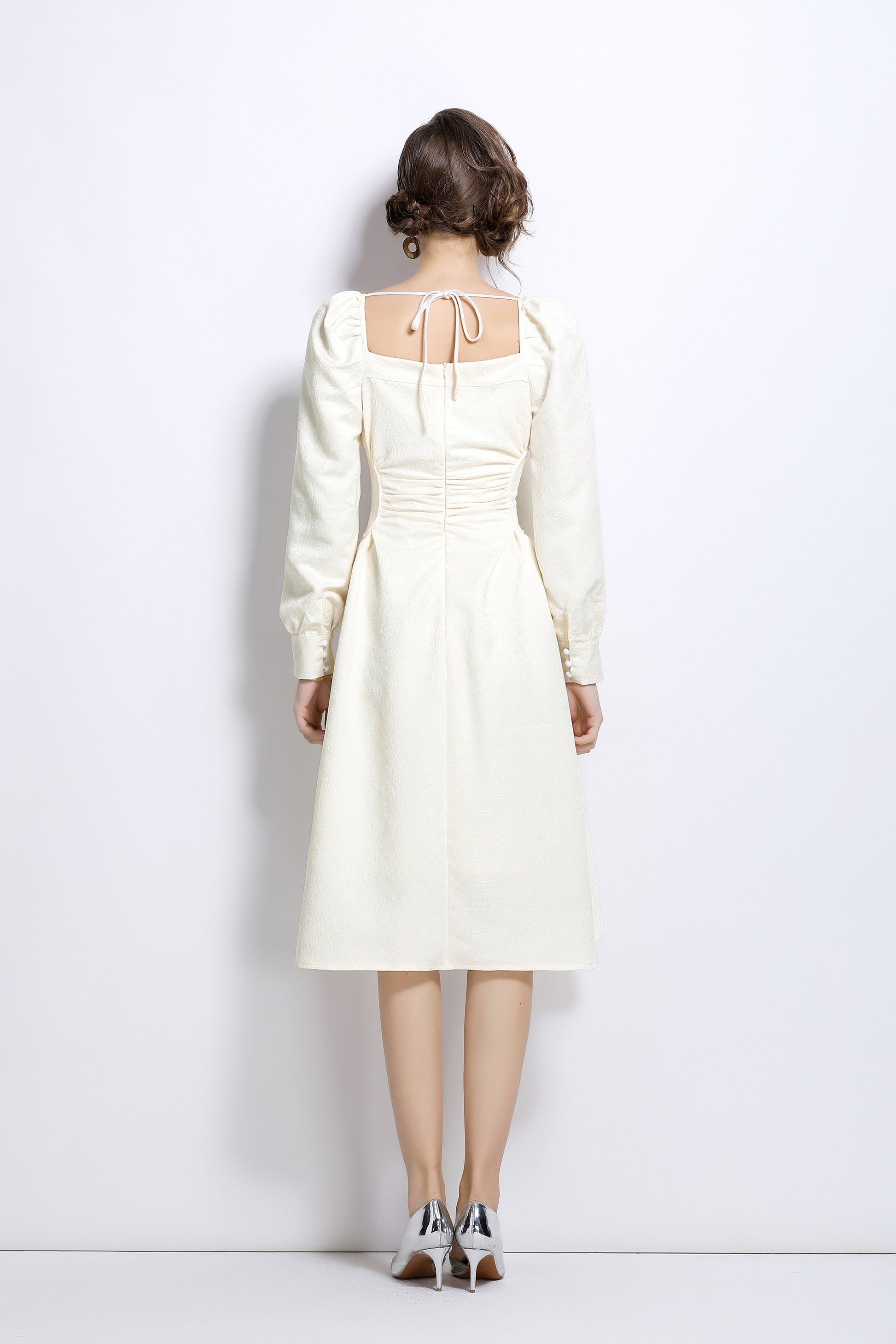 Women's jacquard fabric puffy sleeve pleated midi dress