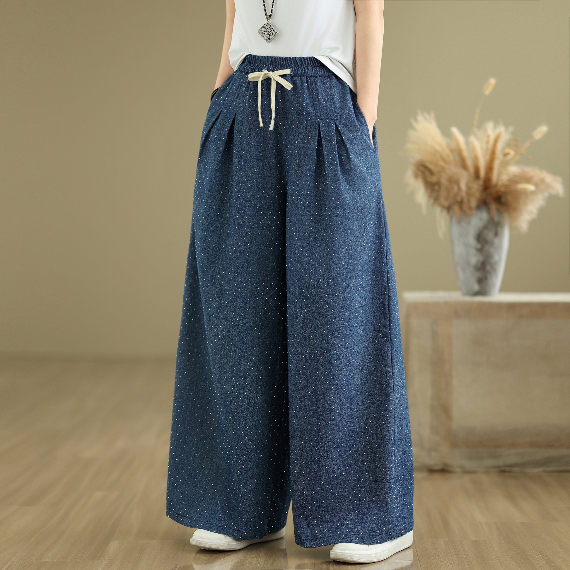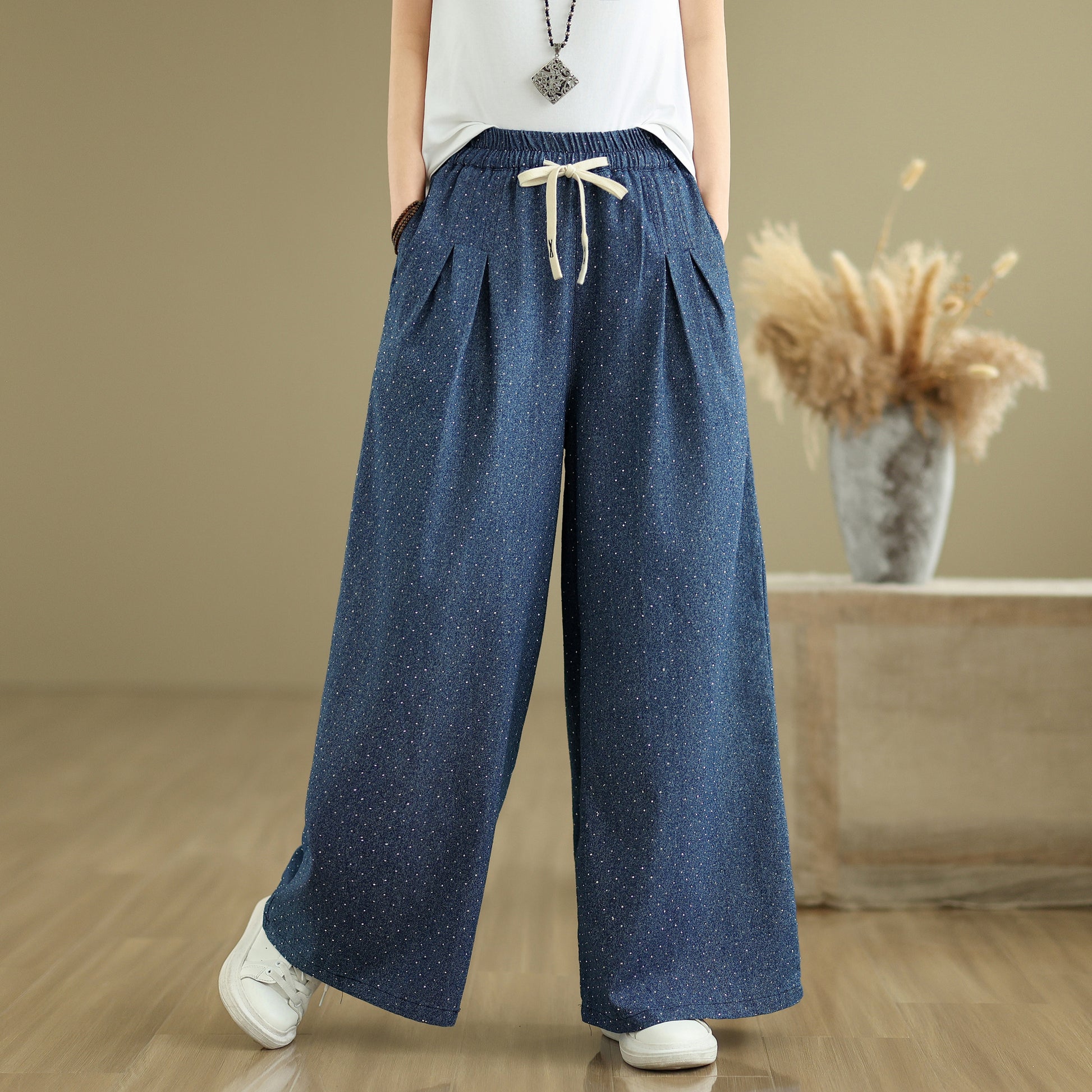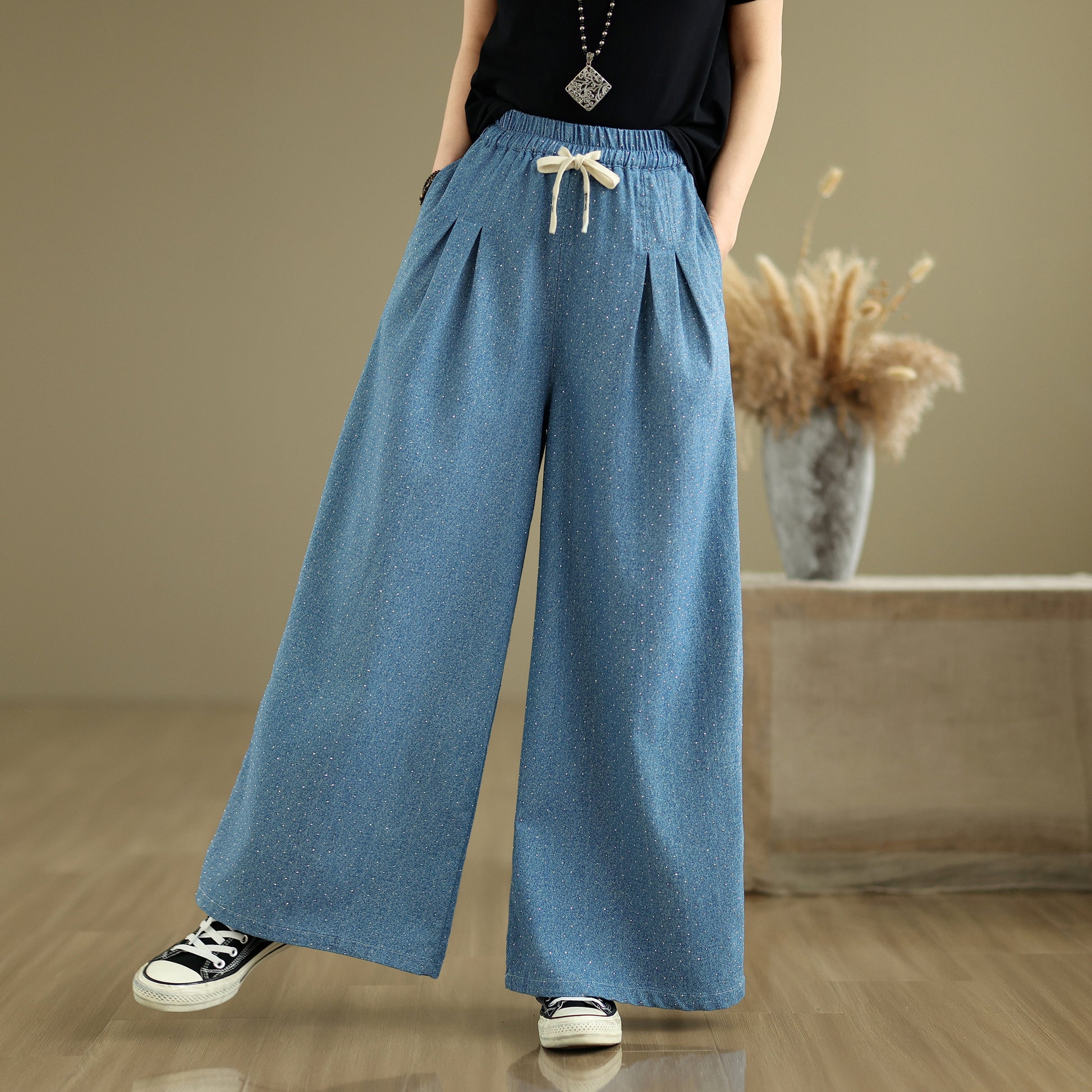 - Features: Fashion,trendy ,Casual loose,Elastic Waist Drawstring, denim, Wide Leg, Classic denim, Double pockets. If you love wide-leg baggy jeans, this is definitely the best choice for you.