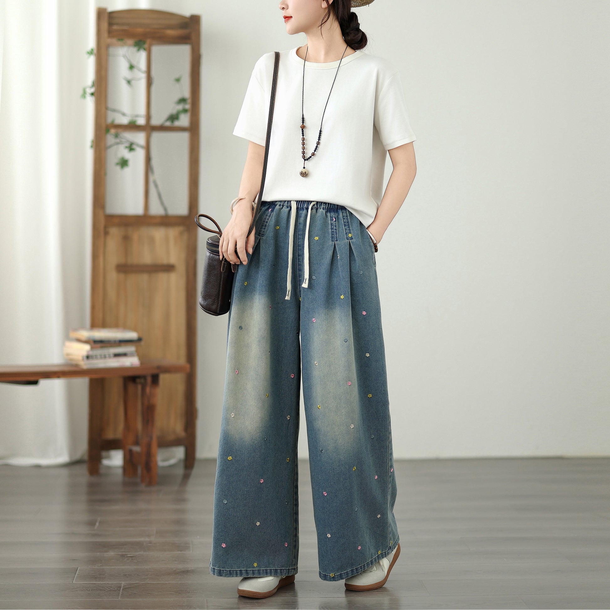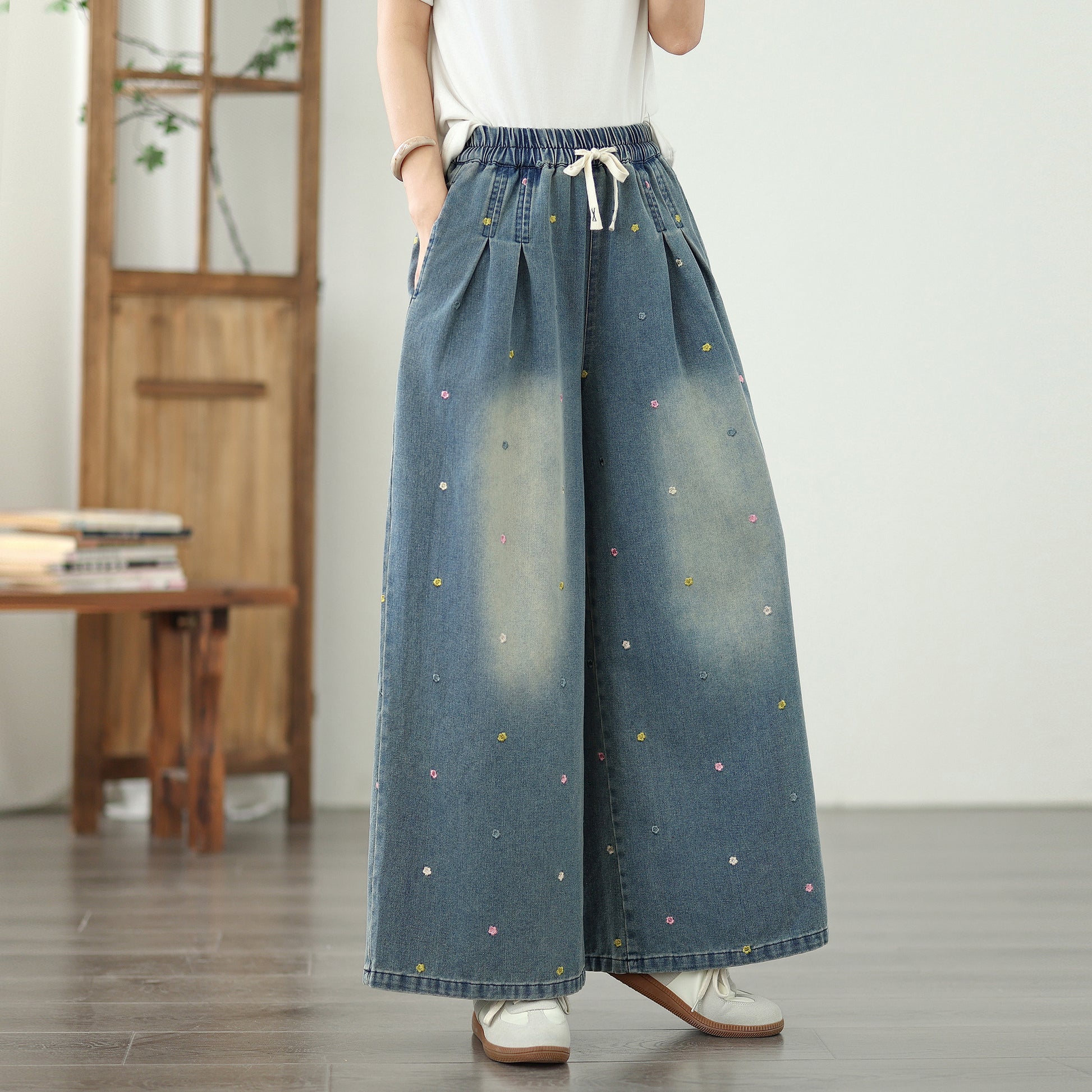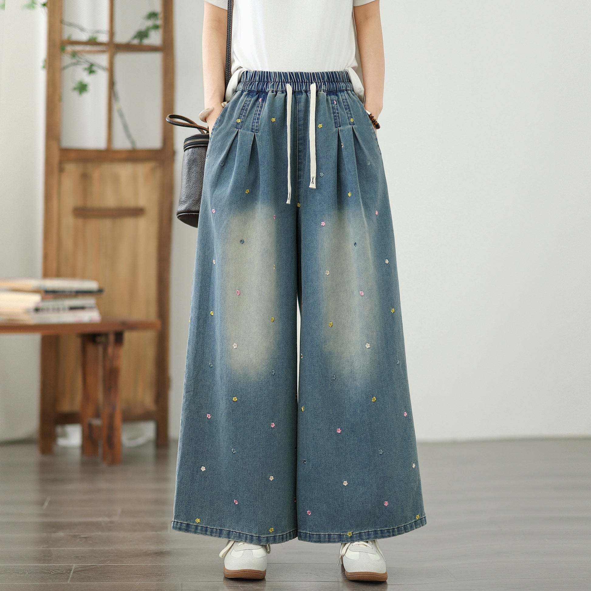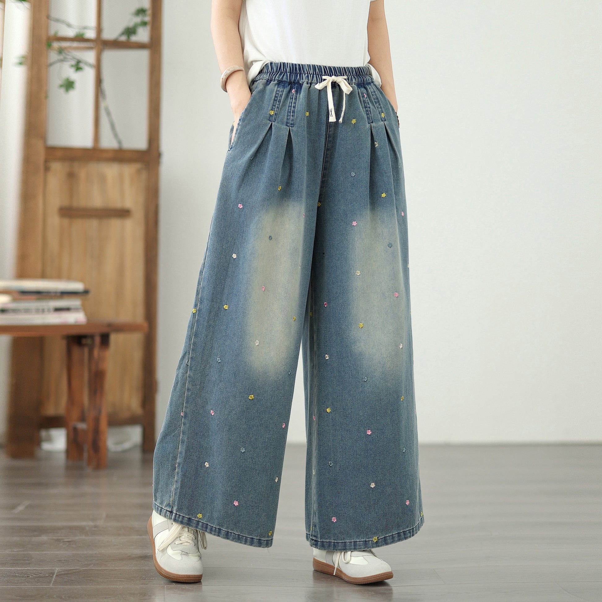 • Features: Fashion,trendy ,Casual loose,Elastic Waist Drawstring, denim, Wide Leg, Classic denim, Double pockets. If you love wide-leg baggy jeans, this is definitely the best choice for you.