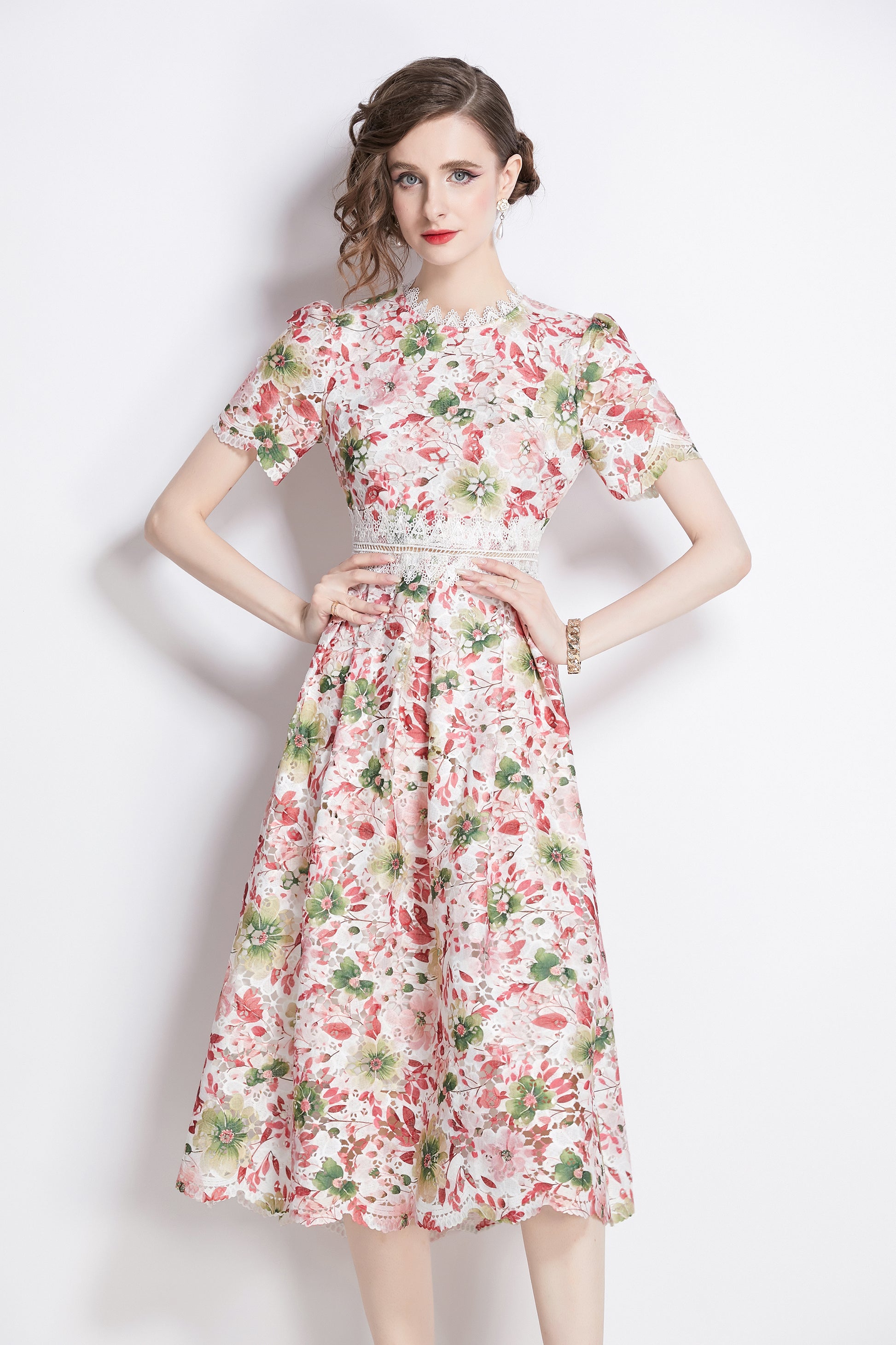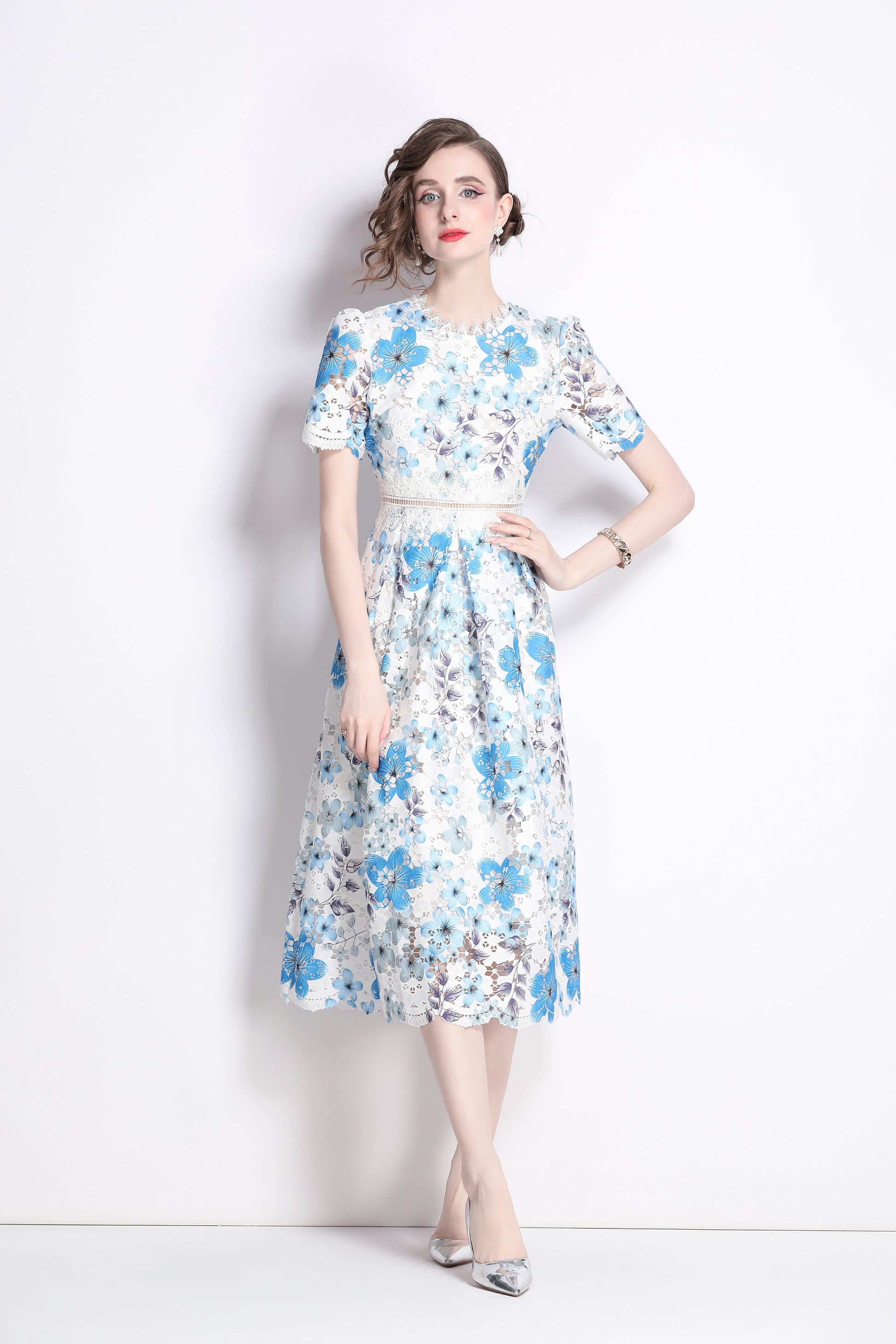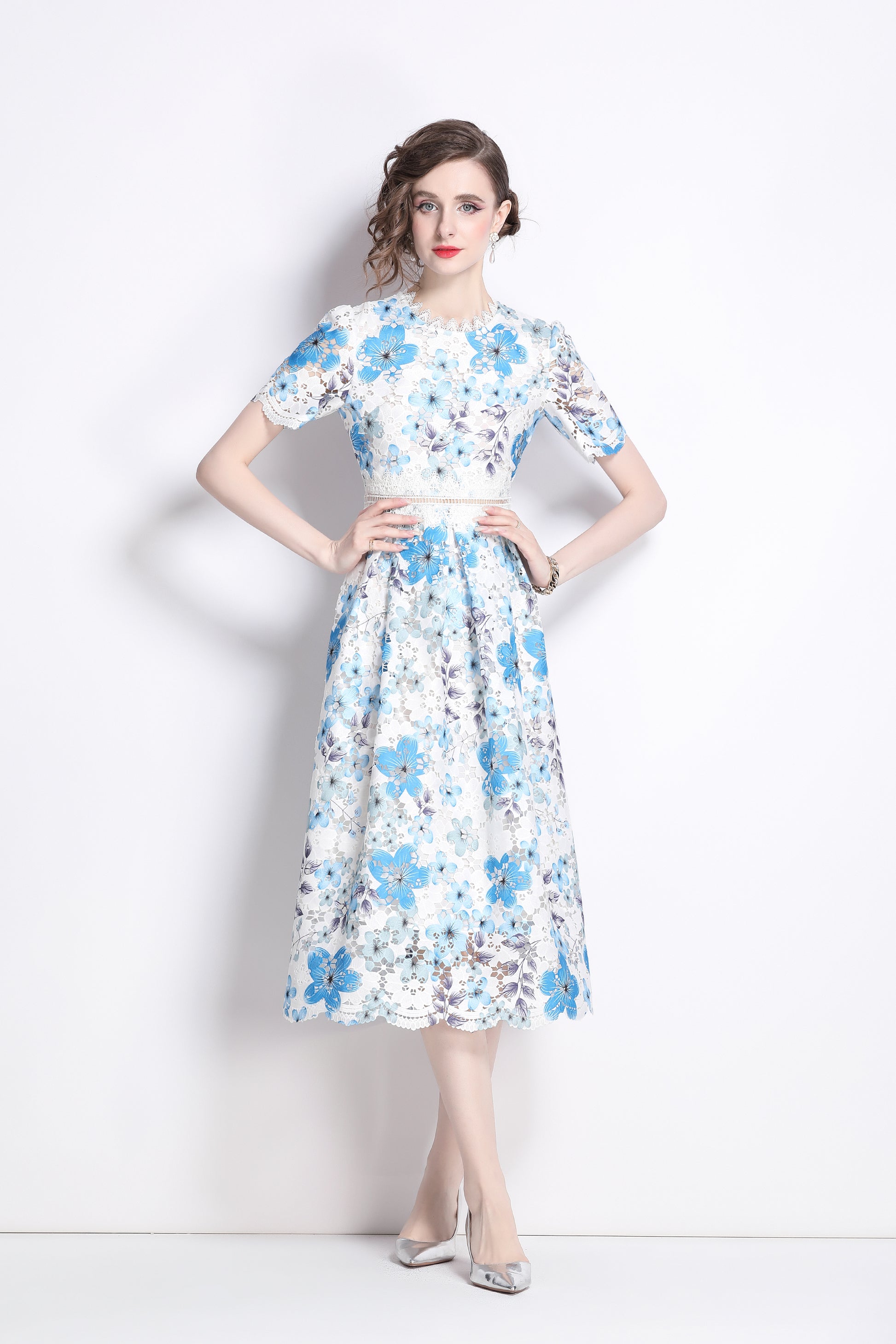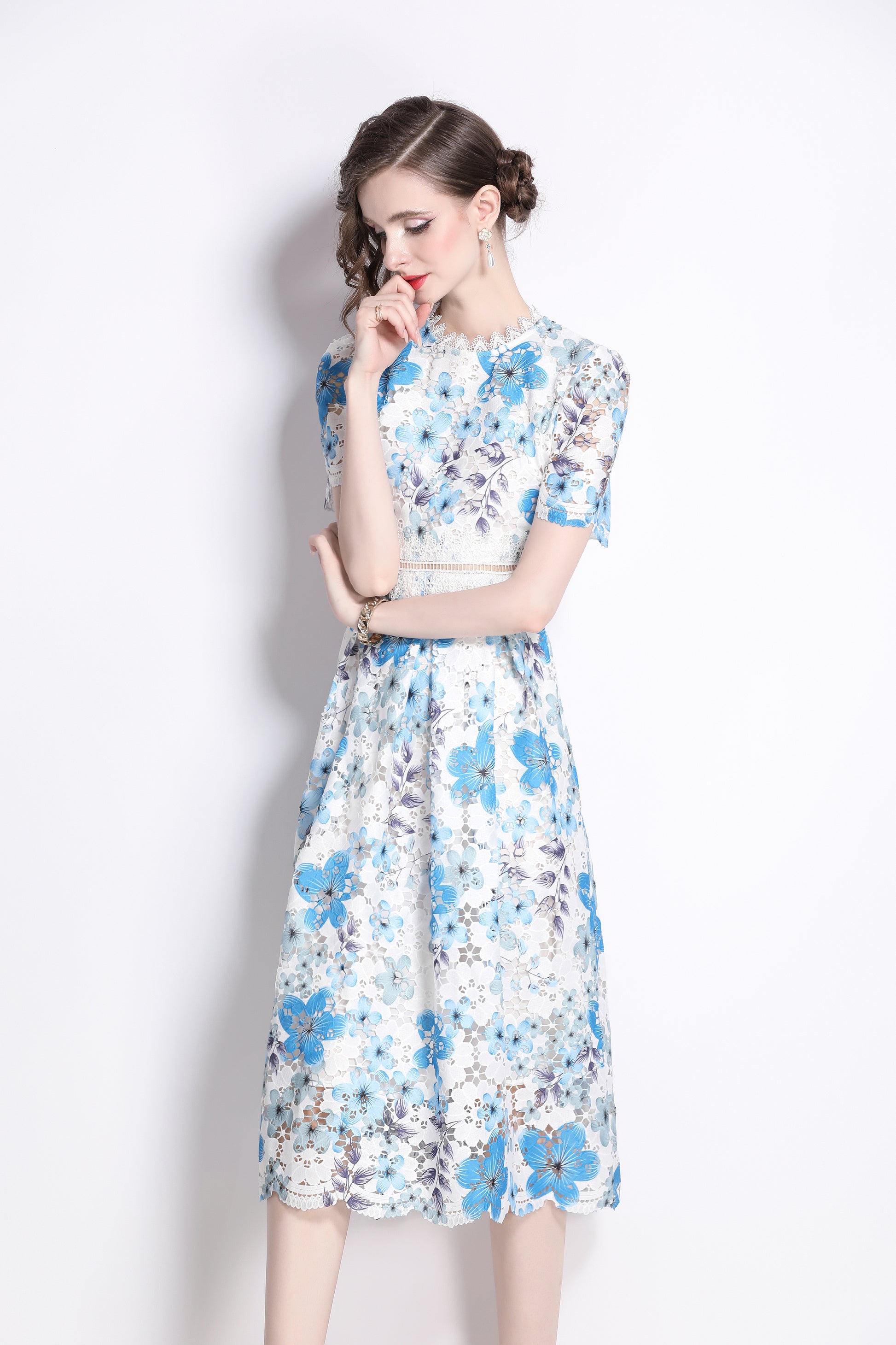 - Features: Lace fabric, hollow floral pattern all over, round neck with lace trim, short sleeves with petal edges, crochet waist, concealed zipper closure at back, flowing petal edge dress,A line swing dress make you more feminine.