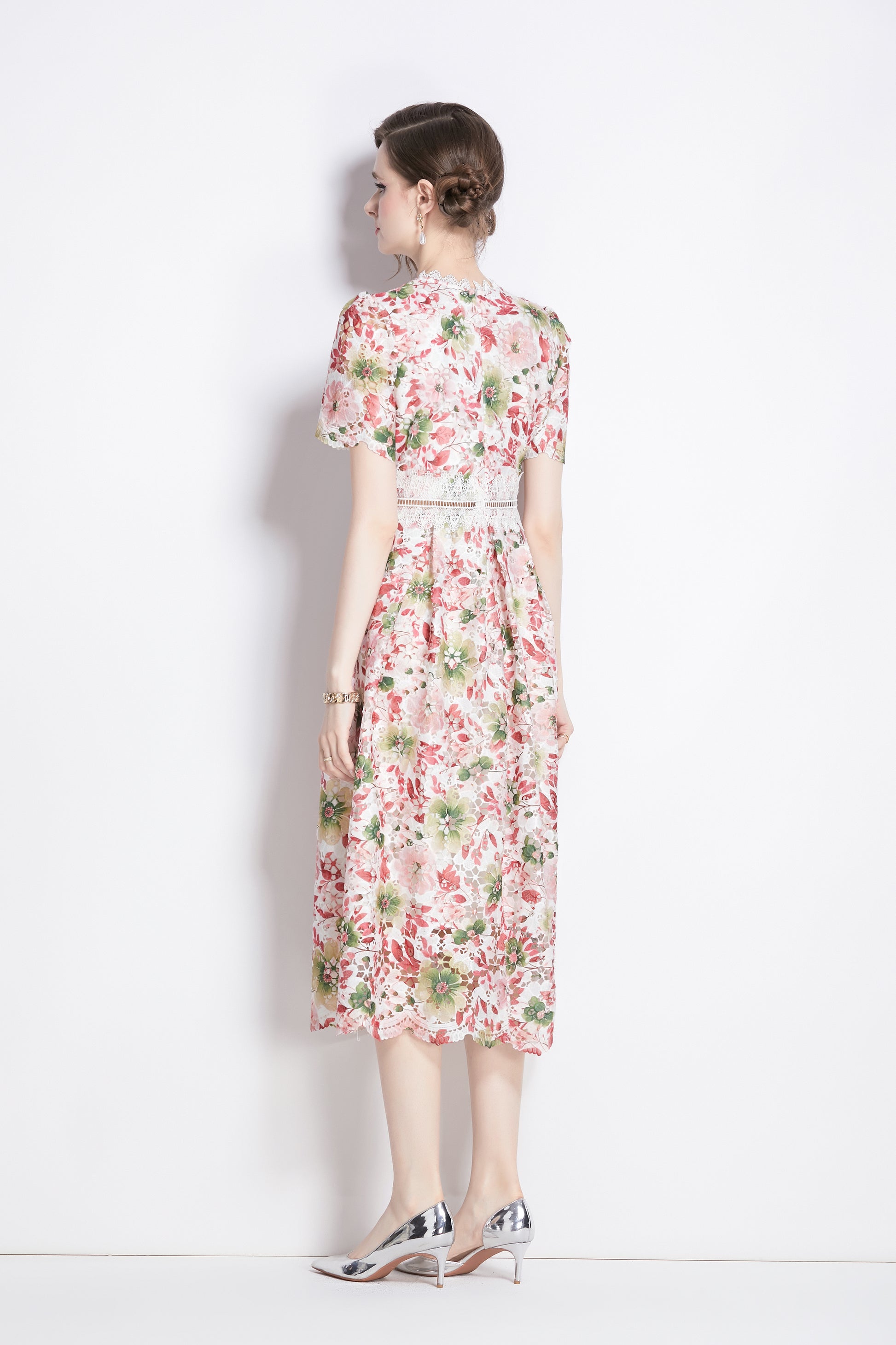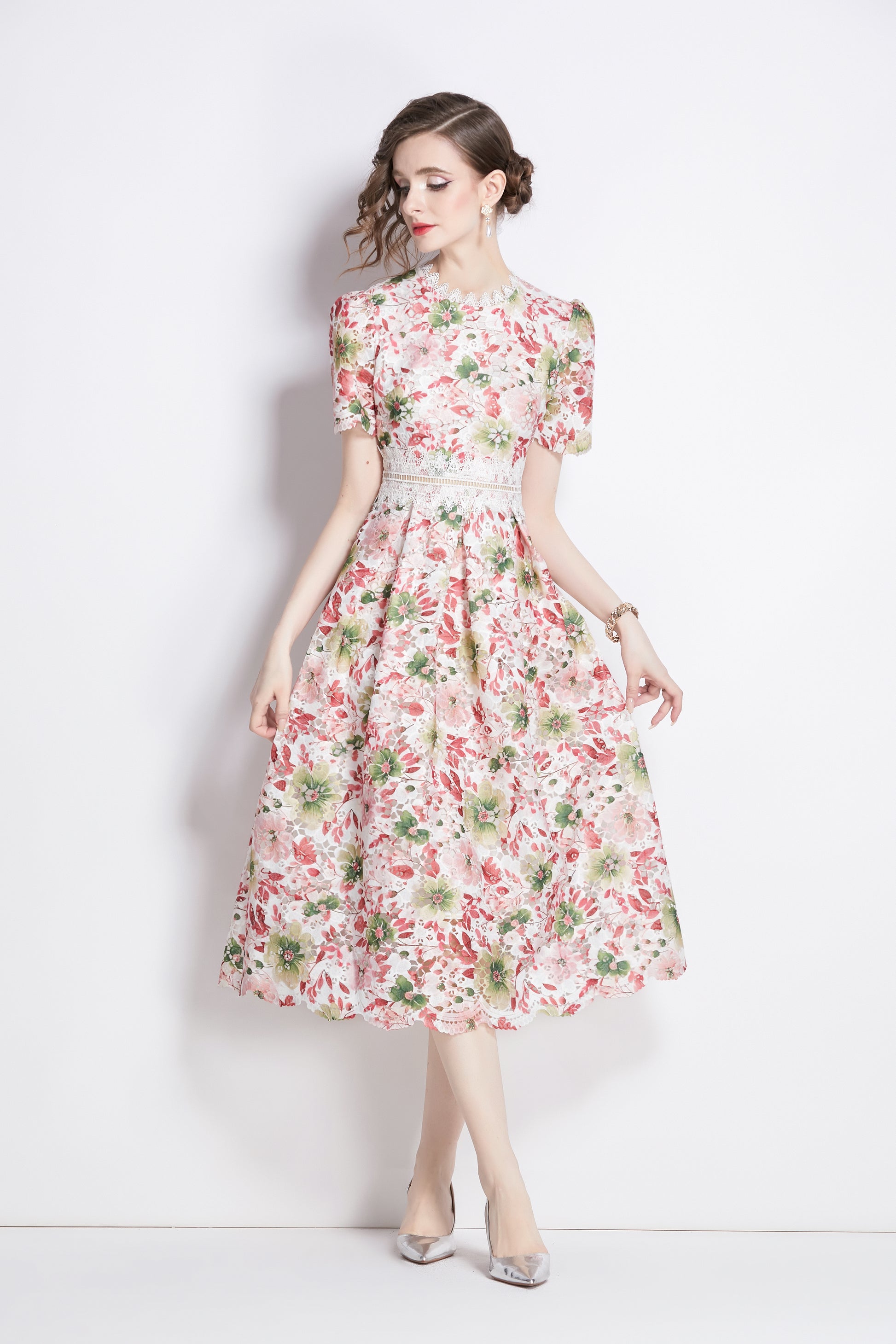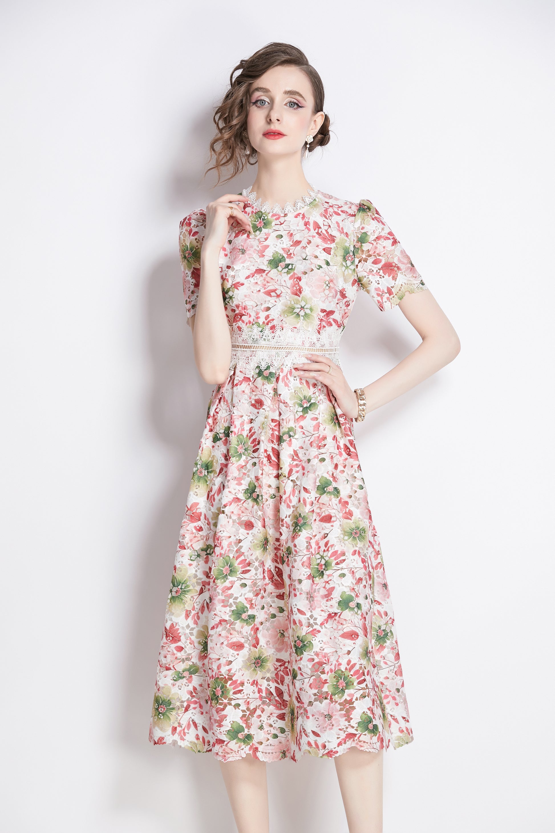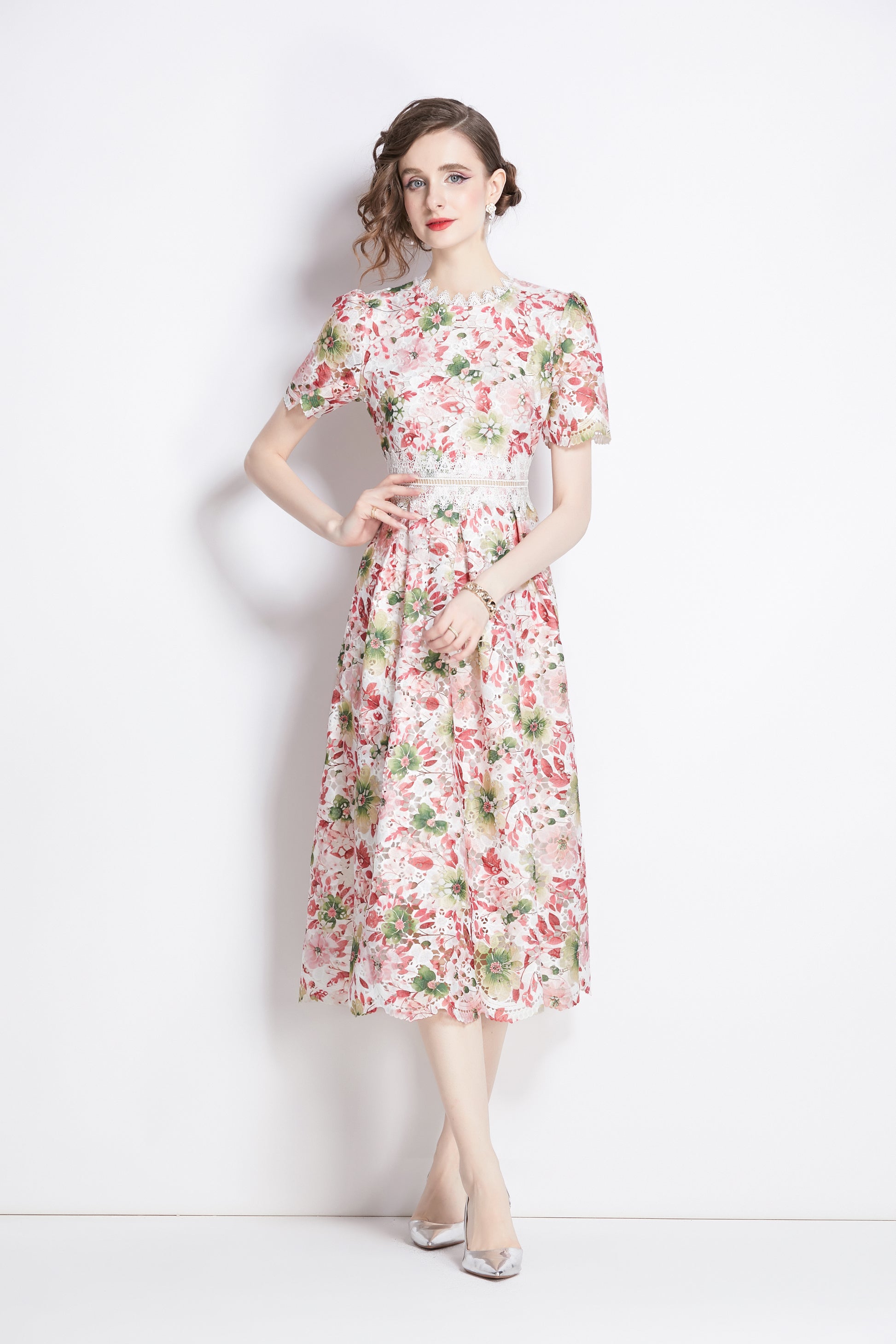 - Features: Lace fabric, hollow floral pattern all over, round neck with lace trim, short sleeves with petal edges, crochet waist, concealed zipper closure at back, flowing petal edge dress,A line swing dress make you more feminine.