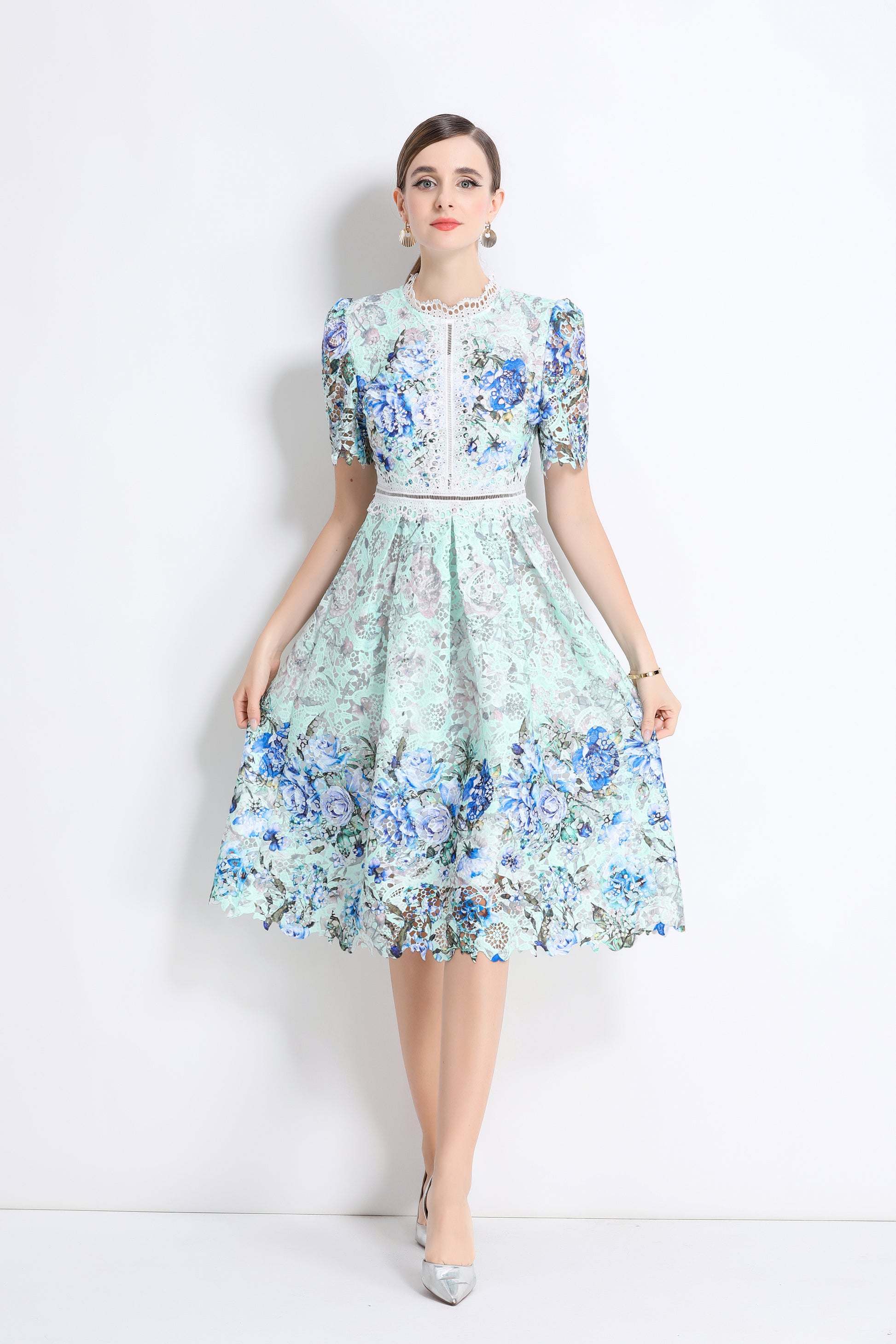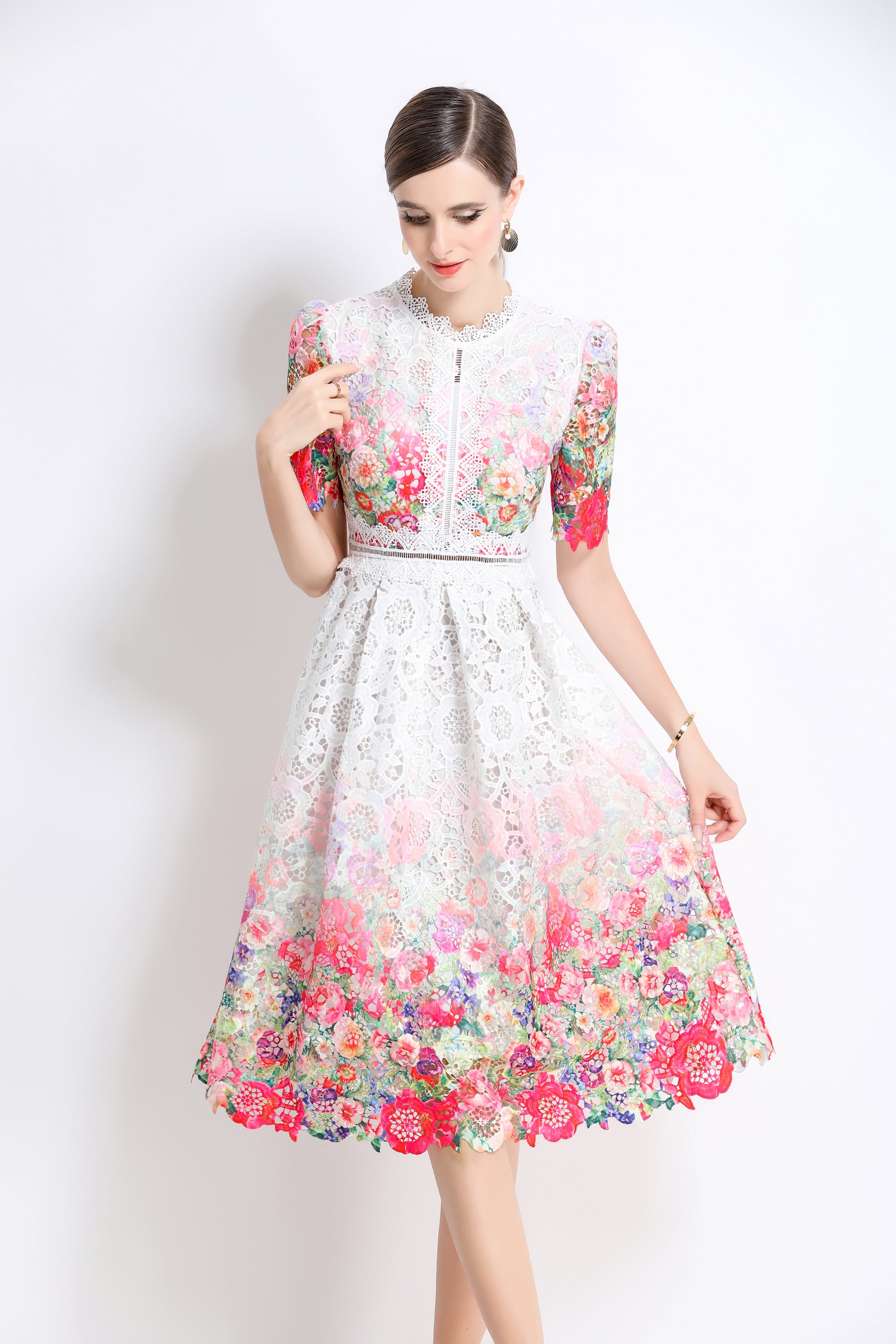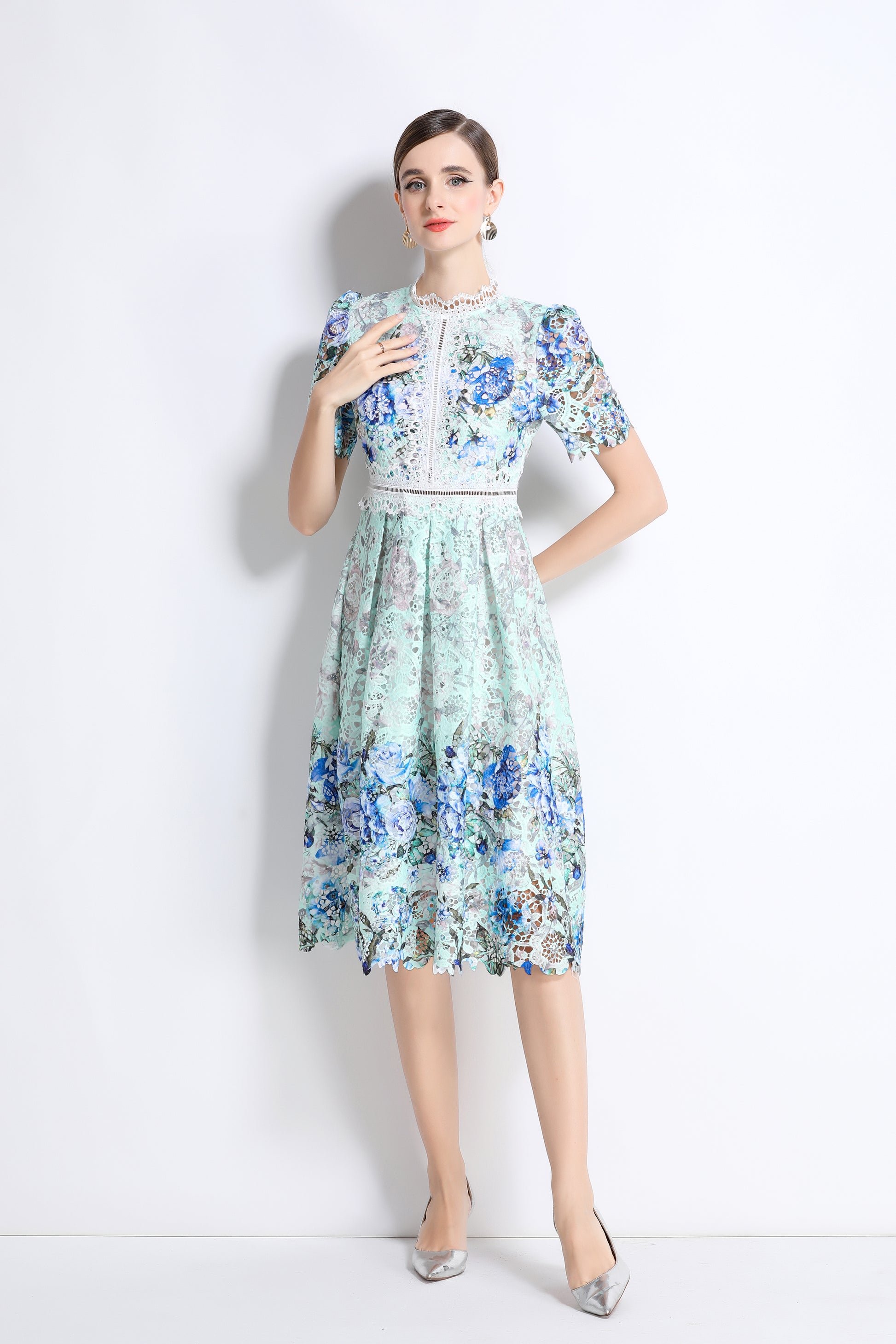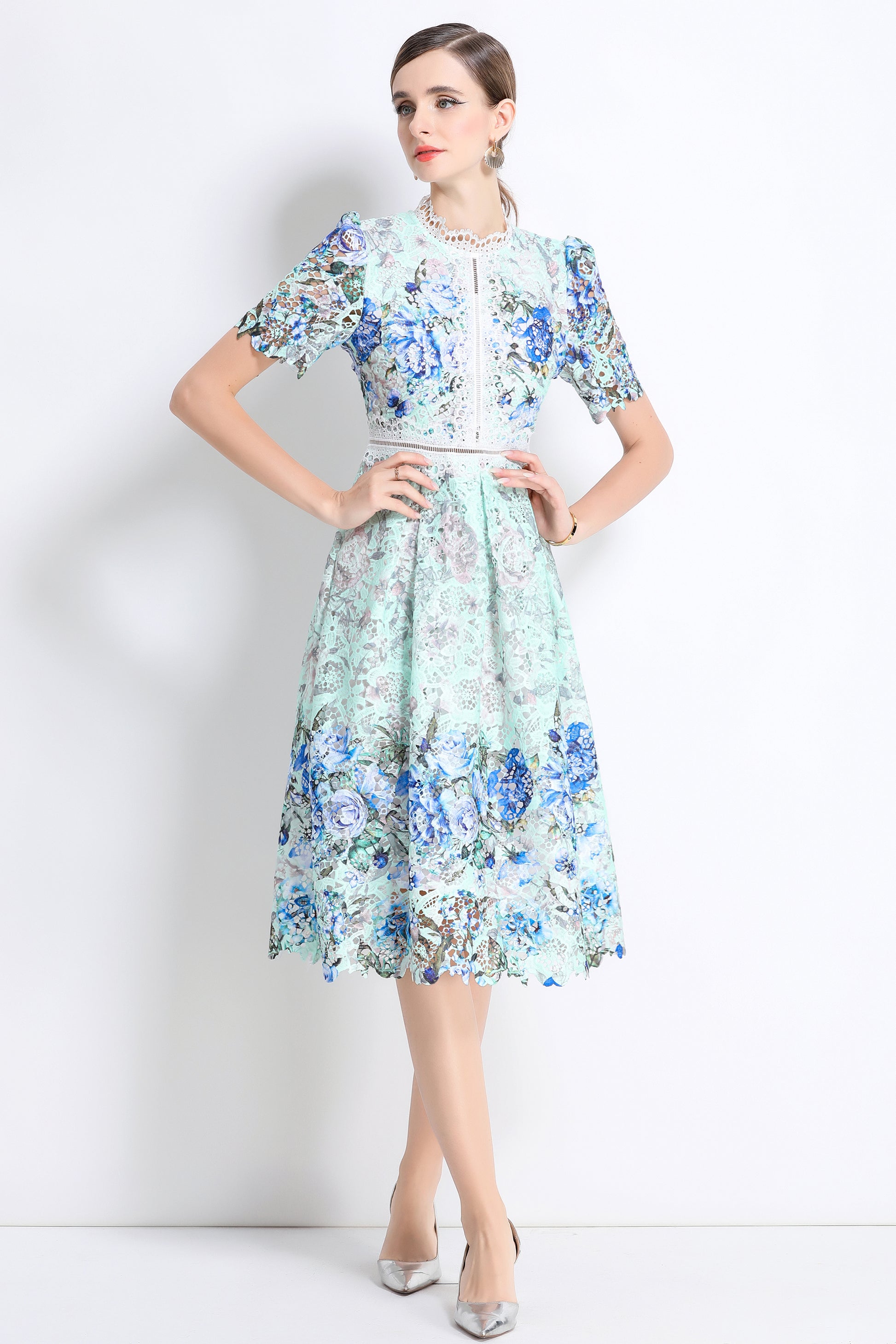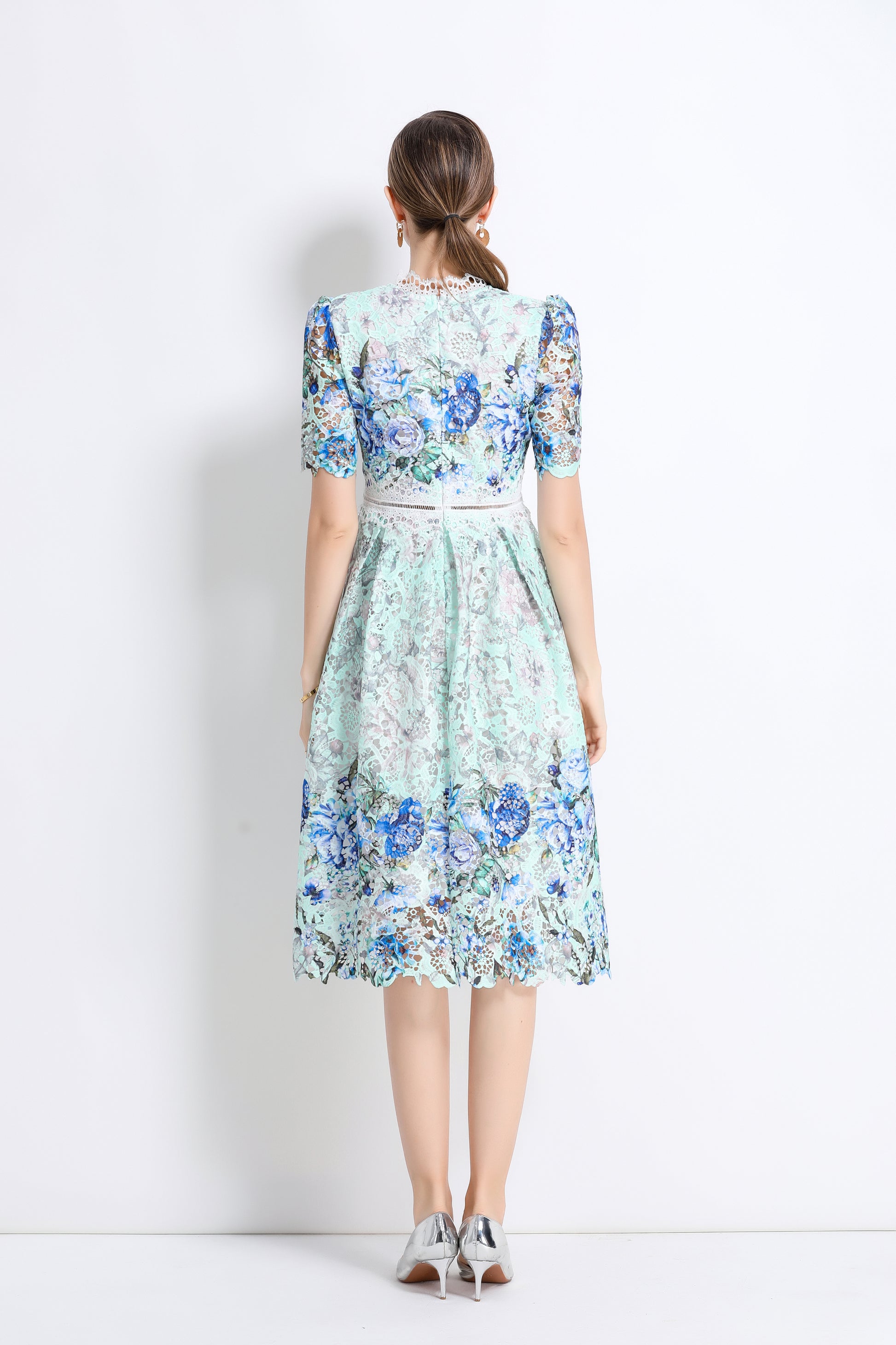 - Features: Lace fabric, hollow floral pattern all over, round neck with lace trim, short sleeves with petal edges, crochet waist, concealed zipper closure at back, flowing petal edge dress,A line swing dress make you more feminine.